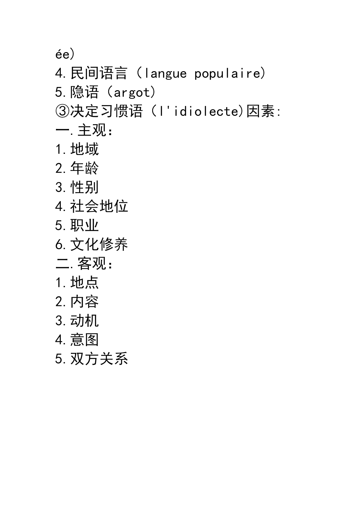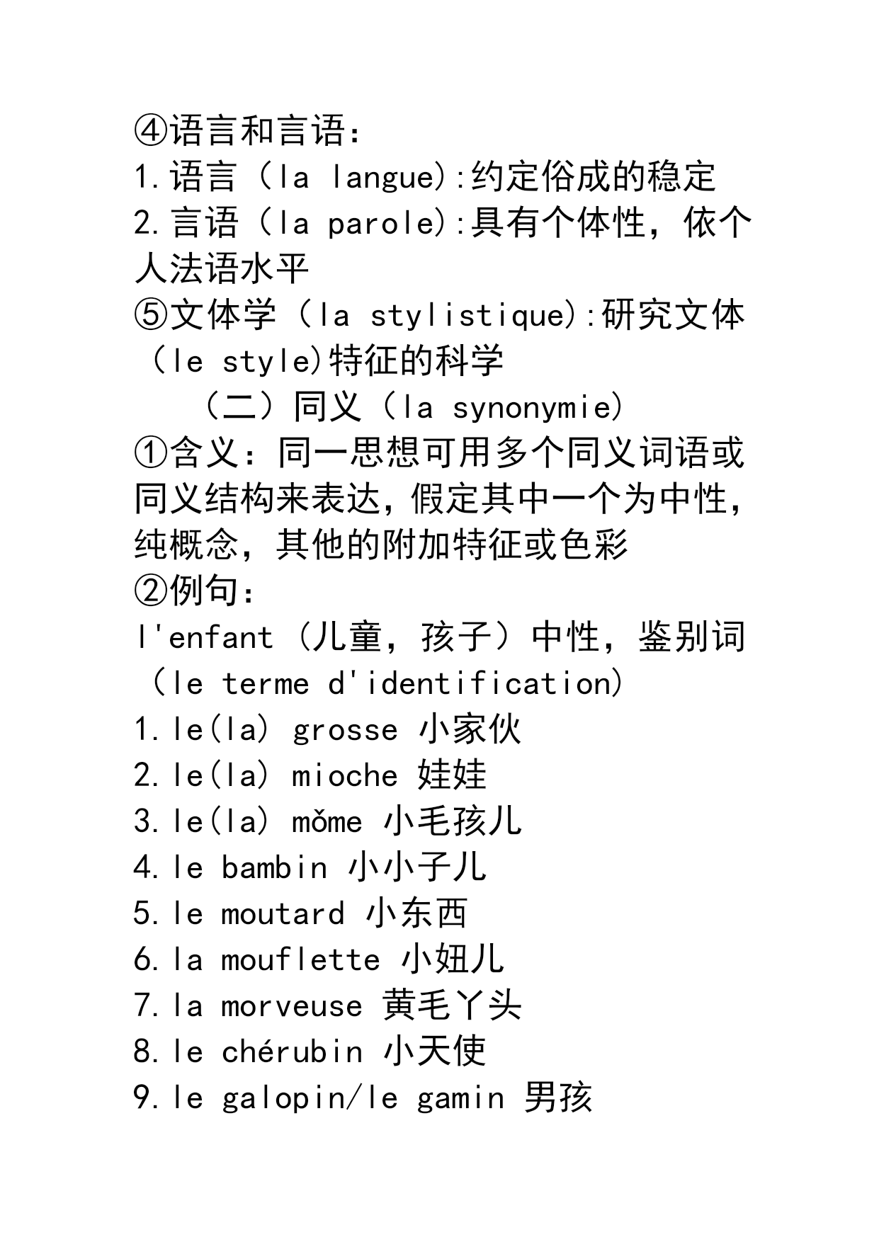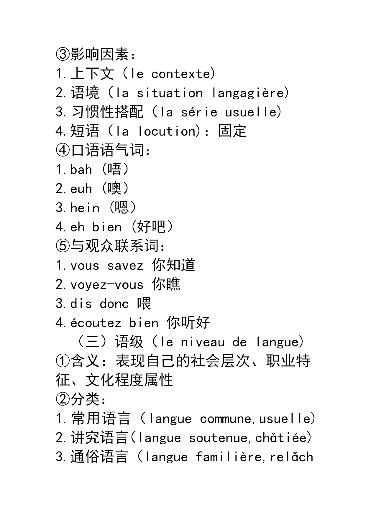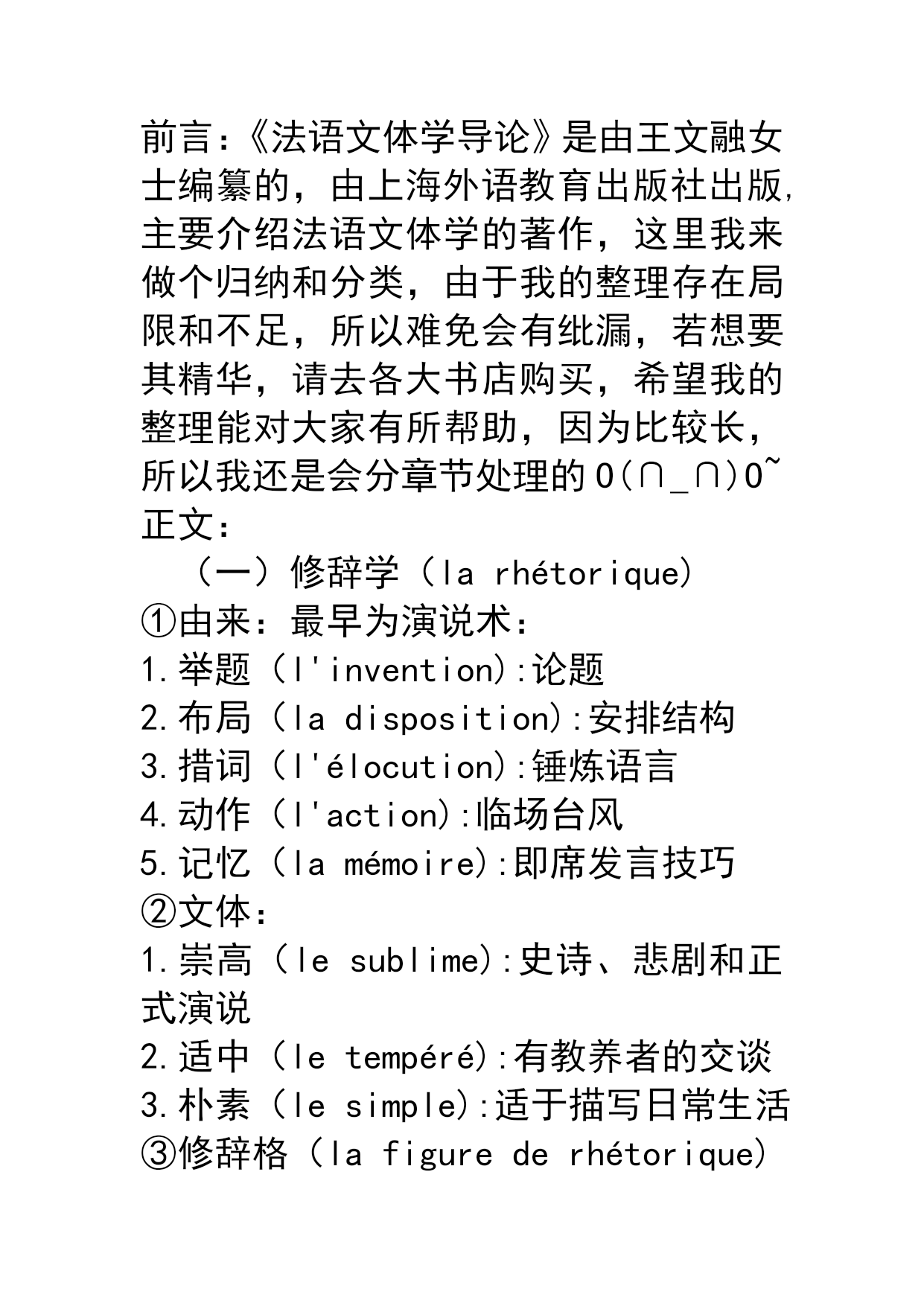 前言:《法语文体学导论》是由王文融女士编纂的,由上海外语教育出版社出版,主要介绍法语文体学的著作,这里我来做个归纳和分类,由于我的整理存在局限和不足,所以难免会有纰漏,若想要其精华,请去各大书店购买,希望我的整理能对大家有所帮助,因为比较长,所以我还是会分章节处理的O(∩_∩)O~正文:(一)修辞学(larhétorique)①由来:最早为演说术:1.举题(l'invention):论题2.布局(ladisposition):安排结构3.措词(l'élocution):锤炼语言4.动作(l'action):临场台风5.记忆(lamémoire):即席发言技巧②文体:1.崇高(lesublime):史诗、悲剧和正式演说2.适中(letempéré):有教养者的交谈3.朴素(lesimple):适于描写日常生活③修辞格(lafigurederhétorique)④语言和言语:1.语言(lalangue):约定俗成的稳定2.言语(laparole):具有个体性,依个人法语水平⑤文体学(lastylistique):研究文体(lestyle)特征的科学(二)同义(lasynonymie)①含义:同一思想可用多个同义词语或同义结构来表达,假定其中一个为中性,纯概念,其他的附加特征或色彩②例句:l'enfant(儿童,孩子)中性,鉴别词(letermed'identification)1.le(la)grosse小家伙2.le(la)mioche娃娃3.le(la)mǒme小毛孩儿4.lebambin小小子儿5.lemoutard小东西6.lamouflette小妞儿7.lamorveuse黄毛丫头8.lechérubin小天使9.legalopin/legamin男孩③影响因素:1.上下文(lecontexte)2.语境(lasituationlangagière)3.习惯性搭配(lasérieusuelle)4.短语(lalocution):固定④口语语气词:1.bah(唔)2.euh(噢)3.hein(嗯)4.ehbien(好吧)⑤与观众联系词:1.voussavez你知道2.voyez-vous你瞧3.disdonc喂4.écoutezbien你听好(三)语级(leniveaudelangue)①含义:表现自己的社会层次、职业特征、文化程度属性②分类:1.常用语言(languecommune,usuelle)2.讲究语言(languesoutenue,chǎtiée)3.通俗语言(languefamilière,relǎchée)4.民间语言(languepopulaire)5.隐语(argot)③决定习惯语(l'idiolecte)因素:一.主观:1.地域2.年龄3.性别4.社会地位5.职业6.文化修养二.客观:1.地点2.内容3.动机4.意图5.双方关系