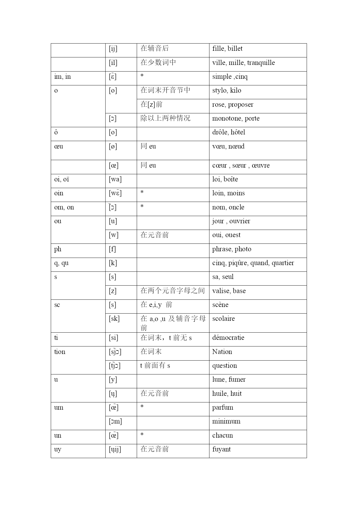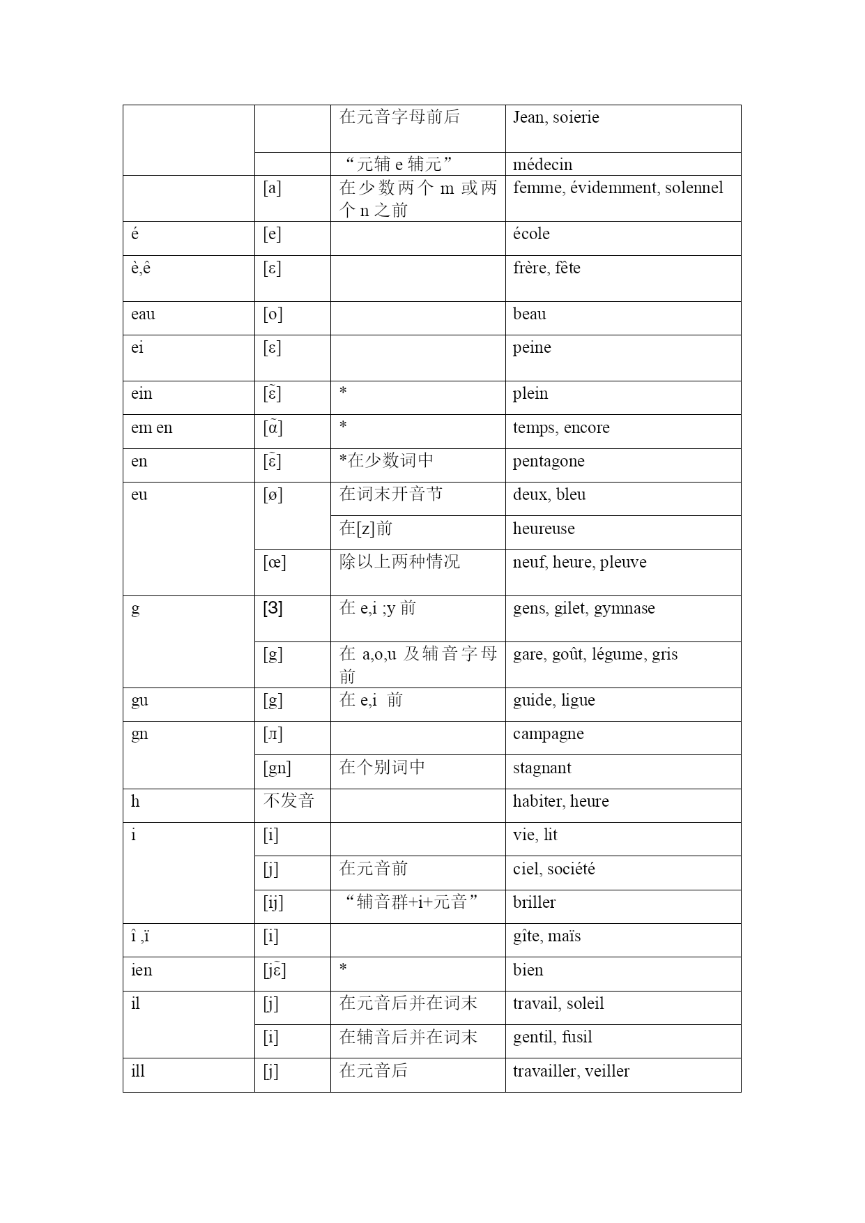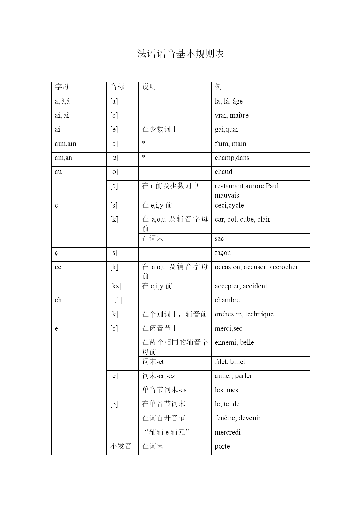 法语语音基本规则表 字母音标说明例a,à,â[a]la,là,âgeai,aî[ε]vrai,maîtreai[e]在少数词中gai,quaiaim,ain[ε̃]*faim,mainam,an[α̃]*champ,dansau[o]chaud[כ]在r前及少数词中restaurant,aurore,Paul,mauvaisc[s]在e,i,y前ceci,cycle[k]在a,o,u及辅音字母前car,col,cube,clair在词末sacç[s]façoncc[k]在a,o,u及辅音字母前occasion,accuser,accrocher[ks]在e,i,y前accepter,accidentch[∫]chambre[k]在个别词中,辅音前orchestre,techniquee[ε]在闭音节中merci,sec在两个相同的辅音字母前ennemi,belle词末-etfilet,billet[e]词末-er,-ezaimer,parler单音节词末-esles,mes[ə]在单音节词末le,te,de在词首开音节fenêtre,devenir“辅辅e辅元”mercredi不发音在词末porte在元音字母前后Jean,soierie“元辅e辅元”médecin[a]在少数两个m或两个n之前femme,évidemment,solennelé[e]écoleè,ê[ε] frère,fêteeau[o]beauei[ε] peineein[ε̃]*pleinemen[α̃]*temps,encoreen[ε̃]*在少数词中pentagoneeu[ø] 在词末开音节deux,bleu在[z]前heureuse[œ] 除以上两种情况neuf,heure,pleuveg[З] 在e,i;y前gens,gilet,gymnase[g]在a,o,u及辅音字母前gare,goût,légume,grisgu[g]在e,i前guide,liguegn[л]campagne[gn]在个别词中stagnanth不发音habiter,heurei[i]vie,lit[j]在元音前ciel,société[ij]“辅音群+i+元音”brillerî,ï[i]gîte,maïsien[jε̃]*bienil[j]在元音后并在词末travail,soleil[i]在辅音后并在词末gentil,fusilill[j]在元音后travailler,veiller[ij]在辅音后fille,billet[il]在少数词中ville,mille,tranquilleim,in[ε̃]*simple,cinqo[o]在词末开音节中stylo,kilo在[z]前rose,proposer[כ]除以上两种情况monotone,porteô[o]drôle,hôtelœu[ø] 同euvœu,nœud[œ]同eucœur,sœur,œuvreoi,oï[wa]loi,boîteoin[wε̃]*loin,moinsom,on[כ̃]*nom,oncleou[u]jour,ouvrier[w]在元音前oui,ouestph[f]phrase,photoq,qu[k]cinq,piqûre,quand,quartiers[s]sa,seul[z]在两个元音字母之间valise,basesc[s]在e,i,y前scène[sk]在a,o,u及辅音字母前scolaireti[si]在词末,t前无sdémocratietion[sjכ̃]在词末Nation[tjכ̃]t前面有squestionu[y]lune,fumer[ų]在元音前huile,huitum[œ̃]*parfum[כm]minimumun[œ̃]*chacunuy[ųij]在元音前fuyantw[v]wagon[w]tramwayx[ks]texte,express[gz]在词首ex-,inex-中,后接元音exact,exemple,inexact[s]在少数词中six,dix[z]在少数词中deuxième,sixièmey[i]在两个辅音字母间stylo[j]在词首yeux=i+i在两个元音字母之间,分别与前后字母组合发音。crayon,voyage=i在两个元音字母间,为专有名词l’Himalaya,laHaye[lаε]ym,yn[ε̃]*sympathie,syndicat *鼻化元音后不能有元音字母或m、n,否则鼻化元音不再存在。 amemimomun...等后面一般接p,b *crlf在词末时,一般要发音