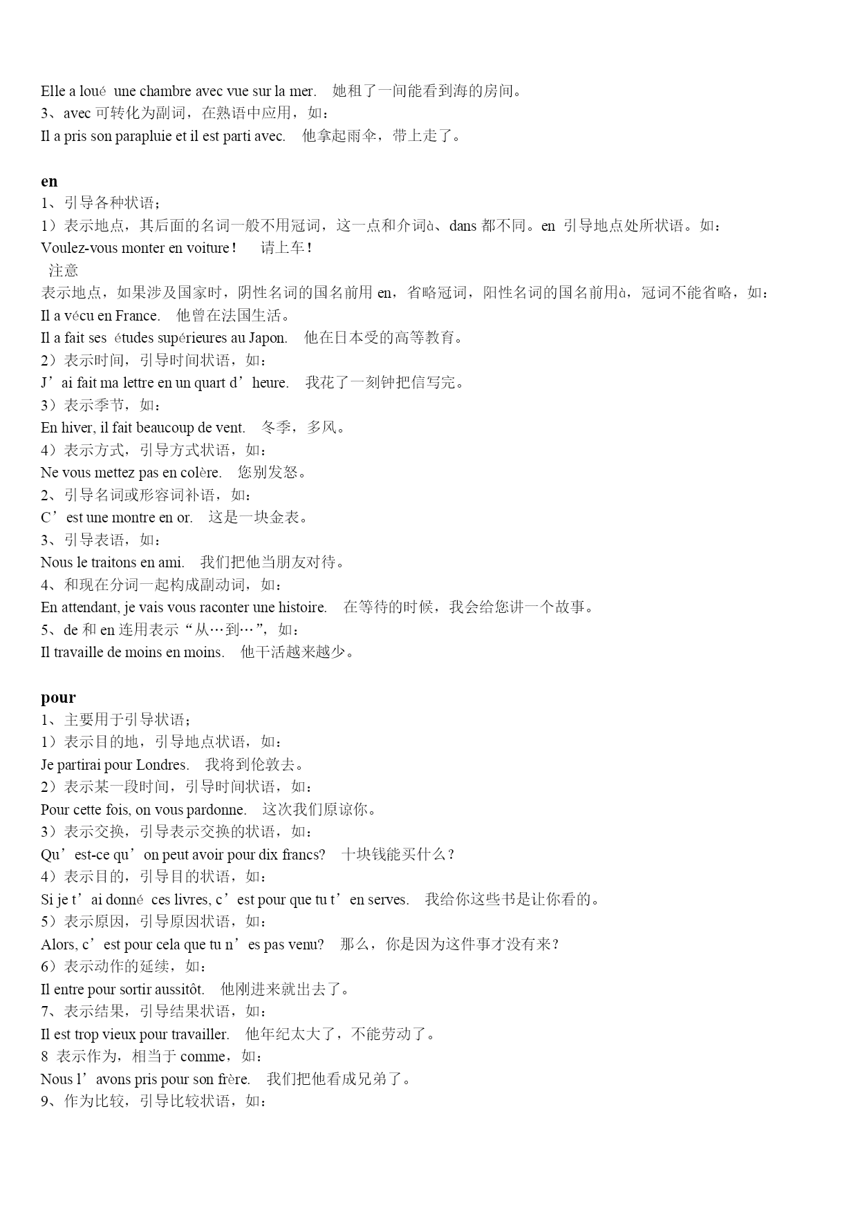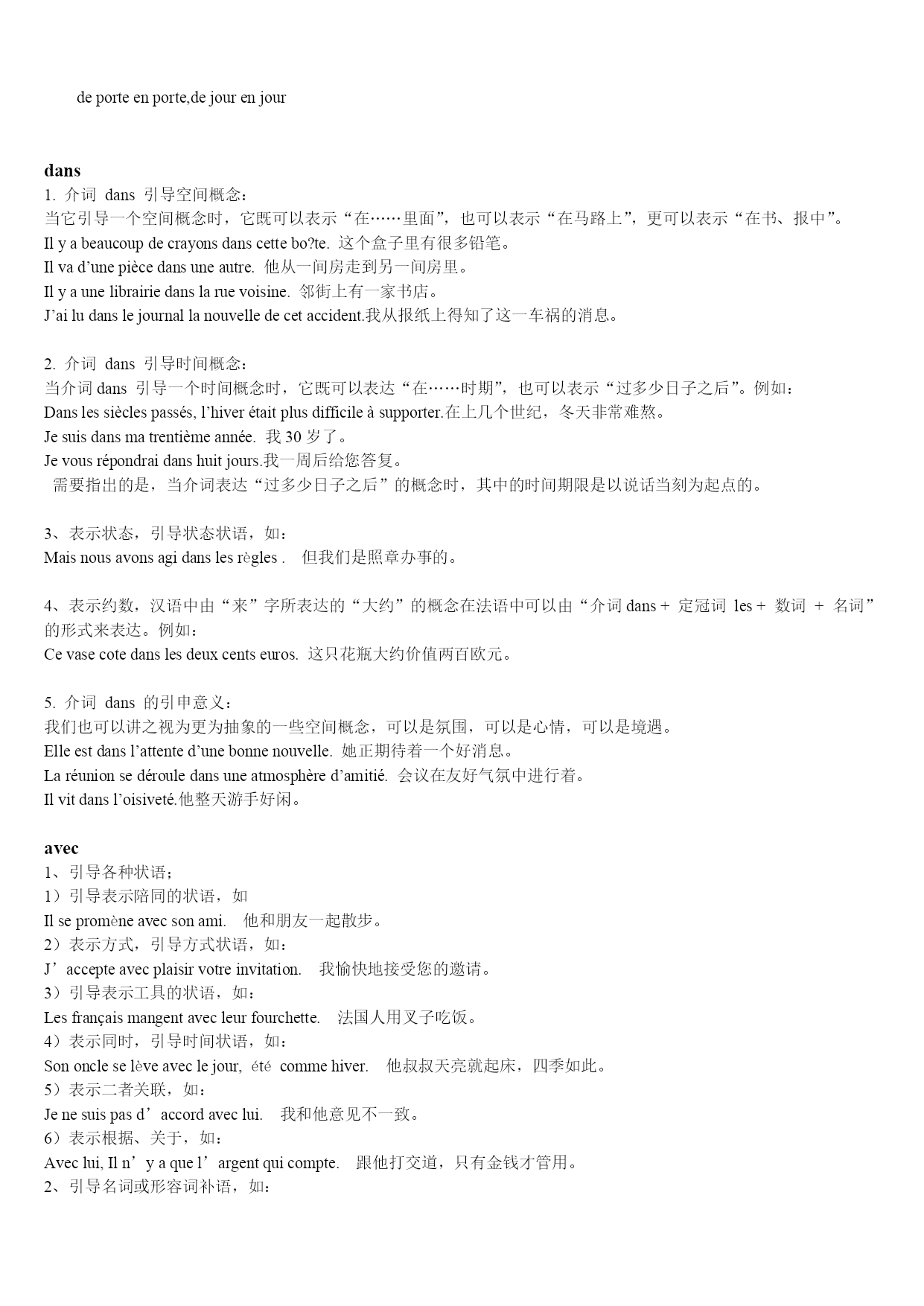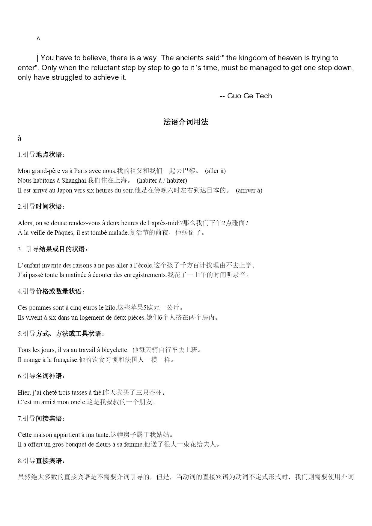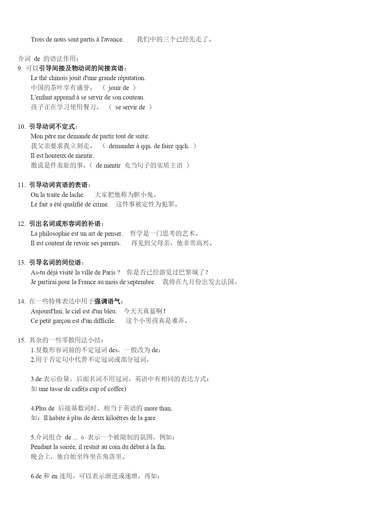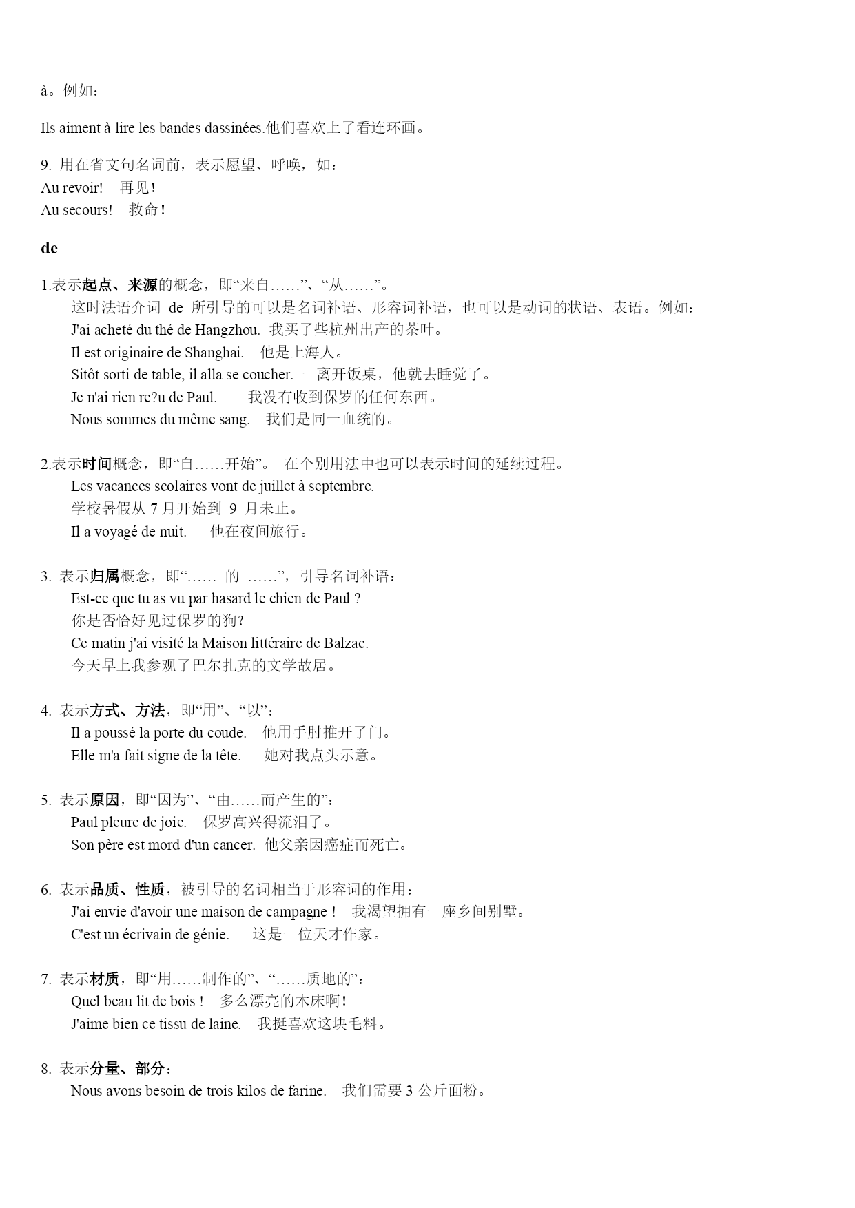 ^ |Youhavetobelieve,thereisaway.Theancientssaid:"thekingdomofheavenistryingtoenter".Onlywhenthereluctantstepbysteptogotoit'stime,mustbemanagedtogetonestepdown,onlyhavestruggledtoachieveit. --GuoGeTech 法语介词用法 à 引导地点状语: Mongrand-pèrevaàParisavecnous.我的祖父和我们一起去巴黎。(allerà)NoushabitonsàShanghai.我们住在上海。(habiterà/habiter)IlestarrivéauJaponverssixheuresdusoir.他是在傍晚六时左右到达日本的。(arriverà) 2.引导时间状语: Alors,onsedonnerendez-vousàdeuxheuresdel’après-midi?那么我们下午2点碰面?ÀlaveilledePâques,ilesttombémalade.复活节的前夜,他病倒了。 3.引导结果或目的状语: L’enfantinventedesraisonsànepasalleràl’école.这个孩子千方百计找理由不去上学。J’aipassétoutelamatinéeàécouterdesenregistrements.我花了一上午的时间听录音。 4.引导价格或数量状语: Cespommessontàcinqeuroslekilo.这些苹果5欧元一公斤。Ilsviventàsixdansunlogementdedeuxpièces.她们6个人挤在两个房内。 5.引导方式、方法或工具状语: Touslesjours,ilvaautravailàbicyclette.他每天骑自行车去上班。Ilmangeàlafrançaise.他的饮食习惯和法国人一模一样。 6.引导名词补语: Hier,j’aichetétroistassesàthé.昨天我买了三只茶杯。C’estunamiàmononcle.这是我叔叔的一个朋友。 7.引导间接宾语: Cettemaisonappartientàmatante.这幢房子属于我姑姑。Ilaoffertungrosbouquetdefleursàsafemme.他送了很大一束花给夫人。 8.引导直接宾语: 虽然绝大多数的直接宾语是不需要介词引导的,但是,当动词的直接宾语为动词不定式形式时,我们则需要使用介词à。例如: Ilsaimentàlirelesbandesdassinées.他们喜欢上了看连环画。 9.用在省文句名词前,表示愿望、呼唤,如: Aurevoir!再见! Ausecours!救命! de 表示起点、来源的概念,即“来自……”、“从……”。这时法语介词de所引导的可以是名词补语、形容词补语,也可以是动词的状语、表语。例如:J'aiachetéduthédeHangzhou.我买了些杭州出产的茶叶。IlestoriginairedeShanghai.他是上海人。Sitôtsortidetable,ilallasecoucher.一离开饭桌,他就去睡觉了。Jen'airienre?udePaul.我没有收到保罗的任何东西。Noussommesdumêmesang.我们是同一血统的。 表示时间概念,即“自……开始”。在个别用法中也可以表示时间的延续过程。Lesvacancesscolairesvontdejuilletàseptembre.学校暑假从7月开始到9月未止。Ilavoyagédenuit.他在夜间旅行。 表示归属概念,即“……的……”,引导名词补语:Est-cequetuasvuparhasardlechiendePaul?你是否恰好见过保罗的狗?Cematinj'aivisitélaMaisonlittérairedeBalzac.今天早上我参观了巴尔扎克的文学故居。 表示方式、方法,即“用”、“以”:Ilapoussélaporteducoude.他用手肘推开了门。Ellem'afaitsignedelatête.她对我点头示意。 5.表示原因,即“因为”、“由……而产生的”:Paulpleuredejoie.保罗高兴得流泪了。Sonpèreestmordd'uncancer.他父亲因癌症而死亡。 6.表示品质、性质,被引导的名词相当于形容词的作用:J'aienvied'avoirunemaisondecampagne!我渴望拥有一座乡间别墅。C'estunécrivaindegénie.这是一位天才作家。 7.表示材质,即“用……制作的”、“