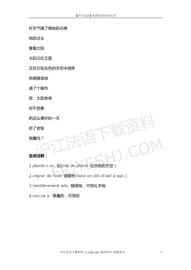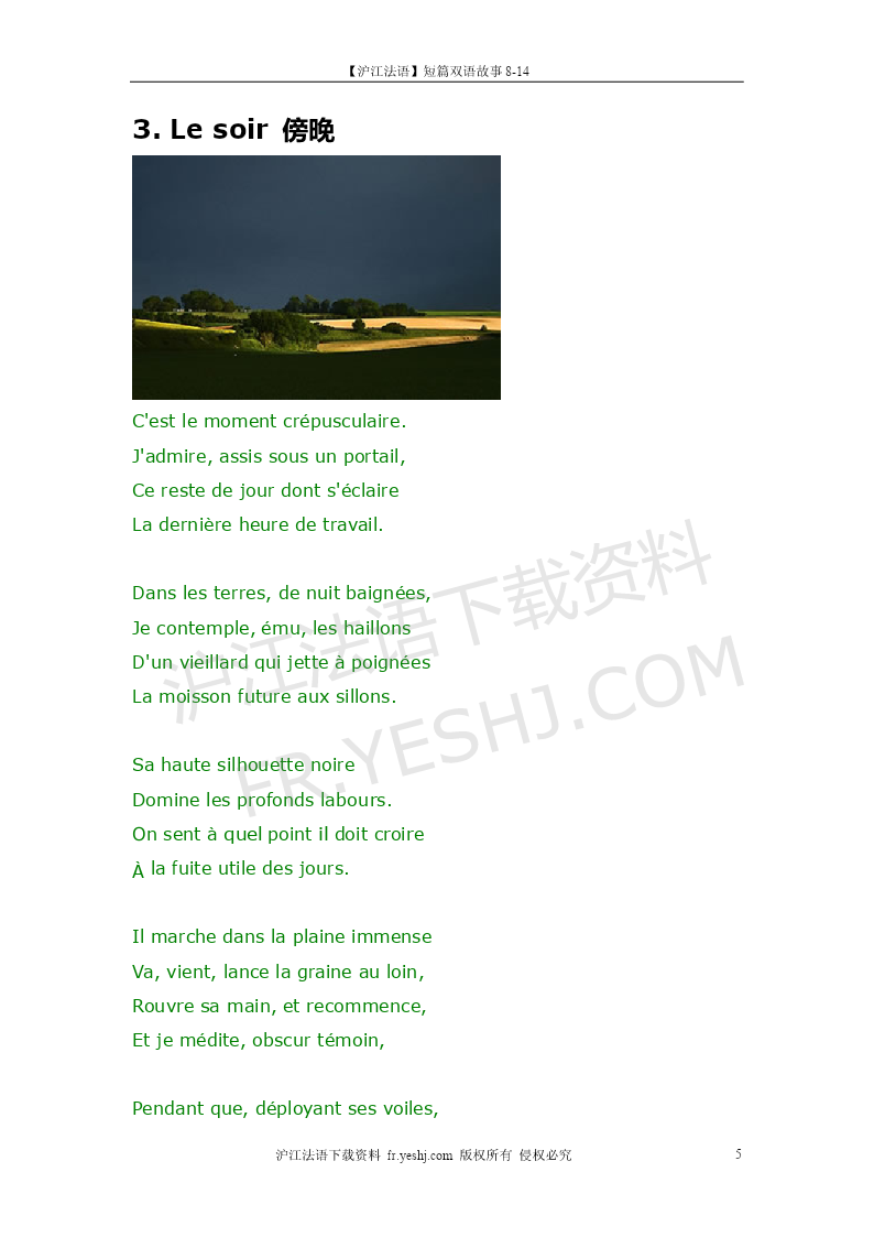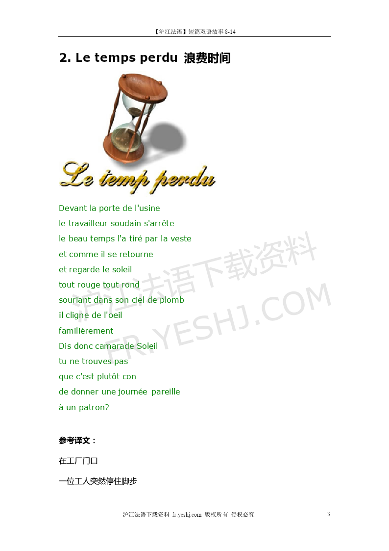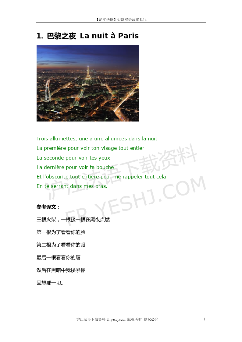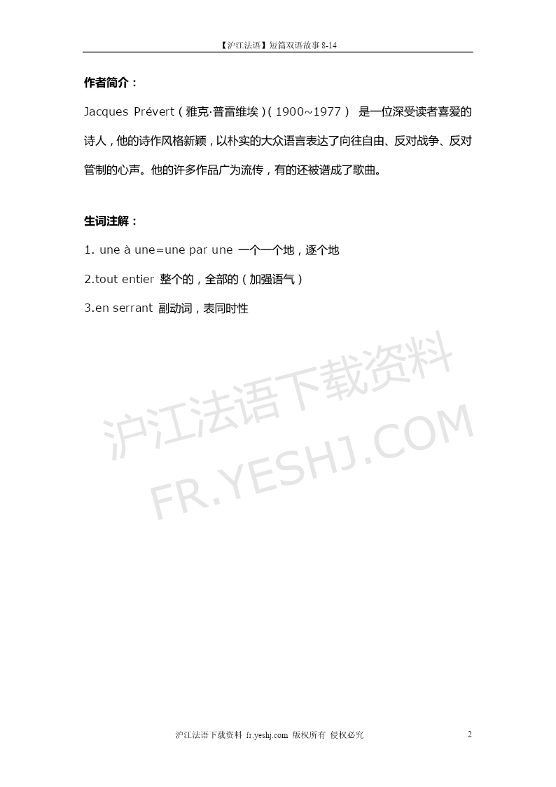 【沪江法语】短篇双语故事8-14 1.巴黎之夜LanuitàParis Troisallumettes,uneàunealluméesdanslanuit Lapremièrepourvoirtonvisagetoutentier Lasecondepourvoirtesyeux Ladernièrepourvoirtabouche Etl'obscuritétoutentièrepourmerappelertoutcela Enteserrantdansmesbras. 沪江法语下载资料 参考译文: 三根火柴,一根接一根在黑夜点燃FR.YESHJ.COM 第一根为了看看你的脸 第二根为了看看你的眼 最后一根看看你的唇 然后在黑暗中我搂紧你 回想那一切。 沪江法语下载资料fr.yeshj.com版权所有侵权必究1 【沪江法语】短篇双语故事8-14 作者简介: JacquesPrévert(雅克·普雷维埃)(1900~1977)是一位深受读者喜爱的 诗人,他的诗作风格新颖,以朴实的大众语言表达了向往自由、反对战争、反对 管制的心声。他的许多作品广为流传,有的还被谱成了歌曲。 生词注解: 1.uneàune=uneparune一个一个地,逐个地 2.toutentier整个的,全部的(加强语气) 3.enserrant副动词,表同时性 沪江法语下载资料 FR.YESHJ.COM 沪江法语下载资料fr.yeshj.com版权所有侵权必究2 【沪江法语】短篇双语故事8-14 2.Letempsperdu浪费时间 Devantlaportedel'usine letravailleursoudains'arrête lebeautempsl'atiréparlaveste etcommeilseretourne etregardelesoleil toutrougetoutrond souriantdanssoncieldeplomb ilcligne沪江法语下载资料del'oeil familièrement DisdonccamaradeSoleil tunetrouvesFR.YESHJ.COMpas quec'estplutôtcon dedonnerunejournéepareille àunpatron? 参考译文: 在工厂门口 一位工人突然停住脚步 沪江法语下载资料fr.yeshj.com版权所有侵权必究3 【沪江法语】短篇双语故事8-14 好天气拽了拽他的衣襟 他扭过头 看看太阳 太阳又红又圆 正在它铅灰色的天空中微笑 他很随意地 递了个眼色 哎,太阳老弟 你不觉着 把这么美好的一天 给了老板 很蠢吗? 生词注解:沪江法语下载资料 1.plombn.m.铅(cieldeplomb铅灰色的天空) 2.clignerdel'oeilFR.YESHJ.COM递眼色(faireunclind'oeilàqqn.) 3.familièrementadv.随便地,不拘礼节地 4.con,nea.愚蠢的,可笑的 沪江法语下载资料fr.yeshj.com版权所有侵权必究4 【沪江法语】短篇双语故事8-14 3.Lesoir傍晚 C'estlemomentcrépusculaire. J'admire,assissousunportail, Cerestedejourdonts'éclaire Ladernièreheuredetravail. Danslesterres,denuitbaignées, Jecontemple,ému,leshaillons D'unvieillardquijetteàpoignées Lamoisson沪江法语下载资料futureauxsillons. Sahautesilhouettenoire DominelesprofondsFR.YESHJ.COMlabours. Onsentàquelpointildoitcroire Àlafuiteutiledesjours. Ilmarchedanslaplaineimmense Va,vient,lancelagraineauloin, Rouvresamain,etrecommence, Etjemédite,obscurtémoin, Pendantque,déployantsesvoiles, 沪江法语下载资料fr.yeshj.com版权所有侵权必究5 【沪江法语】短篇双语故事8-14 L'ombre,oùsemêleunerumeur, Se