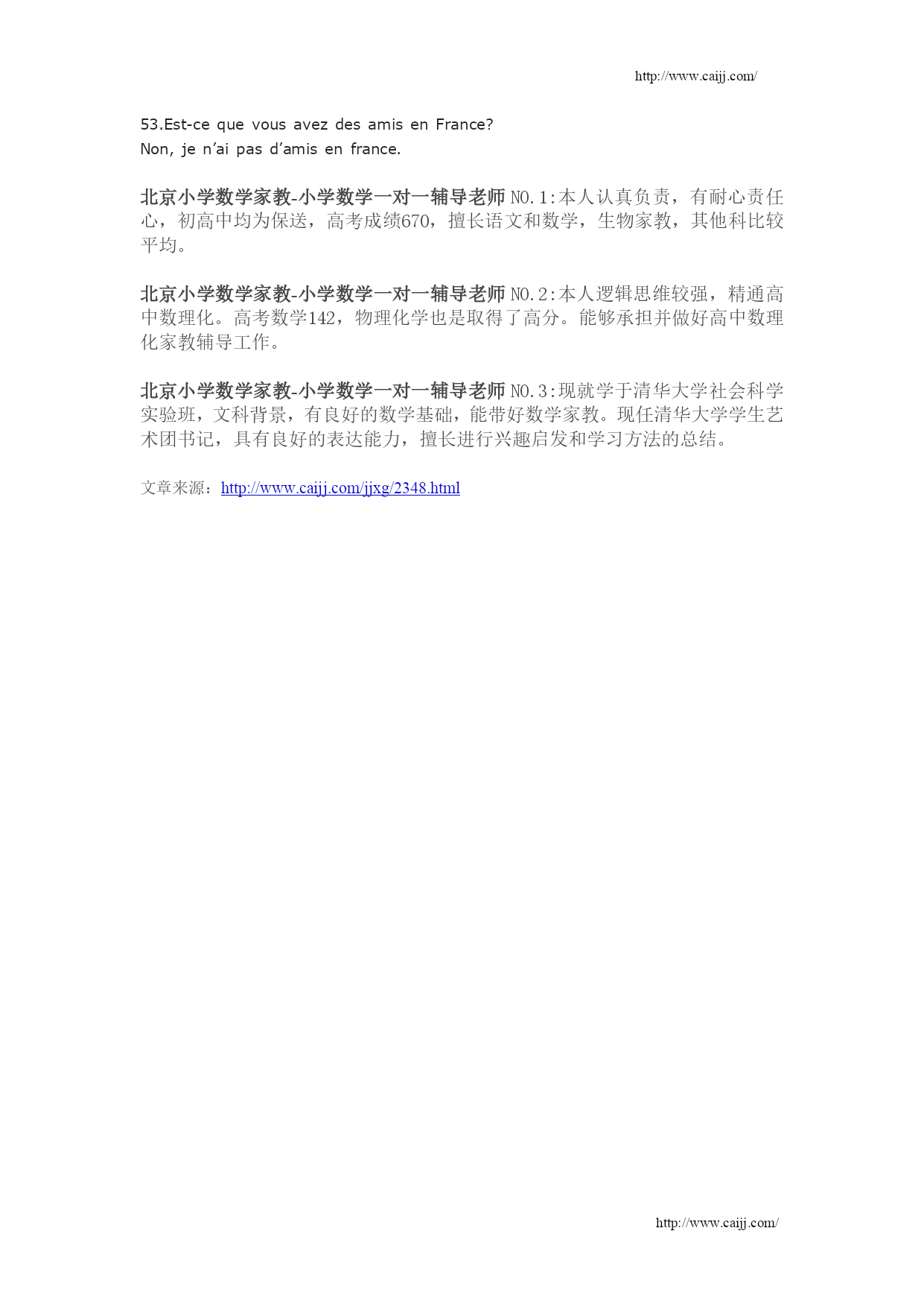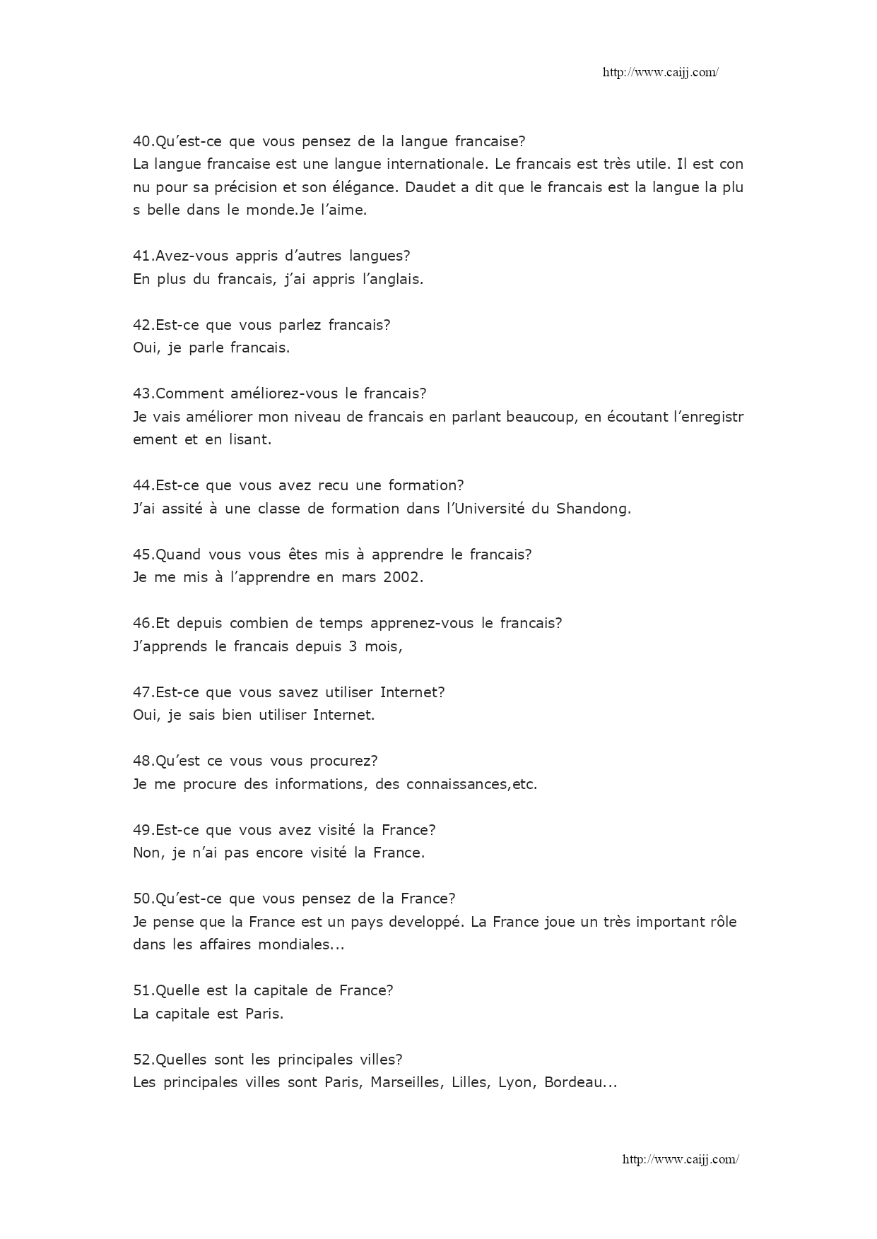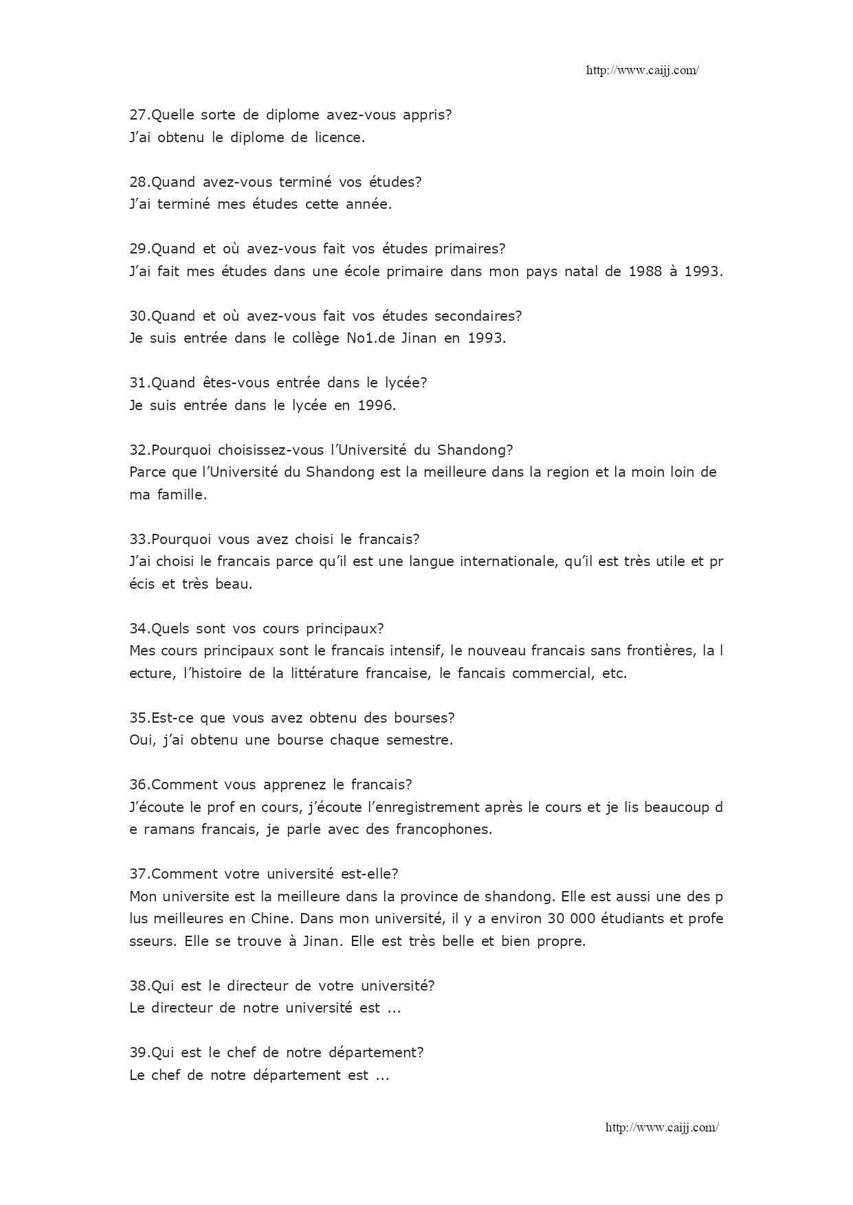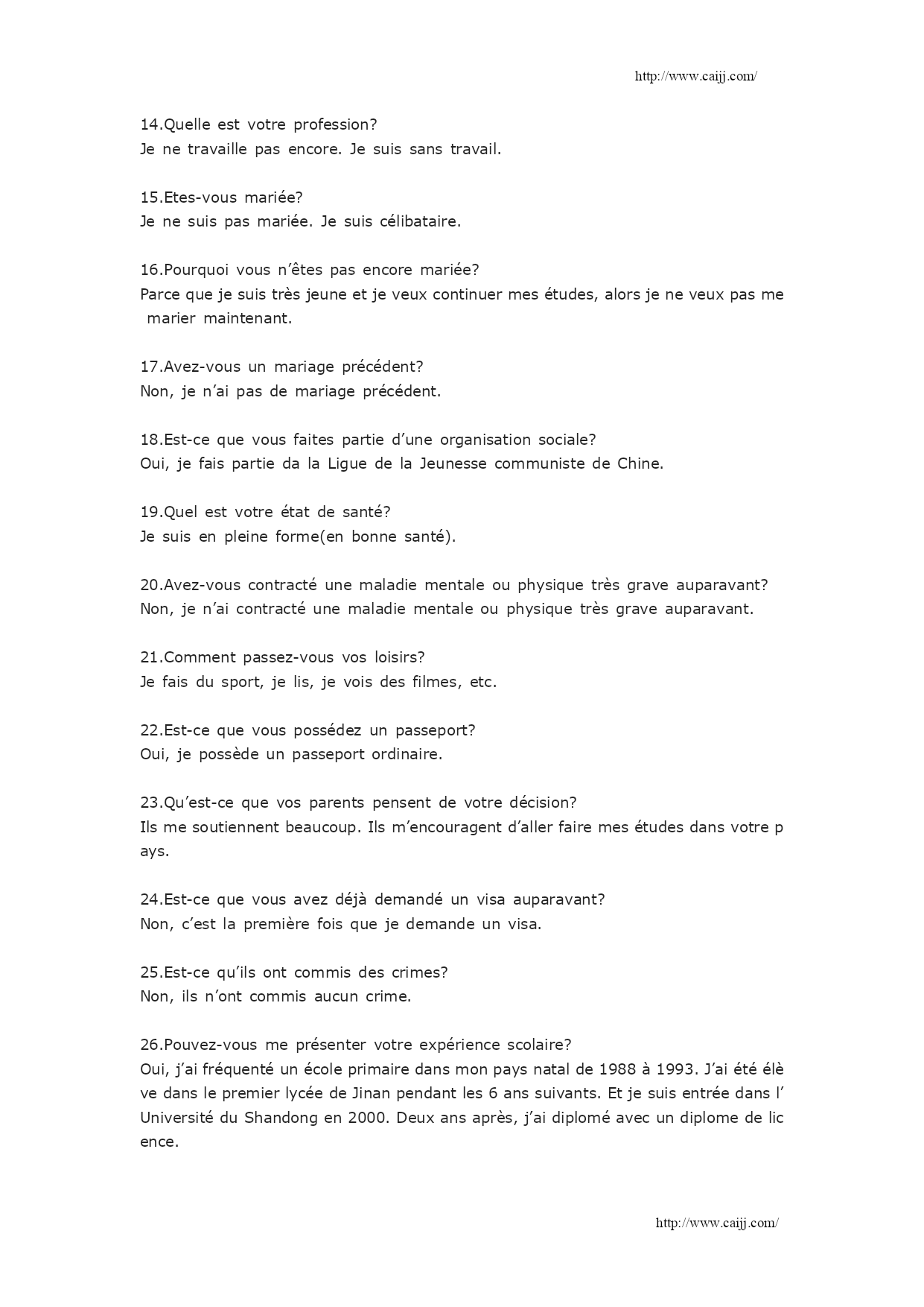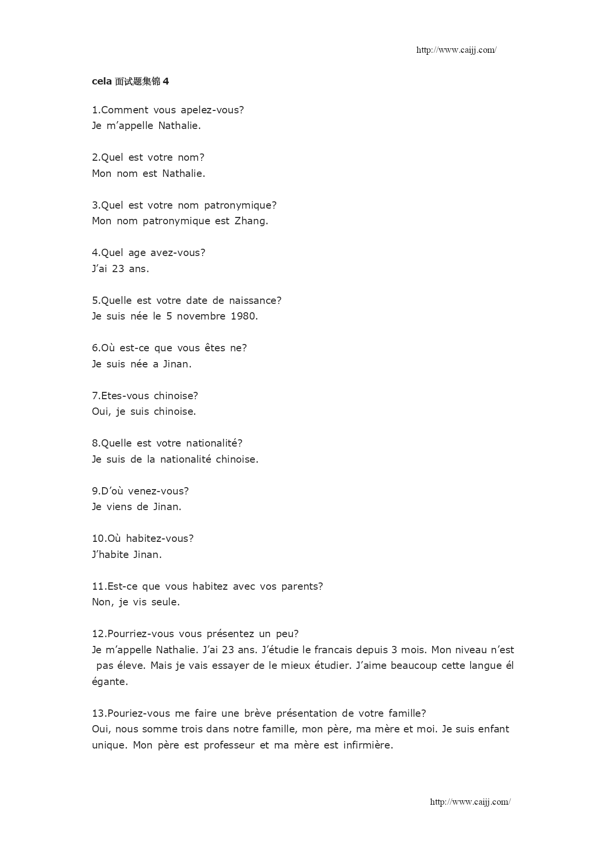 http://www.caijj.com/ http://www.caijj.com/ cela面试题集锦4 1.Commentvousapelez-vous?Jem’appelleNathalie.2.Quelestvotrenom?MonnomestNathalie.3.Quelestvotrenompatronymique?MonnompatronymiqueestZhang.4.Quelageavez-vous?J’ai23ans.5.Quelleestvotredatedenaissance?Jesuisnéele5novembre1980.6.Oùest-cequevousêtesne?JesuisnéeaJinan.7.Etes-vouschinoise?Oui,jesuischinoise.8.Quelleestvotrenationalité?Jesuisdelanationalitéchinoise.9.D’oùvenez-vous?JeviensdeJinan.10.Oùhabitez-vous?J’habiteJinan.11.Est-cequevoushabitezavecvosparents?Non,jevisseule.12.Pourriez-vousvousprésentezunpeu?Jem’appelleNathalie.J’ai23ans.J’étudielefrancaisdepuis3mois.Monniveaun’estpaséleve.Maisjevaisessayerdelemieuxétudier.J’aimebeaucoupcettelangueélégante.13.Pouriez-vousmefaireunebrèveprésentationdevotrefamille?Oui,noussommetroisdansnotrefamille,monpère,mamèreetmoi.Jesuisenfantunique.Monpèreestprofesseuretmamèreestinfirmière.14.Quelleestvotreprofession?Jenetravaillepasencore.Jesuissanstravail.15.Etes-vousmariée?Jenesuispasmariée.Jesuiscélibataire.16.Pourquoivousn’êtespasencoremariée?Parcequejesuistrèsjeuneetjeveuxcontinuermesétudes,alorsjeneveuxpasmemariermaintenant.17.Avez-vousunmariageprécédent?Non,jen’aipasdemariageprécédent.18.Est-cequevousfaitespartied’uneorganisationsociale?Oui,jefaispartiedalaLiguedelaJeunessecommunistedeChine.19.Quelestvotreétatdesanté?Jesuisenpleineforme(enbonnesanté).20.Avez-vouscontractéunemaladiementaleouphysiquetrèsgraveauparavant?Non,jen’aicontractéunemaladiementaleouphysiquetrèsgraveauparavant.21.Commentpassez-vousvosloisirs?Jefaisdusport,jelis,jevoisdesfilmes,etc.22.Est-cequevouspossédezunpasseport?Oui,jepossèdeunpasseportordinaire.23.Qu’est-cequevosparentspensentdevotredécision?Ilsmesoutiennentbeaucoup.Ilsm’encouragentd’allerfairemesétudesdansvotrepays.24.Est-cequevousavezdéjàdemandéunvisaauparavant?Non,c’estlapremièrefoisquejedemandeunvisa.25.Est-cequ’ilsontcommisdescrimes?Non,ilsn’ontcommisaucuncrime.26.Pouvez-vousmeprésentervotreexpériencescolaire?Oui,j’aifréquentéunécoleprim