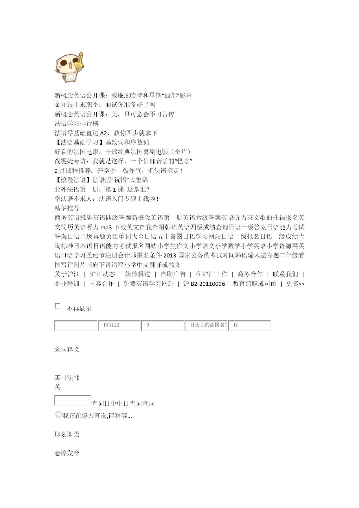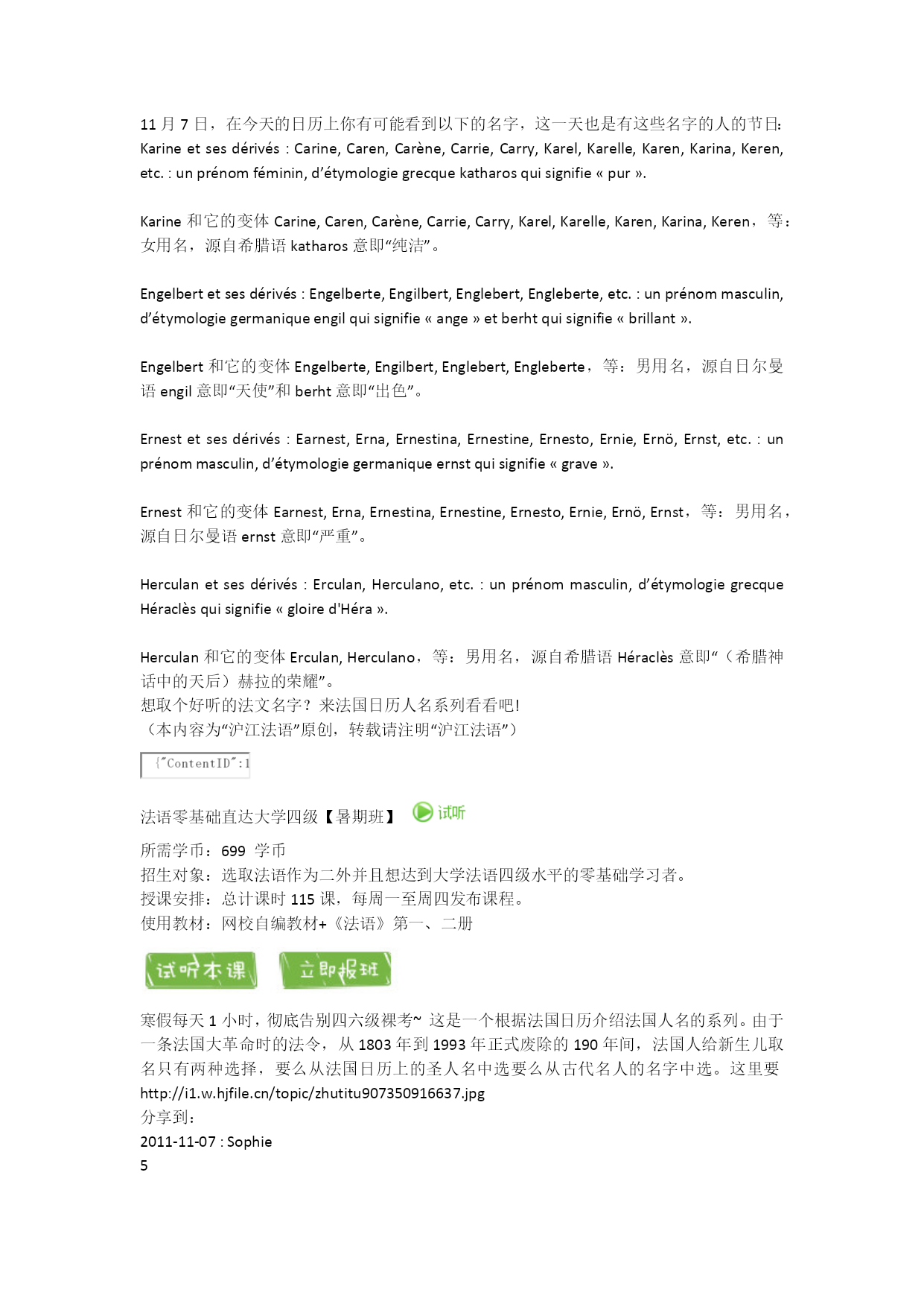 11月7日,在今天的日历上你有可能看到以下的名字,这一天也是有这些名字的人的节日: Karineetsesdérivés:Carine,Caren,Carène,Carrie,Carry,Karel,Karelle,Karen,Karina,Keren,etc.:unprénomféminin,d’étymologiegrecquekatharosquisignifie«pur». Karine和它的变体Carine,Caren,Carène,Carrie,Carry,Karel,Karelle,Karen,Karina,Keren,等:女用名,源自希腊语katharos意即“纯洁”。 Engelbertetsesdérivés:Engelberte,Engilbert,Englebert,Engleberte,etc.:unprénommasculin,d’étymologiegermaniqueengilquisignifie«ange»etberhtquisignifie«brillant». Engelbert和它的变体Engelberte,Engilbert,Englebert,Engleberte,等:男用名,源自日尔曼语engil意即“天使”和berht意即“出色”。 Ernestetsesdérivés:Earnest,Erna,Ernestina,Ernestine,Ernesto,Ernie,Ernö,Ernst,etc.:unprénommasculin,d’étymologiegermaniqueernstquisignifie«grave». Ernest和它的变体Earnest,Erna,Ernestina,Ernestine,Ernesto,Ernie,Ernö,Ernst,等:男用名,源自日尔曼语ernst意即“严重”。 Herculanetsesdérivés:Erculan,Herculano,etc.:unprénommasculin,d’étymologiegrecqueHéraclèsquisignifie«gloired'Héra». Herculan和它的变体Erculan,Herculano,等:男用名,源自希腊语Héraclès意即“(希腊神话中的天后)赫拉的荣耀”。 HYPERLINK"http://fr.hujiang.com/new/tag/%E6%97%A5%E5%8E%86/"\t"_blank"想取个好听的法文名字?来法国日历人名系列看看吧! (本内容为“沪江法语”原创,转载请注明“沪江法语”) HYPERLINK"http://class.hujiang.com/126792/intro?source=471"\t"_blank"法语零基础直达大学四级【暑期班】 所需学币:699学币招生对象:选取法语作为二外并且想达到大学法语四级水平的零基础学习者。授课安排:总计课时115课,每周一至周四发布课程。使用教材:网校自编教材+《法语》第一、二册 HYPERLINK"http://a4.yeshj.com/rd/47802"\t"_blank"寒假每天1小时,彻底告别四六级裸考~这是一个根据法国日历介绍法国人名的系列。由于一条法国大革命时的法令,从1803年到1993年正式废除的190年间,法国人给新生儿取名只有两种选择,要么从法国日历上的圣人名中选要么从古代名人的名字中选。这里要http://i1.w.hjfile.cn/topic/zhutitu907350916637.jpg 分享到: 2011-11-07:Sophie 5 参与越多,收获越多! 发表评论: 表达一些您的想法吧!HYPERLINK"http://www.hjenglish.com/new/review/193422/"\o"查看更多评论"已有0条评论>> 文明评论,理性发言!同时发布一条碎碎念 最新评论(时间排序) HYPERLINK"http://a4.yeshj.com/rd/47747"\t"_blank"团购今天为你免单! HYPERLINK"http://a4.yeshj.com/rd/47666"\t"_blank"练口语不用等到寒假,走起! HYPERLINK"http://a4.yeshj.com/rd/46567"\t"_blank"每天1小时英语轻松学 HYPERLINK"http://a4.yeshj.com/rd/43588"\t"_blank"免费少儿学习资料最全集结! 法语入门学习 HYPERLINK"http://www.hjenglish.com/fr/fayurumen/"\o"法语入门"\t