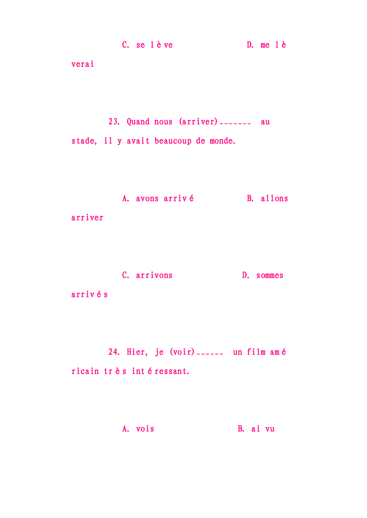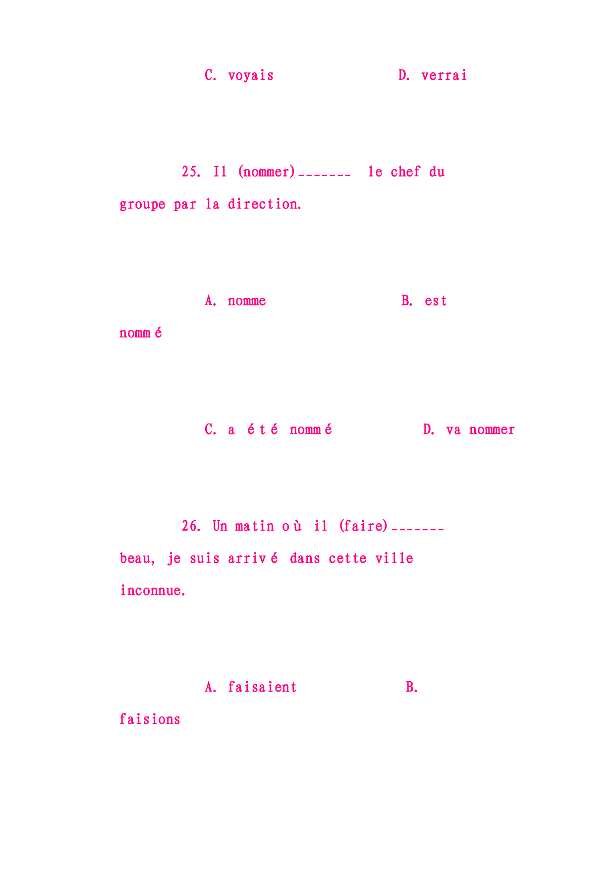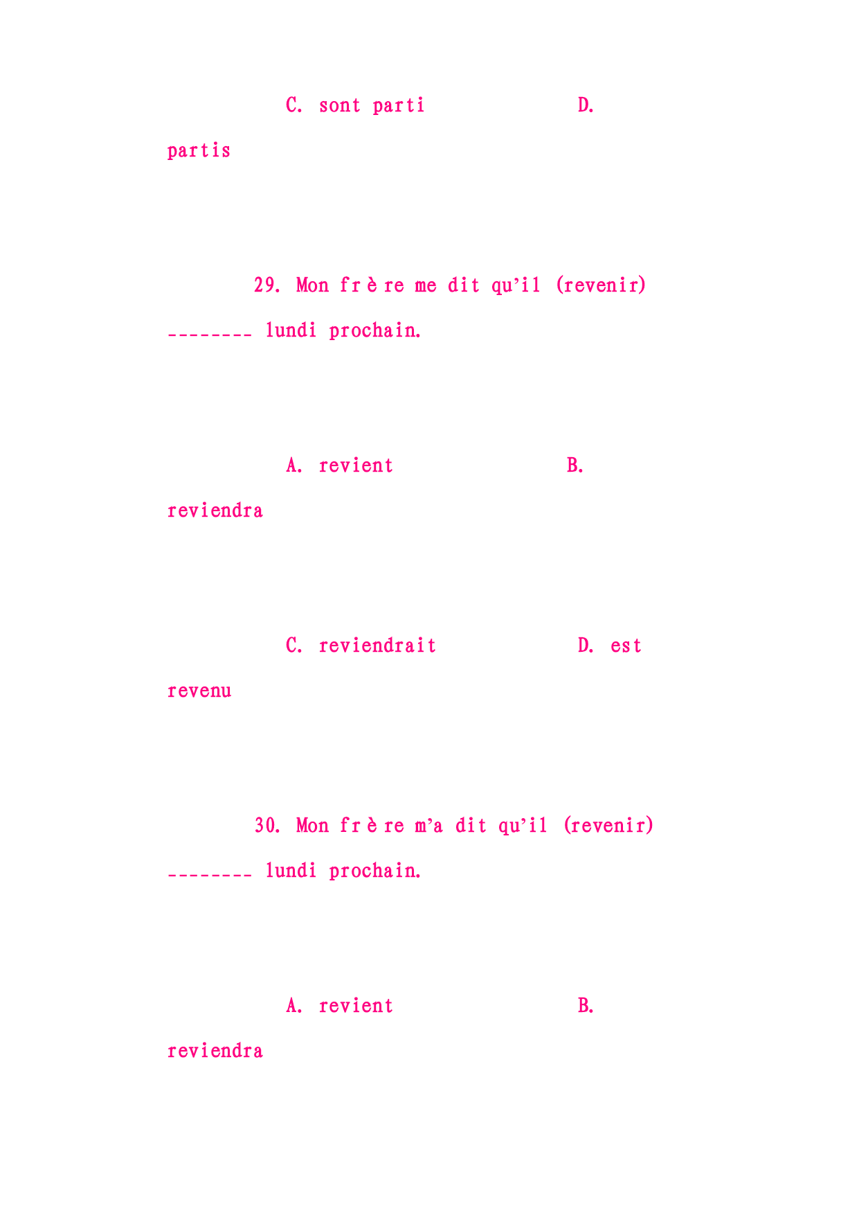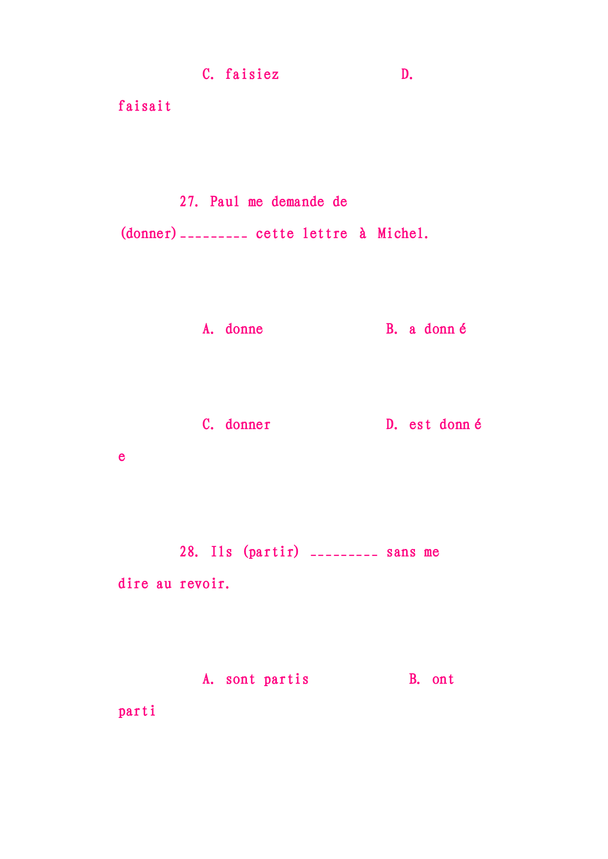 全部时态总结练习 选择适当的选项填空: 21.Il(travailler)_________danscetteusinependantdeuxans. A.travailleB.travaillait C.atravailléD.travaillera 22.D’habitude,je(selevr)_________tôtlematin. A.mesuislevéB.melève C.selèveD.melèverai 23.Quandnous(arriver)_______austade,ilyavaitbeaucoupdemonde. A.avonsarrivéB.allonsarriver C.arrivonsD.sommesarrivés 24.Hier,je(voir)______unfilmaméricaintrèsintéressant. A.voisB.aivu C.voyaisD.verrai 25.Il(nommer)_______lechefdugroupeparladirection. A.nomme B.estnommé C.aéténommé D.vanommer 26.Unmatinoùil(faire)_______beau,jesuisarrivédanscettevilleinconnue. A.faisaientB.faisions C.faisiezD.faisait 27.Paulmedemandede(donner)_________cettelettreàMichel. A.donneB.adonné C.donnerD.estdonnée 28.Ils(partir)_________sansmedireaurevoir. A.sontpartisB.ontparti C.sontpartiD.partis 29.Monfrèremeditqu’il(revenir)________lundiprochain. A.revientB.reviendra C.reviendraitD.estrevenu 30.Monfrèrem’aditqu’il(revenir)________lundiprochain. A.revientB.reviendra C.reviendrait D.estrevenu 31.Sophiem’atéléphonéqu’elle(avoir)______unbébélemoisdernier. A.avait B.aeu C.avaiteuD.a 用适当的形式填空 1.Elleamissonmanteaucematin.Maisil_______(nepasfaire)trèsfroid. 2.C’estl’unedesplusgrandesvillesqu’il_____(visiter)déjà. 3.Onjugeaitcettefemmequi____(tuer)sonmari. 4.L’élèveatoutdesuiteinforméleprofesseuretlefraudeur____(trouver)rapidement. 5.Ils______(sortir)quandvousrentrerezàlamaison. 6.Nousferonsunepromenadequandnous_______(finir)nosdevoirs. 7.Quandils_____(descendre)del’autobus,ilsontvuleurami. 8.Sij’aidutemps,je_____(aller)vousvoir. 9.Lemédecinaréponduauxquestions____(poser)parlesmalades. 10.Lesjournauxd’hier____(sevendre)trèsvite. 11.Après____(terminer)sesétudes,ilestdevenumédecin. 12.Leguidem’aditquelepeupledeParis____(semettre)engrèvelasemainedernière. 13.Marieluiademandépourquoiil____(être)enretardcejour-là. 14.Lepourboiren’estpasobligatoire,leservice____(comprendre)dansl’addition. 15.Cejour-làquandilestrentréàlamaison,sonpère_____(venir)departir. 16.Dèsqueje_____(avoir)desesnouvelles,