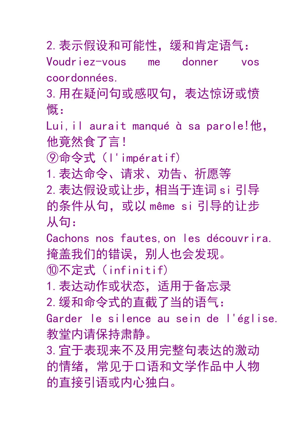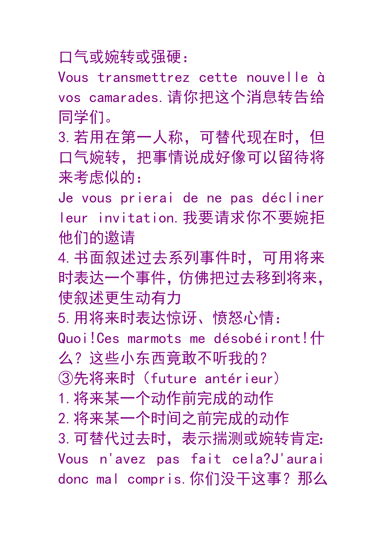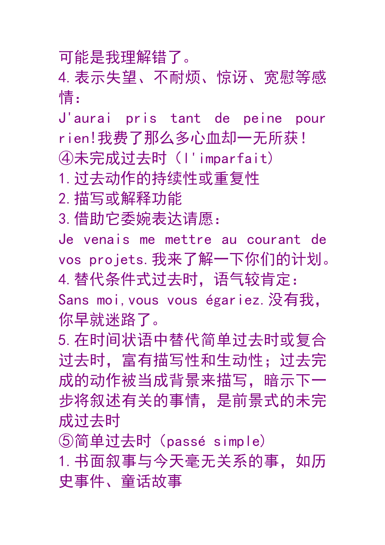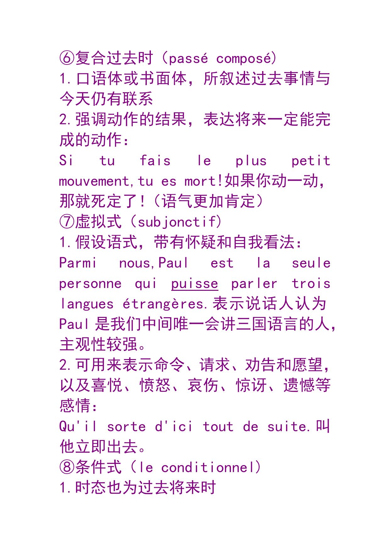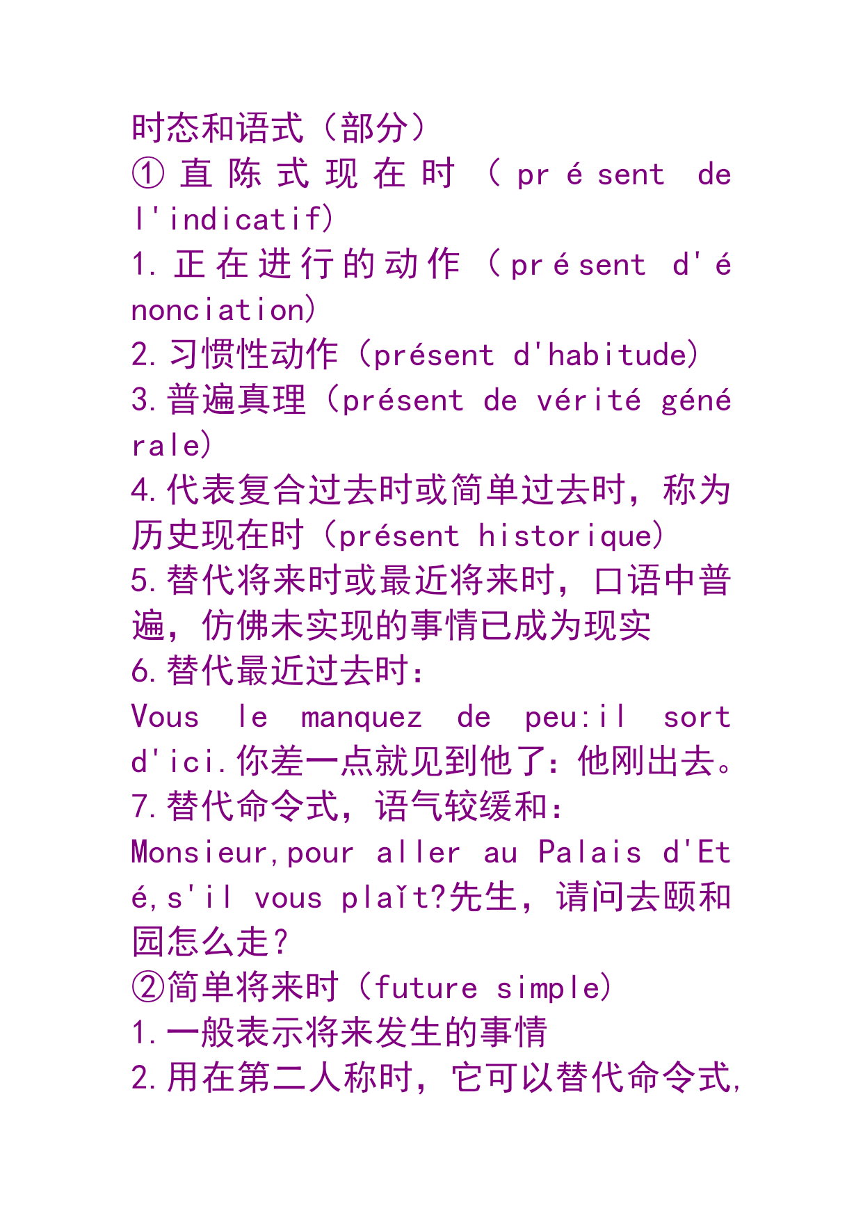 时态和语式(部分)①直陈式现在时(présentdel'indicatif)1.正在进行的动作(présentd'énonciation)2.习惯性动作(présentd'habitude)3.普遍真理(présentdevéritégénérale)4.代表复合过去时或简单过去时,称为历史现在时(présenthistorique)5.替代将来时或最近将来时,口语中普遍,仿佛未实现的事情已成为现实6.替代最近过去时:Vouslemanquezdepeu:ilsortd'ici.你差一点就见到他了:他刚出去。7.替代命令式,语气较缓和:Monsieur,pourallerauPalaisd'Eté,s'ilvousplaǐt?先生,请问去颐和园怎么走?②简单将来时(futuresimple)1.一般表示将来发生的事情2.用在第二人称时,它可以替代命令式,口气或婉转或强硬:Voustransmettrezcettenouvelleàvoscamarades.请你把这个消息转告给同学们。3.若用在第一人称,可替代现在时,但口气婉转,把事情说成好像可以留待将来考虑似的:Jevousprieraidenepasdéclinerleurinvitation.我要请求你不要婉拒他们的邀请4.书面叙述过去系列事件时,可用将来时表达一个事件,仿佛把过去移到将来,使叙述更生动有力5.用将来时表达惊讶、愤怒心情:Quoi!Cesmarmotsmedésobéiront!什么?这些小东西竟敢不听我的?③先将来时(futureantérieur)1.将来某一个动作前完成的动作2.将来某一个时间之前完成的动作3.可替代过去时,表示揣测或婉转肯定:Vousn'avezpasfaitcela?J'auraidoncmalcompris.你们没干这事?那么可能是我理解错了。4.表示失望、不耐烦、惊讶、宽慰等感情:J'auraipristantdepeinepourrien!我费了那么多心血却一无所获!④未完成过去时(l'imparfait)1.过去动作的持续性或重复性2.描写或解释功能3.借助它委婉表达请愿:Jevenaismemettreaucourantdevosprojets.我来了解一下你们的计划。4.替代条件式过去时,语气较肯定:Sansmoi,vousvouségariez.没有我,你早就迷路了。5.在时间状语中替代简单过去时或复合过去时,富有描写性和生动性;过去完成的动作被当成背景来描写,暗示下一步将叙述有关的事情,是前景式的未完成过去时⑤简单过去时(passésimple)1.书面叙事与今天毫无关系的事,如历史事件、童话故事⑥复合过去时(passécomposé)1.口语体或书面体,所叙述过去事情与今天仍有联系2.强调动作的结果,表达将来一定能完成的动作:Situfaislepluspetitmouvement,tuesmort!如果你动一动,那就死定了!(语气更加肯定)⑦虚拟式(subjonctif)1.假设语式,带有怀疑和自我看法:Parminous,Paulestlaseulepersonnequipuisseparlertroislanguesétrangères.表示说话人认为Paul是我们中间唯一会讲三国语言的人,主观性较强。2.可用来表示命令、请求、劝告和愿望,以及喜悦、愤怒、哀伤、惊讶、遗憾等感情:Qu'ilsorted'icitoutdesuite.叫他立即出去。⑧条件式(leconditionnel)1.时态也为过去将来时2.表示假设和可能性,缓和肯定语气:Voudriez-vousmedonnervoscoordonnées.3.用在疑问句或感叹句,表达惊讶或愤慨:Lui,ilauraitmanquéàsaparole!他,他竟然食了言!⑨命令式(l'impératif)1.表达命令、请求、劝告、祈愿等2.表达假设或让步,相当于连词si引导的条件从句,或以mêmesi引导的让步从句:Cachonsnosfautes,onlesdécouvrira.掩盖我们的错误,别人也会发现。⑩不定式(infinitif)1.表达动作或状态,适用于备忘录2.缓和命令式的直截了当的语气:Garderlesilenceauseindel'église.教堂内请保持肃静。3.宜于表现来不及用完整句表达的激动的情绪,常见于口语和文学作品中人物的直接引语或内心独白。4.书面中用不定式代替过去时,表达动作接续的迅疾,这种不定式称为历史不定式或叙述不定式(infinitifhistoriqueoudenarration),一般用介词de引导:ils'enallapassersurlebordd'unétang.Grenouillesaussitǒtd
