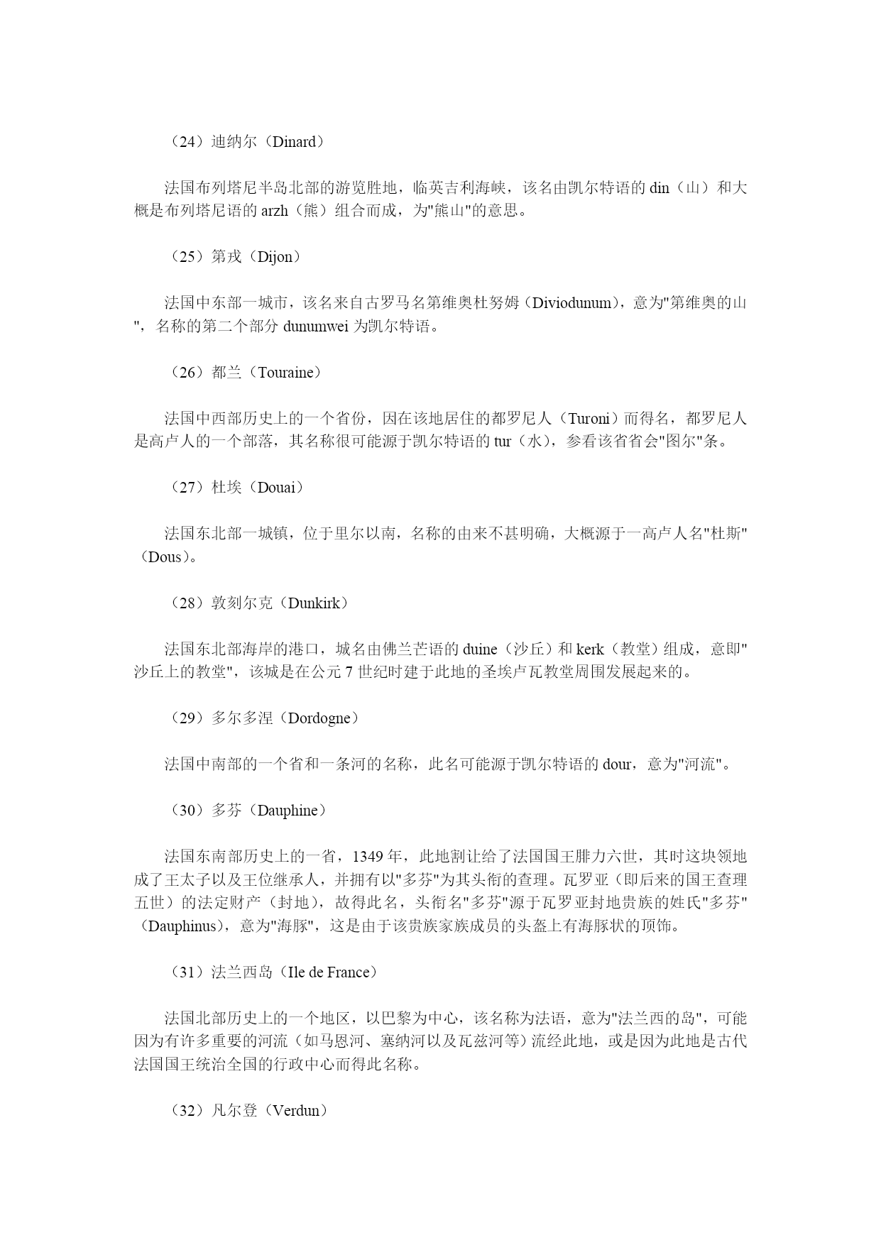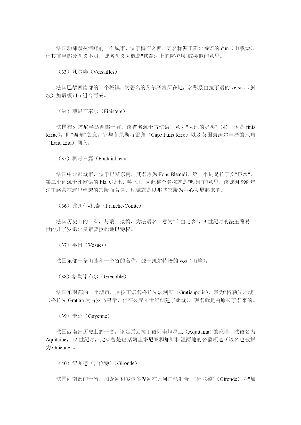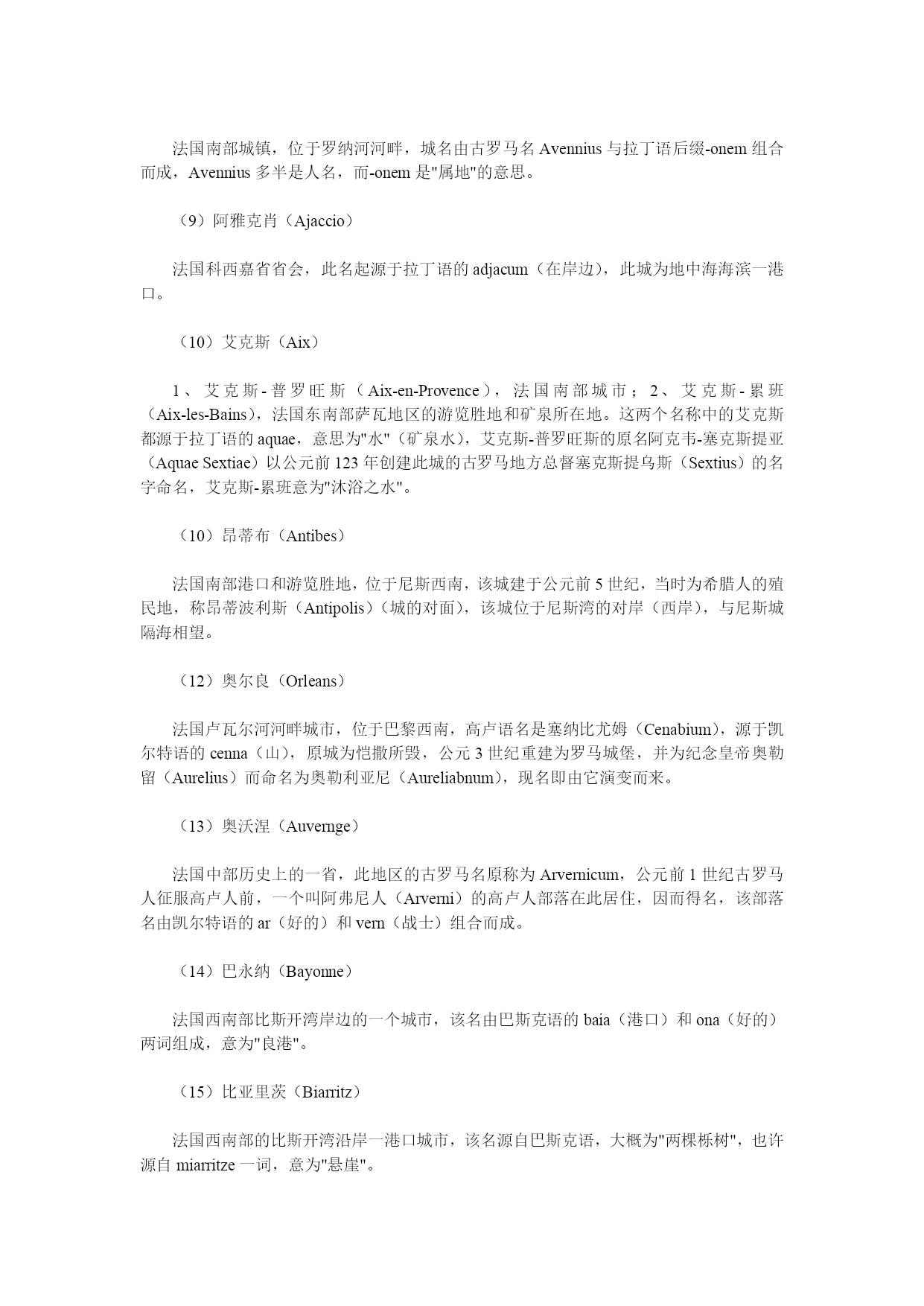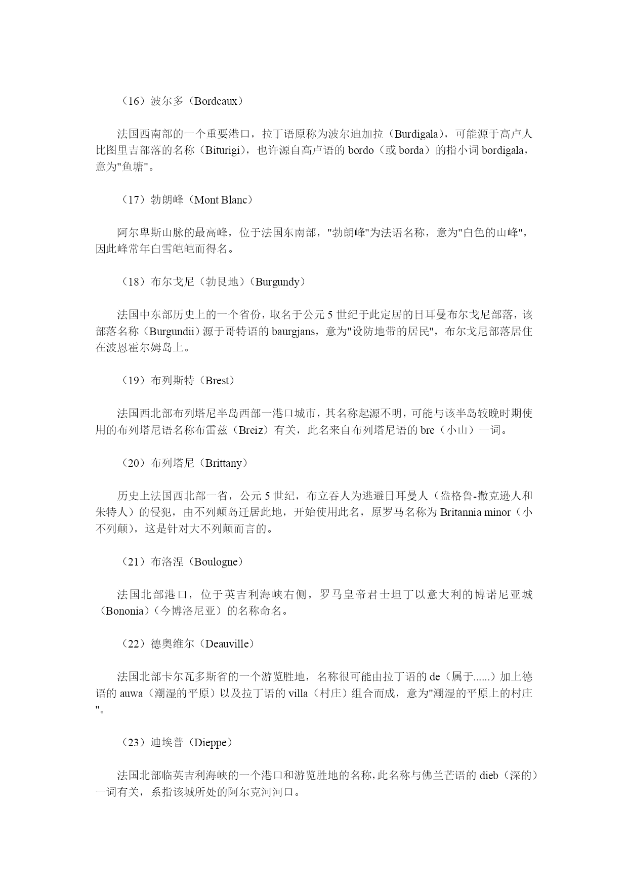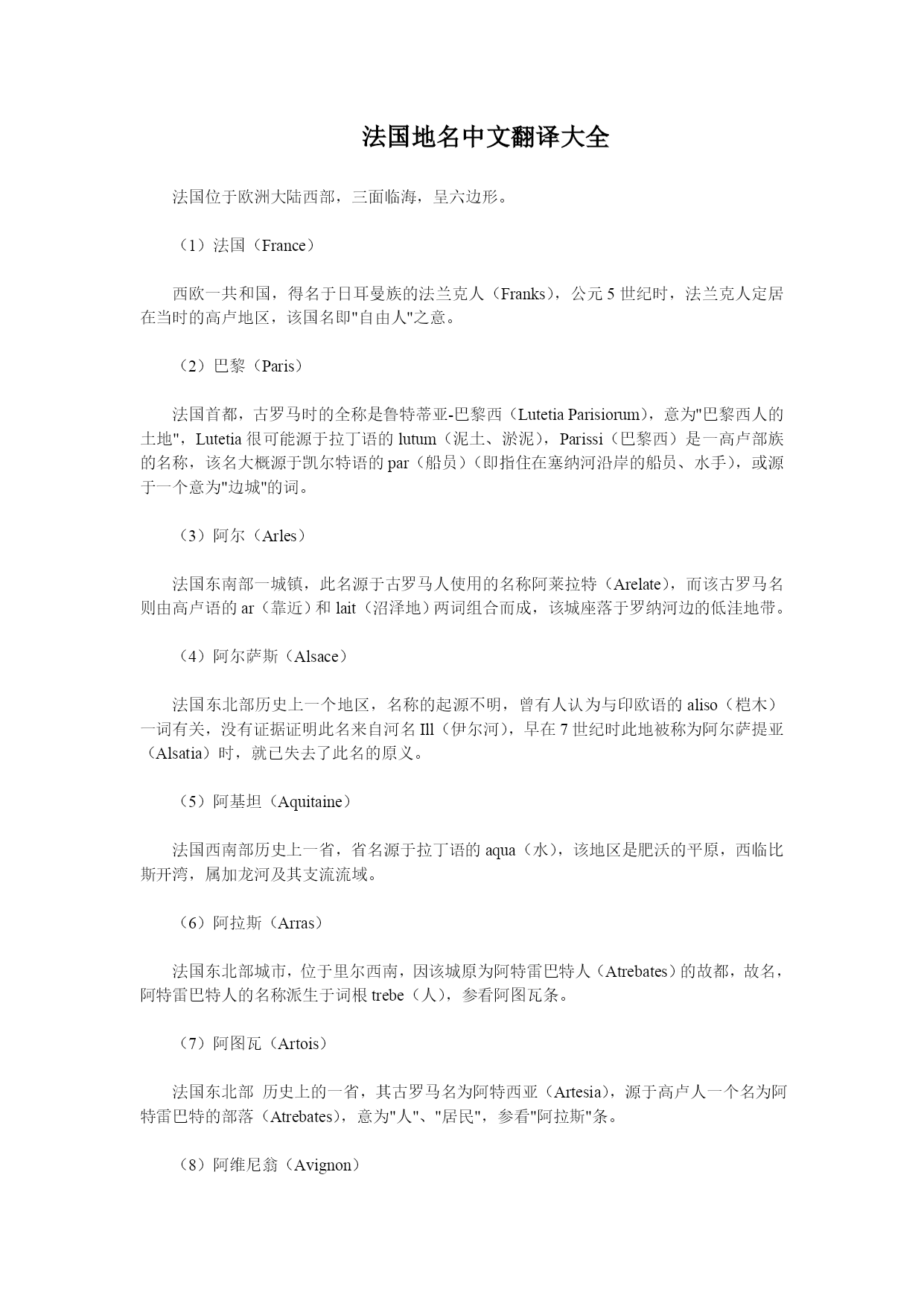 法国地名中文翻译大全 法国位于欧洲大陆西部,三面临海,呈六边形。 (1)法国(France) 西欧一共和国,得名于日耳曼族的法兰克人(Franks),公元5世纪时,法兰克人定居在当时的高卢地区,该国名即"自由人"之意。 (2)巴黎(Paris) 法国首都,古罗马时的全称是鲁特蒂亚-巴黎西(LutetiaParisiorum),意为"巴黎西人的土地",Lutetia很可能源于拉丁语的lutum(泥土、淤泥),Parissi(巴黎西)是一高卢部族的名称,该名大概源于凯尔特语的par(船员)(即指住在塞纳河沿岸的船员、水手),或源于一个意为"边城"的词。 (3)阿尔(Arles) 法国东南部一城镇,此名源于古罗马人使用的名称阿莱拉特(Arelate),而该古罗马名则由高卢语的ar(靠近)和lait(沼泽地)两词组合而成,该城座落于罗纳河边的低洼地带。 (4)阿尔萨斯(Alsace) 法国东北部历史上一个地区,名称的起源不明,曾有人认为与印欧语的aliso(桤木)一词有关,没有证据证明此名来自河名Ill(伊尔河),早在7世纪时此地被称为阿尔萨提亚(Alsatia)时,就已失去了此名的原义。 (5)阿基坦(Aquitaine) 法国西南部历史上一省,省名源于拉丁语的aqua(水),该地区是肥沃的平原,西临比斯开湾,属加龙河及其支流流域。 (6)阿拉斯(Arras) 法国东北部城市,位于里尔西南,因该城原为阿特雷巴特人(Atrebates)的故都,故名,阿特雷巴特人的名称派生于词根trebe(人),参看阿图瓦条。 (7)阿图瓦(Artois) 法国东北部历史上的一省,其古罗马名为阿特西亚(Artesia),源于高卢人一个名为阿特雷巴特的部落(Atrebates),意为"人"、"居民",参看"阿拉斯"条。 (8)阿维尼翁(Avignon) 法国南部城镇,位于罗纳河河畔,城名由古罗马名Avennius与拉丁语后缀-onem组合而成,Avennius多半是人名,而-onem是"属地"的意思。 (9)阿雅克肖(Ajaccio) 法国科西嘉省省会,此名起源于拉丁语的adjacum(在岸边),此城为地中海海滨一港口。 (10)艾克斯(Aix) 1、艾克斯-普罗旺斯(Aix-en-Provence),法国南部城市;2、艾克斯-累班(Aix-les-Bains),法国东南部萨瓦地区的游览胜地和矿泉所在地。这两个名称中的艾克斯都源于拉丁语的aquae,意思为"水"(矿泉水),艾克斯-普罗旺斯的原名阿克韦-塞克斯提亚(AquaeSextiae)以公元前123年创建此城的古罗马地方总督塞克斯提乌斯(Sextius)的名字命名,艾克斯-累班意为"沐浴之水"。 (10)昂蒂布(Antibes) 法国南部港口和游览胜地,位于尼斯西南,该城建于公元前5世纪,当时为希腊人的殖民地,称昂蒂波利斯(Antipolis)(城的对面),该城位于尼斯湾的对岸(西岸),与尼斯城隔海相望。 (12)奥尔良(Orleans) 法国卢瓦尔河河畔城市,位于巴黎西南,高卢语名是塞纳比尤姆(Cenabium),源于凯尔特语的cenna(山),原城为恺撒所毁,公元3世纪重建为罗马城堡,并为纪念皇帝奥勒留(Aurelius)而命名为奥勒利亚尼(Aureliabnum),现名即由它演变而来。 (13)奥沃涅(Auvernge) 法国中部历史上的一省,此地区的古罗马名原称为Arvernicum,公元前1世纪古罗马人征服高卢人前,一个叫阿弗尼人(Arverni)的高卢人部落在此居住,因而得名,该部落名由凯尔特语的ar(好的)和vern(战士)组合而成。 (14)巴永纳(Bayonne) 法国西南部比斯开湾岸边的一个城市,该名由巴斯克语的baia(港口)和ona(好的)两词组成,意为"良港"。 (15)比亚里茨(Biarritz) 法国西南部的比斯开湾沿岸一港口城市,该名源自巴斯克语,大概为"两棵栎树",也许源自miarritze一词,意为"悬崖"。 (16)波尔多(Bordeaux) 法国西南部的一个重要港口,拉丁语原称为波尔迪加拉(Burdigala),可能源于高卢人比图里吉部落的名称(Biturigi),也许源自高卢语的bordo(或borda)的指小词bordigala,意为"鱼塘"。 (17)勃朗峰(MontBlanc) 阿尔卑斯山脉的最高峰,位于法国东南部,"勃朗峰"为法语名称,意为"白色的山峰",因此峰常年白雪皑皑而得名。 (18)布尔戈尼(勃艮地)(Burgundy) 法国中东部历史上的一个省份,取名于公元5世纪于此定居的日耳曼布尔戈尼部落,该部落名称(Burgundii)源于哥特语的baurgjans,意为"设防地