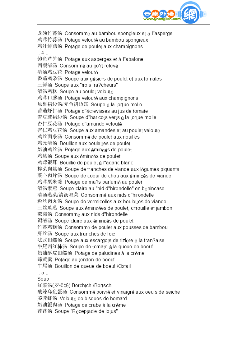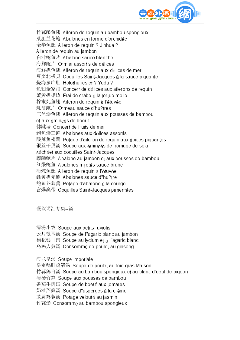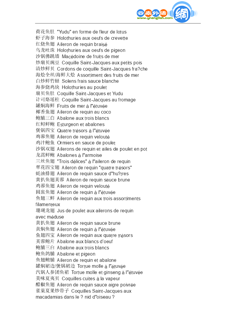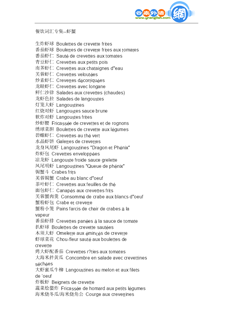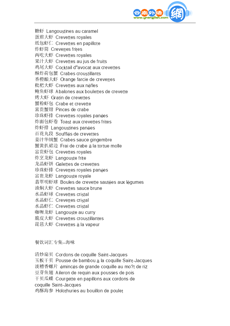 餐饮词汇专集--虾蟹 生炸虾球Boulettesdecrevettefrites 番茄虾球Boulettesdecrevettefritesauxtomates 番茄虾仁Sautédecrevettesauxtomates 青豆虾仁Crevettesauxpetitspois 南荠虾仁Crevettesauxchataignesd''eau 芙蓉虾仁Crevettesveloutées 炒素虾仁Crevettesdécortiquées 龙眼虾仁Crevettesaveclongane 鲜仁沙律Saladesauxcrevettes(chaudes) 龙虾色拉Saladesdelangoustes 灯笼大虾Langoustines 红烧对虾Langoustessaucebrune 软炸对虾Langoustesfrites 炒虾腰Fricasséedecrevettesetderognons 绣球菜胆Boulettesdecrevetteauxlégumes 碧螺虾仁Crevettesauthévert 水晶虾饼Galettesdecrevettes 龙身凤尾虾Langoustines"DragonetPhénix" 炸虾包Crevettesenveloppées 凉龙虾Langoustefroidesaucegrelette 凤尾明虾Langoustines"Queuedephénix" 锔蟹斗Crabesfrits 芙蓉锔蟹Crabeaublancd''oeuf 茶叶虾仁Crevettesauxfeuillesdethé 面包虾仁Canapésauxcrevettesfrits 芙蓉蟹肉羹Consommédecrabeauxblancsd''oeuf 蟹粉虾包Crabeetcrevette 蟹粉小笼Painsfarcisdechairdecrabesàla vapeur 番茄虾排Crevettespanéesàlasaucedetomate 扒虾球Boulettesdecrevettesautées 木须大虾Omeletteauxémincésdecrevette 虾球菜花Chou-fleursautéauxboulettesde crevette 烤大虾配番茄Crevettesr?tiesauxtomates 大海米拌黄瓜Concombreensaladeaveccrevettines séchées 大虾蜜瓜牛柳Langoustinesaumelonetauxfilets de’oeuf 炸板虾Beignetsdecrevette 蔬菜烩螯炸Fricasséedehomardauxpetitslégumes 海米烧冬瓜/海米烧角公Courgeauxcrevettines 糖虾Langoustinesaucaramel 蛋煎大虾Crevettesroyales 纸包虾仁Crevettesenpapillote 炸虾筒Crevettesfrites 两吃大虾Crevettesroyales 果汁大虾Crevettesaujusdefruits 鸡尾大虾Cocktaild''avocatauxcrevettes 酥炸荷包蟹Crabescroustillants 香橙酿大虾Orangefarciedecrevettes 枇杷大虾Crevettesauxnèfles 鲍鱼虾球Abalonesauxboulettesdecrevette 烤大虾Gratindecrevettes 蟹粉虾包Crabeetcrevette 富贵蟹钳Pincesdecrabe 珍珠虾排Crevettesroyalespanées 炸面包虾卷Toastauxcrevettesfrites 炸虾排Langoustinespanées 百花丸段Soufflésdecrevettes 姜汁华绒蟹Crabessaucegingembre 蟹黄扒裙边Fraidecrabeàlatortuemolle 富贵虾包Crevettesroyales 炸烹龙虾Langoustefrite 龙晶虾饼Galettesdecrevettes 珍珠虾排Crevettesroyalespanées 富贵龙虾Langousteroyale 翡翠明虾球Boulesdecrevettesautéesauxlégumes 油焖大虾Crevettessaucebrune 水晶虾球Crevettescristal 水晶虾仁Crevettescristal 水晶虾仁Crevettescristal 咖喱龙虾Langousteaucurry 脆皮大虾Crevettescroustillantes 琵琶大虾Crevettesàlavapeur 餐饮词汇专集--海味 清炒扇贝Cordonsdecoq