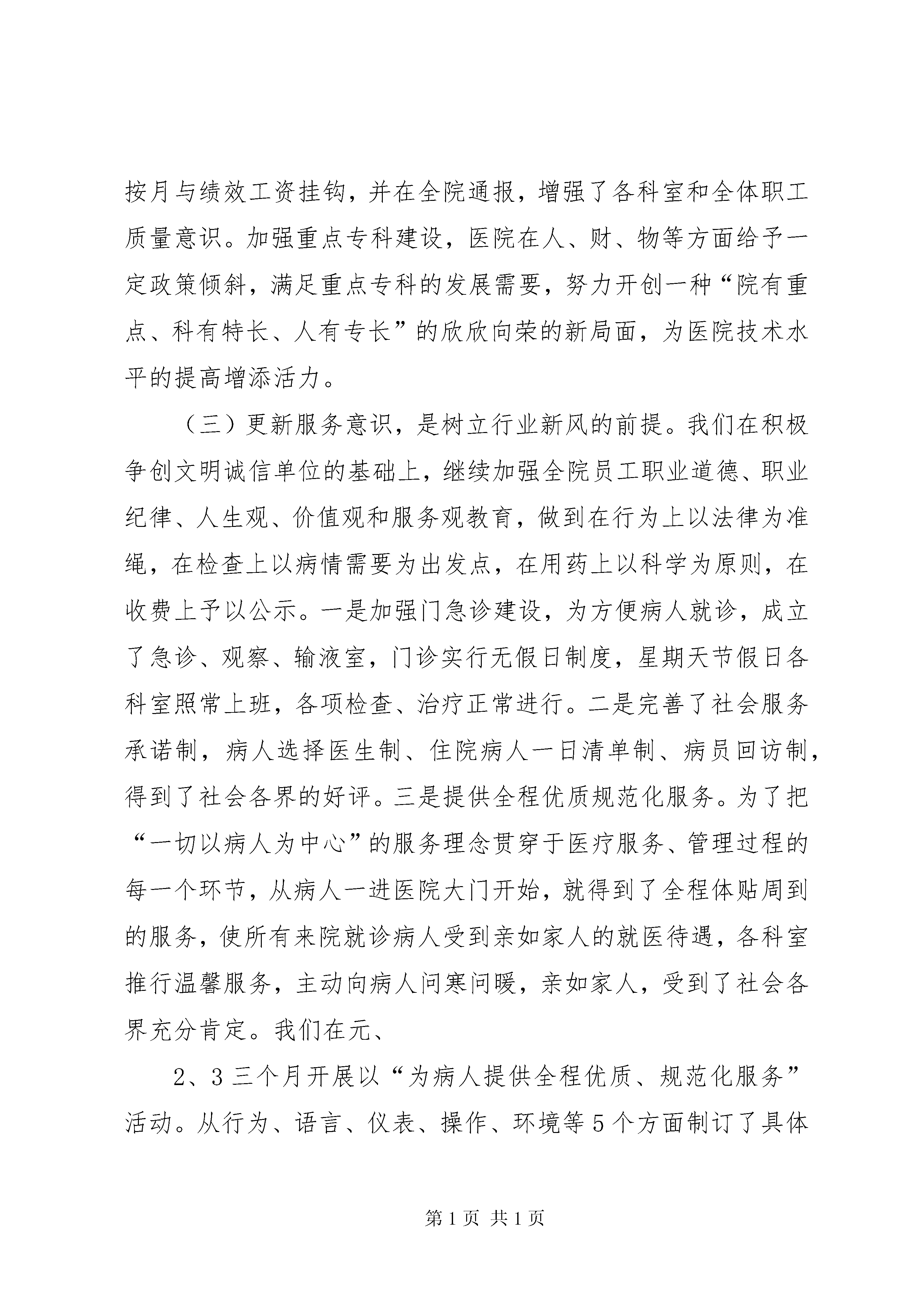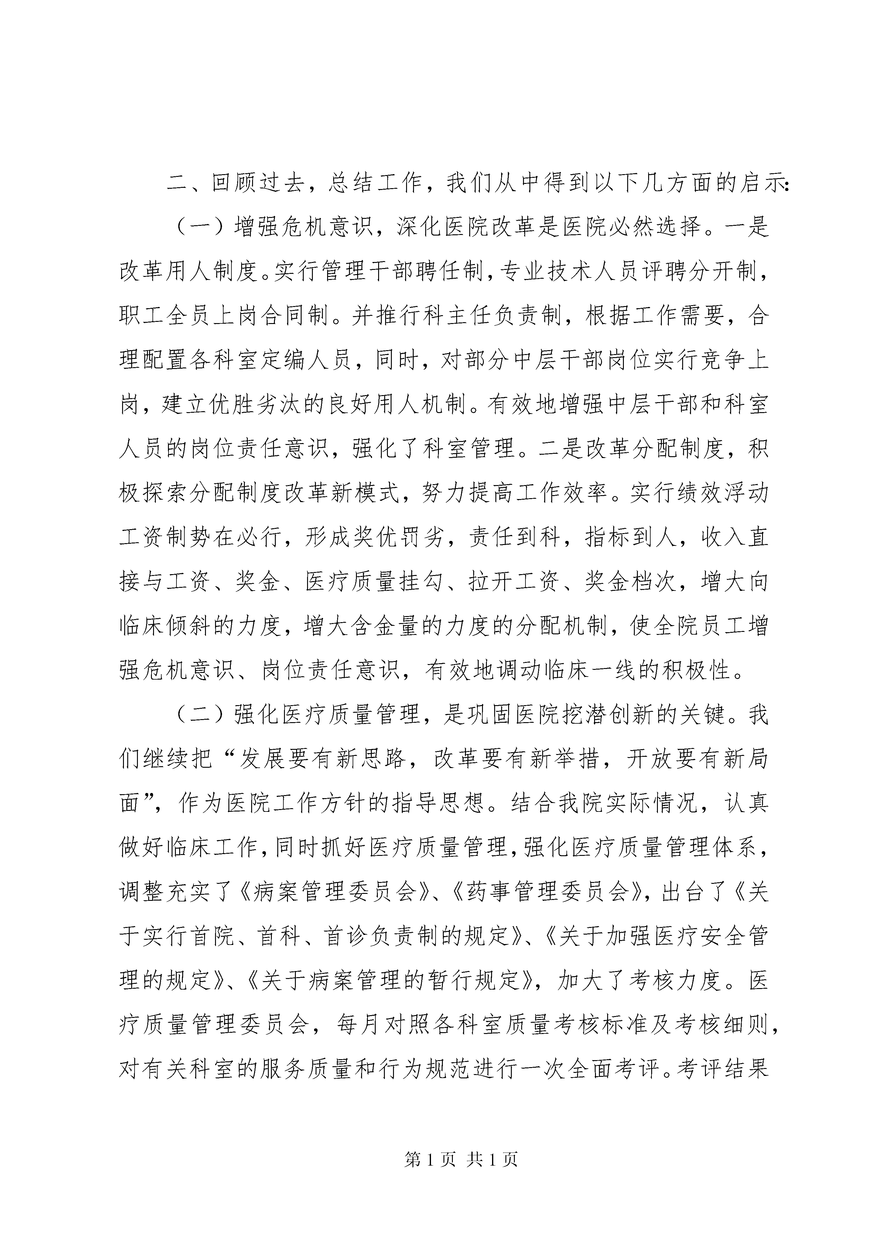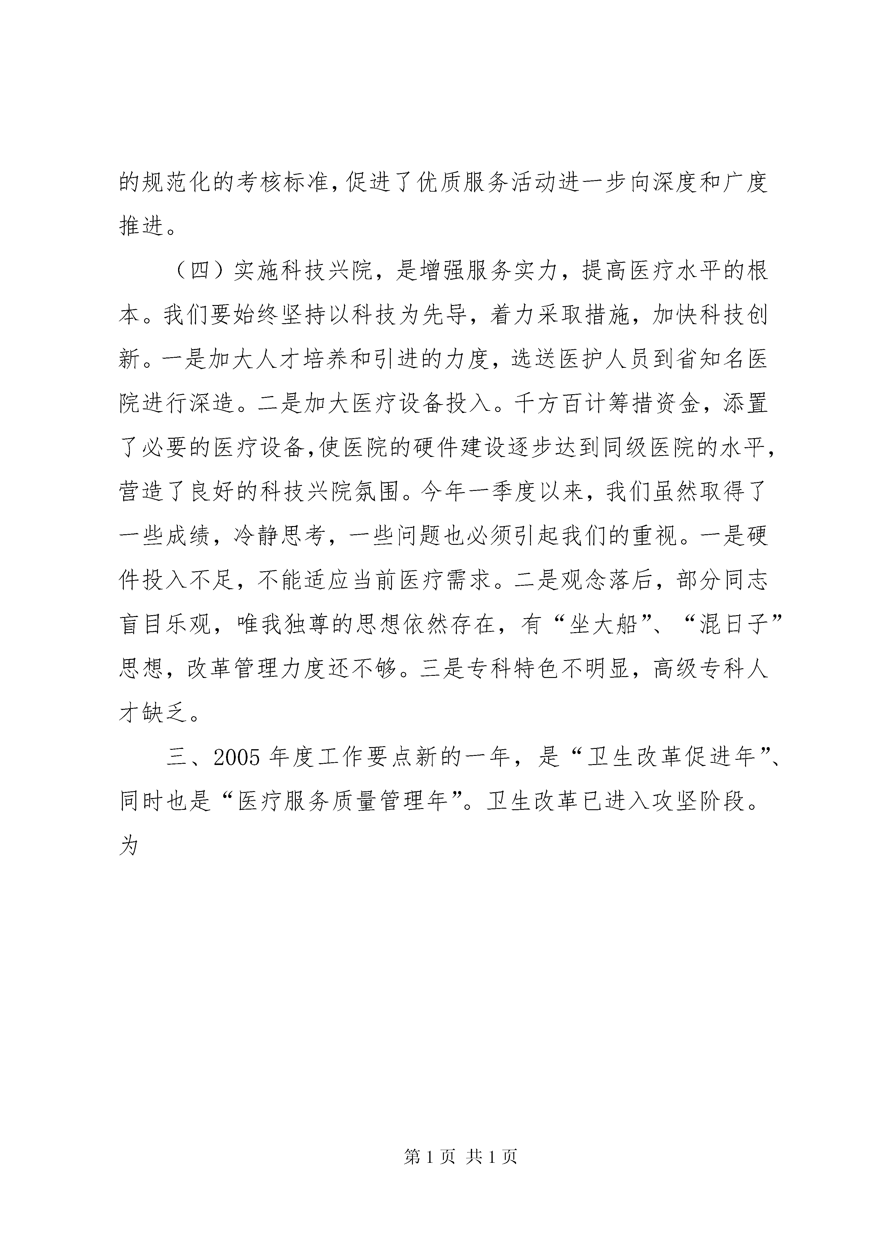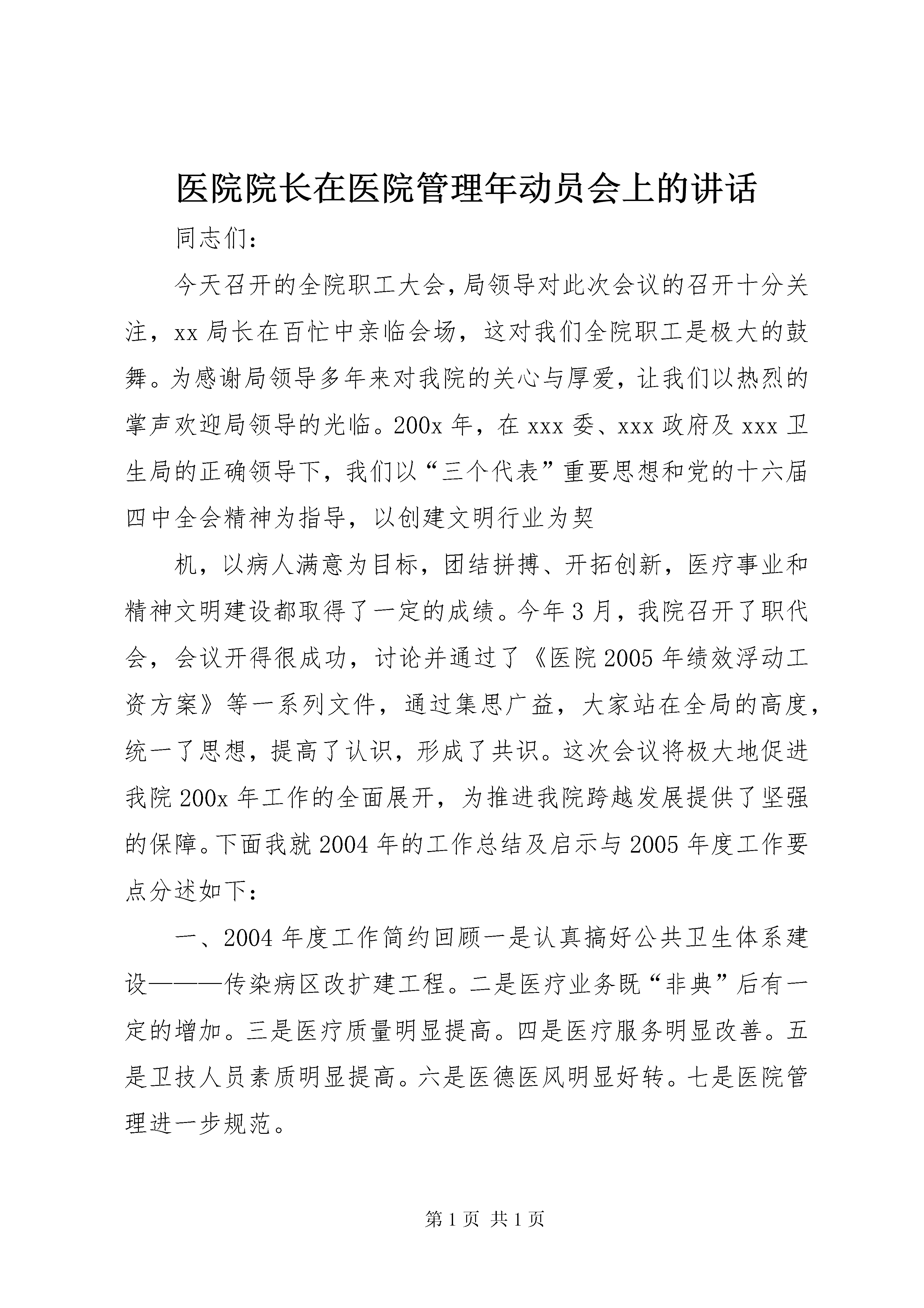 医院院长在医院管理年动员会上的讲话同志们:今天召开的全院职工大会,局领导对此次会议的召开十分关注,xx局长在百忙中亲临会场,这对我们全院职工是极大的鼓舞。为感谢局领导多年来对我院的关心与厚爱,让我们以热烈的掌声欢迎局领导的光临。200x年,在xxx委、xxx政府及xxx卫生局的正确领导下,我们以“三个代表”重要思想和党的十六届四中全会精神为指导,以创建文明行业为契机,以病人满意为目标,团结拼搏、开拓创新,医疗事业和精神文明建设都取得了一定的成绩。今年3月,我院召开了职代会,会议开得很成功,讨论并通过了《医院2005年绩效浮动工资方案》等一系列文件,通过集思广益,大家站在全局的高度,统一了思想,提高了认识,形成了共识。这次会议将极大地促进我院200x年工作的全面展开,为推进我院跨越发展提供了坚强的保障。下面我就2004年的工作总结及启示与2005年度工作要点分述如下:一、2004年度工作简约回顾一是认真搞好公共卫生体系建设———传染病区改扩建工程。二是医疗业务既“非典”后有一定的增加。三是医疗质量明显提高。四是医疗服务明显改善。五是卫技人员素质明显提高。六是医德医风明显好转。七是医院管理进一步规范。二、回顾过去,总结工作,我们从中得到以下几方面的启示:(一)增强危机意识,深化医院改革是医院必然选择。一是改革用人制度。实行管理干部聘任制,专业技术人员评聘分开制,职工全员上岗合同制。并推行科主任负责制,根据工作需要,合理配置各科室定编人员,同时,对部分中层干部岗位实行竞争上岗,建立优胜劣汰的良好用人机制。有效地增强中层干部和科室人员的岗位责任意识,强化了科室管理。二是改革分配制度,积极探索分配制度改革新模式,努力提高工作效率。实行绩效浮动工资制势在必行,形成奖优罚劣,责任到科,指标到人,收入直接与工资、奖金、医疗质量挂勾、拉开工资、奖金档次,增大向临床倾斜的力度,增大含金量的力度的分配机制,使全院员工增强危机意识、岗位责任意识,有效地调动临床一线的积极性。(二)强化医疗质量管理,是巩固医院挖潜创新的关键。我们继续把“发展要有新思路,改革要有新举措,开放要有新局面”,作为医院工作方针的指导思想。结合我院实际情况,认真做好临床工作,同时抓好医疗质量管理,强化医疗质量管理体系,调整充实了《病案管理委员会》、《药事管理委员会》,出台了《关于实行首院、首科、首诊负责制的规定》、《关于加强医疗安全管理的规定》、《关于病案管理的暂行规定》,加大了考核力度。医疗质量管理委员会,每月对照各科室质量考核标准及考核细则,对有关科室的服务质量和行为规范进行一次全面考评。考评结果按月与绩效工资挂钩,并在全院通报,增强了各科室和全体职工质量意识。加强重点专科建设,医院在人、财、物等方面给予一定政策倾斜,满足重点专科的发展需要,努力开创一种“院有重点、科有特长、人有专长”的欣欣向荣的新局面,为医院技术水平的提高增添活力。(三)更新服务意识,是树立行业新风的前提。我们在积极争创文明诚信单位的基础上,继续加强全院员工职业道德、职业纪律、人生观、价值观和服务观教育,做到在行为上以法律为准绳,在检查上以病情需要为出发点,在用药上以科学为原则,在收费上予以公示。一是加强门急诊建设,为方便病人就诊,成立了急诊、观察、输液室,门诊实行无假日制度,星期天节假日各科室照常上班,各项检查、治疗正常进行。二是完善了社会服务承诺制,病人选择医生制、住院病人一日清单制、病员回访制,得到了社会各界的好评。三是提供全程优质规范化服务。为了把“一切以病人为中心”的服务理念贯穿于医疗服务、管理过程的每一个环节,从病人一进医院大门开始,就得到了全程体贴周到的服务,使所有来院就诊病人受到亲如家人的就医待遇,各科室推行温馨服务,主动向病人问寒问暖,亲如家人,受到了社会各界充分肯定。我们在元、2、3三个月开展以“为病人提供全程优质、规范化服务”活动。从行为、语言、仪表、操作、环境等5个方面制订了具体的规范化的考核标准,促进了优质服务活动进一步向深度和广度推进。(四)实施科技兴院,是增强服务实力,提高医疗水平的根本。我们要始终坚持以科技为先导,着力采取措施,加快科技创新。一是加大人才培养和引进的力度,选送医护人员到省知名医院进行深造。二是加大医疗设备投入。千方百计筹措资金,添置了必要的医疗设备,使医院的硬件建设逐步达到同级医院的水平,营造了良好的科技兴院氛围。今年一季度以来,我们虽然取得了一些成绩,冷静思考,一些问题也必须引起我们的重视。一是硬件投入不足,不能适应当前医疗需求。二是观念落后,部分同志盲目乐观,唯我独尊的思想依然存在,有“坐大船”、“混日子”思想,改革管理力度还不够。三是专科特色不明显,高级专科人才缺乏。三、2005年度工作要点新的一年,是“卫生改革促进年”、同时也