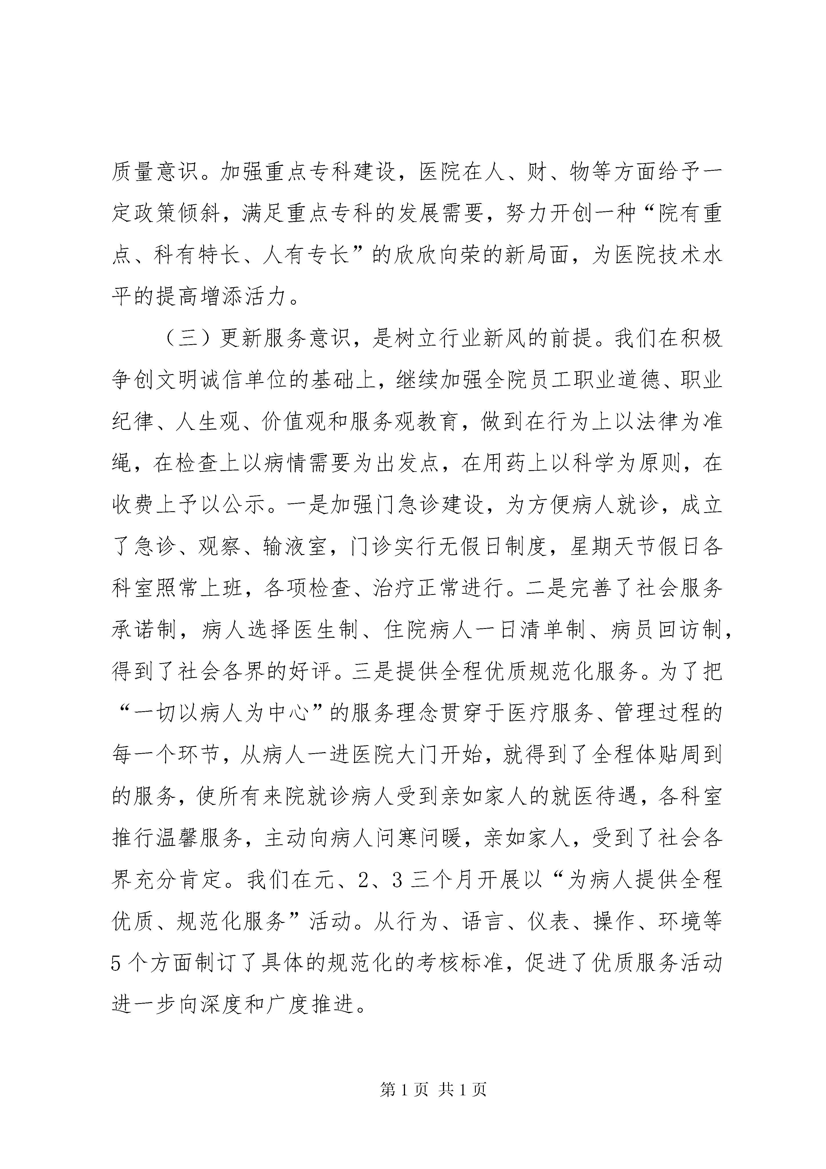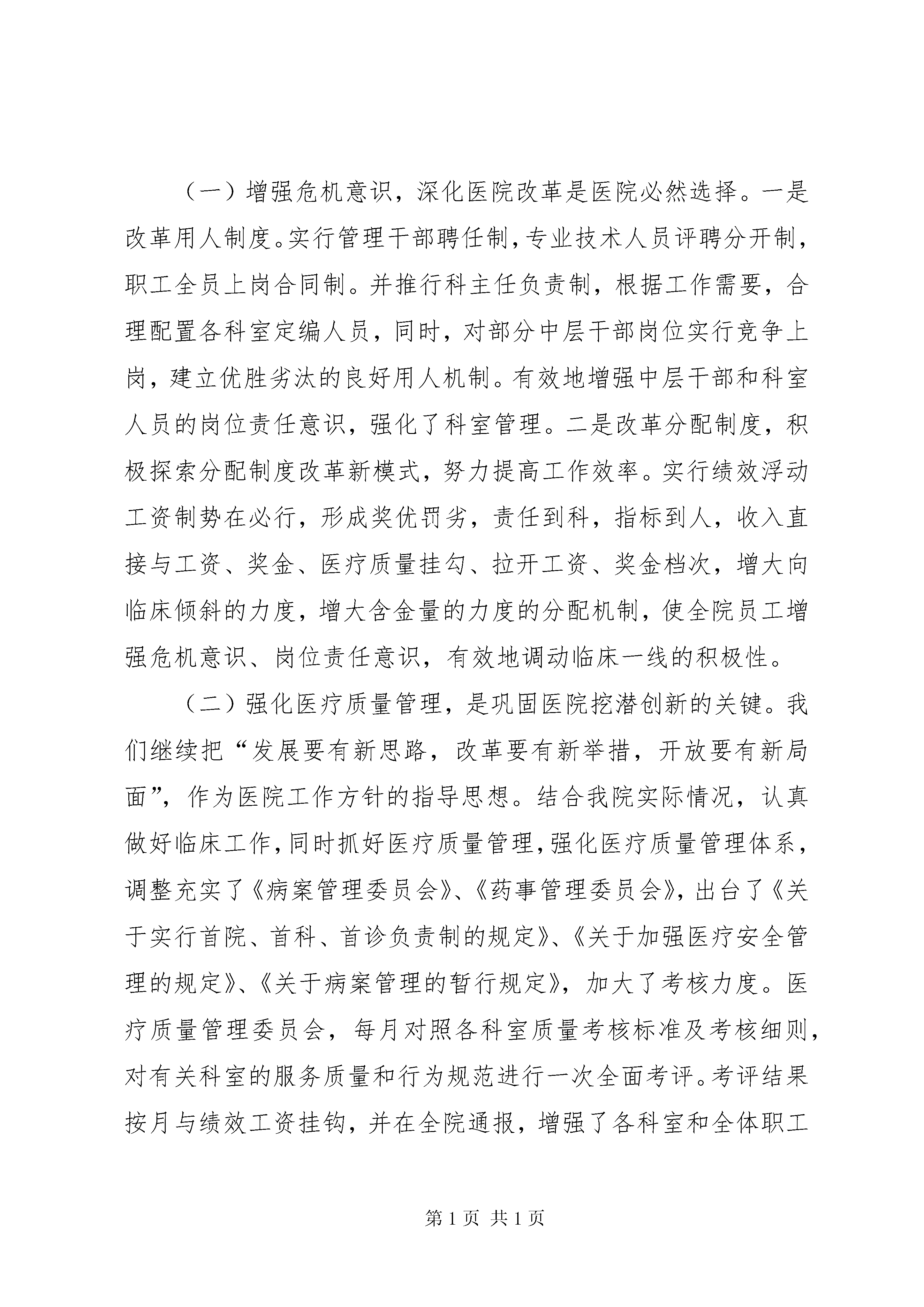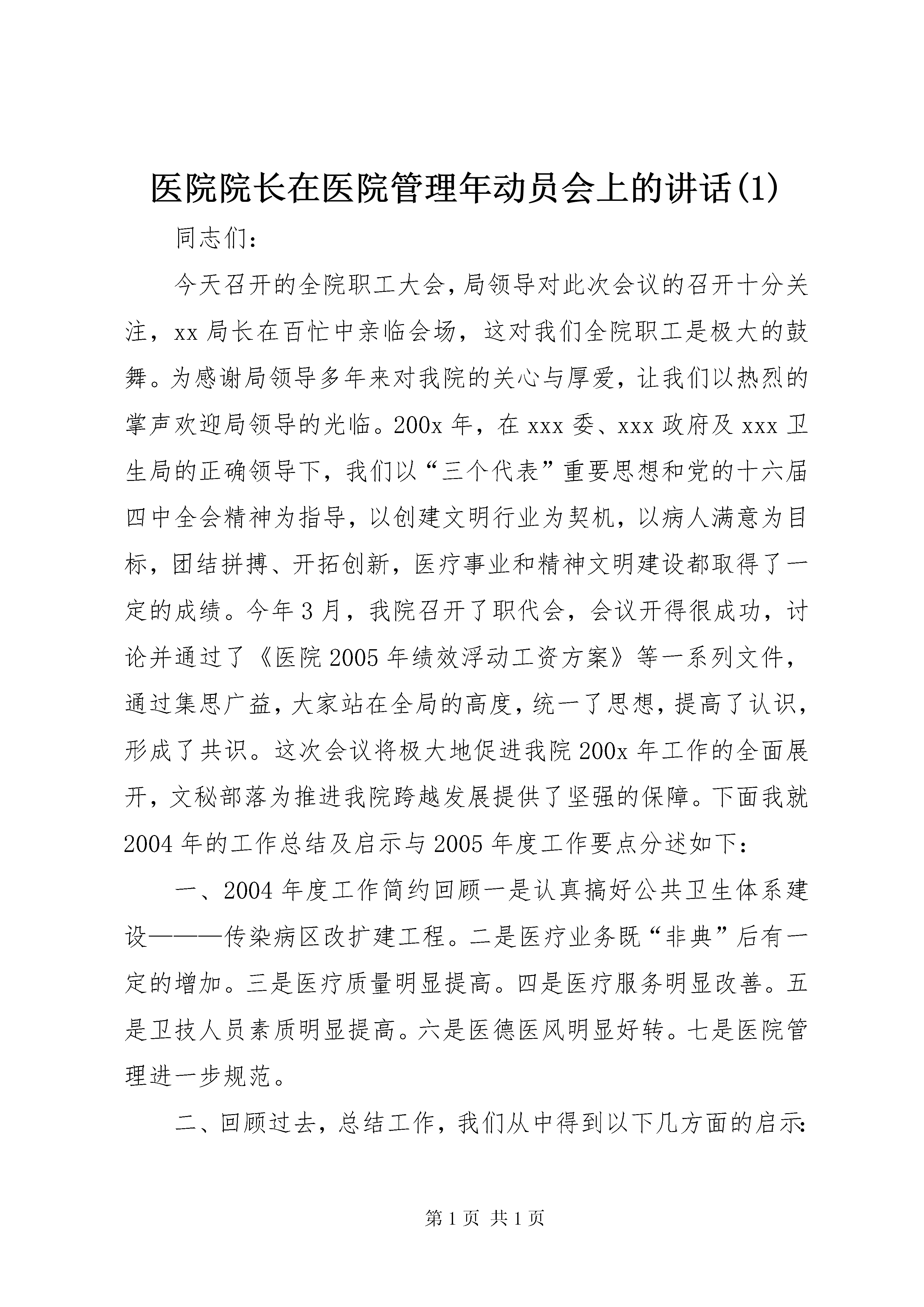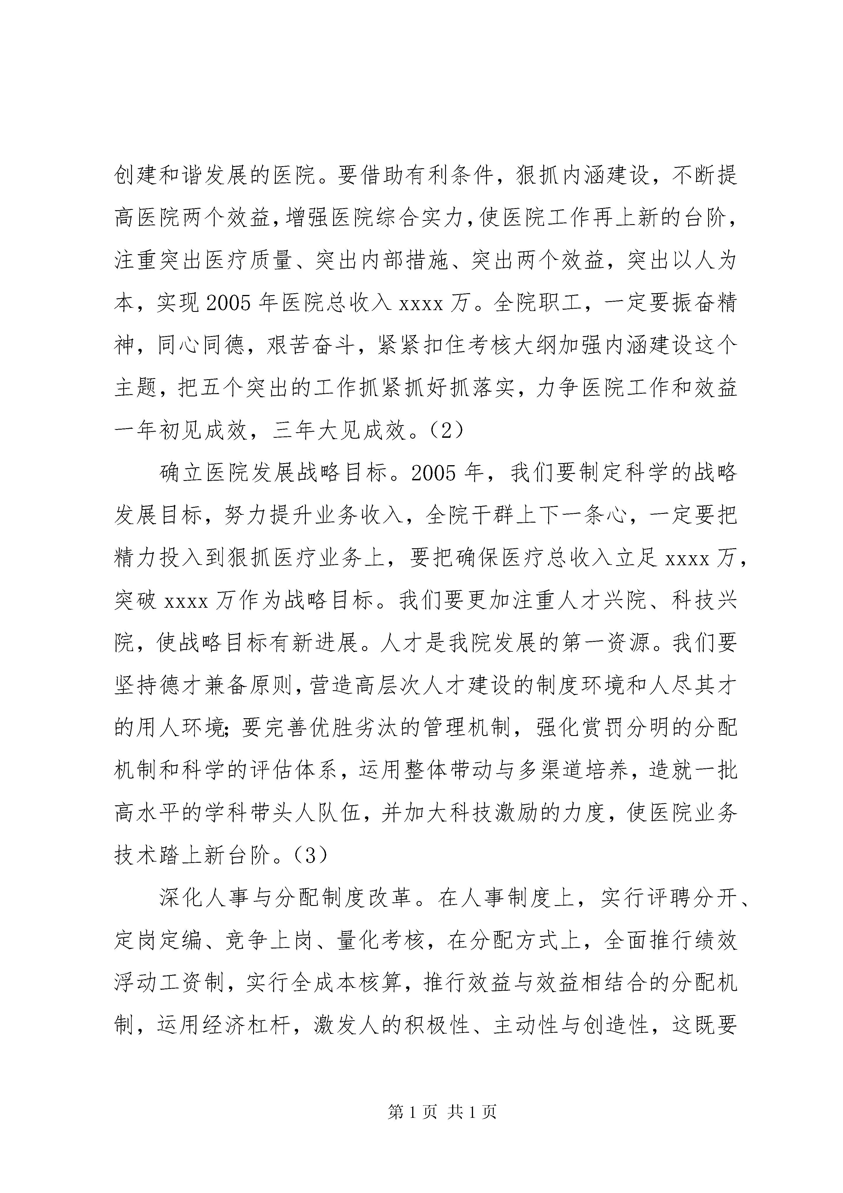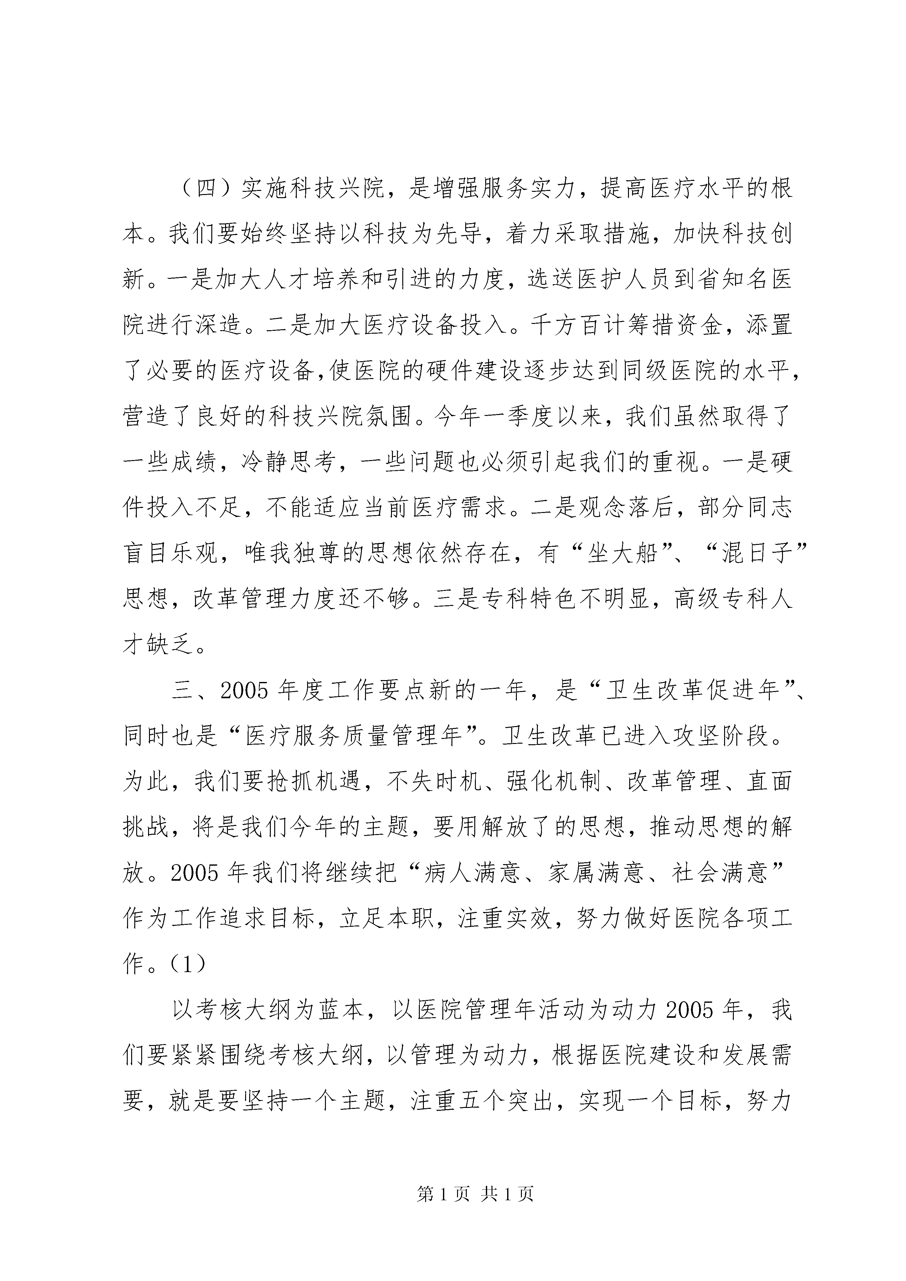 医院院长在医院管理年动员会上的讲话(1)同志们:今天召开的全院职工大会,局领导对此次会议的召开十分关注,xx局长在百忙中亲临会场,这对我们全院职工是极大的鼓舞。为感谢局领导多年来对我院的关心与厚爱,让我们以热烈的掌声欢迎局领导的光临。200x年,在xxx委、xxx政府及xxx卫生局的正确领导下,我们以“三个代表”重要思想和党的十六届四中全会精神为指导,以创建文明行业为契机,以病人满意为目标,团结拼搏、开拓创新,医疗事业和精神文明建设都取得了一定的成绩。今年3月,我院召开了职代会,会议开得很成功,讨论并通过了《医院2005年绩效浮动工资方案》等一系列文件,通过集思广益,大家站在全局的高度,统一了思想,提高了认识,形成了共识。这次会议将极大地促进我院200x年工作的全面展开,文秘部落为推进我院跨越发展提供了坚强的保障。下面我就2004年的工作总结及启示与2005年度工作要点分述如下:一、2004年度工作简约回顾一是认真搞好公共卫生体系建设———传染病区改扩建工程。二是医疗业务既“非典”后有一定的增加。三是医疗质量明显提高。四是医疗服务明显改善。五是卫技人员素质明显提高。六是医德医风明显好转。七是医院管理进一步规范。二、回顾过去,总结工作,我们从中得到以下几方面的启示:(一)增强危机意识,深化医院改革是医院必然选择。一是改革用人制度。实行管理干部聘任制,专业技术人员评聘分开制,职工全员上岗合同制。并推行科主任负责制,根据工作需要,合理配置各科室定编人员,同时,对部分中层干部岗位实行竞争上岗,建立优胜劣汰的良好用人机制。有效地增强中层干部和科室人员的岗位责任意识,强化了科室管理。二是改革分配制度,积极探索分配制度改革新模式,努力提高工作效率。实行绩效浮动工资制势在必行,形成奖优罚劣,责任到科,指标到人,收入直接与工资、奖金、医疗质量挂勾、拉开工资、奖金档次,增大向临床倾斜的力度,增大含金量的力度的分配机制,使全院员工增强危机意识、岗位责任意识,有效地调动临床一线的积极性。(二)强化医疗质量管理,是巩固医院挖潜创新的关键。我们继续把“发展要有新思路,改革要有新举措,开放要有新局面”,作为医院工作方针的指导思想。结合我院实际情况,认真做好临床工作,同时抓好医疗质量管理,强化医疗质量管理体系,调整充实了《病案管理委员会》、《药事管理委员会》,出台了《关于实行首院、首科、首诊负责制的规定》、《关于加强医疗安全管理的规定》、《关于病案管理的暂行规定》,加大了考核力度。医疗质量管理委员会,每月对照各科室质量考核标准及考核细则,对有关科室的服务质量和行为规范进行一次全面考评。考评结果按月与绩效工资挂钩,并在全院通报,增强了各科室和全体职工质量意识。加强重点专科建设,医院在人、财、物等方面给予一定政策倾斜,满足重点专科的发展需要,努力开创一种“院有重点、科有特长、人有专长”的欣欣向荣的新局面,为医院技术水平的提高增添活力。(三)更新服务意识,是树立行业新风的前提。我们在积极争创文明诚信单位的基础上,继续加强全院员工职业道德、职业纪律、人生观、价值观和服务观教育,做到在行为上以法律为准绳,在检查上以病情需要为出发点,在用药上以科学为原则,在收费上予以公示。一是加强门急诊建设,为方便病人就诊,成立了急诊、观察、输液室,门诊实行无假日制度,星期天节假日各科室照常上班,各项检查、治疗正常进行。二是完善了社会服务承诺制,病人选择医生制、住院病人一日清单制、病员回访制,得到了社会各界的好评。三是提供全程优质规范化服务。为了把“一切以病人为中心”的服务理念贯穿于医疗服务、管理过程的每一个环节,从病人一进医院大门开始,就得到了全程体贴周到的服务,使所有来院就诊病人受到亲如家人的就医待遇,各科室推行温馨服务,主动向病人问寒问暖,亲如家人,受到了社会各界充分肯定。我们在元、2、3三个月开展以“为病人提供全程优质、规范化服务”活动。从行为、语言、仪表、操作、环境等5个方面制订了具体的规范化的考核标准,促进了优质服务活动进一步向深度和广度推进。(四)实施科技兴院,是增强服务实力,提高医疗水平的根本。我们要始终坚持以科技为先导,着力采取措施,加快科技创新。一是加大人才培养和引进的力度,选送医护人员到省知名医院进行深造。二是加大医疗设备投入。千方百计筹措资金,添置了必要的医疗设备,使医院的硬件建设逐步达到同级医院的水平,营造了良好的科技兴院氛围。今年一季度以来,我们虽然取得了一些成绩,冷静思考,一些问题也必须引起我们的重视。一是硬件投入不足,不能适应当前医疗需求。二是观念落后,部分同志盲目乐观,唯我独尊的思想依然存在,有“坐大船”、“混日子”思想,改革管理力度还不够。三是专科特色不明显,高级专科人才缺乏。三、2005年度工作要点新的一年,是“卫生改革促