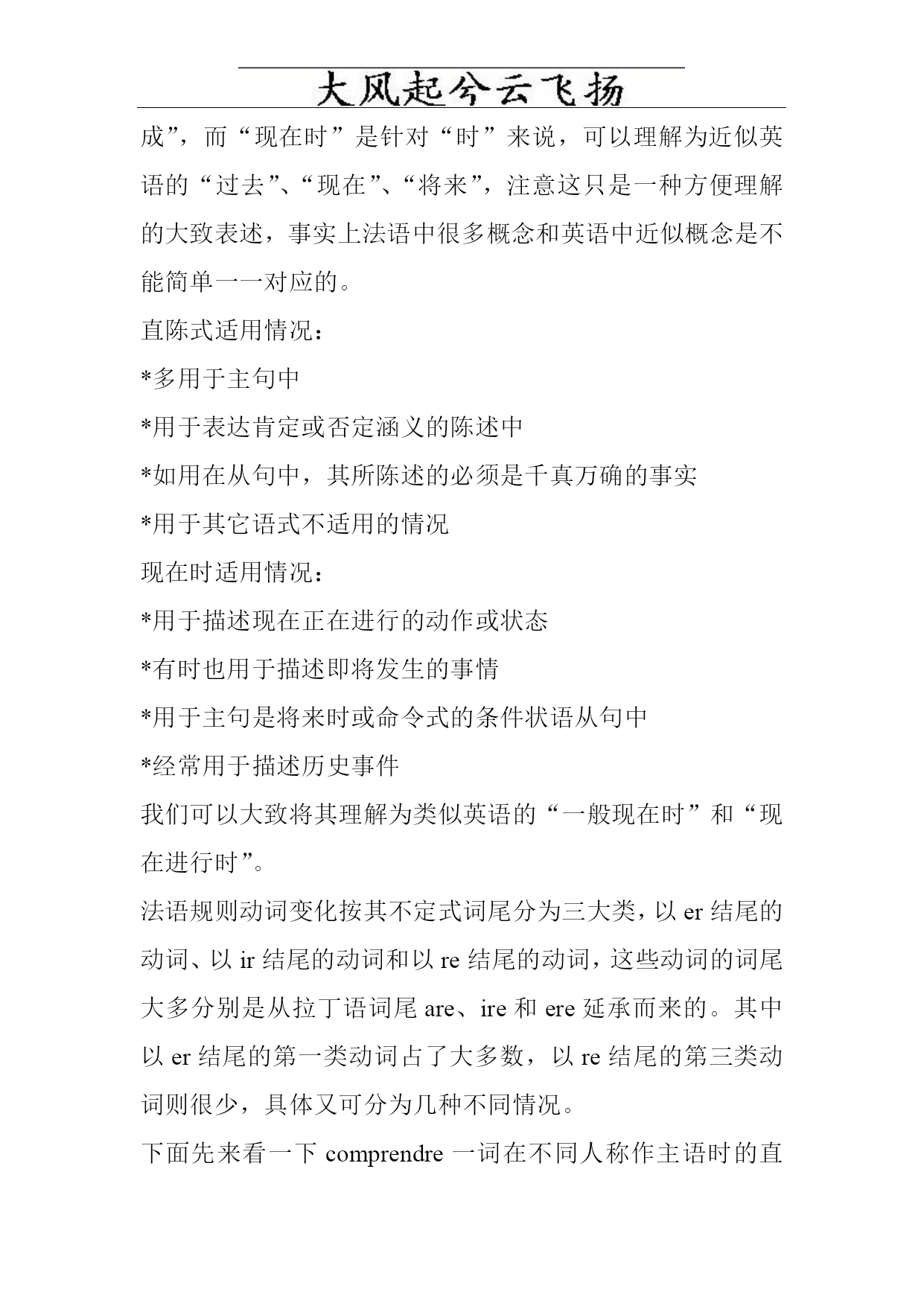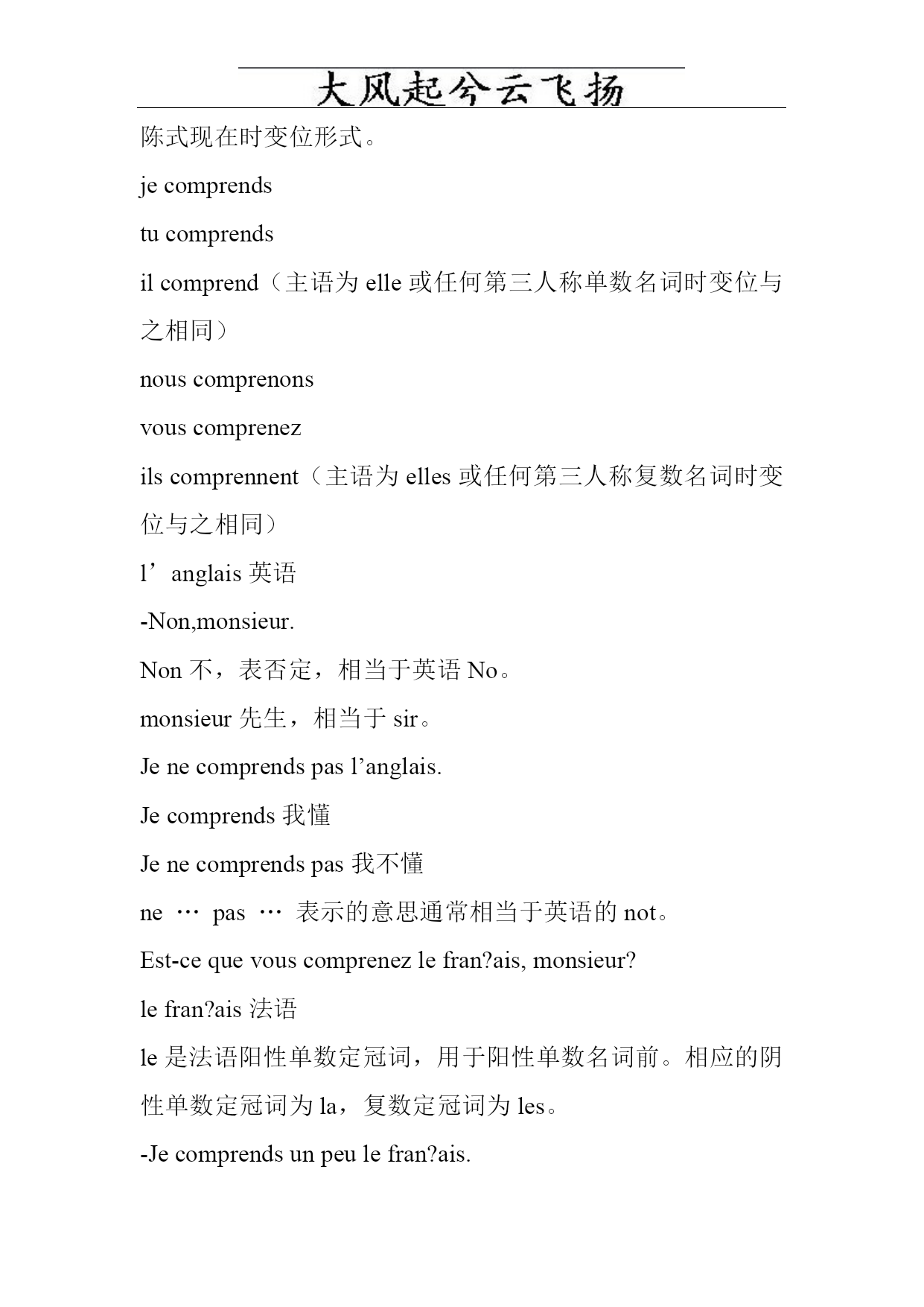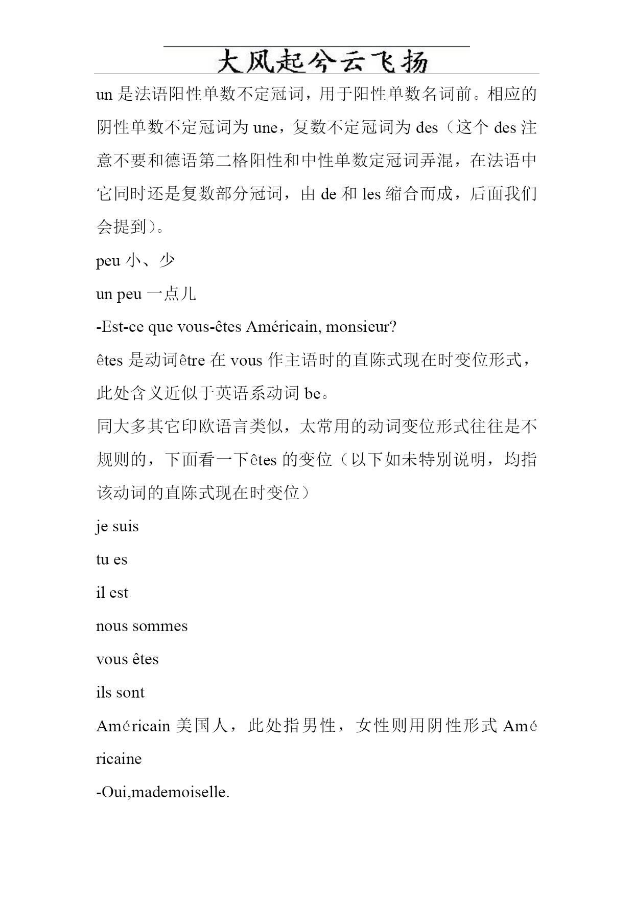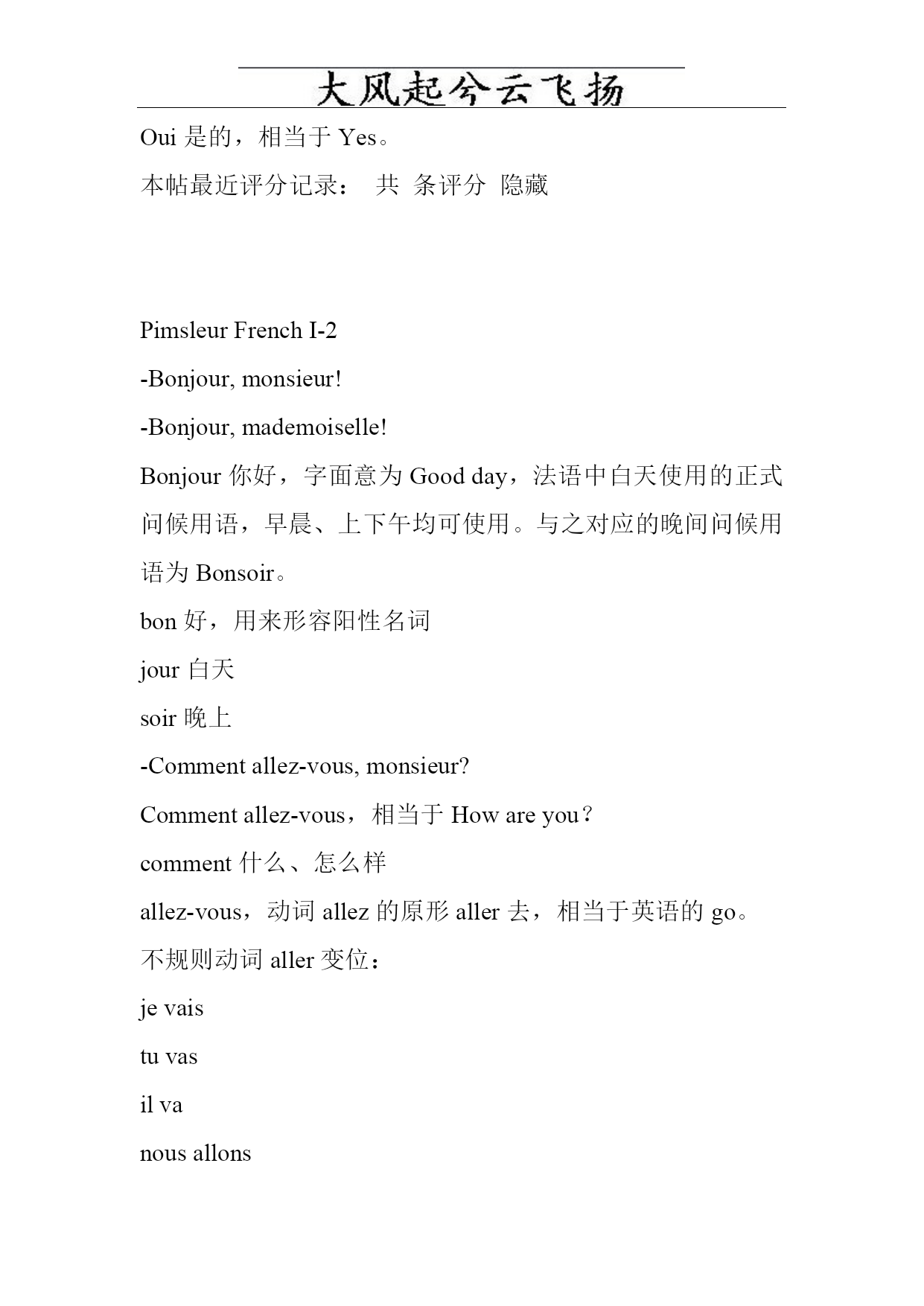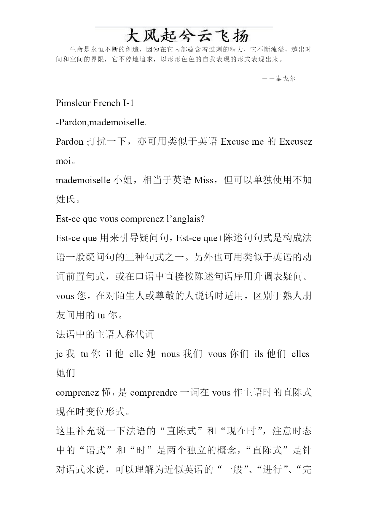 生命是永恒不断的创造,因为在它内部蕴含着过剩的精力,它不断流溢,越出时间和空间的界限,它不停地追求,以形形色色的自我表现的形式表现出来。 --泰戈尔 PimsleurFrenchI-1 -Pardon,mademoiselle. Pardon打扰一下,亦可用类似于英语Excuseme的Excusezmoi。 mademoiselle小姐,相当于英语Miss,但可以单独使用不加姓氏。 Est-cequevouscomprenezl’anglais? Est-ceque用来引导疑问句,Est-ceque+陈述句句式是构成法语一般疑问句的三种句式之一。另外也可用类似于英语的动词前置句式,或在口语中直接按陈述句语序用升调表疑问。 vous您,在对陌生人或尊敬的人说话时适用,区别于熟人朋友间用的tu你。 法语中的主语人称代词 je我tu你il他elle她nous我们vous你们ils他们elles她们 comprenez懂,是comprendre一词在vous作主语时的直陈式现在时变位形式。 这里补充说一下法语的“直陈式”和“现在时”,注意时态中的“语式”和“时”是两个独立的概念,“直陈式”是针对语式来说,可以理解为近似英语的“一般”、“进行”、“完成”,而“现在时”是针对“时”来说,可以理解为近似英语的“过去”、“现在”、“将来”,注意这只是一种方便理解的大致表述,事实上法语中很多概念和英语中近似概念是不能简单一一对应的。 直陈式适用情况: *多用于主句中 *用于表达肯定或否定涵义的陈述中 *如用在从句中,其所陈述的必须是千真万确的事实 *用于其它语式不适用的情况 现在时适用情况: *用于描述现在正在进行的动作或状态 *有时也用于描述即将发生的事情 *用于主句是将来时或命令式的条件状语从句中 *经常用于描述历史事件 我们可以大致将其理解为类似英语的“一般现在时”和“现在进行时”。 法语规则动词变化按其不定式词尾分为三大类,以er结尾的动词、以ir结尾的动词和以re结尾的动词,这些动词的词尾大多分别是从拉丁语词尾are、ire和ere延承而来的。其中以er结尾的第一类动词占了大多数,以re结尾的第三类动词则很少,具体又可分为几种不同情况。 下面先来看一下comprendre一词在不同人称作主语时的直陈式现在时变位形式。 jecomprends tucomprends ilcomprend(主语为elle或任何第三人称单数名词时变位与之相同) nouscomprenons vouscomprenez ilscomprennent(主语为elles或任何第三人称复数名词时变位与之相同) l’anglais英语 -Non,monsieur. Non不,表否定,相当于英语No。 monsieur先生,相当于sir。 Jenecomprendspasl’anglais. Jecomprends我懂 Jenecomprendspas我不懂 ne…pas…表示的意思通常相当于英语的not。 Est-cequevouscomprenezlefran?ais,monsieur? lefran?ais法语 le是法语阳性单数定冠词,用于阳性单数名词前。相应的阴性单数定冠词为la,复数定冠词为les。 -Jecomprendsunpeulefran?ais. un是法语阳性单数不定冠词,用于阳性单数名词前。相应的阴性单数不定冠词为une,复数不定冠词为des(这个des注意不要和德语第二格阳性和中性单数定冠词弄混,在法语中它同时还是复数部分冠词,由de和les缩合而成,后面我们会提到)。 peu小、少 unpeu一点儿 -Est-cequevous-êtesAméricain,monsieur? êtes是动词être在vous作主语时的直陈式现在时变位形式,此处含义近似于英语系动词be。 同大多其它印欧语言类似,太常用的动词变位形式往往是不规则的,下面看一下êtes的变位(以下如未特别说明,均指该动词的直陈式现在时变位) jesuis tues ilest noussommes vousêtes ilssont Américain美国人,此处指男性,女性则用阴性形式Américaine -Oui,mademoiselle. Oui是的,相当于Yes。 本帖最近评分记录:共条评分隐藏 PimsleurFrenchI-2 -Bonjour,monsieur! -Bonjour,mademoiselle! Bonjour你好,字面意为Goodday,法语中白天使用的正式问候用语,早晨、上下午均可使用。与之对应的晚间问候用语为Bonsoir。 bon好,用来形容阳性名词 jour白天 soir晚上 -Commentallez-vous,mons