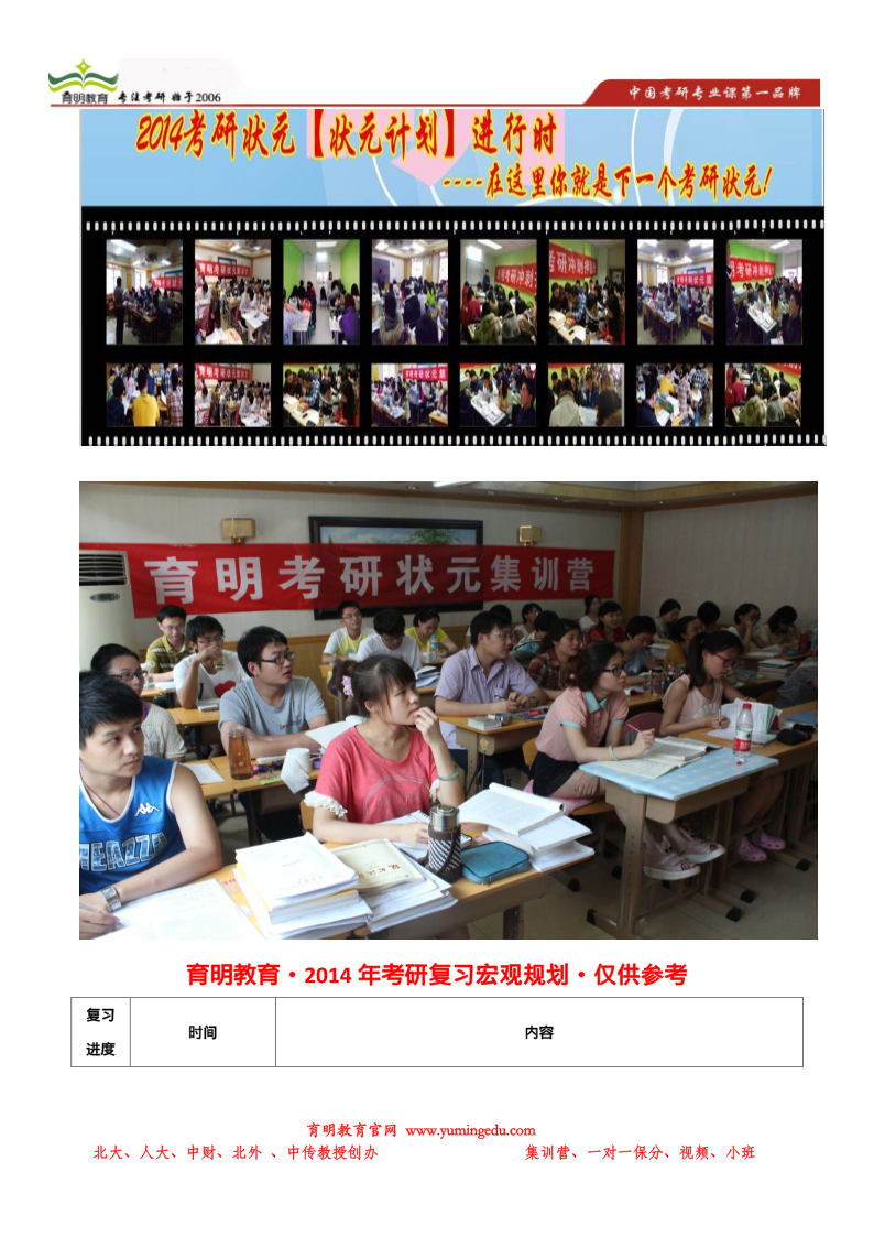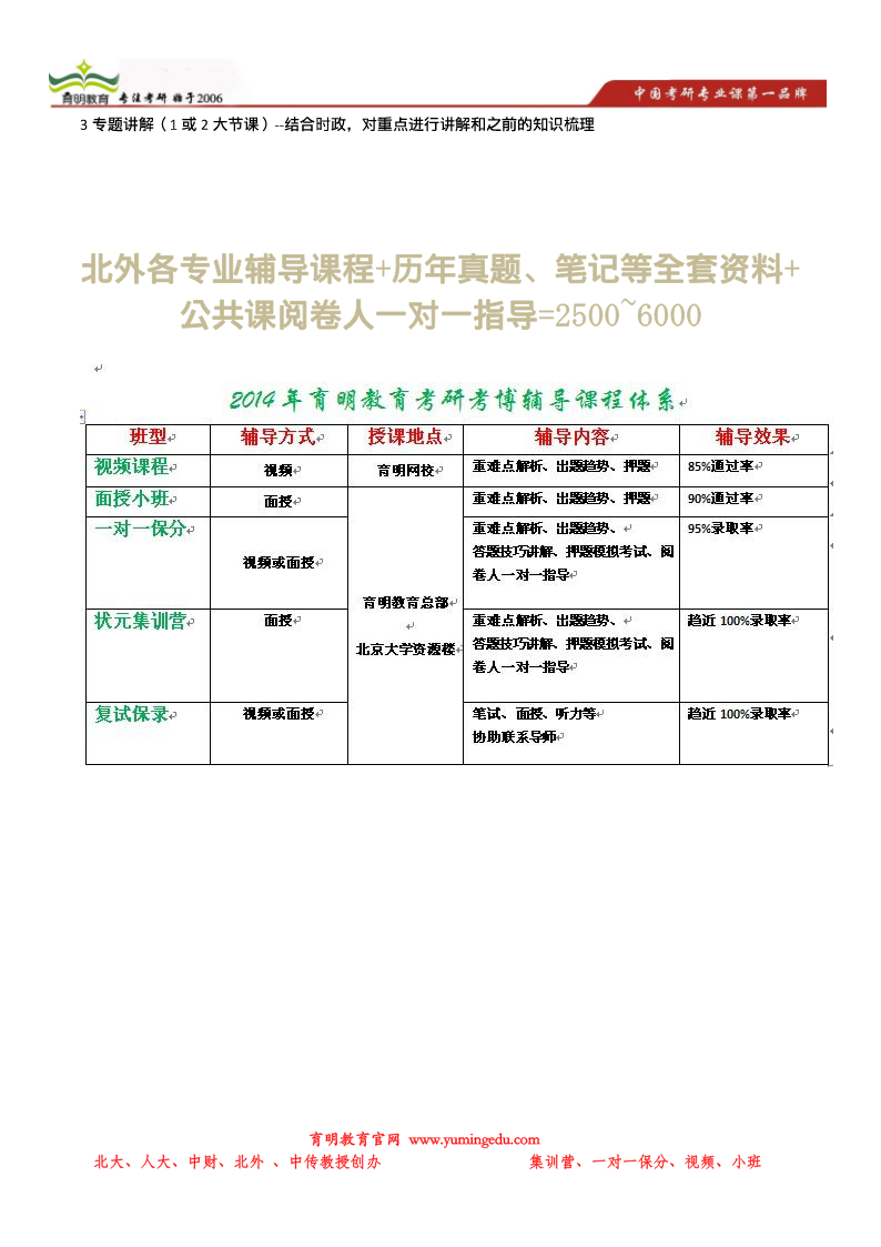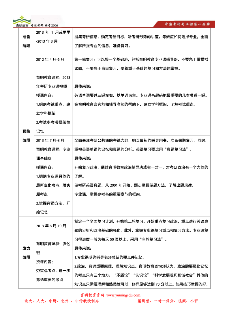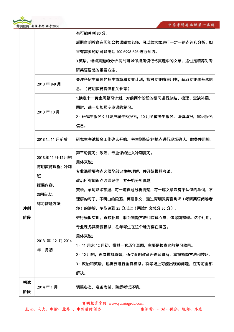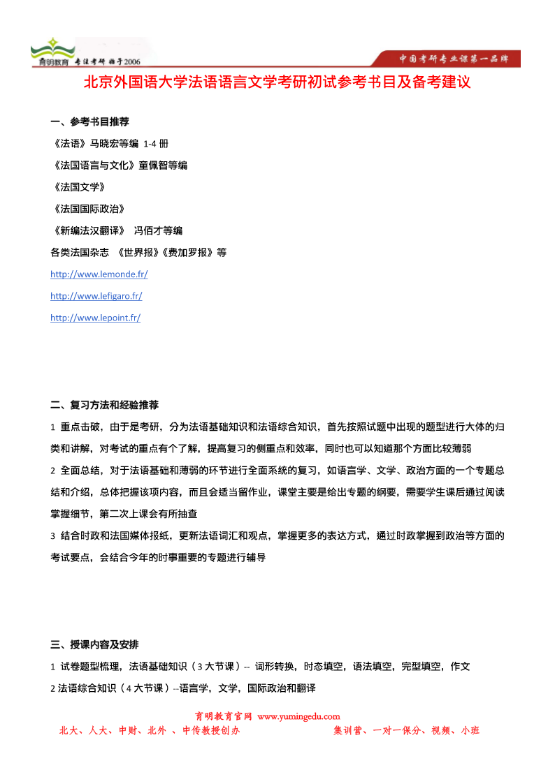 北京外国语大学法语语言文学考研初试参考书目及备考建议 一、参考书目推荐 《法语》马晓宏等编1-4册 《法国语言与文化》童佩智等编 《法国文学》 《法国国际政治》 《新编法汉翻译》冯佰才等编 各类法国杂志《世界报》《费加罗报》等 http://www.lemonde.fr/ http://www.lefigaro.fr/ http://www.lepoint.fr/ 二、复习方法和经验推荐 1重点击破,由于是考研,分为法语基础知识和法语综合知识,首先按照试题中出现的题型进行大体的归 类和讲解,对考试的重点有个了解,提高复习的侧重点和效率,同时也可以知道那个方面比较薄弱 2全面总结,对于法语基础和薄弱的环节进行全面系统的复习,如语言学、文学、政治方面的一个专题总 结和介绍,总体把握该项内容,而且会适当留作业,课堂主要是给出专题的纲要,需要学生课后通过阅读 掌握细节,第二次上课会有所抽查 3结合时政和法国媒体报纸,更新法语词汇和观点,掌握更多的表达方式,通过时政掌握到政治等方面的 考试要点,会结合今年的时事重要的专题进行辅导 三、授课内容及安排 1试卷题型梳理,法语基础知识(3大节课)--词形转换,时态填空,语法填空,完型填空,作文 2法语综合知识(4大节课)--语言学,文学,国际政治和翻译 育明教育官网www.yumingedu.com 北大、人大、中财、北外、中传教授创办集训营、一对一保分、视频、小班 3专题讲解(1或2大节课)--结合时政,对重点进行讲解和之前的知识梳理 北外各专业辅导课程+历年真题、笔记等全套资料+ 公共课阅卷人一对一指导=2500~6000 育明教育官网www.yumingedu.com 北大、人大、中财、北外、中传教授创办集训营、一对一保分、视频、小班 育明教育·2014年考研复习宏观规划·仅供参考 复习 时间内容 进度 育明教育官网www.yumingedu.com 北大、人大、中财、北外、中传教授创办集训营、一对一保分、视频、小班 2013年1月或更早 准备搜集考研信息,确定考研目标,听考研形势的讲座。考研应如何选择专业,全面 -2013年3月 阶段了解所报专业的信息,准备复习。 2012年4月-6月第一轮复习:可以报一个基础班,包括育明教育专业课辅导班,不要急于做模拟 试题,不要急于盲目复习,要着重于基础的复习和方法的掌握。 育明教育课程:2013 年考研专业课视频具体来说: 授课内容:英语单词要过三遍左右,以单词为主。专业课书起码把最重要的几本书看一遍。 1.明确考试重点,建在育明教育咨询师和辅导老师的帮助下,建立学科框架,了解考试重点。 立学科框架 2.考试参考书框架性 预热记忆 阶段2013年7月-8月全面关注考研公共课的考试大纲,购买最新的辅导用书,准备暑期复习。同时, 育明教育课程:专业重视英语单词的记忆和真题的分析。英语复习要运用“真题复习法”。 课基础班具体来说: 授课内容:开始复习政治,通过育明教育政治辅导班或者一对一,对考研政治有一个大体的 1.明确专业课具体的了解。 最新变化考点,落实做考研英语真题,从2001年开始。逐步掌握做题方法,了解出题规律。 原考点专业课,掌握参考书的重要章节的框架。 2.掌握背诵方法,开 始记忆 制定一个全面复习计划,开始第二轮复习。开始重点复习政治,重点进行英语真 2013年8月-10月 题的分析和政治基础的强化。此外,掌握专业课复习重点和复习方法。专业课复 习得进度一般为每天50页以上。采用“车轮复习法”。 育明教育课程:强化 发力具体来说: 班 阶段1.专业课明确辅导老师总结的要点并记忆。 授课内容: 2.政治,背诵重要原理,理解知识点。育明教育咨询师认为,政治需要强化记忆 夯实必考点,进一步 的考点只有三个地方:“矛盾论”“认识论”“科学发展观和和谐社会”其他的 筛选重要的考点 知识点只需要理解和熟悉就可以,这样足够达到70分以上。如果技巧掌握的好, 育明教育官网www.yumingedu.com 北大、人大、中财、北外、中传教授创办集训营、一对一保分、视频、小班 有可能冲刺80分。 后期育明教育有历年公共课阅卷老师,可以给大家进行一对一的点评和分析。如 果有需要的话可以电话400-6998-626进行预约。 3.英语,继续真题的分析,同时可以保持朗读记忆真题中的文章,这也是培养对考 研英语语感的重要方法。 关注各招生单位的招生简章和专业计划,核对专业辅导用书,获取专业课考试信 2013年8-9月 息。(育明教育提供相关参考) 1.确定十一黄金周复习计划,对前两