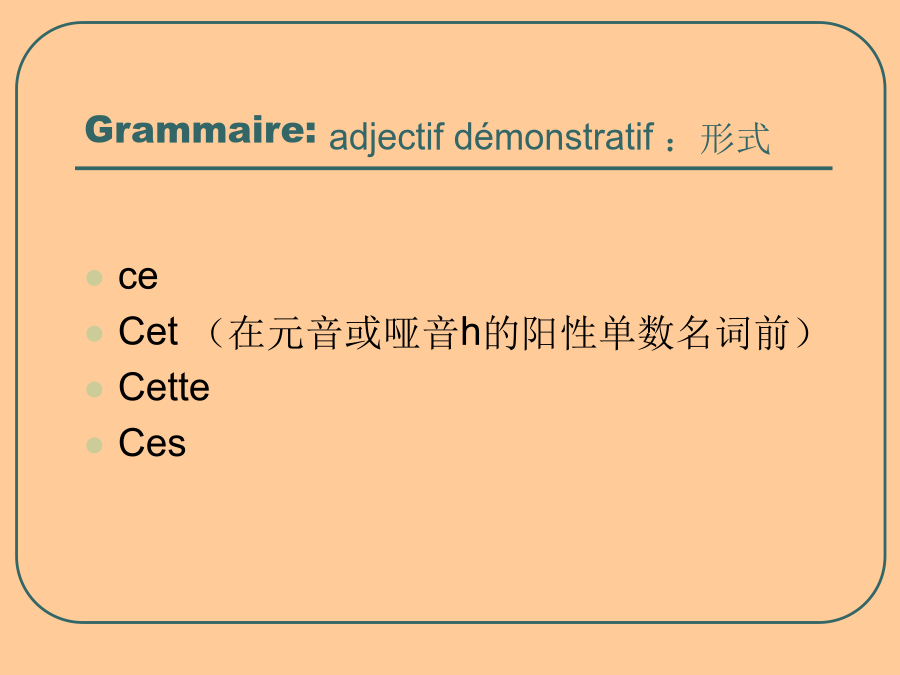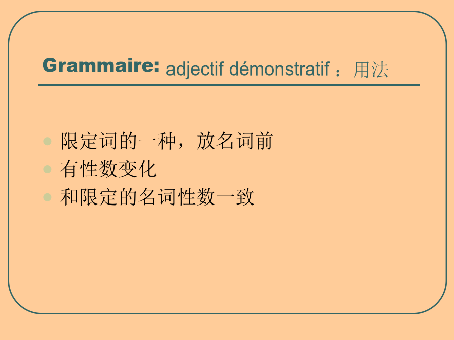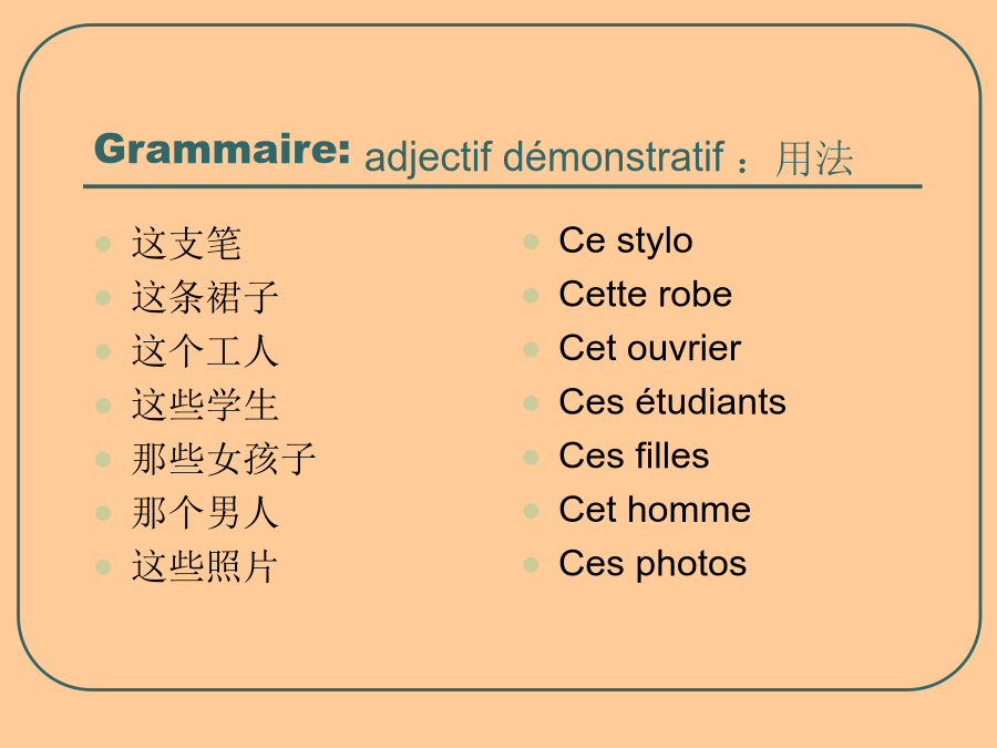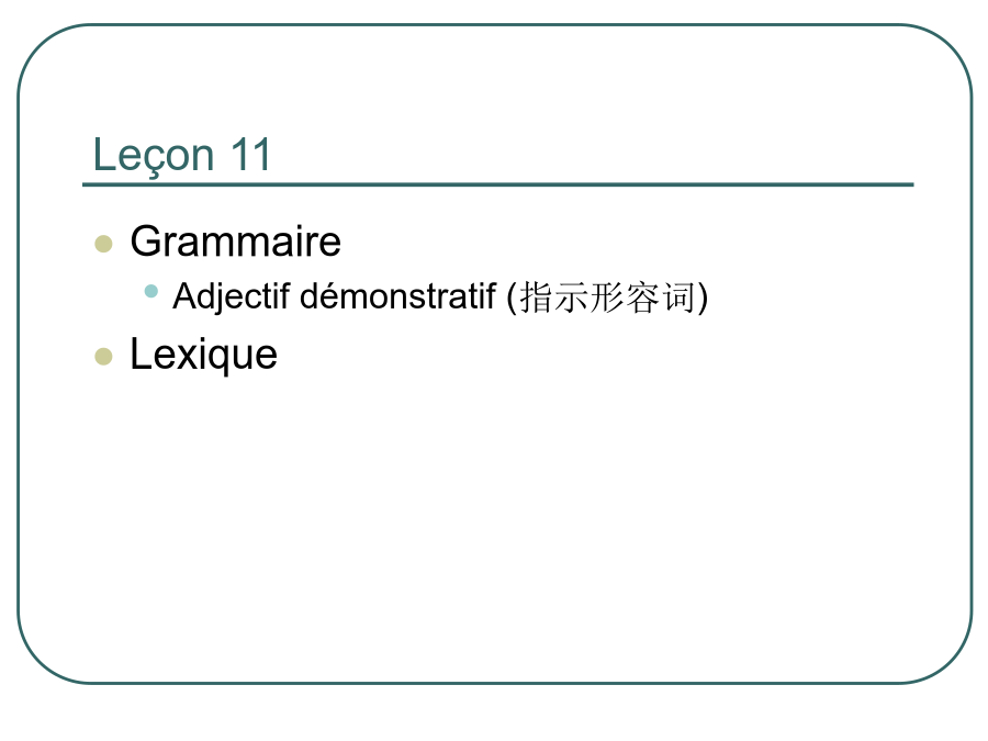 Leçon11Leçon11Grammaire:adjectifdémonstratif:形式Grammaire:adjectifdémonstratif:用法Grammaire:adjectifdémonstratif:用法Grammaire:adjectifdémonstratif:用法Grammaire:adjectifdémonstratif复合形式Lexique:écrire(conjugaison)v.t写Lexique:écouterv.t听,听从(某人的话)Lexique:inviterv.t邀请Lexique:aiderv.t帮助Lexique:vouloir(conjugaison)v.tLexique:devenir(conjugaison)变成(做系动词)Lexique:autre泛指代词/泛指形容词Lexique:ilya+COD有......(无人称句,加直宾)Lexique:tout,toute,tous,toutes+限定词+n.(泛指形容词)Lexique:tout(泛指代词,代物,单数)一切,所有的事Lexique:qch.êtredifficileà+faire.某事很难做...C’est(Ilest)difficiledefaireqch.难于做...