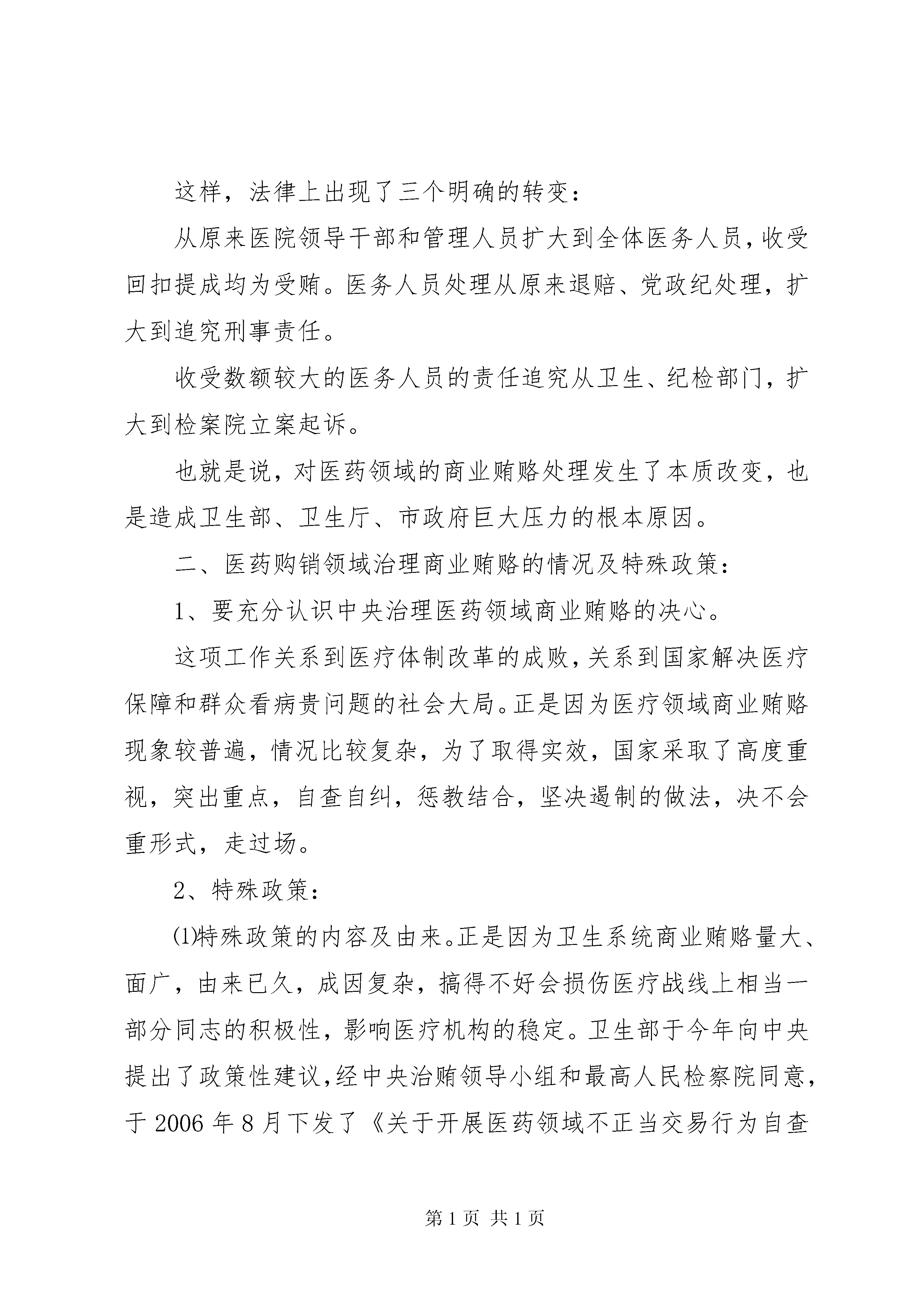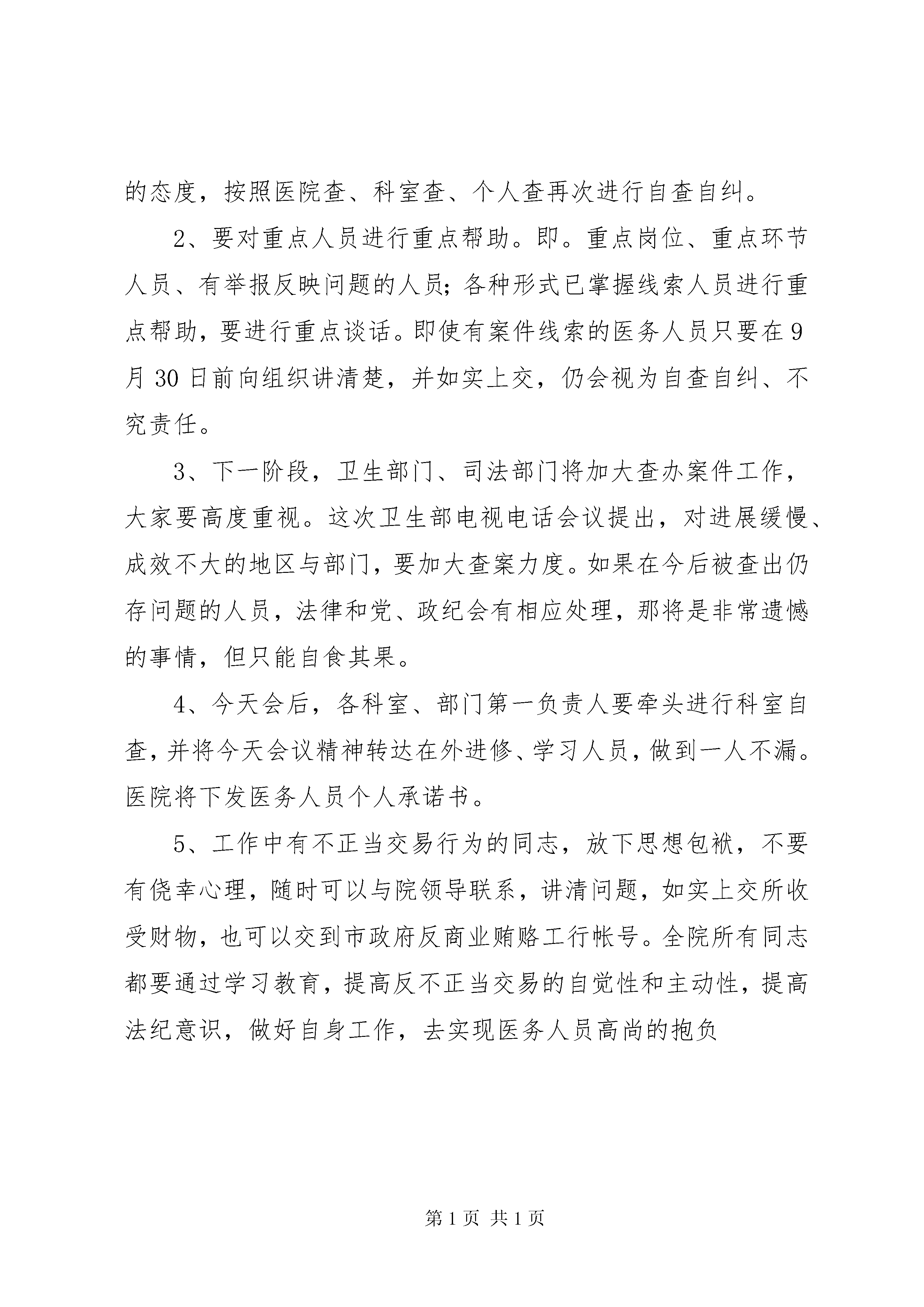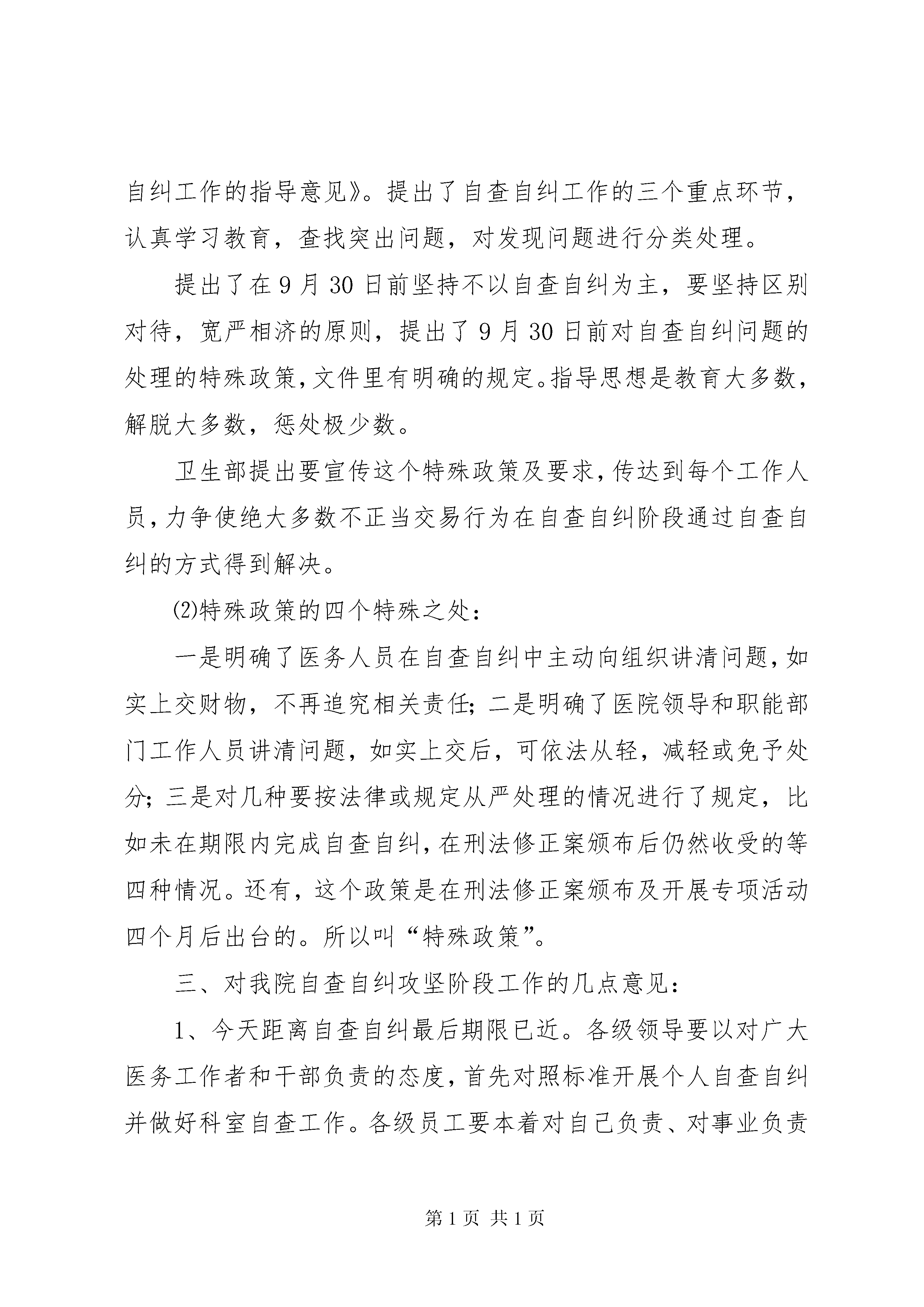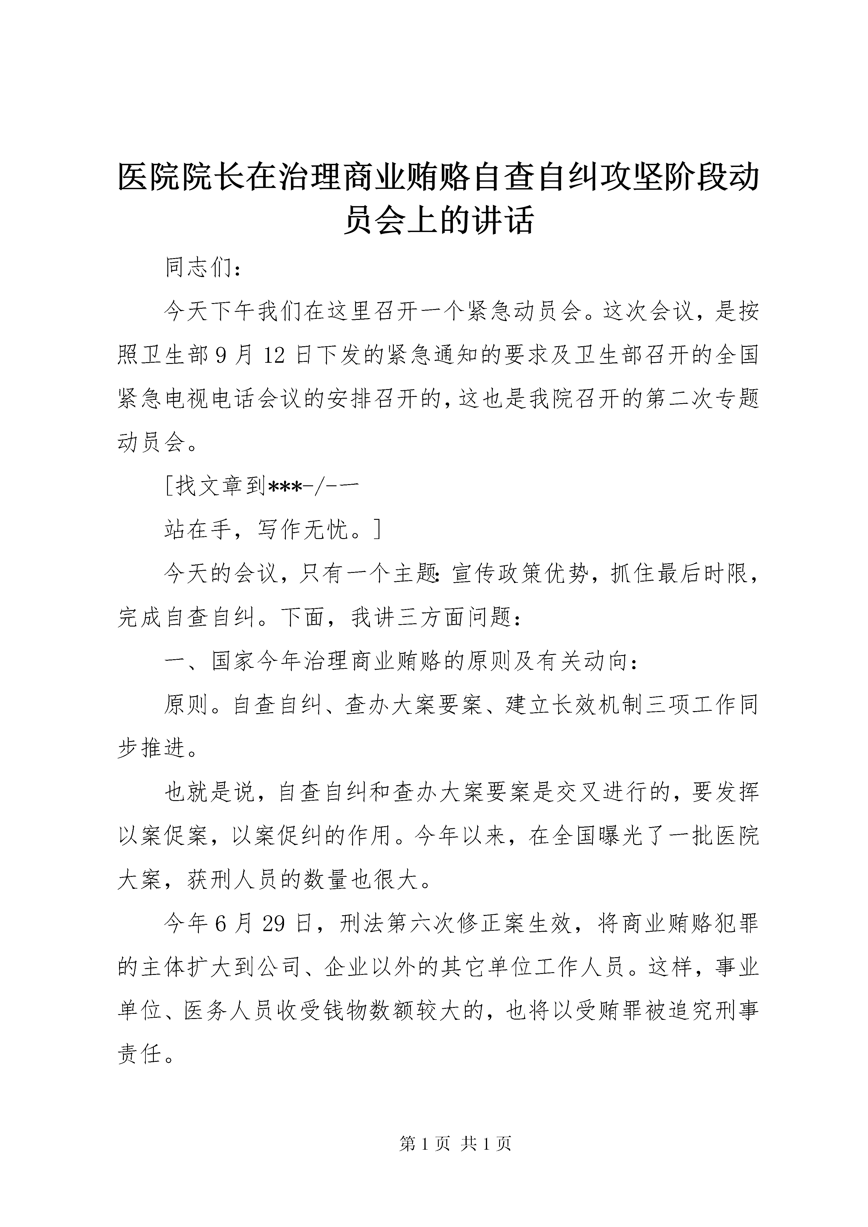 医院院长在治理商业贿赂自查自纠攻坚阶段动员会上的讲话同志们:今天下午我们在这里召开一个紧急动员会。这次会议,是按照卫生部9月12日下发的紧急通知的要求及卫生部召开的全国紧急电视电话会议的安排召开的,这也是我院召开的第二次专题动员会。[找文章到***-/-一站在手,写作无忧。]今天的会议,只有一个主题:宣传政策优势,抓住最后时限,完成自查自纠。下面,我讲三方面问题:一、国家今年治理商业贿赂的原则及有关动向:原则。自查自纠、查办大案要案、建立长效机制三项工作同步推进。也就是说,自查自纠和查办大案要案是交叉进行的,要发挥以案促案,以案促纠的作用。今年以来,在全国曝光了一批医院大案,获刑人员的数量也很大。今年6月29日,刑法第六次修正案生效,将商业贿赂犯罪的主体扩大到公司、企业以外的其它单位工作人员。这样,事业单位、医务人员收受钱物数额较大的,也将以受贿罪被追究刑事责任。这样,法律上出现了三个明确的转变:从原来医院领导干部和管理人员扩大到全体医务人员,收受回扣提成均为受贿。医务人员处理从原来退赔、党政纪处理,扩大到追究刑事责任。收受数额较大的医务人员的责任追究从卫生、纪检部门,扩大到检案院立案起诉。也就是说,对医药领域的商业贿赂处理发生了本质改变,也是造成卫生部、卫生厅、市政府巨大压力的根本原因。二、医药购销领域治理商业贿赂的情况及特殊政策:1、要充分认识中央治理医药领域商业贿赂的决心。这项工作关系到医疗体制改革的成败,关系到国家解决医疗保障和群众看病贵问题的社会大局。正是因为医疗领域商业贿赂现象较普遍,情况比较复杂,为了取得实效,国家采取了高度重视,突出重点,自查自纠,惩教结合,坚决遏制的做法,决不会重形式,走过场。2、特殊政策:⑴特殊政策的内容及由来。正是因为卫生系统商业贿赂量大、面广,由来已久,成因复杂,搞得不好会损伤医疗战线上相当一部分同志的积极性,影响医疗机构的稳定。卫生部于今年向中央提出了政策性建议,经中央治贿领导小组和最高人民检察院同意,于2006年8月下发了《关于开展医药领域不正当交易行为自查自纠工作的指导意见》。提出了自查自纠工作的三个重点环节,认真学习教育,查找突出问题,对发现问题进行分类处理。提出了在9月30日前坚持不以自查自纠为主,要坚持区别对待,宽严相济的原则,提出了9月30日前对自查自纠问题的处理的特殊政策,文件里有明确的规定。指导思想是教育大多数,解脱大多数,惩处极少数。卫生部提出要宣传这个特殊政策及要求,传达到每个工作人员,力争使绝大多数不正当交易行为在自查自纠阶段通过自查自纠的方式得到解决。⑵特殊政策的四个特殊之处:一是明确了医务人员在自查自纠中主动向组织讲清问题,如实上交财物,不再追究相关责任;二是明确了医院领导和职能部门工作人员讲清问题,如实上交后,可依法从轻,减轻或免予处分;三是对几种要按法律或规定从严处理的情况进行了规定,比如未在期限内完成自查自纠,在刑法修正案颁布后仍然收受的等四种情况。还有,这个政策是在刑法修正案颁布及开展专项活动四个月后出台的。所以叫“特殊政策”。三、对我院自查自纠攻坚阶段工作的几点意见:1、今天距离自查自纠最后期限已近。各级领导要以对广大医务工作者和干部负责的态度,首先对照标准开展个人自查自纠并做好科室自查工作。各级员工要本着对自己负责、对事业负责的态度,按照医院查、科室查、个人查再次进行自查自纠。2、要对重点人员进行重点帮助。即。重点岗位、重点环节人员、有举报反映问题的人员;各种形式已掌握线索人员进行重点帮助,要进行重点谈话。即使有案件线索的医务人员只要在9月30日前向组织讲清楚,并如实上交,仍会视为自查自纠、不究责任。3、下一阶段,卫生部门、司法部门将加大查办案件工作,大家要高度重视。这次卫生部电视电话会议提出,对进展缓慢、成效不大的地区与部门,要加大查案力度。如果在今后被查出仍存问题的人员,法律和党、政纪会有相应处理,那将是非常遗憾的事情,但只能自食其果。4、今天会后,各科室、部门第一负责人要牵头进行科室自查,并将今天会议精神转达在外进修、学习人员,做到一人不漏。医院将下发医务人员个人承诺书。5、工作中有不正当交易行为的同志,放下思想包袱,不要有侥幸心理,随时可以与院领导联系,讲清问题,如实上交所收受财物,也可以交到市政府反商业贿赂工行帐号。全院所有同志都要通过学习教育,提高反不正当交易的自觉性和主动性,提高法纪意识,做好自身工作,去实现医务人员高尚的抱负