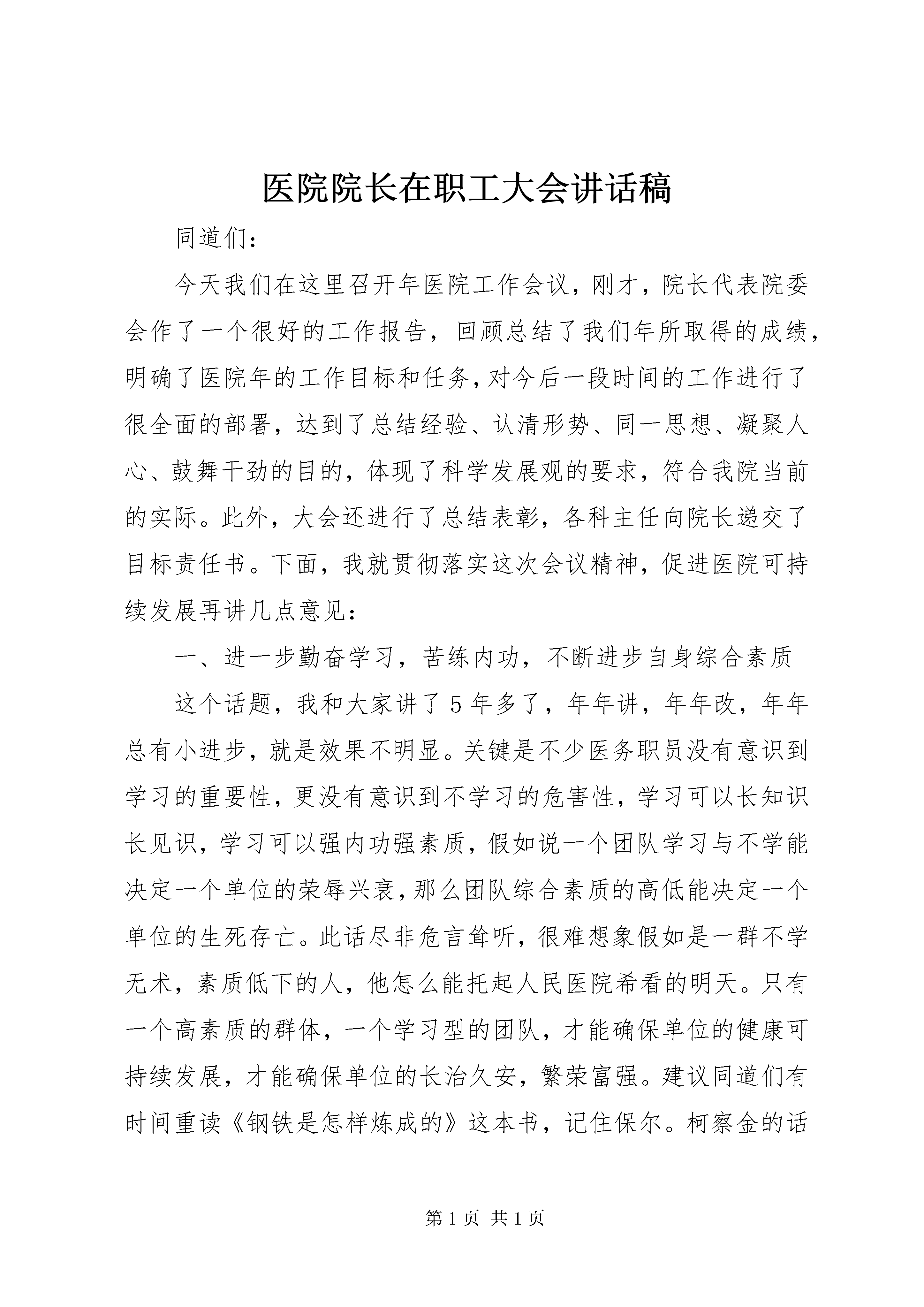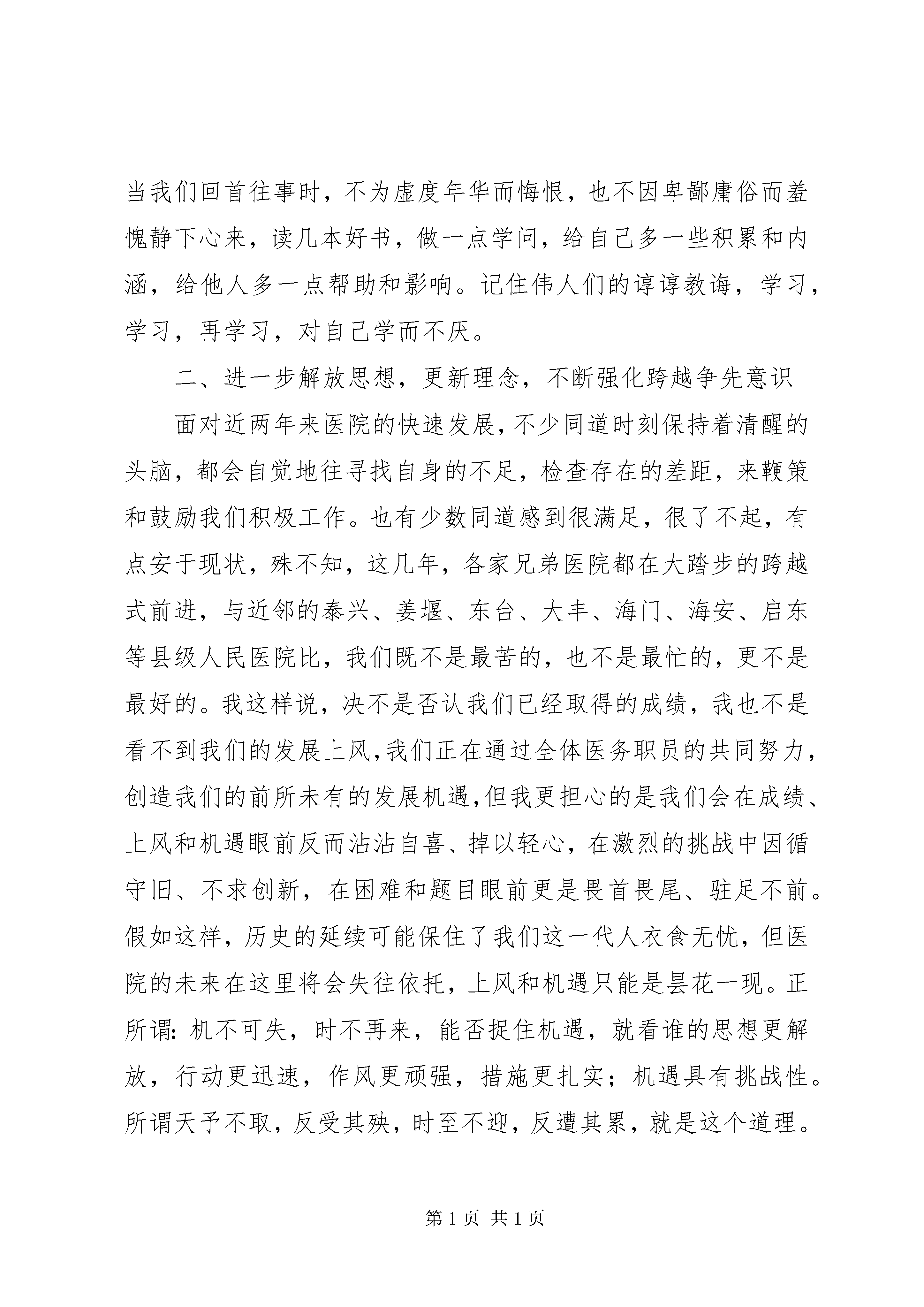 医院院长在职工大会讲话稿同道们:今天我们在这里召开年医院工作会议,刚才,院长代表院委会作了一个很好的工作报告,回顾总结了我们年所取得的成绩,明确了医院年的工作目标和任务,对今后一段时间的工作进行了很全面的部署,达到了总结经验、认清形势、同一思想、凝聚人心、鼓舞干劲的目的,体现了科学发展观的要求,符合我院当前的实际。此外,大会还进行了总结表彰,各科主任向院长递交了目标责任书。下面,我就贯彻落实这次会议精神,促进医院可持续发展再讲几点意见:一、进一步勤奋学习,苦练内功,不断进步自身综合素质这个话题,我和大家讲了5年多了,年年讲,年年改,年年总有小进步,就是效果不明显。关键是不少医务职员没有意识到学习的重要性,更没有意识到不学习的危害性,学习可以长知识长见识,学习可以强内功强素质,假如说一个团队学习与不学能决定一个单位的荣辱兴衰,那么团队综合素质的高低能决定一个单位的生死存亡。此话尽非危言耸听,很难想象假如是一群不学无术,素质低下的人,他怎么能托起人民医院希看的明天。只有一个高素质的群体,一个学习型的团队,才能确保单位的健康可持续发展,才能确保单位的长治久安,繁荣富强。建议同道们有时间重读《钢铁是怎样炼成的》这本书,记住保尔。柯察金的话当我们回首往事时,不为虚度年华而悔恨,也不因卑鄙庸俗而羞愧静下心来,读几本好书,做一点学问,给自己多一些积累和内涵,给他人多一点帮助和影响。记住伟人们的谆谆教诲,学习,学习,再学习,对自己学而不厌。二、进一步解放思想,更新理念,不断强化跨越争先意识面对近两年来医院的快速发展,不少同道时刻保持着清醒的头脑,都会自觉地往寻找自身的不足,检查存在的差距,来鞭策和鼓励我们积极工作。也有少数同道感到很满足,很了不起,有点安于现状,殊不知,这几年,各家兄弟医院都在大踏步的跨越式前进,与近邻的泰兴、姜堰、东台、大丰、海门、海安、启东等县级人民医院比,我们既不是最苦的,也不是最忙的,更不是最好的。我这样说,决不是否认我们已经取得的成绩,我也不是看不到我们的发展上风,我们正在通过全体医务职员的共同努力,创造我们的前所未有的发展机遇,但我更担心的是我们会在成绩、上风和机遇眼前反而沾沾自喜、掉以轻心,在激烈的挑战中因循守旧、不求创新,在困难和题目眼前更是畏首畏尾、驻足不前。假如这样,历史的延续可能保住了我们这一代人衣食无忧,但医院的未来在这里将会失往依托,上风和机遇只能是昙花一现。正所谓:机不可失,时不再来,能否捉住机遇,就看谁的思想更解放,行动更迅速,作风更顽强,措施更扎实;机遇具有挑战性。所谓天予不取,反受其殃,时至不迎,反遭其累,就是这个道理。因此,在今后的各项工作中,我们一定要解放思想、更新观念,不断强化拒尽平庸、追求卓越、抢抓机遇跨越争先的意识,勇于向强者***,与高手过招,发奋图强,敢为人先。