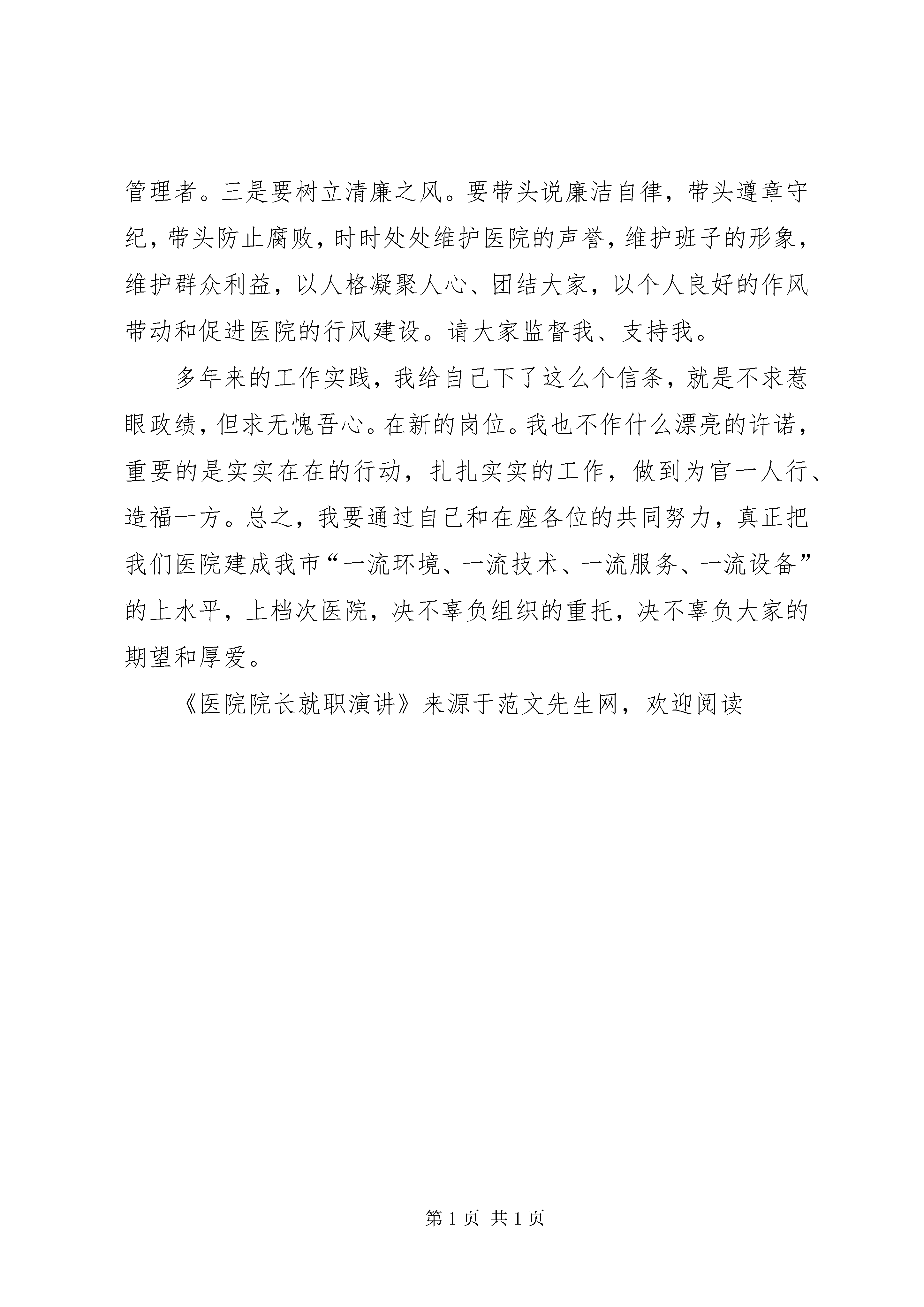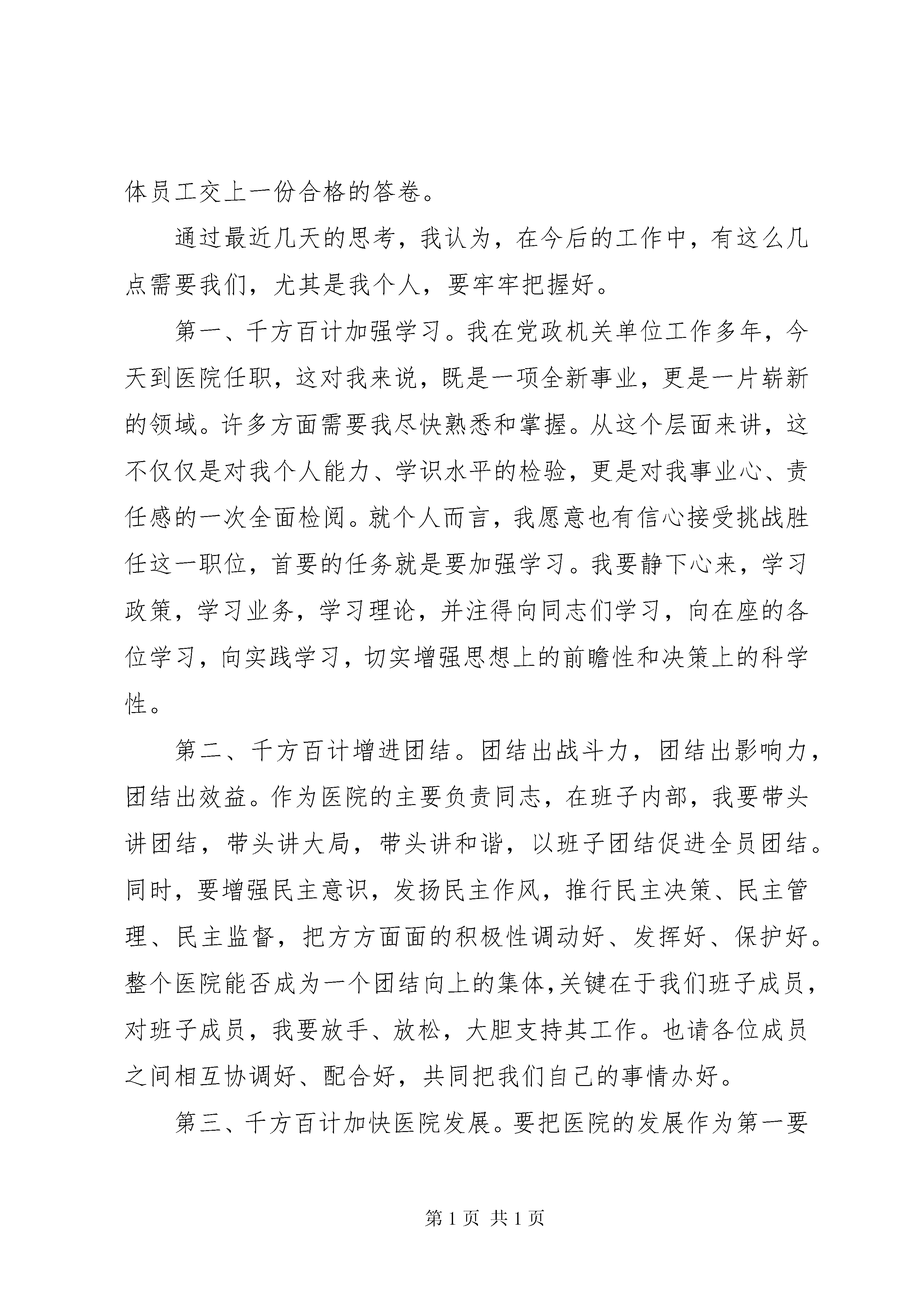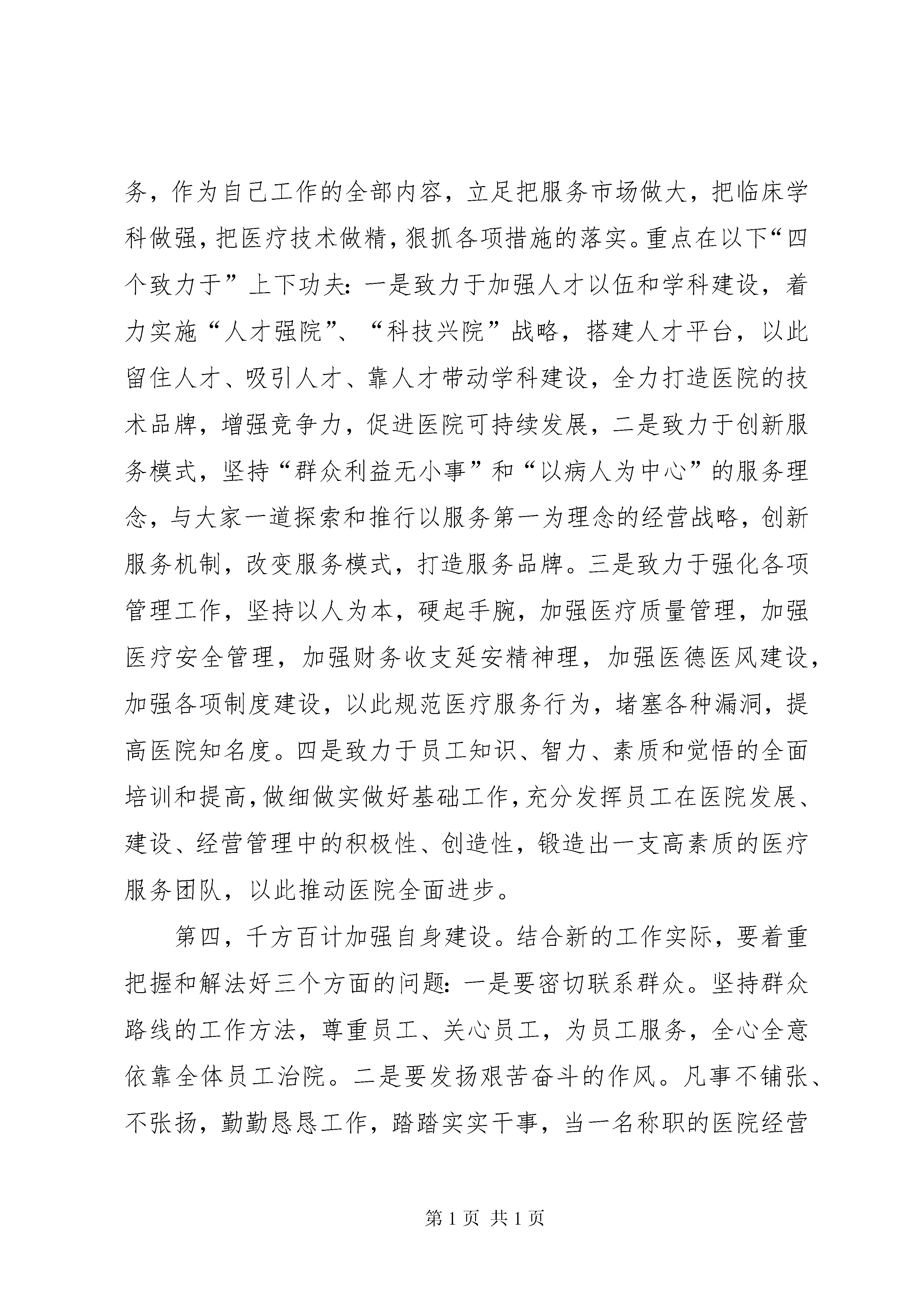 医院院长就职演讲文章标题:医院院长就职演讲根据组织安排,我到咱们市立医院任职主持工作。我深感肩上担子的份量和责任的重大。今天与班子见面,各项工作也就全面进入了正轨。借此机会,谈几点感性认识和一些想法,与大家结共勉,不当之处,请各位领导、班子成员指正。作为全市医疗机构的龙头,多年来,在市委、市政府的正确领导下,在历届领导班子打下坚实基础上,我们医院无论是整体外观形象还是内部建设,无论是基础设施改善还是医疗水平提高,无论是学科建设还是医德医风树立,各方面都有了长足进步。在我市来讲,其医疗和服务水平,勿容置疑;其地位和作用,不可替代;其设施和技术,无可比拟。悬壶济世,救死扶伤,是我们医院工作的天职。作为一个特殊的单位,我认为,我们的各项工作,必须紧紧围绕达到“三个基本公文易爱心文秘网满意”,即让领导基本满意,让职工基本满意,让群众基本满意。实现这“三个基本满意”,需要我们领导班子和全体员工真正树立起主人翁意识,同心协力,同舟共济。人人尽一份努力,人人做一份贡献。作为班长,在任职期限内,在市委、市政府的坚强领导下,在卫生局的大力支持下,在同志们的密切配合下,我有决心、有信心团结带领全体员工,为了我们共同的目标,不遗余力,把各项工作做好,向上级党组织和全体员工交上一份合格的答卷。通过最近几天的思考,我认为,在今后的工作中,有这么几点需要我们,尤其是我个人,要牢牢把握好。第一、千方百计加强学习。我在党政机关单位工作多年,今天到医院任职,这对我来说,既是一项全新事业,更是一片崭新的领域。许多方面需要我尽快熟悉和掌握。从这个层面来讲,这不仅仅是对我个人能力、学识水平的检验,更是对我事业心、责任感的一次全面检阅。就个人而言,我愿意也有信心接受挑战胜任这一职位,首要的任务就是要加强学习。我要静下心来,学习政策,学习业务,学习理论,并注得向同志们学习,向在座的各位学习,向实践学习,切实增强思想上的前瞻性和决策上的科学性。第二、千方百计增进团结。团结出战斗力,团结出影响力,团结出效益。作为医院的主要负责同志,在班子内部,我要带头讲团结,带头讲大局,带头讲和谐,以班子团结促进全员团结。同时,要增强民主意识,发扬民主作风,推行民主决策、民主管理、民主监督,把方方面面的积极性调动好、发挥好、保护好。整个医院能否成为一个团结向上的集体,关键在于我们班子成员,对班子成员,我要放手、放松,大胆支持其工作。也请各位成员之间相互协调好、配合好,共同把我们自己的事情办好。第三、千方百计加快医院发展。要把医院的发展作为第一要务,作为自己工作的全部内容,立足把服务市场做大,把临床学科做强,把医疗技术做精,狠抓各项措施的落实。重点在以下“四个致力于”上下功夫:一是致力于加强人才以伍和学科建设,着力实施“人才强院”、“科技兴院”战略,搭建人才平台,以此留住人才、吸引人才、靠人才带动学科建设,全力打造医院的技术品牌,增强竞争力,促进医院可持续发展,二是致力于创新服务模式,坚持“群众利益无小事”和“以病人为中心”的服务理念,与大家一道探索和推行以服务第一为理念的经营战略,创新服务机制,改变服务模式,打造服务品牌。三是致力于强化各项管理工作,坚持以人为本,硬起手腕,加强医疗质量管理,加强医疗安全管理,加强财务收支延安精神理,加强医德医风建设,加强各项制度建设,以此规范医疗服务行为,堵塞各种漏洞,提高医院知名度。四是致力于员工知识、智力、素质和觉悟的全面培训和提高,做细做实做好基础工作,充分发挥员工在医院发展、建设、经营管理中的积极性、创造性,锻造出一支高素质的医疗服务团队,以此推动医院全面进步。第四,千方百计加强自身建设。结合新的工作实际,要着重把握和解法好三个方面的问题:一是要密切联系群众。坚持群众路线的工作方法,尊重员工、关心员工,为员工服务,全心全意依靠全体员工治院。二是要发扬艰苦奋斗的作风。凡事不铺张、不张扬,勤勤恳恳工作,踏踏实实干事,当一名称职的医院经营管理者。三是要树立清廉之风。要带头说廉洁自律,带头遵章守纪,带头防止腐败,时时处处维护医院的声誉,维护班子的形象,维护群众利益,以人格凝聚人心、团结大家,以个人良好的作风带动和促进医院的行风建设。请大家监督我、支持我。多年来的工作实践,我给自己下了这么个信条,就是不求惹眼政绩,但求无愧吾心。在新的岗位。我也不作什么漂亮的许诺,重要的是实实在在的行动,扎扎实实的工作,做到为官一人行、造福一方。总之,我要通过自己和在座各位的共同努力,真正把我们医院建成我市“一流环境、一流技术、一流服务、一流设备”的上水平,上档次医院,决不辜负组织的重托,决不辜负大家的期望和厚爱。《医院院长就职演讲》来源于范文先生网,欢迎阅读