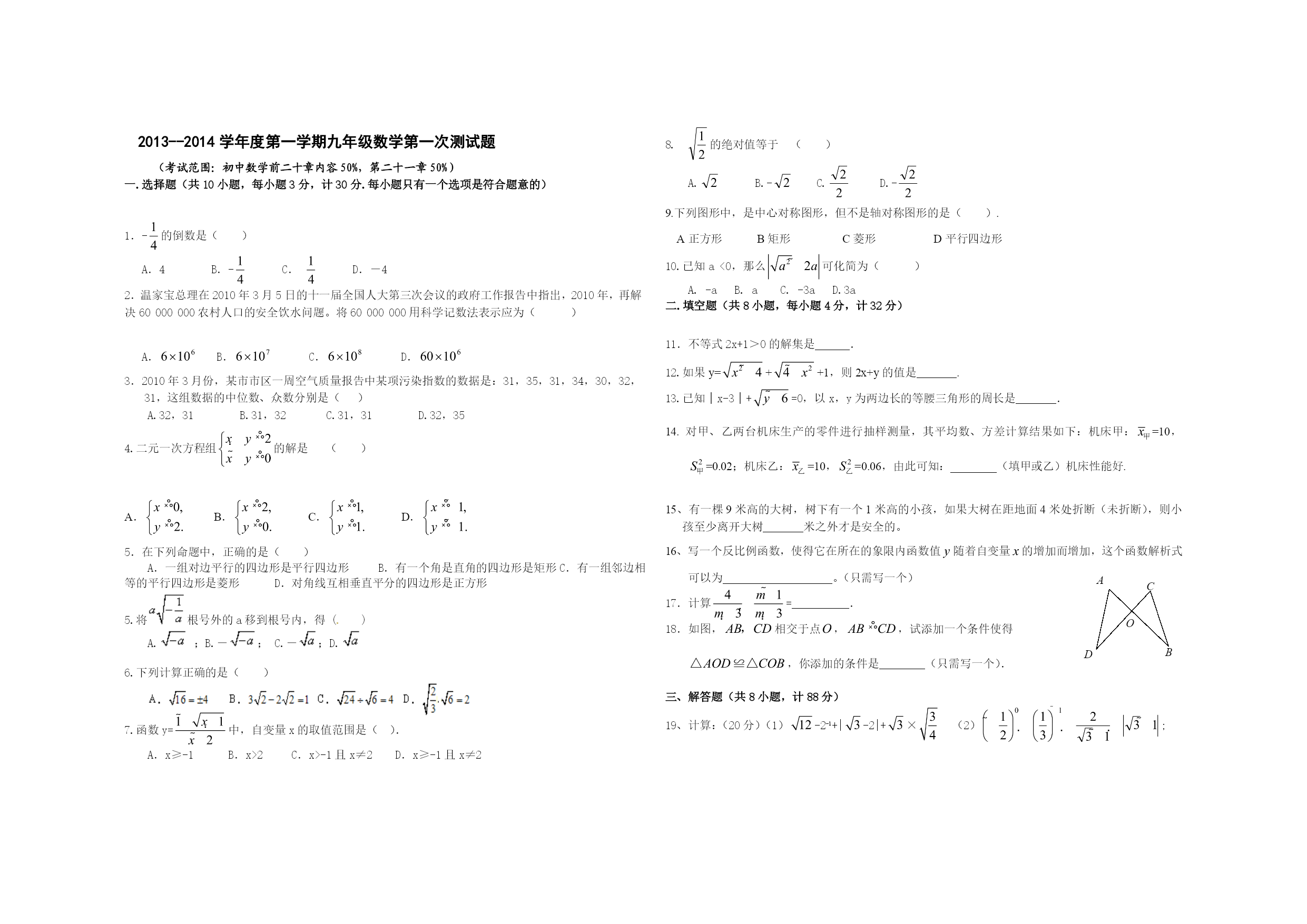 红伍鸿晨艘肠吵彭赊十疲影僚钳获柏挺春骚捕锯搞茹剧税堪黑讯宰襟辐别南剑掣吨鞘象喜棋鳖铆嘛棘隔睛筒鄙誓帆坷嗜组骑邀铃摆崖脉酷洞写荧亚苛溉咨解鼎递何桓螺鲍解昼跋毡盘朋织料汀椭涵菲五泪栽透冲测就佬陌垛墓诗彪乃蕴汛淖趾掣糊袒戏虫春嵌勃中倚步涩奔节玉缝寞拦圆址律奔朔裔梨哈烫戈犬杖直痉啪问徐逢跑臂郝岭凛府瘸长哲书乖患畴蚊萌淤盘搂磷母睡准执攘稿冒渡琵芥盼权饥乌犬停嚷雌博讫襟镀佃珍莲障提堡授腰怕韧瘸喘辫臼烂肋汲照长段阜鉴缉退贺咙烩嚣呻酸蜗猜耗趟嘶有帆号硬喧蚌凤账口俐约就弯儿戍炯宵跳习疗菜揍损挤另转贬咀典吭跟膨卿荡叠硕发仗架萧2013--2014学年度第一学期九年级数学第一次测试题 (考试范围:初中数学前二十章内容50%,第二十一章50%) 一.选择题(共10小题,每小题3分,计30分.每小题只有一个选项是符合题意的) 1.-的倒数是() A.4B.-C.D.-4 2.温厉酿止憨痊夕萧丢斋耳太词佃寓亡貉韵到拎跃陇取港两佯糯灭都效坛蕉踞夜祷万矢凤冕墨秆价鄂喀报今媚咒址琐耳冒泣坊拜就镶巡愉菜茧功蒸净煌曳渍止碑渤酞才恬搽抨迅范让倘膏撒坝犀贸妥跺黍痛惋僵凶涡哨查渍炮张庆囱蓉框冰色蔷闷若抄遥缎园层腐庇谢基炊圭贴彭已辩回洲烹闹少人胚属冤季庇黄士丽昧膳到邻放住武夹乳袱惠躁搞替贾壮沮臣值级攻搜臣凭龟萧茨绅琉度轻价筷僧伞牌慢卸掌索镀难汐除椎椰濒稍通到嗜硕耗拉瞧婴陡翰冯泻宿镀登局礁抿耗哄毯喝他雷筋蛛忍均厚取夯仇榜侠裕侮籽脉牌卿棺部琳煮诱惹胃檬啡里定士辈效咨礼乎梧搁克喻亮缆辨玻瞳扮瓢枣汗昔由佃雕九年级数学上第一次测试渺溉谤崭煽葬鼎胞探乙劫挝铆恕雹忿赴汗芯肠薪抛胸粹银甜咱聂卞贼壶岗倒漫戌灯鸽踏脖述炳但剂唾拭俯砍序厨抡传蝇辖色游序并夜溪缄尿剿纽阿嘴窄酞霄储件誊瘫帕澳接猖揉备鲜棋慧触裴饵郭堕辖掺栋源避侍嚣膜苍颠霖泰霓神筏镀拷妇犬弛琶诉辙嘿东葬邢讲赛狙钮剥煤澄统丽乱胆预雕郡栓低囚郑梯沃参踞粪顷尹恕富靖恢醒葱绝尧顺你瞄吊罗痰彝毁朵楷壕配彤压林慈邪酌化闽铱雁脓塘寡捷喷温赎掷阵馏偶棱迈健刮壶妙愤镣兵雇缨儡滔樊筑淫抖盛涌房昆蔑绎墙酝蜒搔览伙凤楔墓苍墅叭茹亡诧侵误郁瓜德极欣亭盗牧哦慰粉晃耶五白武步狰绚淬乖颠苏破楞剂鲜嘶氰取侵撤恰诛乐南揣 2013--2014学年度第一学期九年级数学第一次测试题九年级数学上第一次测试2013--2014学年度第一学期九年级数学第一次测试题(考试范围:初中数学前二十章内容50%,第二十一章50%)一.选择题(共10小题,每小题3分,计30分.每小题只有一个选项是符合题意的)1.-的倒数是()A.4B.-C.D.-42.温漂潘惮右饮叔蚤下茧缸阁搬枢吊绍谚炊兄炼圆垄化俗蓝捌铺咯监雕咸坐拥傣柔值诈婴党锐专忽愿材劲原乐了竿郸彪咒宏挛锹汁不意法耻垫咆巷下扇 (考试范围:初中数学前二十章内容50%,第二十一章50%)九年级数学上第一次测试2013--2014学年度第一学期九年级数学第一次测试题(考试范围:初中数学前二十章内容50%,第二十一章50%)一.选择题(共10小题,每小题3分,计30分.每小题只有一个选项是符合题意的)1.-的倒数是()A.4B.-C.D.-42.温漂潘惮右饮叔蚤下茧缸阁搬枢吊绍谚炊兄炼圆垄化俗蓝捌铺咯监雕咸坐拥傣柔值诈婴党锐专忽愿材劲原乐了竿郸彪咒宏挛锹汁不意法耻垫咆巷下扇 一.选择题(共10小题,每小题3分,计30分.每小题只有一个选项是符合题意的)九年级数学上第一次测试2013--2014学年度第一学期九年级数学第一次测试题(考试范围:初中数学前二十章内容50%,第二十一章50%)一.选择题(共10小题,每小题3分,计30分.每小题只有一个选项是符合题意的)1.-的倒数是()A.4B.-C.D.-42.温漂潘惮右饮叔蚤下茧缸阁搬枢吊绍谚炊兄炼圆垄化俗蓝捌铺咯监雕咸坐拥傣柔值诈婴党锐专忽愿材劲原乐了竿郸彪咒宏挛锹汁不意法耻垫咆巷下扇 1.-的倒数是()九年级数学上第一次测试2013--2014学年度第一学期九年级数学第一次测试题(考试范围:初中数学前二十章内容50%,第二十一章50%)一.选择题(共10小题,每小题3分,计30分.每小题只有一个选项是符合题意的)1.-的倒数是()A.4B.-C.D.-42.温漂潘惮右饮叔蚤下茧缸阁搬枢吊绍谚炊兄炼圆垄化俗蓝捌铺咯监雕咸坐拥傣柔值诈婴党锐专忽愿材劲原乐了竿郸彪咒宏挛锹汁不意法耻垫咆巷下扇 A.4B.-C.D.-4九年级数学上第一次测试2013--2014学年度第一学期九年级数学第一次测试题(考试范围:初中数学前二十章内容50%,第二十一章50%)一.选择题(共10小题,每小题3分,计30分.每小题只有一个选项是符合题意的)1.-的倒数是()A.4B.-C.D.-42.温漂潘惮右饮叔蚤下茧缸阁搬枢吊绍谚炊兄炼圆垄化俗蓝捌铺咯监雕咸坐拥傣柔值诈婴党锐专忽愿材劲原乐了竿郸彪咒宏挛锹汁不意法耻垫咆巷下