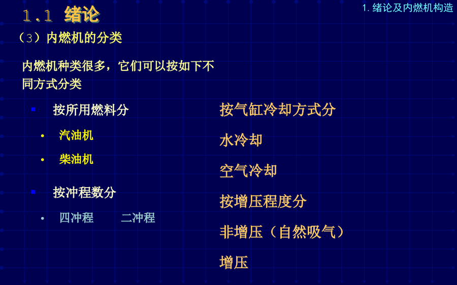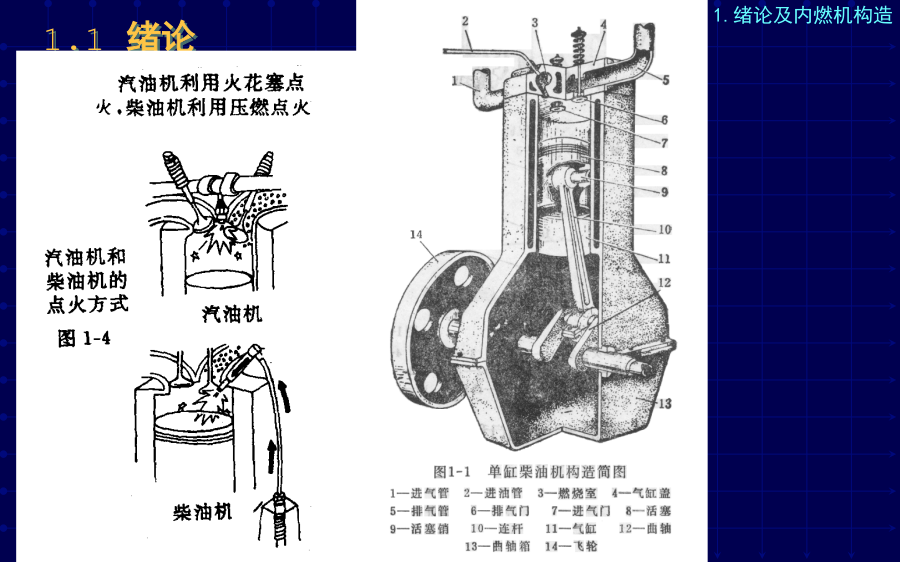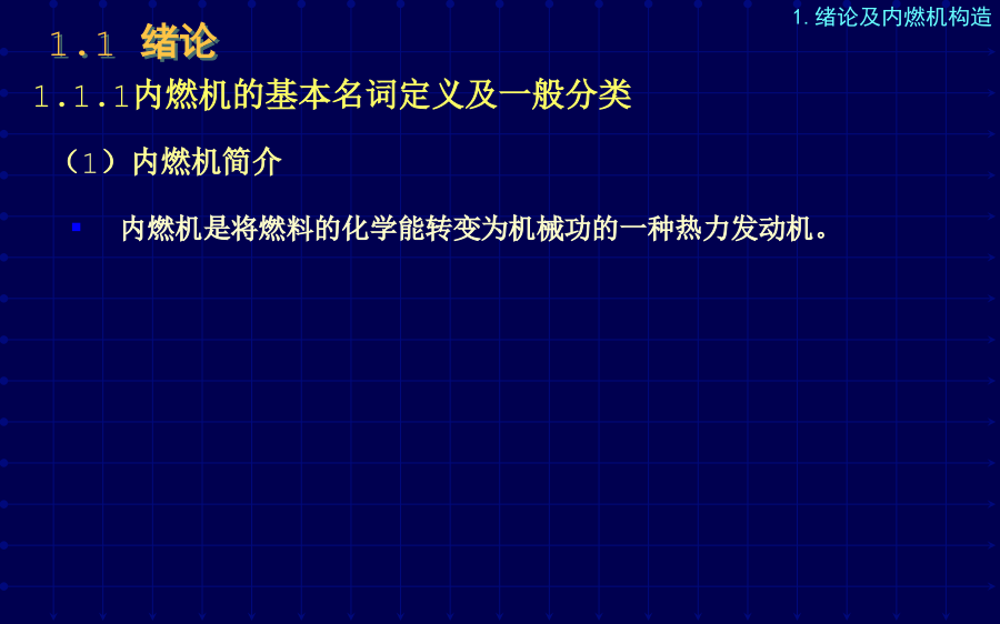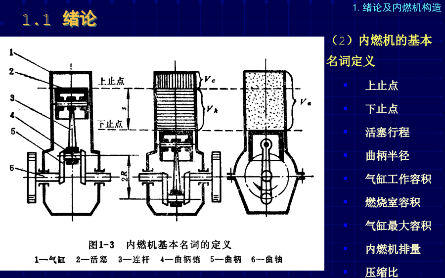 内燃机构造与设计1.1绪论1.1绪论1.1绪论1.1绪论1.1绪论1.1绪论1.1绪论1.1绪论1.1绪论1.1绪论1.1绪论1.1绪论1.1绪论奥迪A4型汽油机 直立四冲程、水冷、4缸 缸径×行程:86.4mm×81mm 标定功率/转速:110kW/6800r·min-1 球型燃烧室、顶置凸轮轴、五气门及增压中冷 电控汽油喷射、闭环、电子管理自诊断系统及三效催化剂 平均有效压力达1.48MPa D/IBD234发动机 四冲程、水冷 缸径×行程:128×140mm 直喷ω型燃烧室 有增压和非增压两种机型 缸数有6、8、12 气缸为V形排列、60°夹角 采用Bosch高压燃油系统 增压机型采用KKK增压器,进气中冷 平均有效压力达1.737MPa 单缸功率最高可达60kW 最低燃油消耗率不高于205g/(kW·h)1.2曲柄连杆机构