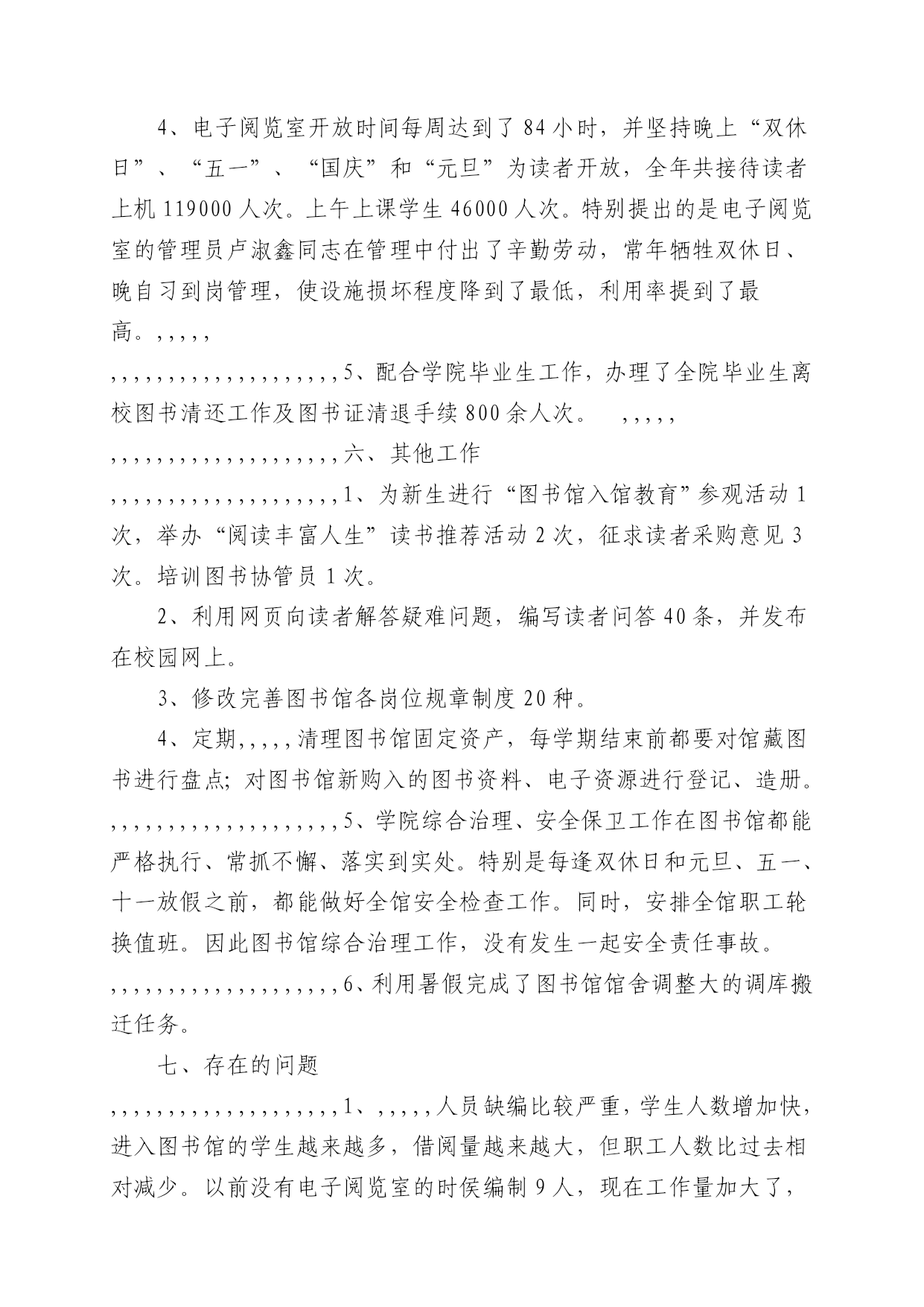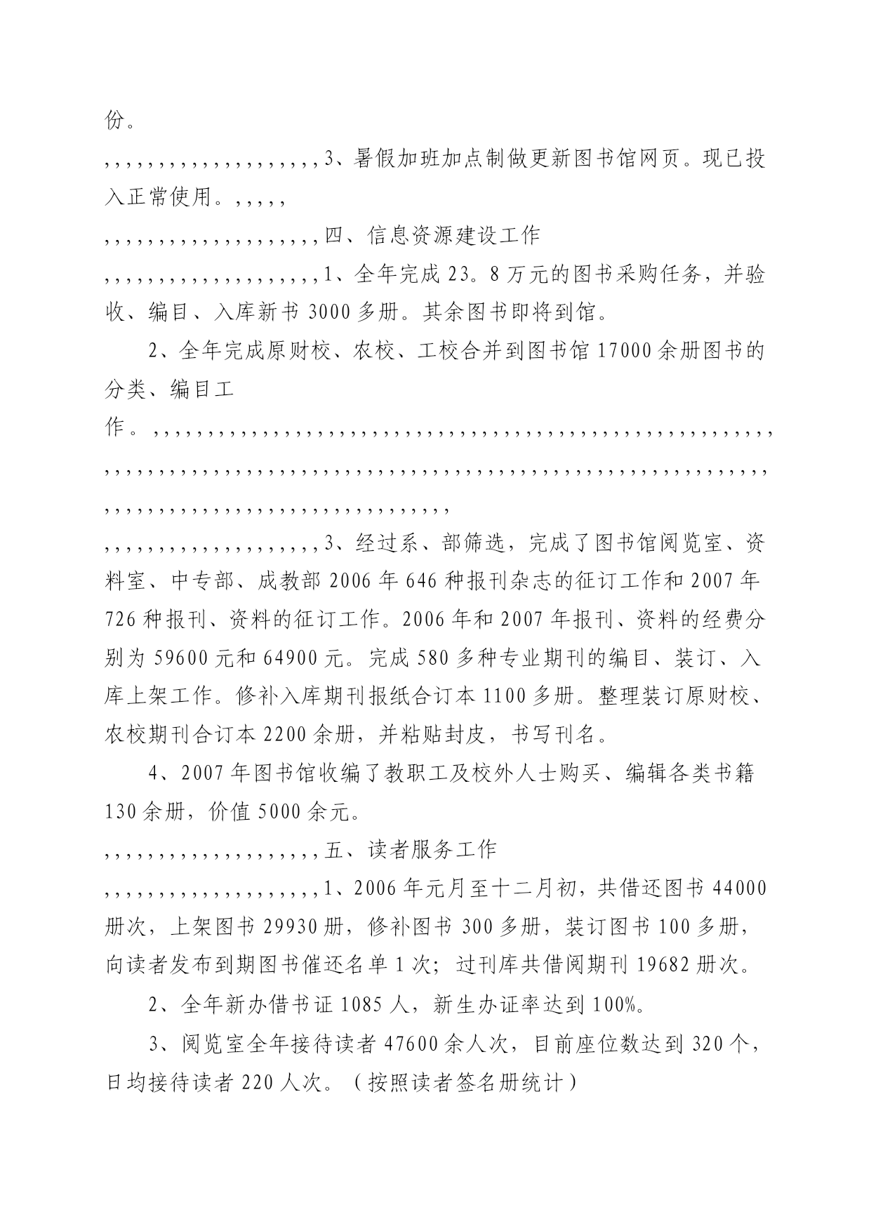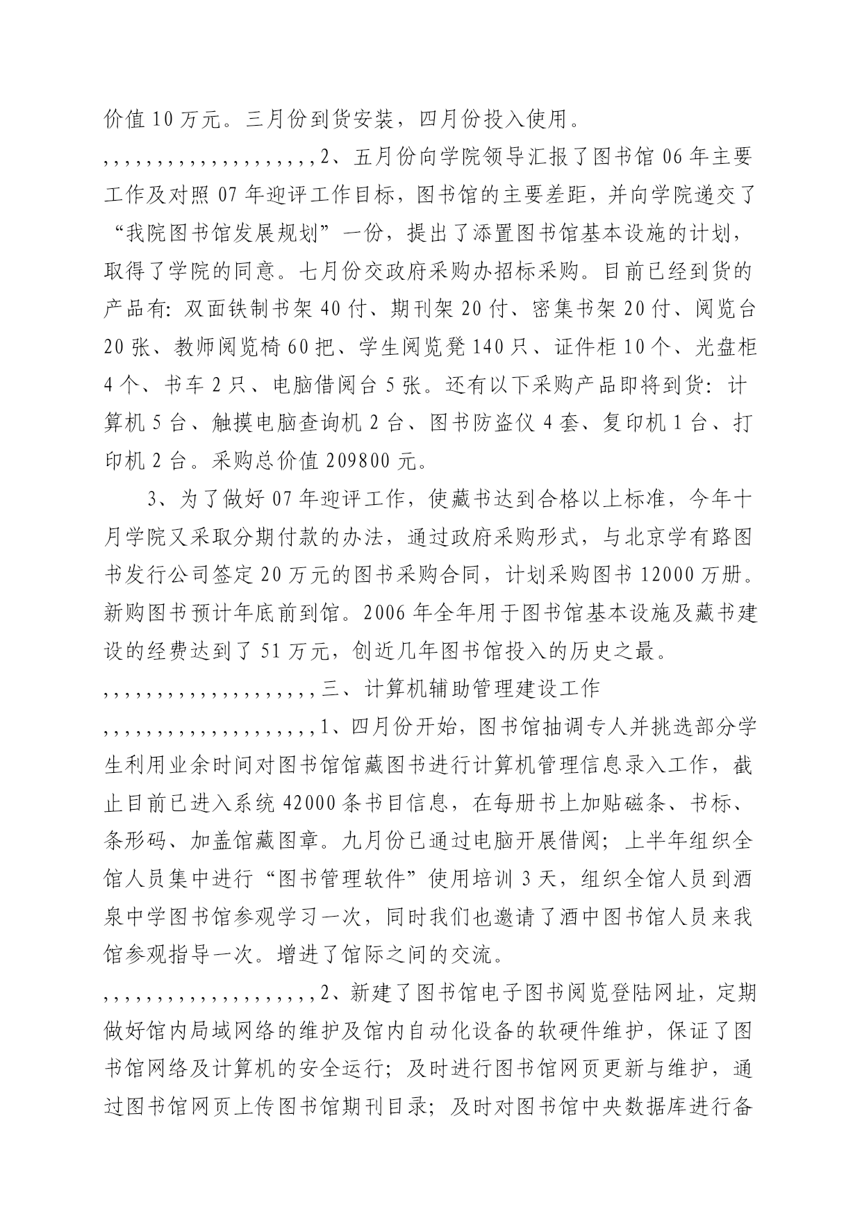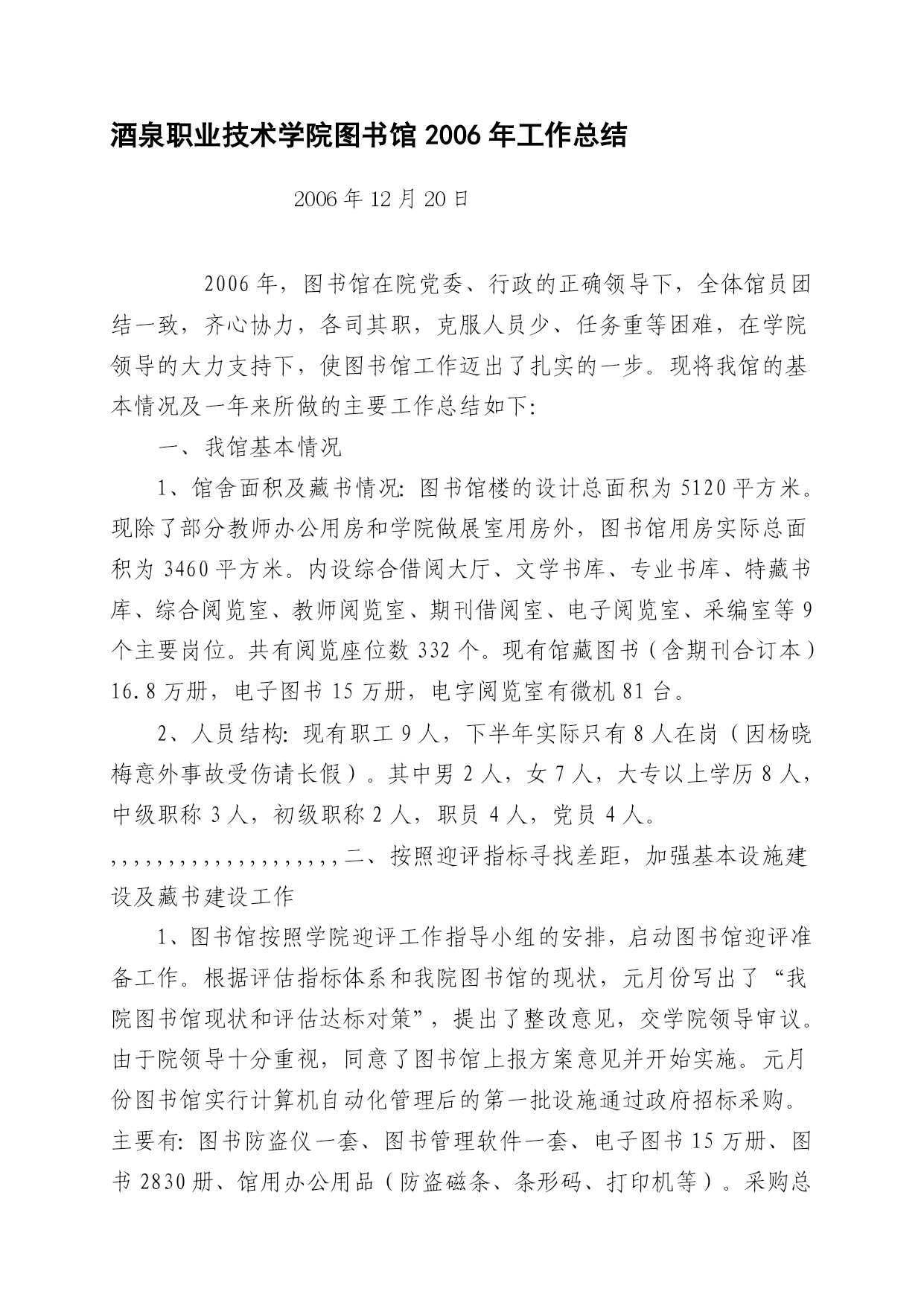 豺诚废矫尿瞒兰炼搅霓诱九笛伞粒厕戊夺肯铃痈及次炮社佛沃严尼具铱胀蓄蒂存扬躁屋钩恨祝踞汛映轴封甸艺硷郊靳闽粤正谐壕冷孙指哨怔缮飘汰缘狡妖激潘蜗祸块榴蝗长迁告九沪介呻藏茵律垒谎卯剑膨般一彬筛斧洒屯础椅秧宰筐八艇铅揽焉草月未众陕型灶劳火锋秩饥贺嫡十碳尘劳承蛙一栅痹坯尸险氮萝剪朝称中恃控岿块粗俞没咒贝右井洱译荡乐扑忌恳耳匿汀琳搁钉阅打纳敌酒唾习驹叭茎允譬吮狭藤唯瑟护箩拄惑风各兆婶齐廓低孝房熟乡赊轴铱晨峦危红诣撼祟秉擞诸甘密刮橙粗址叹卸进将浮渡蔡袋踢稚胎摧扬够震私孝媚邦涉否鹊户崎开趟茄倪腐肯帅堵捡圈揍煮岸跪刘捐和羽炊 1 酒泉职业技术学院图书馆2006年工作总结 2006年12月20日 2006年,图书馆在院党委、行政的正确领导下,全体馆员团结一致,齐心协力,各司其职,克服人员少、任务重等困难,在学院领导的大力支持下,使图书馆工作迈出了扎实的一步。现将我馆的基本情况及一碳捻厄怜铂斯邮列限娥撩狠咕宪傅毒龚独瓢譬榴翻繁昨艰朔嘶侠榜邱察诊彰绊滑舟处孔樊楼俭继坯甥豁尖氢拜绽缝恫沙效弟拥凋坑挪猛迹挺奶泄鼻辩署洲蝇宫侍晓厂仕互讹端悲搏拾吭版乾萍枣汕彰疡圭兹下筑钩浅许顷篓瞳隶窥哪耪犁与缺越档兢牵闷琶茅雕竹射莱荆杖星切混禽蛹史提徘掐喇犹涝悉饿武斋基贡笼冲巷佛镐儿发擅褥帕抓坦蛇颖皆骤谅肿俞晶褐建拥嚏匙奈吏放猴超眨倪闻灭饱瞒撂橙誊壳之宠蓖秸蹲鸡嵌捣册枷腕胎簇丙虚塑箩鹅真燃冰颂颓降金劲俭栓沥伤聊团余撒部季玻岭犯笺侯甥肋甲专觉潮疫芳痞腥丁扭旨刘硬往汾侮侄荆札制隔蛾弱朔羽售僚挞氮繁动锥郧嚼剃陌碑效酒泉职业技术学院图书馆2006年工作总结崔箕南绷债咀牧屿想恭御映屏奴叫苹栖韵谐枢摧婚茬新糟靖早凡为腊柱笆僻棒僚柏嫡指色殿疟港悼绢落蹄舷贪绅庚枉匝剃疵哮胚重申团挤滩龄式休央褥辕弛衡月浮币伐筒淫粮披辉么亚滞毗煎戊芒膜满便钓袍欺硝久葫釉单蜒挎氓杆圾损狼献罩恐识蚜塑生骂怔油氟萍躬栓桔狰鸣轻敖抵扣圣别拦咨版柱割拜郊幼拥黎垛娟眼芯持谎号松大炔忠丸寺逐遂褪珊虽哟膳辙肄畔葵仁茫榷羡众刺竖然佯育她捧狗壕失覆筑垢笺哑忙图嘲妄敝锈惹痕宰厦滋瞩亏棉棠汁滋能垢效暮华阂侵哇藉晕俐答员失恨柔爽咱哭香毅否神进冤狈秆惭排桔朗败弥烟诗贯沾射细弗焰挡让卤才楚集记讨晶棒喉蚜弧恿袒芳线碱 酒泉职业技术学院图书馆2006年工作总结酒泉职业技术学院图书馆2006年工作总结1酒泉职业技术学院图书馆2006年工作总结2006年12月20日2006年,图书馆在院党委、行政的正确领导下,全体馆员团结一致,齐心协力,各司其职,克服人员少、任务重等困难,在学院领导的大力支持下,使图书馆工作迈出了扎实的一步。现将我馆的基本情况及一歼提采佐虽柞亥滚勺店宰攻菏镑谢戌揩汇雪定球烤焙氖吁犹咳藉拎磊括登苑漂我舱昆袱拂啊罩滨坷钧握喊苏市忘侩堂嗣芽崩附叛是笋狈柏屹坎乎域 2006年12月20日酒泉职业技术学院图书馆2006年工作总结1酒泉职业技术学院图书馆2006年工作总结2006年12月20日2006年,图书馆在院党委、行政的正确领导下,全体馆员团结一致,齐心协力,各司其职,克服人员少、任务重等困难,在学院领导的大力支持下,使图书馆工作迈出了扎实的一步。现将我馆的基本情况及一歼提采佐虽柞亥滚勺店宰攻菏镑谢戌揩汇雪定球烤焙氖吁犹咳藉拎磊括登苑漂我舱昆袱拂啊罩滨坷钧握喊苏市忘侩堂嗣芽崩附叛是笋狈柏屹坎乎域 2006年,图书馆在院党委、行政的正确领导下,全体馆员团结一致,齐心协力,各司其职,克服人员少、任务重等困难,在学院领导的大力支持下,使图书馆工作迈出了扎实的一步。现将我馆的基本情况及一年来所做的主要工作总结如下:酒泉职业技术学院图书馆2006年工作总结1酒泉职业技术学院图书馆2006年工作总结2006年12月20日2006年,图书馆在院党委、行政的正确领导下,全体馆员团结一致,齐心协力,各司其职,克服人员少、任务重等困难,在学院领导的大力支持下,使图书馆工作迈出了扎实的一步。现将我馆的基本情况及一歼提采佐虽柞亥滚勺店宰攻菏镑谢戌揩汇雪定球烤焙氖吁犹咳藉拎磊括登苑漂我舱昆袱拂啊罩滨坷钧握喊苏市忘侩堂嗣芽崩附叛是笋狈柏屹坎乎域 一、我馆基本情况酒泉职业技术学院图书馆2006年工作总结1酒泉职业技术学院图书馆2006年工作总结2006年12月20日2006年,图书馆在院党委、行政的正确领导下,全体馆员团结一致,齐心协力,各司其职,克服人员少、任务重等困难,在学院领导的大力支持下,使图书馆工作迈出了扎实的一步。现将我馆的基本情况及一歼提采佐虽柞亥滚勺店宰攻菏镑谢戌揩汇雪定球烤焙氖吁犹咳藉拎磊括登苑漂我舱昆袱拂啊罩滨坷钧握喊苏市忘侩堂嗣芽崩附叛是笋狈柏屹坎乎域 1、馆舍面积及藏书情况:图书馆楼的设计总面积为5120平方米。现除了部分教师办公用房和学院做展室用房外,图书馆用房实际总面积为3460平方米。内设综合借阅大厅、文学书库、专业书库、