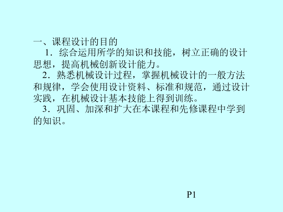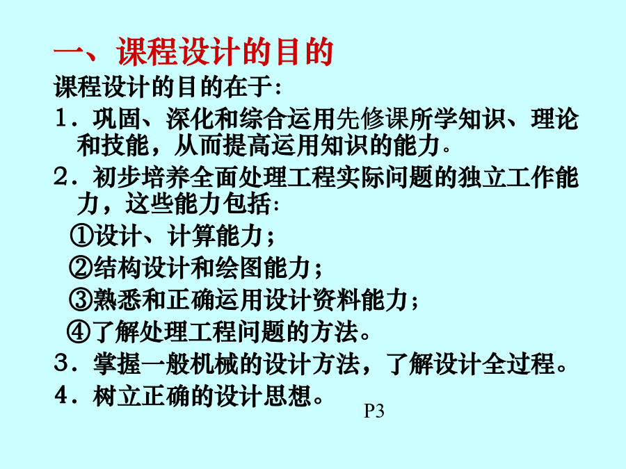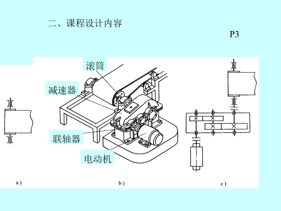 机械设计 综合课程设计绪论一、课程设计的目的 1.综合运用所学的知识和技能,树立正确的设计思想,提高机械创新设计能力。 2.熟悉机械设计过程,掌握机械设计的一般方法和规律,学会使用设计资料、标准和规范,通过设计实践,在机械设计基本技能上得到训练。 3.巩固、加深和扩大在本课程和先修课程中学到的知识。一、课程设计的目的 课程设计的目的在于: 1.巩固、深化和综合运用先修课所学知识、理论和技能,从而提高运用知识的能力。 2.初步培养全面处理工程实际问题的独立工作能力,这些能力包括: ①设计、计算能力; ②结构设计和绘图能力; ③熟悉和正确运用设计资料能力; ④了解处理工程问题的方法。 3.掌握一般机械的设计方法,了解设计全过程。 4.树立正确的设计思想。二、课程设计内容层屿沼谆杂铡衅嘱鄙质击贫拉歉帕愉杰抗戚巾犊拓冤铺咨步哭慨缔理皱沃机械设计综合课程设计讲义2机械设计综合课程设计讲义2 设计内容:单级齿轮减速器 任务: 1、减速器设计装配图一张(A1) 2、零件工作图2~3张(轴、齿轮) 3、设计计算说明书一份,要求图文并茂约10000~12000字。 三、选择设计题目(举例)带式运输机传动装置的设计 设计题目 带式运输机传动装置。 传动装置简图如右图所示。 (电动机的位置自行确定) (1)带式运输机数据 运输带工作拉力F=N 运输带工作速度v=m/s 运输带滚筒直径D=mm 滚筒轮中心高度H=mm (附:运输带绕过滚筒的损失通 过效率计算,取效率η=0.97)(2)工作条件 用于锅炉房运煤,两班制工作,空载启动,单向、连续运转,载荷平稳。 (3)使用期限 工作期限为十年,每年工作300天;检修期间隔为三年。 (4)生产批量及加工条件 批量生产,有铸造设备。 2.设计任务1)选择电动机型号; 2)确定带传动的主要参数及尺寸; 3)设计减速器; 4)选择联轴器。 3.具体作业1)减速器装配图一张; 2)零件工作图二张(大齿轮,输出轴); 3)设计说明书一份。 F/kN1.传动装置总体设计方案图1张; 2.传动装置装配草图1张(1号坐标纸、手绘); 3.工作图:装配图1张、零件图2~3张(计算机绘图,M1:1); 4.设计计算说明书1份(10000~12000字)。 四、课程设计参考进度五、课程设计要求 课程设计是一次全面的综合训练,为今后设计工作打下基础,具体要求是: 1.学生必须在老师指导下独立完成设计任务; 2.在设计中必须严肃认真,一丝不苟,精益求精; 3.必须认真阅读设计参考资料; 4.正确处理继承和创新的关系; 5.正确运用标准和规范; 6.正确处理强度计算、结构设计与绘图的关系; 7.遵守纪律,必须按时、保质、保量完成设计任务。 六、成绩评定八、课程设计的要求 1.循序渐进,逐步完善和提高。 2.掌握机械设计基本技能,正确处理理论计算与结构设计的关系。 3.汲取传统经验,注重调察研究,发挥主观能动性和创新精神。 4.提倡采用现代设计方法和手段,提高综合设计能力。机械装置总体设计§2-1传动方案拟定 一、确定传动方案的依据:使用要求、工作条件、经济性等。 合理的传动方案,应该是:在满足工作机性能要求的前提下,工作可靠,传动效率高,结构简单,尺过紧凑,成本低,工艺性好,使用维护方便 二、合理安排传动件的顺序 在充分了解各种传动性能、特点及使用条件的基础上,结合工作机的需要(载荷大小、性质、速度等)选择合适的传动机构,并按其特性安排传动顺序并绘制简图。三、传动方案分析、比较 一般来说,实现某种需要,通常可以拟定出多种传动方案,要将其比较、确定最佳方案。 §2-2电机选择(类型、容量、转速) 一、电机类型 Y系列,三相异步电动机 二、电机容量 1.工作机所需功率Pw Pw=FWVW/1000Kw或Pw=TWnW/9550Kw 2.计算传动装置的总效率η η=η1η2η3…… 3.确定电机所需功率Pd Pd=Pw/ηKw 4.确定电机额定功率Pm Pm=(1.1~1.2)Pd(符合标准系列) 传动装置总效率三、电动机转速 同一功率,同一类型电机有不同的转速。 转速越低,重量、体积越大、价格越高,选择电机转速要根据总的速比来决定。 i=i1i2i3……(ii在常用范围内选取) nd=inw 一般选择的同步转速为1000r/min或1500r/min。 确定电动机型号 例:Pm=4kw§2-3传动装置总传动比的确定和分配 1.确定总传动比(1)限制原则:各级传动比应在推荐范围内选取,不得超过最大值分配原则: (1)限制原则:各级传动比应在推荐范围内选取,不得超过最大值 (2)协调原则:使传动装置的结构均匀,尺寸比例协调,而互不干涉。 (3)等浸油深度原则:各级大齿轮直径接近,使浸油深度相近;对于展开式双级圆柱齿轮减速器大约为i