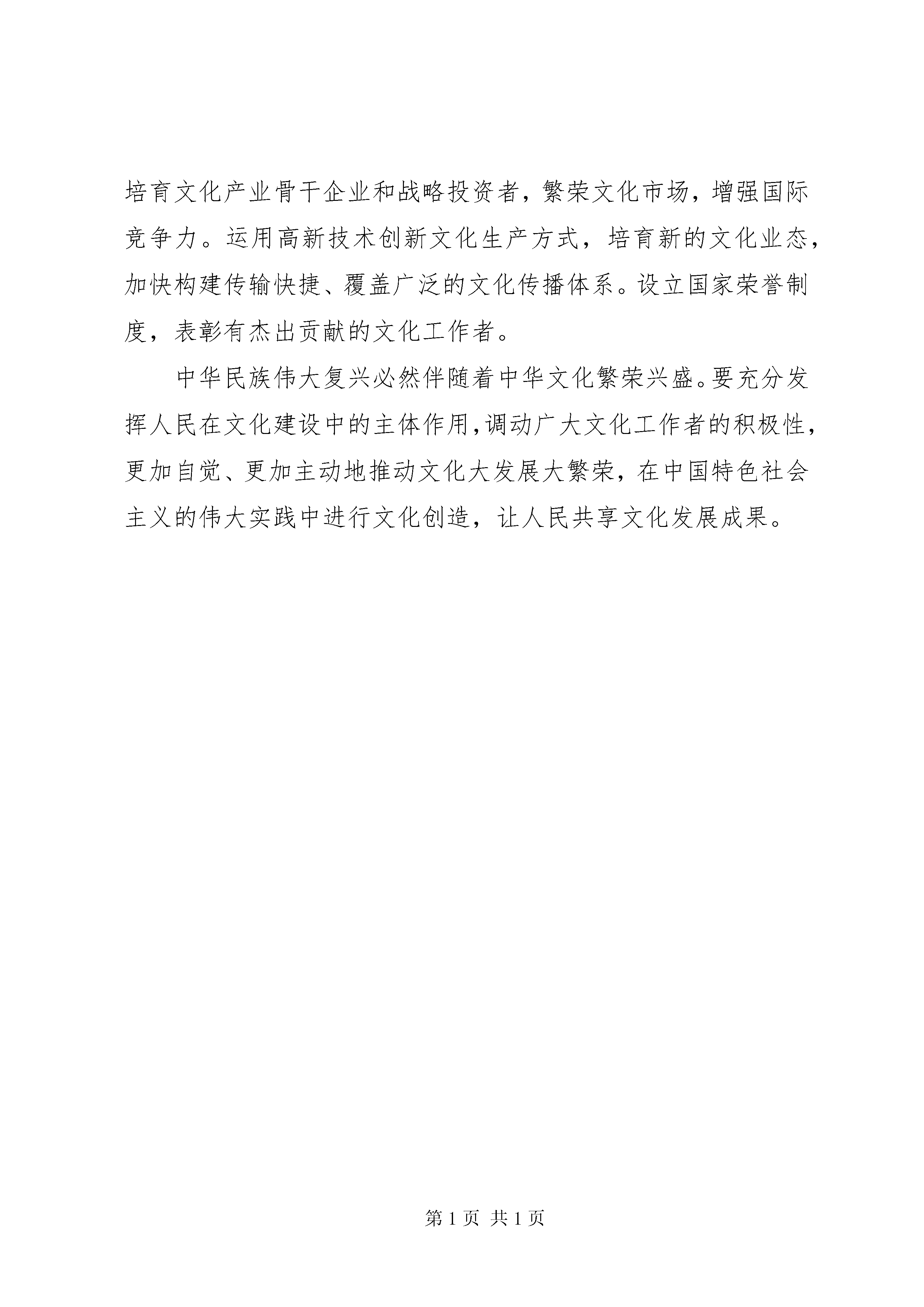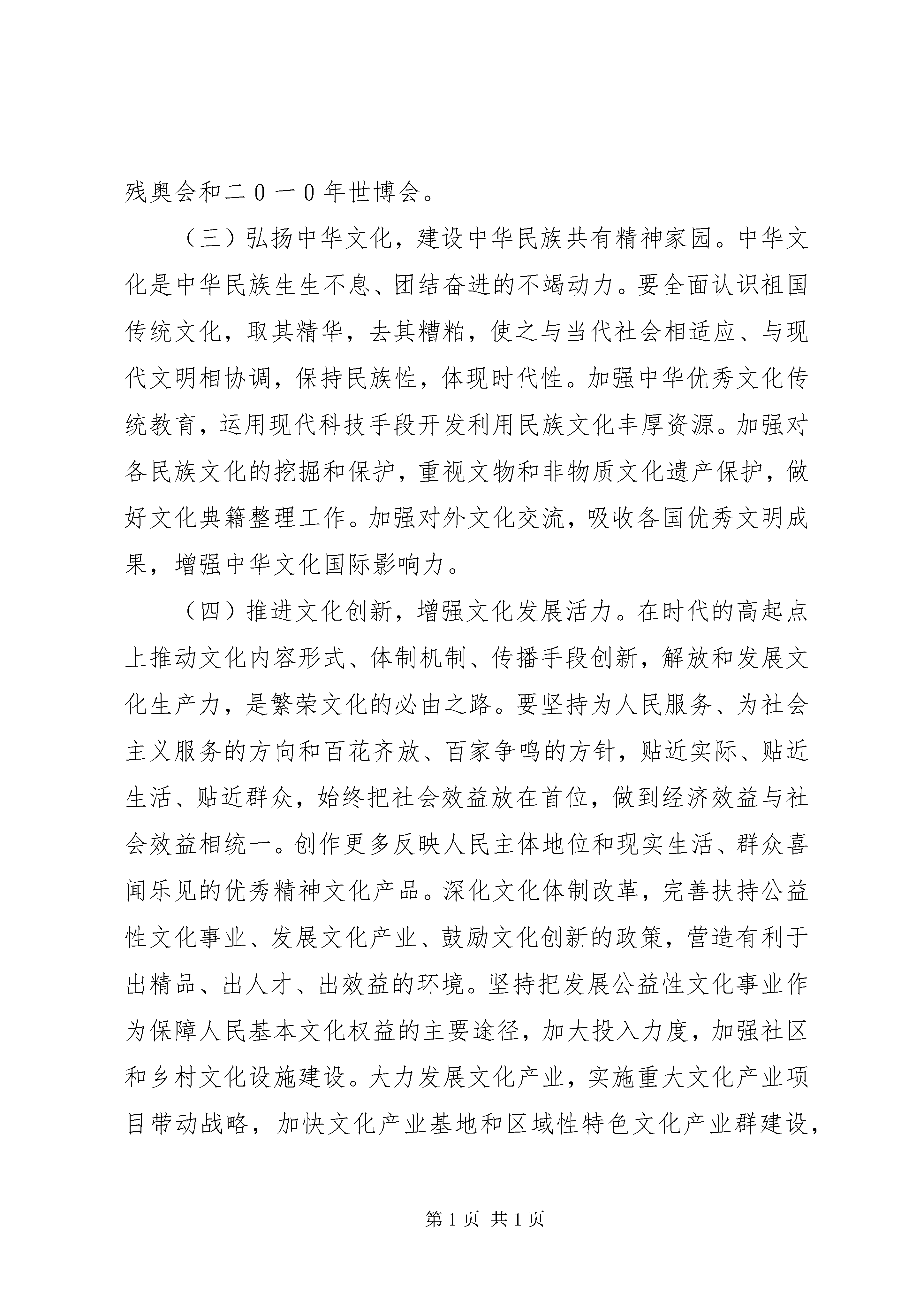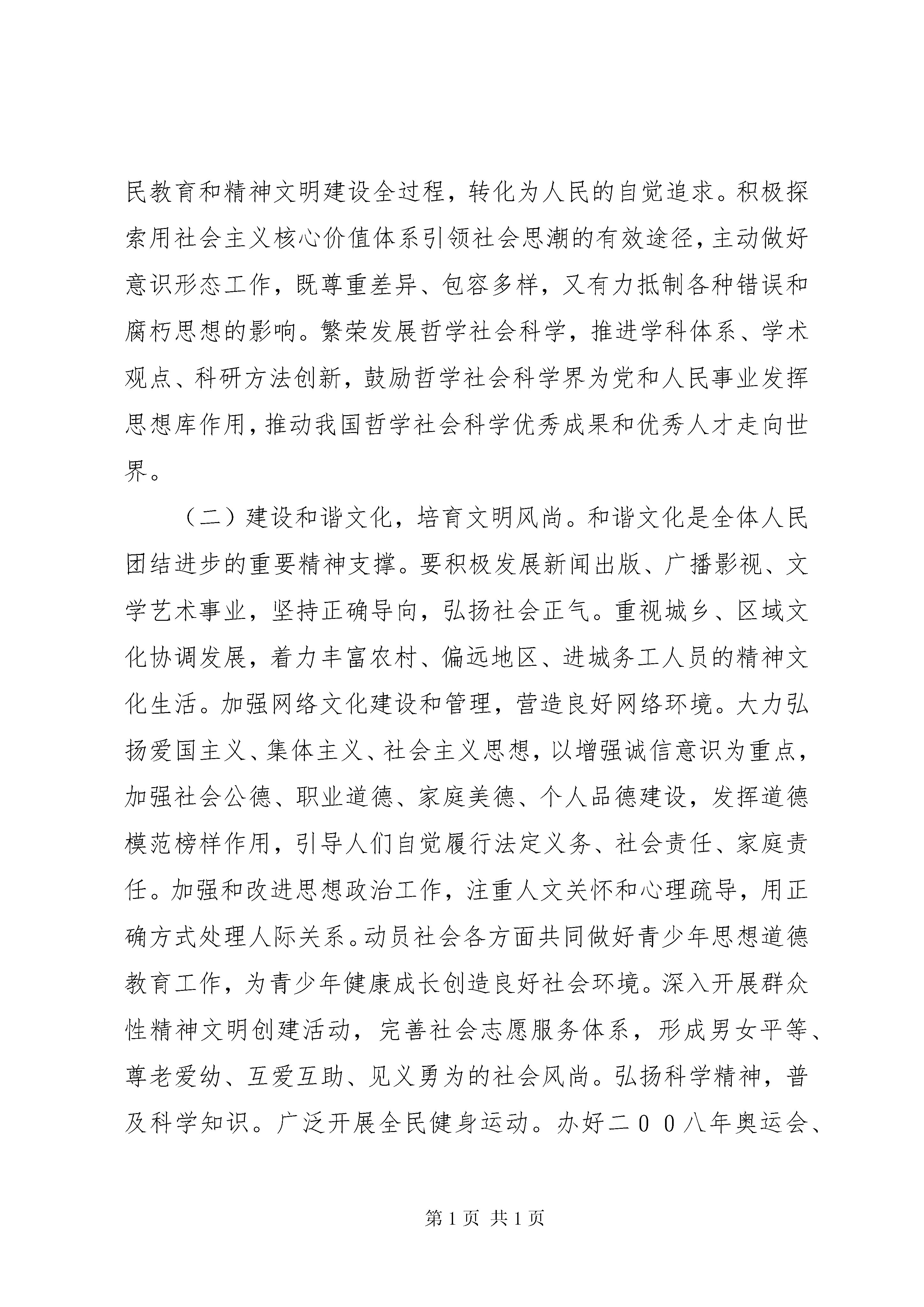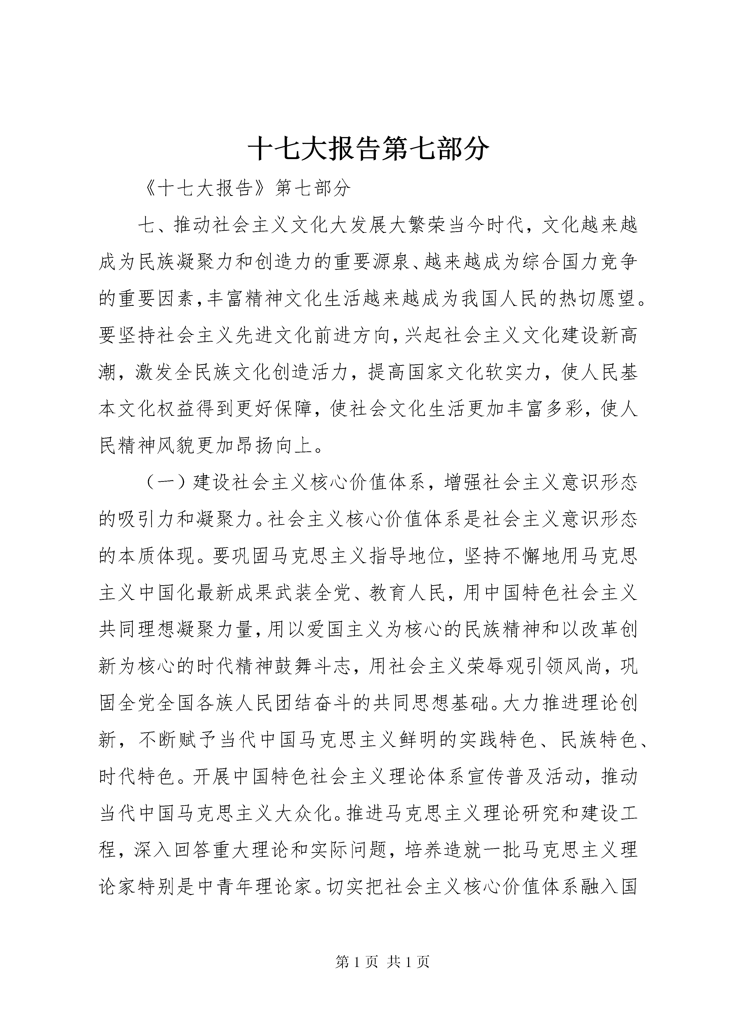 十七大报告第七部分《十七大报告》第七部分七、推动社会主义文化大发展大繁荣当今时代,文化越来越成为民族凝聚力和创造力的重要源泉、越来越成为综合国力竞争的重要因素,丰富精神文化生活越来越成为我国人民的热切愿望。要坚持社会主义先进文化前进方向,兴起社会主义文化建设新高潮,激发全民族文化创造活力,提高国家文化软实力,使人民基本文化权益得到更好保障,使社会文化生活更加丰富多彩,使人民精神风貌更加昂扬向上。(一)建设社会主义核心价值体系,增强社会主义意识形态的吸引力和凝聚力。社会主义核心价值体系是社会主义意识形态的本质体现。要巩固马克思主义指导地位,坚持不懈地用马克思主义中国化最新成果武装全党、教育人民,用中国特色社会主义共同理想凝聚力量,用以爱国主义为核心的民族精神和以改革创新为核心的时代精神鼓舞斗志,用社会主义荣辱观引领风尚,巩固全党全国各族人民团结奋斗的共同思想基础。大力推进理论创新,不断赋予当代中国马克思主义鲜明的实践特色、民族特色、时代特色。开展中国特色社会主义理论体系宣传普及活动,推动当代中国马克思主义大众化。推进马克思主义理论研究和建设工程,深入回答重大理论和实际问题,培养造就一批马克思主义理论家特别是中青年理论家。切实把社会主义核心价值体系融入国民教育和精神文明建设全过程,转化为人民的自觉追求。积极探索用社会主义核心价值体系引领社会思潮的有效途径,主动做好意识形态工作,既尊重差异、包容多样,又有力抵制各种错误和腐朽思想的影响。繁荣发展哲学社会科学,推进学科体系、学术观点、科研方法创新,鼓励哲学社会科学界为党和人民事业发挥思想库作用,推动我国哲学社会科学优秀成果和优秀人才走向世界。(二)建设和谐文化,培育文明风尚。和谐文化是全体人民团结进步的重要精神支撑。要积极发展新闻出版、广播影视、文学艺术事业,坚持正确导向,弘扬社会正气。重视城乡、区域文化协调发展,着力丰富农村、偏远地区、进城务工人员的精神文化生活。加强网络文化建设和管理,营造良好网络环境。大力弘扬爱国主义、集体主义、社会主义思想,以增强诚信意识为重点,加强社会公德、职业道德、家庭美德、个人品德建设,发挥道德模范榜样作用,引导人们自觉履行法定义务、社会责任、家庭责任。加强和改进思想政治工作,注重人文关怀和心理疏导,用正确方式处理人际关系。动员社会各方面共同做好青少年思想道德教育工作,为青少年健康成长创造良好社会环境。深入开展群众性精神文明创建活动,完善社会志愿服务体系,形成男女平等、尊老爱幼、互爱互助、见义勇为的社会风尚。弘扬科学精神,普及科学知识。广泛开展全民健身运动。办好二00八年奥运会、残奥会和二0一0年世博会。(三)弘扬中华文化,建设中华民族共有精神家园。中华文化是中华民族生生不息、团结奋进的不竭动力。要全面认识祖国传统文化,取其精华,去其糟粕,使之与当代社会相适应、与现代文明相协调,保持民族性,体现时代性。加强中华优秀文化传统教育,运用现代科技手段开发利用民族文化丰厚资源。加强对各民族文化的挖掘和保护,重视文物和非物质文化遗产保护,做好文化典籍整理工作。加强对外文化交流,吸收各国优秀文明成果,增强中华文化国际影响力。(四)推进文化创新,增强文化发展活力。在时代的高起点上推动文化内容形式、体制机制、传播手段创新,解放和发展文化生产力,是繁荣文化的必由之路。要坚持为人民服务、为社会主义服务的方向和百花齐放、百家争鸣的方针,贴近实际、贴近生活、贴近群众,始终把社会效益放在首位,做到经济效益与社会效益相统一。创作更多反映人民主体地位和现实生活、群众喜闻乐见的优秀精神文化产品。深化文化体制改革,完善扶持公益性文化事业、发展文化产业、鼓励文化创新的政策,营造有利于出精品、出人才、出效益的环境。坚持把发展公益性文化事业作为保障人民基本文化权益的主要途径,加大投入力度,加强社区和乡村文化设施建设。大力发展文化产业,实施重大文化产业项目带动战略,加快文化产业基地和区域性特色文化产业群建设,培育文化产业骨干企业和战略投资者,繁荣文化市场,增强国际竞争力。运用高新技术创新文化生产方式,培育新的文化业态,加快构建传输快捷、覆盖广泛的文化传播体系。设立国家荣誉制度,表彰有杰出贡献的文化工作者。中华民族伟大复兴必然伴随着中华文化繁荣兴盛。要充分发挥人民在文化建设中的主体作用,调动广大文化工作者的积极性,更加自觉、更加主动地推动文化大发展大繁荣,在中国特色社会主义的伟大实践中进行文化创造,让人民共享文化发展成果。