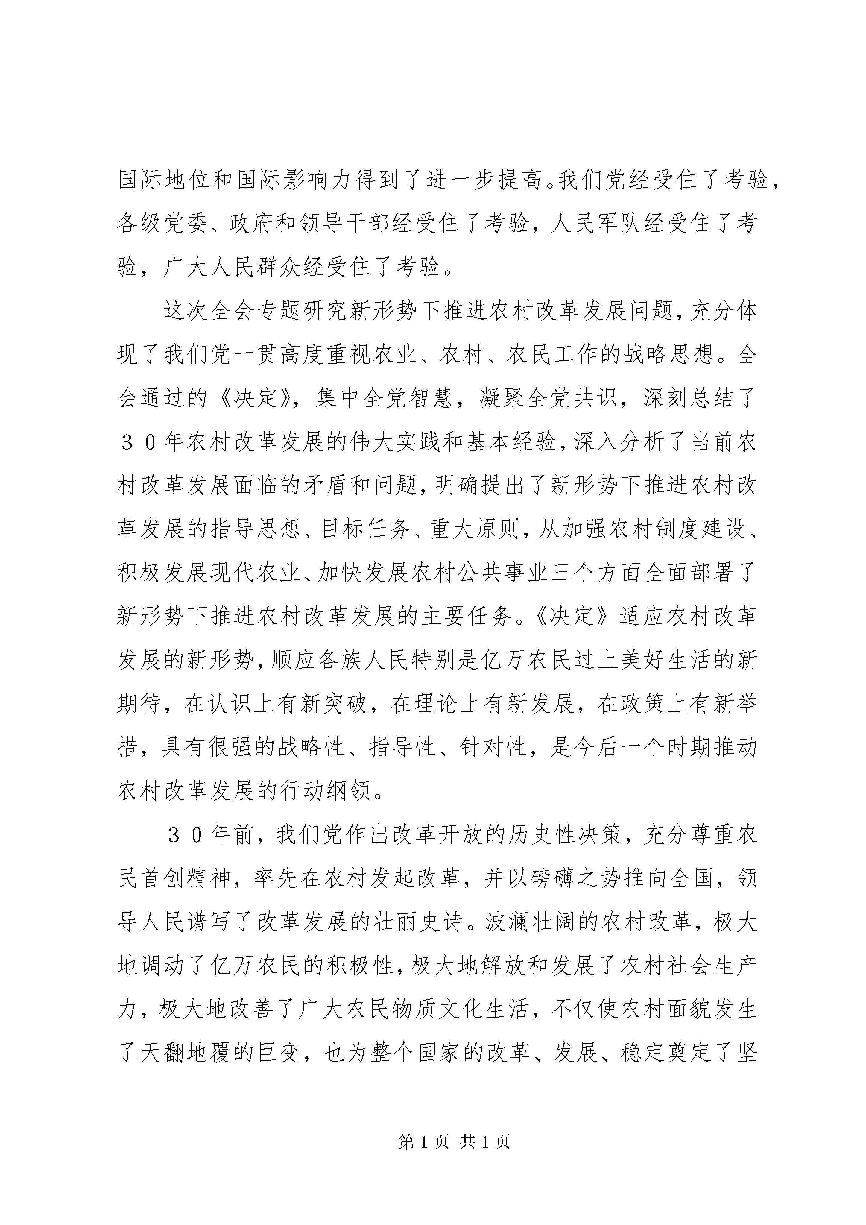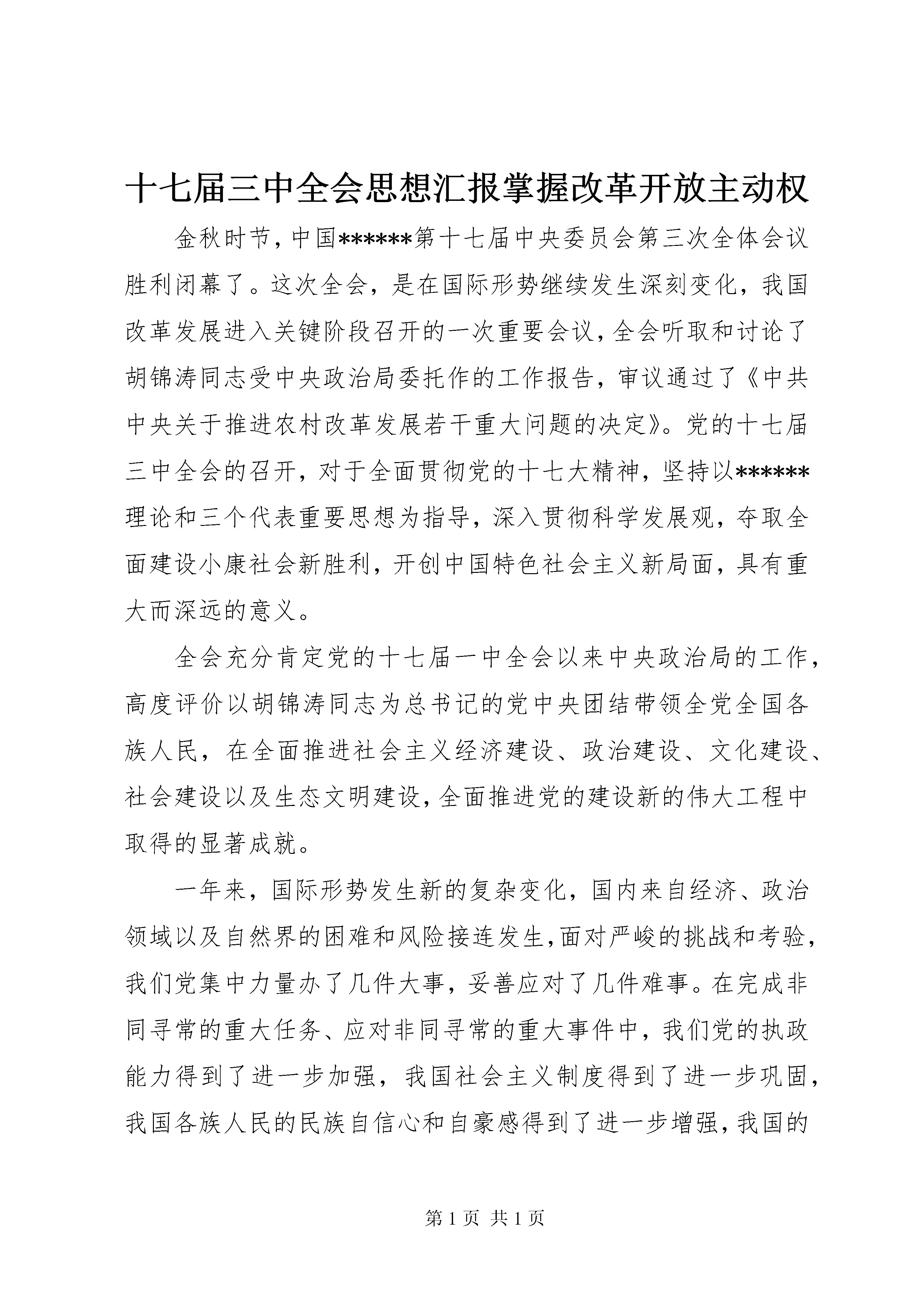 十七届三中全会思想汇报掌握改革开放主动权金秋时节,中国******第十七届中央委员会第三次全体会议胜利闭幕了。这次全会,是在国际形势继续发生深刻变化,我国改革发展进入关键阶段召开的一次重要会议,全会听取和讨论了胡锦涛同志受中央政治局委托作的工作报告,审议通过了《中共中央关于推进农村改革发展若干重大问题的决定》。党的十七届三中全会的召开,对于全面贯彻党的十七大精神,坚持以******理论和三个代表重要思想为指导,深入贯彻科学发展观,夺取全面建设小康社会新胜利,开创中国特色社会主义新局面,具有重大而深远的意义。全会充分肯定党的十七届一中全会以来中央政治局的工作,高度评价以胡锦涛同志为总书记的党中央团结带领全党全国各族人民,在全面推进社会主义经济建设、政治建设、文化建设、社会建设以及生态文明建设,全面推进党的建设新的伟大工程中取得的显著成就。一年来,国际形势发生新的复杂变化,国内来自经济、政治领域以及自然界的困难和风险接连发生,面对严峻的挑战和考验,我们党集中力量办了几件大事,妥善应对了几件难事。在完成非同寻常的重大任务、应对非同寻常的重大事件中,我们党的执政能力得到了进一步加强,我国社会主义制度得到了进一步巩固,我国各族人民的民族自信心和自豪感得到了进一步增强,我国的国际地位和国际影响力得到了进一步提高。我们党经受住了考验,各级党委、政府和领导干部经受住了考验,人民军队经受住了考验,广大人民群众经受住了考验。这次全会专题研究新形势下推进农村改革发展问题,充分体现了我们党一贯高度重视农业、农村、农民工作的战略思想。全会通过的《决定》,集中全党智慧,凝聚全党共识,深刻总结了30年农村改革发展的伟大实践和基本经验,深入分析了当前农村改革发展面临的矛盾和问题,明确提出了新形势下推进农村改革发展的指导思想、目标任务、重大原则,从加强农村制度建设、积极发展现代农业、加快发展农村公共事业三个方面全面部署了新形势下推进农村改革发展的主要任务。《决定》适应农村改革发展的新形势,顺应各族人民特别是亿万农民过上美好生活的新期待,在认识上有新突破,在理论上有新发展,在政策上有新举措,具有很强的战略性、指导性、针对性,是今后一个时期推动农村改革发展的行动纲领。30年前,我们党作出改革开放的历史性决策,充分尊重农民首创精神,率先在农村发起改革,并以磅礴之势推向全国,领导人民谱写了改革发展的壮丽史诗。波澜壮阔的农村改革,极大地调动了亿万农民的积极性,极大地解放和发展了农村社会生产力,极大地改善了广大农民物质文化生活,不仅使农村面貌发生了天翻地覆的巨变,也为整个国家的改革、发展、稳定奠定了坚实基础,作出了重大贡献。