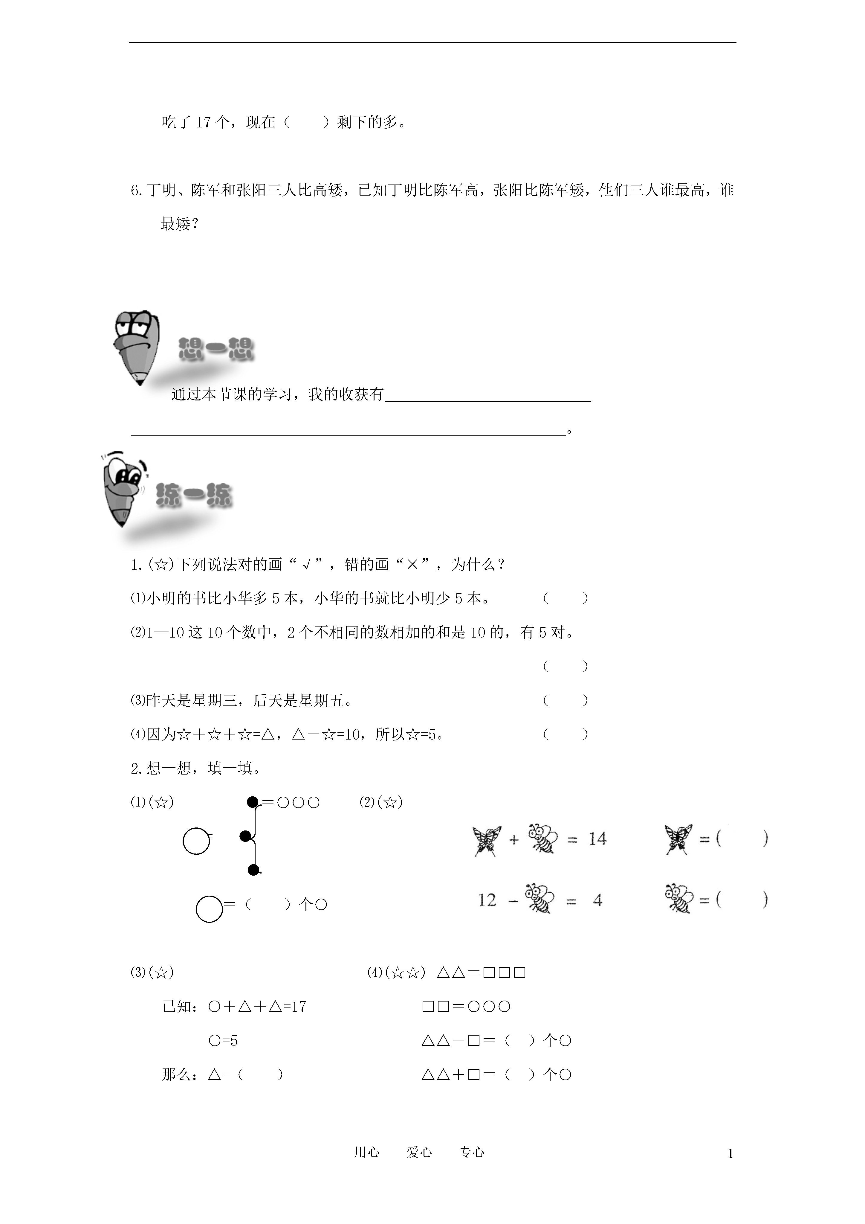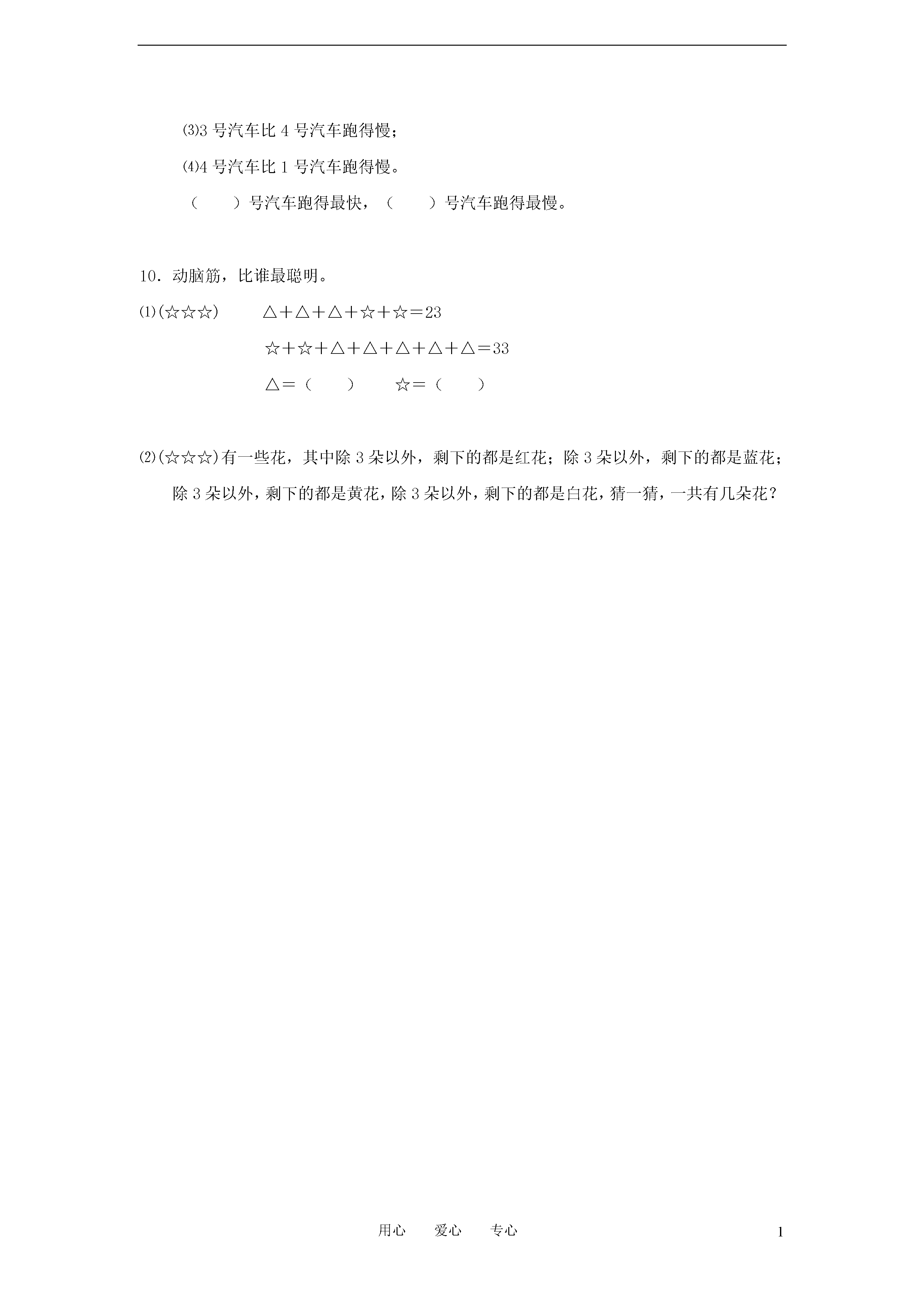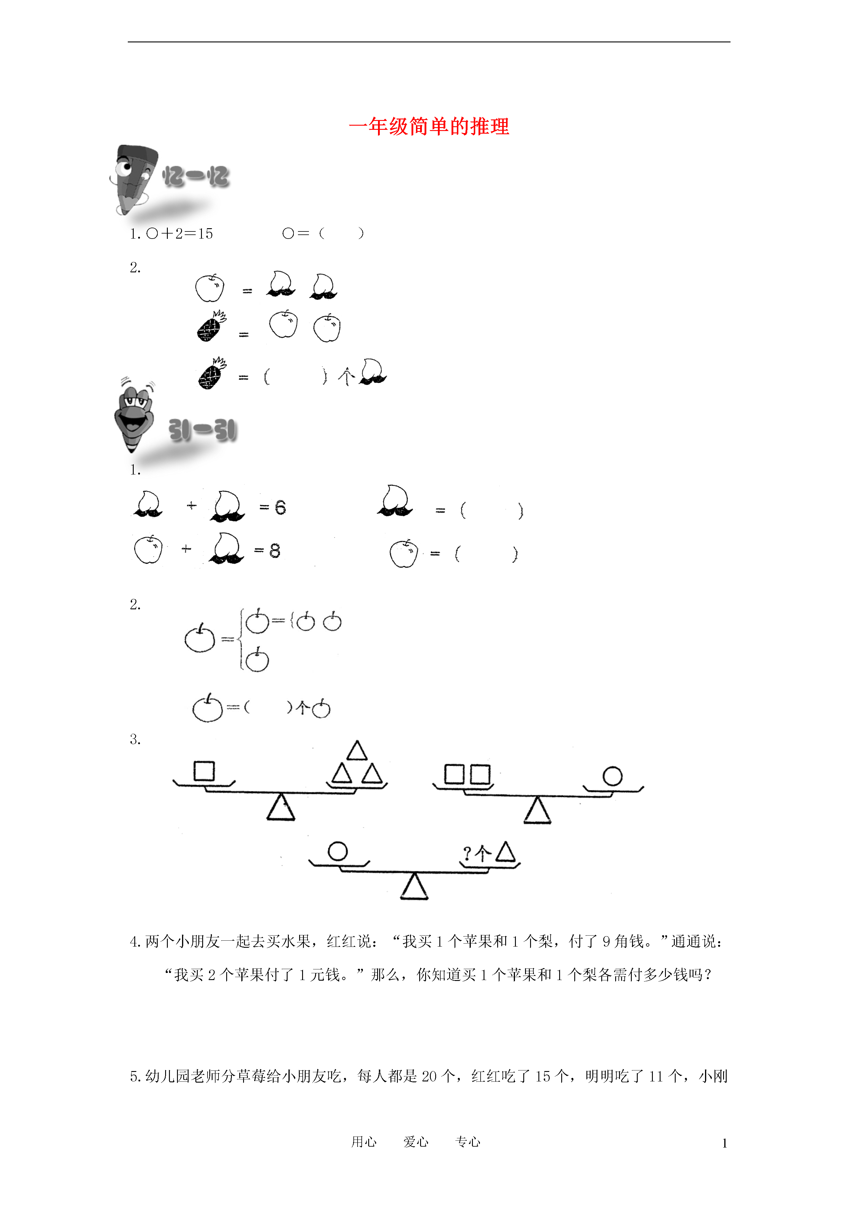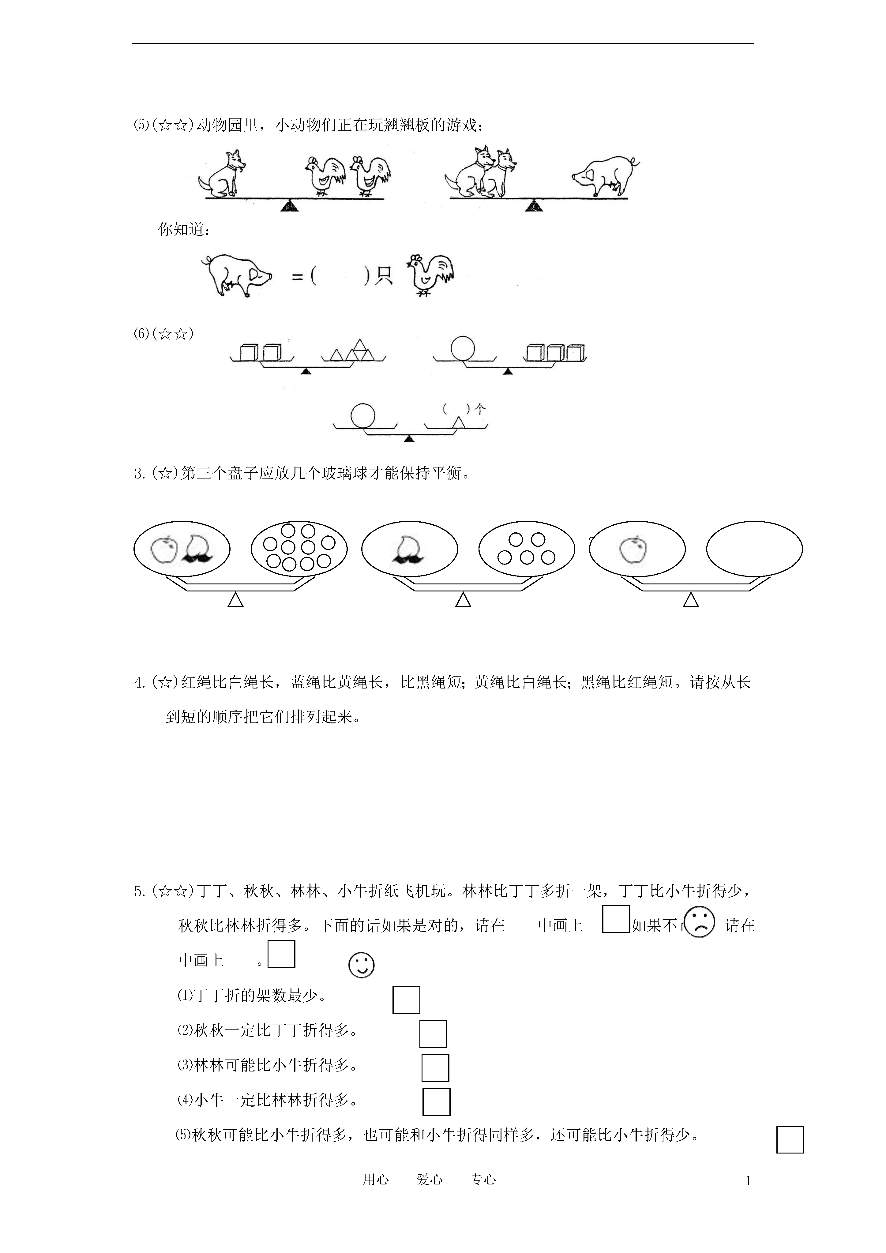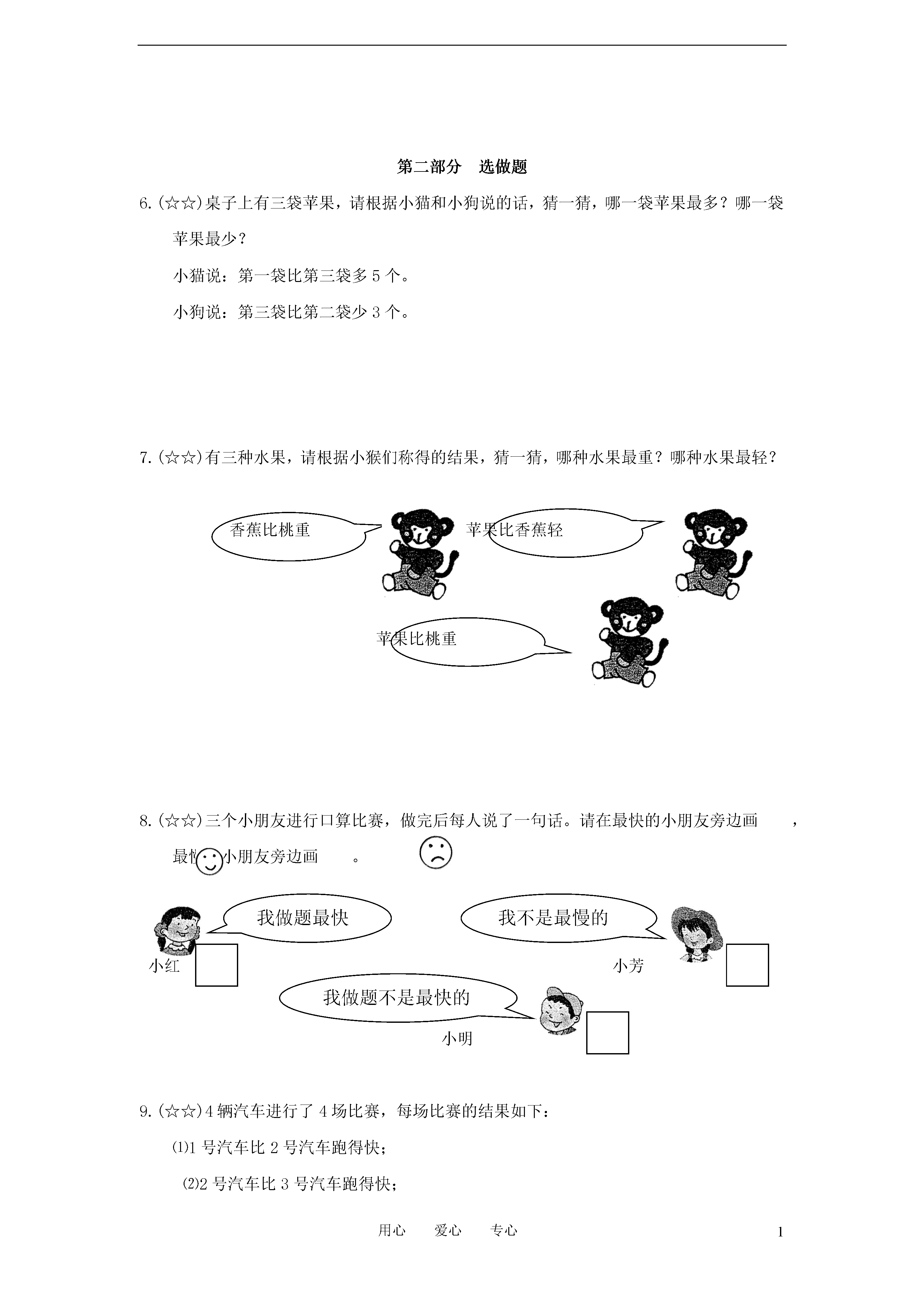 1用心爱心专心一年级简单的推理1.○+2=15○=()2.==()个1.+=8=()2.3.4.两个小朋友一起去买水果,红红说:“我买1个苹果和1个梨,付了9角钱。”通通说:“我买2个苹果付了1元钱。”那么,你知道买1个苹果和1个梨各需付多少钱吗?5.幼儿园老师分草莓给小朋友吃,每人都是20个,红红吃了15个,明明吃了11个,小刚吃了17个,现在()剩下的多。6.丁明、陈军和张阳三人比高矮,已知丁明比陈军高,张阳比陈军矮,他们三人谁最高,谁最矮?通过本节课的学习,我的收获有。1.(☆)下列说法对的画“√”,错的画“×”,为什么?⑴小明的书比小华多5本,小华的书就比小明少5本。()⑵1—10这10个数中,2个不相同的数相加的和是10的,有5对。()⑶昨天是星期三,后天是星期五。()⑷因为☆+☆+☆=△,△-☆=10,所以☆=5。()2.想一想,填一填。⑴(☆)●=○○○⑵(☆)=●●=()个○⑶(☆)⑷(☆☆)△△=□□□已知:○+△+△=17□□=○○○○=5△△-□=()个○那么:△=()△△+□=()个○⑸(☆☆)动物园里,小动物们正在玩翘翘板的游戏:你知道:⑹(☆☆)3.(☆)第三个盘子应放几个玻璃球才能保持平衡。?4.(☆)红绳比白绳长,蓝绳比黄绳长,比黑绳短;黄绳比白绳长;黑绳比红绳短。请按从长到短的顺序把它们排列起来。5.(☆☆)丁丁、秋秋、林林、小牛折纸飞机玩。林林比丁丁多折一架,丁丁比小牛折得少,秋秋比林林折得多。下面的话如果是对的,请在中画上,如果不正确,请在中画上。⑴丁丁折的架数最少。⑵秋秋一定比丁丁折得多。⑶林林可能比小牛折得多。⑷小牛一定比林林折得多。⑸秋秋可能比小牛折得多,也可能和小牛折得同样多,还可能比小牛折得少。第二部分选做题6.(☆☆)桌子上有三袋苹果,请根据小猫和小狗说的话,猜一猜,哪一袋苹果最多?哪一袋苹果最少?小猫说:第一袋比第三袋多5个。小狗说:第三袋比第二袋少3个。7.(☆☆)有三种水果,请根据小猴们称得的结果,猜一猜,哪种水果最重?哪种水果最轻?香蕉比桃重苹果比香蕉轻苹果比桃重8.(☆☆)三个小朋友进行口算比赛,做完后每人说了一句话。请在最快的小朋友旁边画,最慢的小朋友旁边画。我不是最慢的我做题最快我做题不是最快的小红小芳小明9.(☆☆)4辆汽车进行了4场比赛,每场比赛的结果如下:⑴1号汽车比2号汽车跑得快;⑵2号汽车比3号汽车跑得快;⑶3号汽车比4号汽车跑得慢;⑷4号汽车比1号汽车跑得慢。()号汽车跑得最快,()号汽车跑得最慢。10.动脑筋,比谁最聪明。⑴(☆☆☆)△+△+△+☆+☆=23☆+☆+△+△+△+△+△=33△=()☆=()⑵(☆☆☆)有一些花,其中除3朵以外,剩下的都是红花;除3朵以外,剩下的都是蓝花;除3朵以外,剩下的都是黄花,除3朵以外,剩下的都是白花,猜一猜,一共有几朵花?