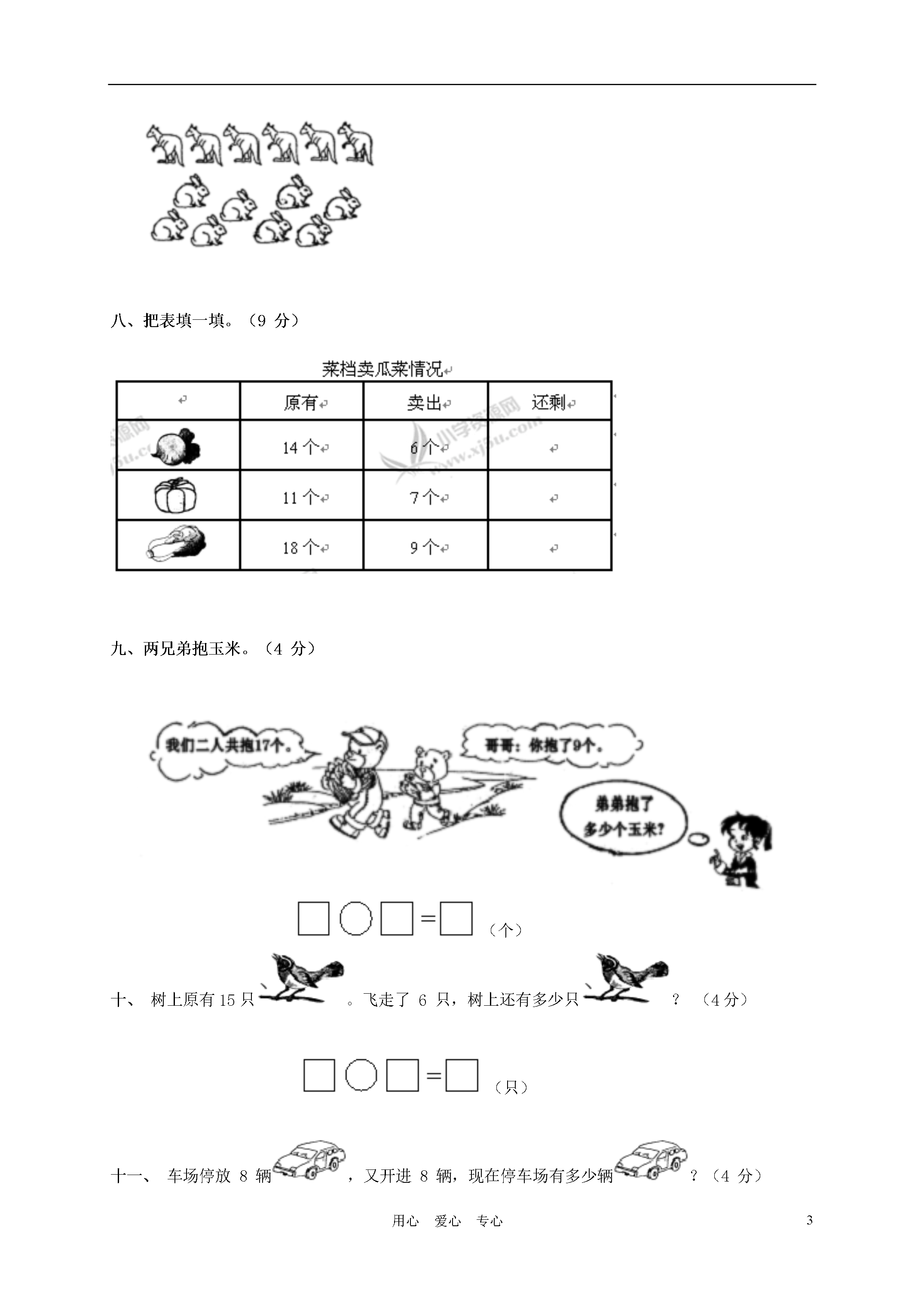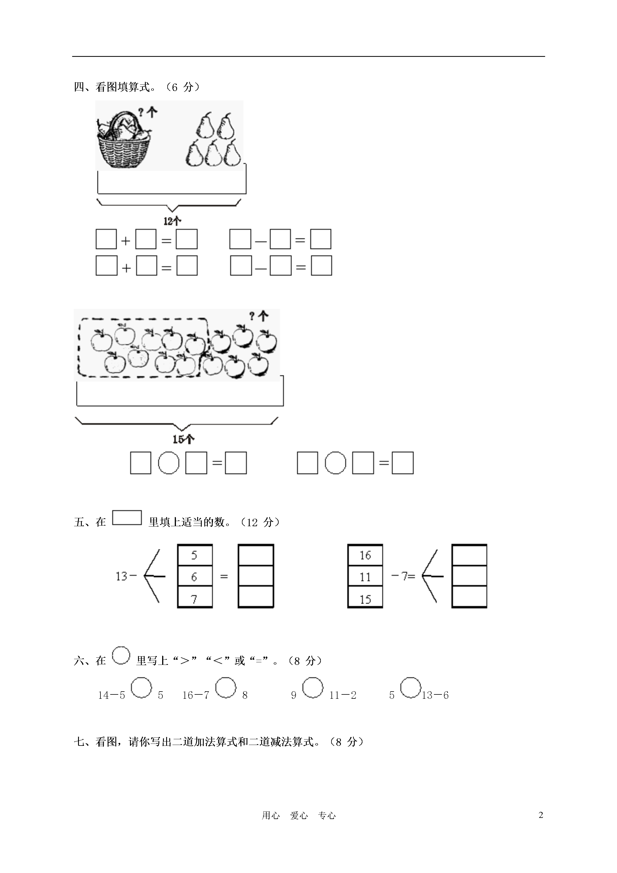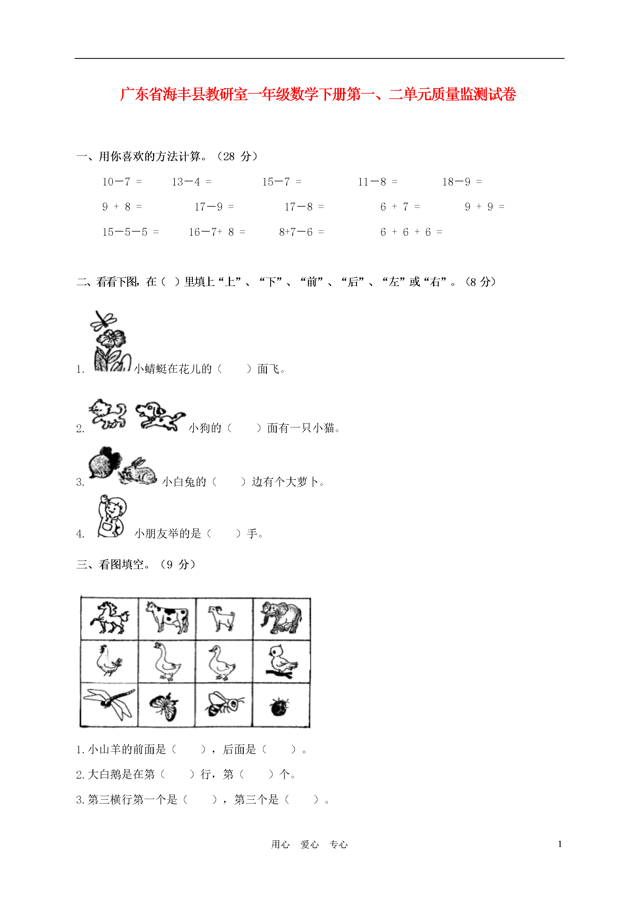 4用心爱心专心广东省海丰县教研室一年级数学下册第一、二单元质量监测试卷一、用你喜欢的方法计算。(28分)10-7=13-4=15-7=11-8=18-9=9+8=17-9=17-8=6+7=9+9=15-5-5=16-7+8=8+7-6=6+6+6=二、看看下图,在()里填上“上”、“下”、“前”、“后”、“左”或“右”。(8分)1.小蜻蜓在花儿的()面飞。2.小狗的()面有一只小猫。3.小白兔的()边有个大萝卜。4.小朋友举的是()手。三、看图填空。(9分)1.小山羊的前面是(),后面是()。2.大白鹅是在第()行,第()个。3.第三横行第一个是(),第三个是()。四、看图填算式。(6分)五、在里填上适当的数。(12分)六、在里写上“>”“<”或“=”。(8分)14-5516-78911-2513-6七、看图,请你写出二道加法算式和二道减法算式。(8分)八、把表填一填。(9分)九、两兄弟抱玉米。(4分)(个)十、树上原有15只。飞走了6只,树上还有多少只?(4分)(只)十一、车场停放8辆,又开进8辆,现在停车场有多少辆?(4分)(辆)