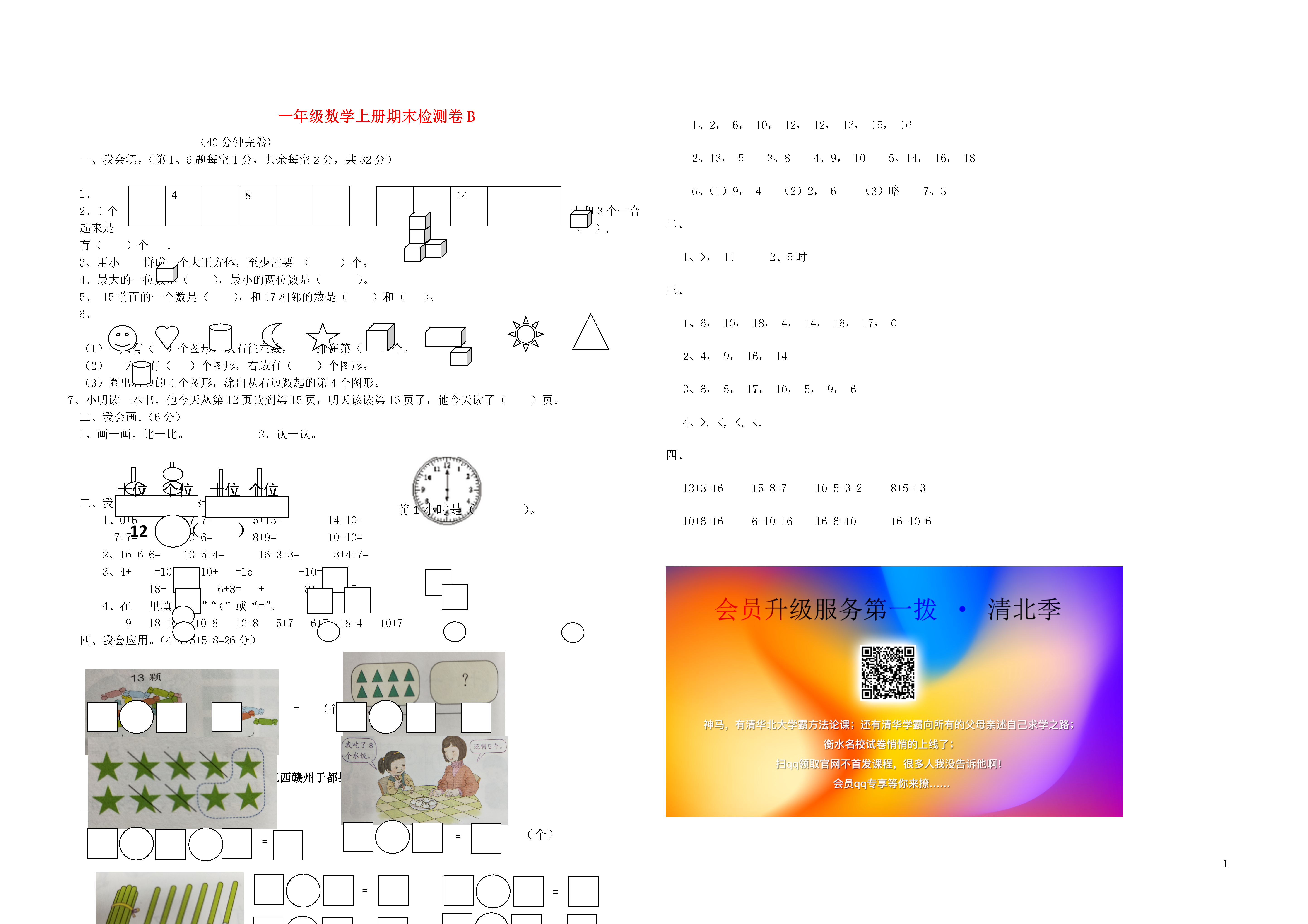 1一年级数学上册期末检测卷B(40分钟完卷)我会填。(第1、6题每空1分,其余每空2分,共32分)48141、1个十和3个一合起来是(),有()个。3、用小拼成一个大正方体,至少需要()个。4、最大的一位数是(),最小的两位数是()。5、15前面的一个数是(),和17相邻的数是()和()。6、一共有()个图形,从右往左数,排在第()个。左边有()个图形,右边有()个图形。圈出右边的4个图形,涂出从右边数起的第4个图形。小明读一本书,他今天从读到,明天该读了,他今天读了()页。我会画。(6分)画一画,比一比。2、认一认。12()前1小时是()。十位个位十位个位我会算。(8+8+12+8=36分)1、0+6=17-7=5+13=14-10=7+7=10+6=8+9=10-10=2、16-6-6=10-5+4=16-3+3=3+4+7=3、4+=1010+=15-10=7=86+8=+8+〈15在里填上“〉”“〈”或“=”。918-1010-810+85+76+718-410+7四、我会应用。(4+4+5+5+8=26分)=(颗)=(个)====(个)==江西赣州于都县一年级数学参考答案一、1、2,6,10,12,12,13,15,162、13,53、84、9,105、14,16,186、(1)9,4(2)2,6(3)略7、3二、1、>,112、5时三、1、6,10,18,4,14,16,17,02、4,9,16,143、6,5,17,10,5,9,64、>,<,<,<,四、13+3=1615-8=710-5-3=28+5=1310+6=166+10=1616-6=1016-10=6