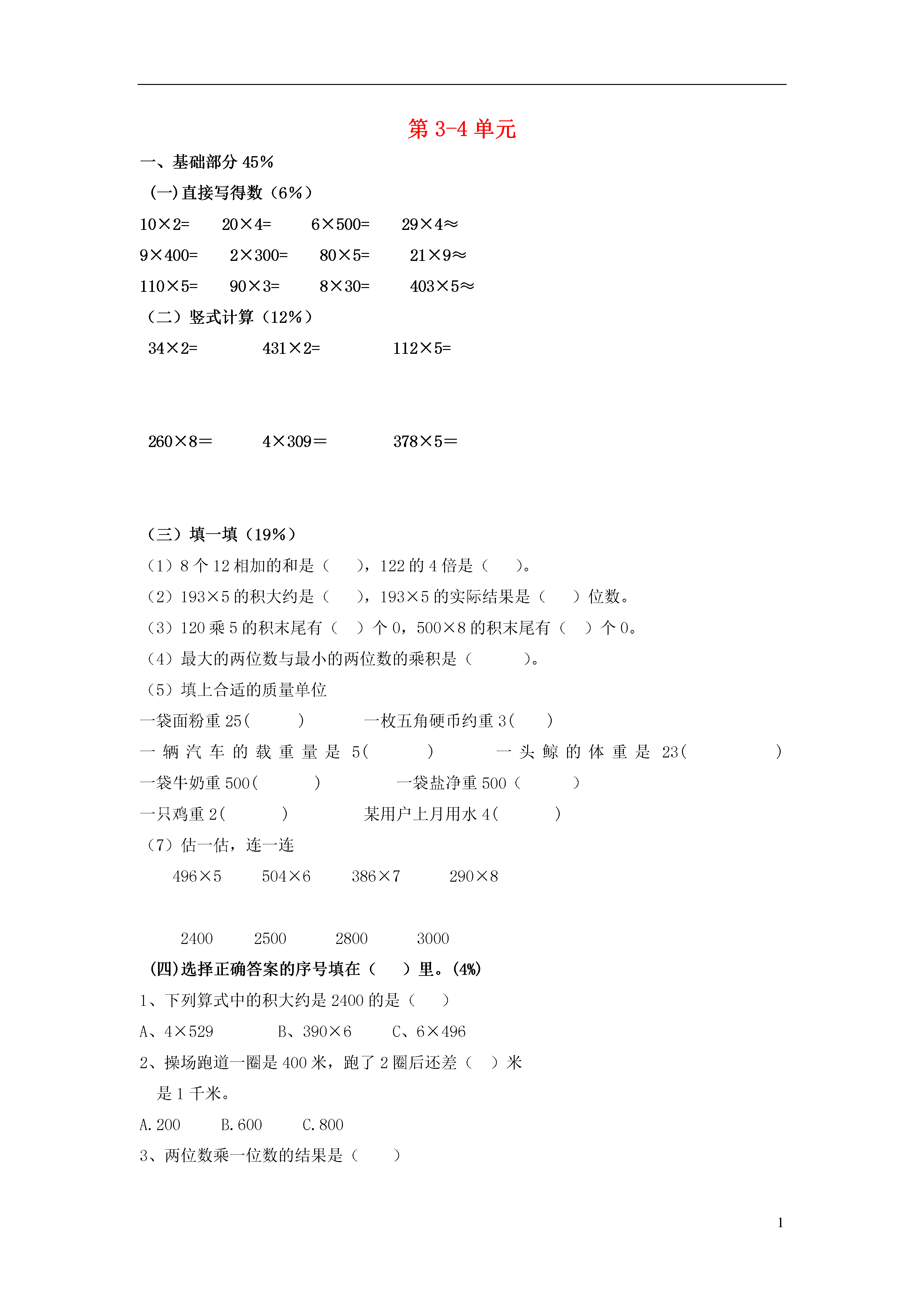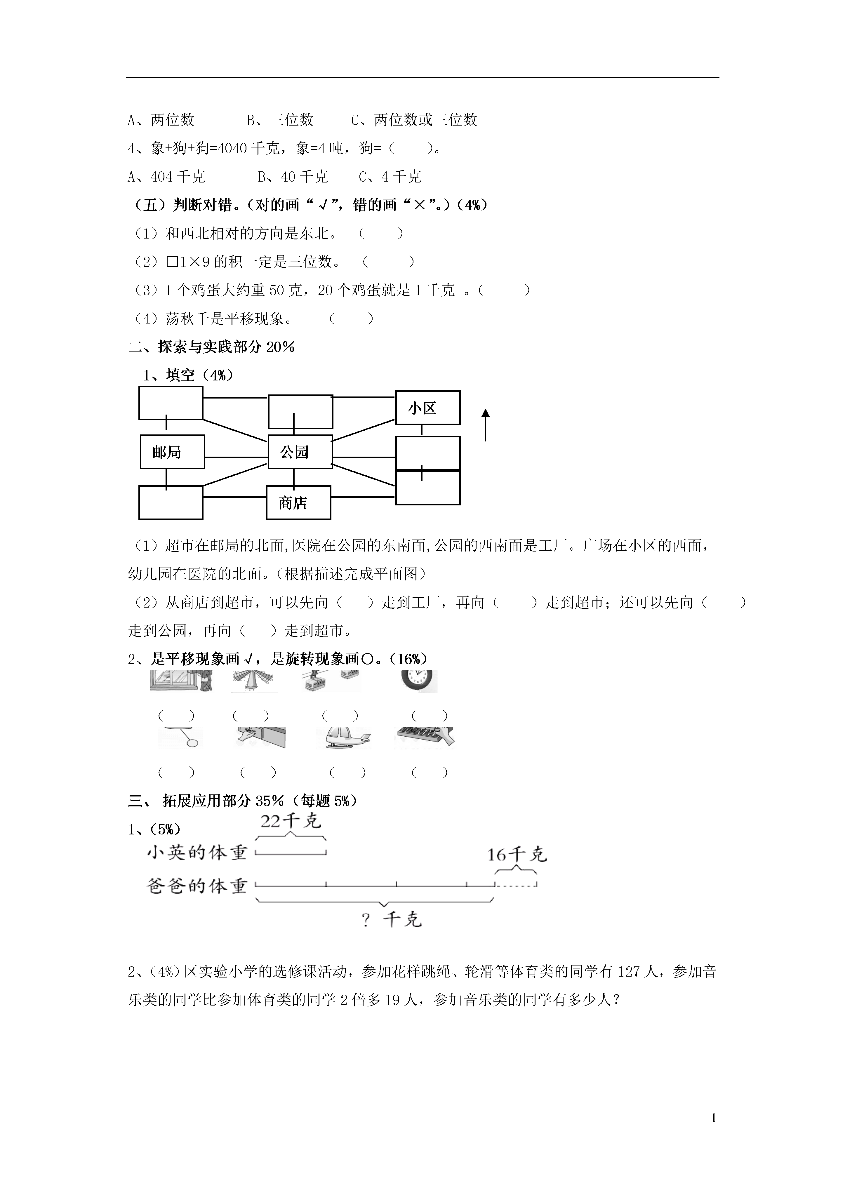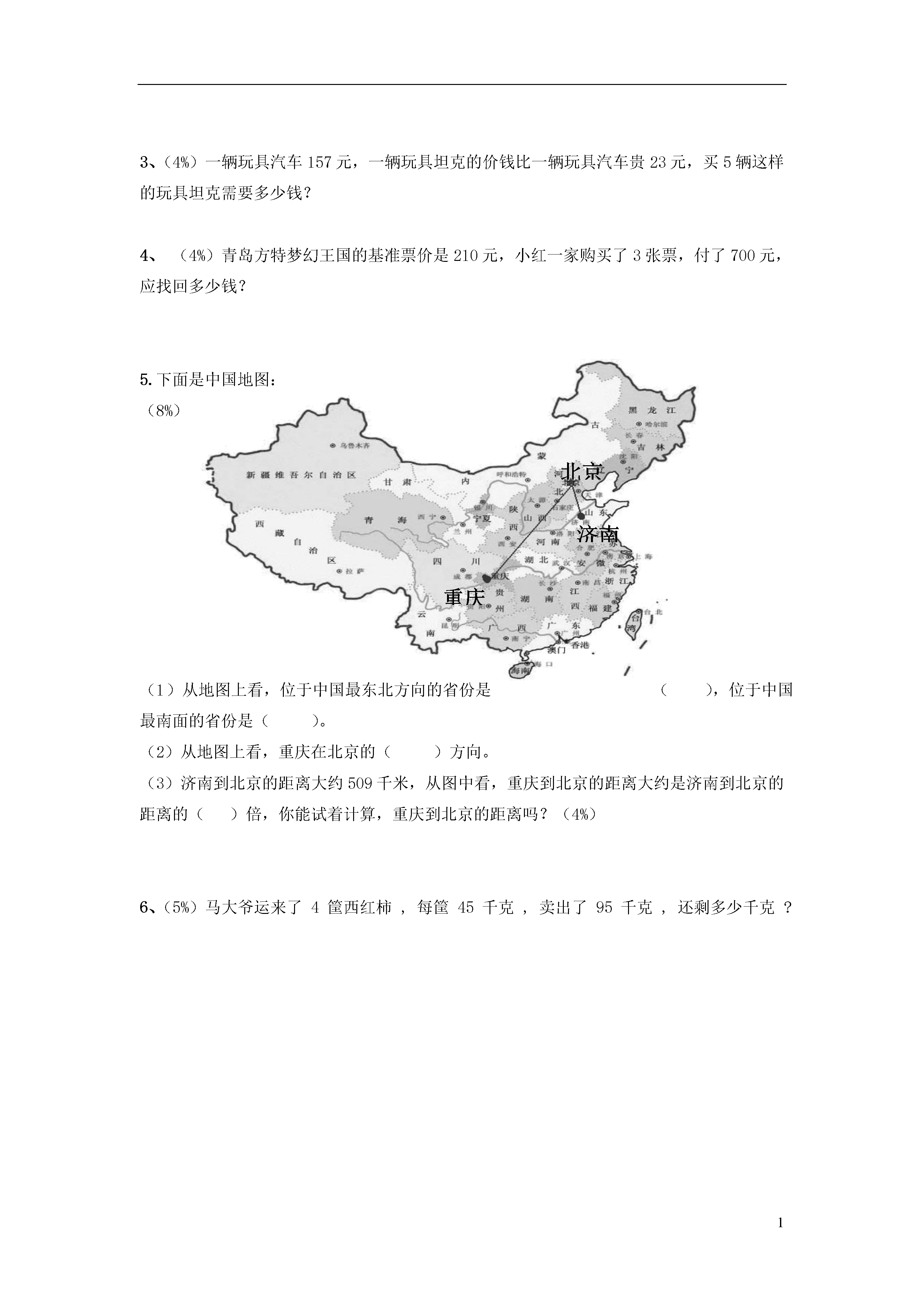 1第3-4单元一、基础部分45%(一)直接写得数(6%)10×2=20×4=6×500=29×4≈9×400=2×300=80×5=21×9≈110×5=90×3=8×30=403×5≈(二)竖式计算(12%)34×2=431×2=112×5=260×8=4×309=378×5=(三)填一填(19%)(1)8个12相加的和是(),122的4倍是()。(2)193×5的积大约是(),193×5的实际结果是()位数。(3)120乘5的积末尾有()个0,500×8的积末尾有()个0。(4)最大的两位数与最小的两位数的乘积是()。(5)填上合适的质量单位一袋面粉重25()一枚五角硬币约重3()一辆汽车的载重量是5()一头鲸的体重是23()一袋牛奶重500()一袋盐净重500()一只鸡重2()某用户上月用水4()(7)估一估,连一连496×5504×6386×7290×82400250028003000(四)选择正确答案的序号填在()里。(4%)1、下列算式中的积大约是2400的是()A、4×529B、390×6C、6×4962、操场跑道一圈是400米,跑了2圈后还差()米是1千米。A.200B.600C.8003、两位数乘一位数的结果是()A、两位数B、三位数C、两位数或三位数4、象+狗+狗=4040千克,象=4吨,狗=()。A、404千克B、40千克C、4千克(五)判断对错。(对的画“√”,错的画“×”。)(4%)(1)和西北相对的方向是东北。()(2)□1×9的积一定是三位数。()(3)1个鸡蛋大约重50克,20个鸡蛋就是1千克。()(4)荡秋千是平移现象。()二、探索与实践部分20%1、填空(4%)邮局公园小区商店北(1)超市在邮局的北面,医院在公园的东南面,公园的西南面是工厂。广场在小区的西面,幼儿园在医院的北面。(根据描述完成平面图)(2)从商店到超市,可以先向()走到工厂,再向()走到超市;还可以先向()走到公园,再向()走到超市。2、是平移现象画√,是旋转现象画○。(16%)()()()()()()()()拓展应用部分35%(每题5%)1、(5%)2、(4%)区实验小学的选修课活动,参加花样跳绳、轮滑等体育类的同学有127人,参加音乐类的同学比参加体育类的同学2倍多19人,参加音乐类的同学有多少人?3、(4%)一辆玩具汽车157元,一辆玩具坦克的价钱比一辆玩具汽车贵23元,买5辆这样的玩具坦克需要多少钱?4、(4%)青岛方特梦幻王国的基准票价是210元,小红一家购买了3张票,付了700元,应找回多少钱?重庆北京济南5.下面是中国地图:(8%)(1)从地图上看,位于中国最东北方向的省份是(),位于中国最南面的省份是()。(2)从地图上看,重庆在北京的()方向。(3)济南到北京的距离大约509千米,从图中看,重庆到北京的距离大约是济南到北京的距离的()倍,你能试着计算,重庆到北京的距离吗?(4%)6、(5%)马大爷运来了4筐西红柿,每筐45千克,卖出了95千克,还剩多少千克?