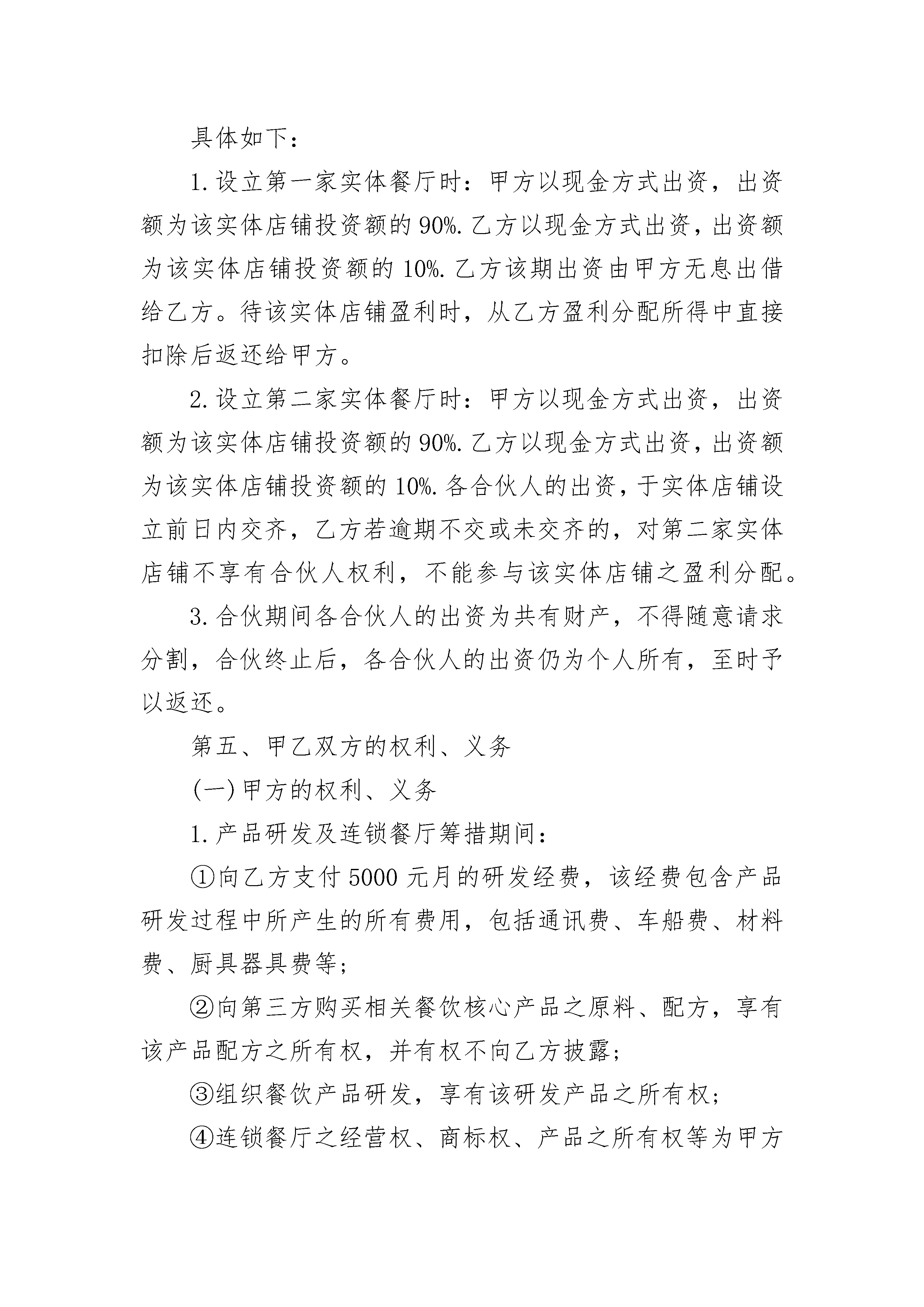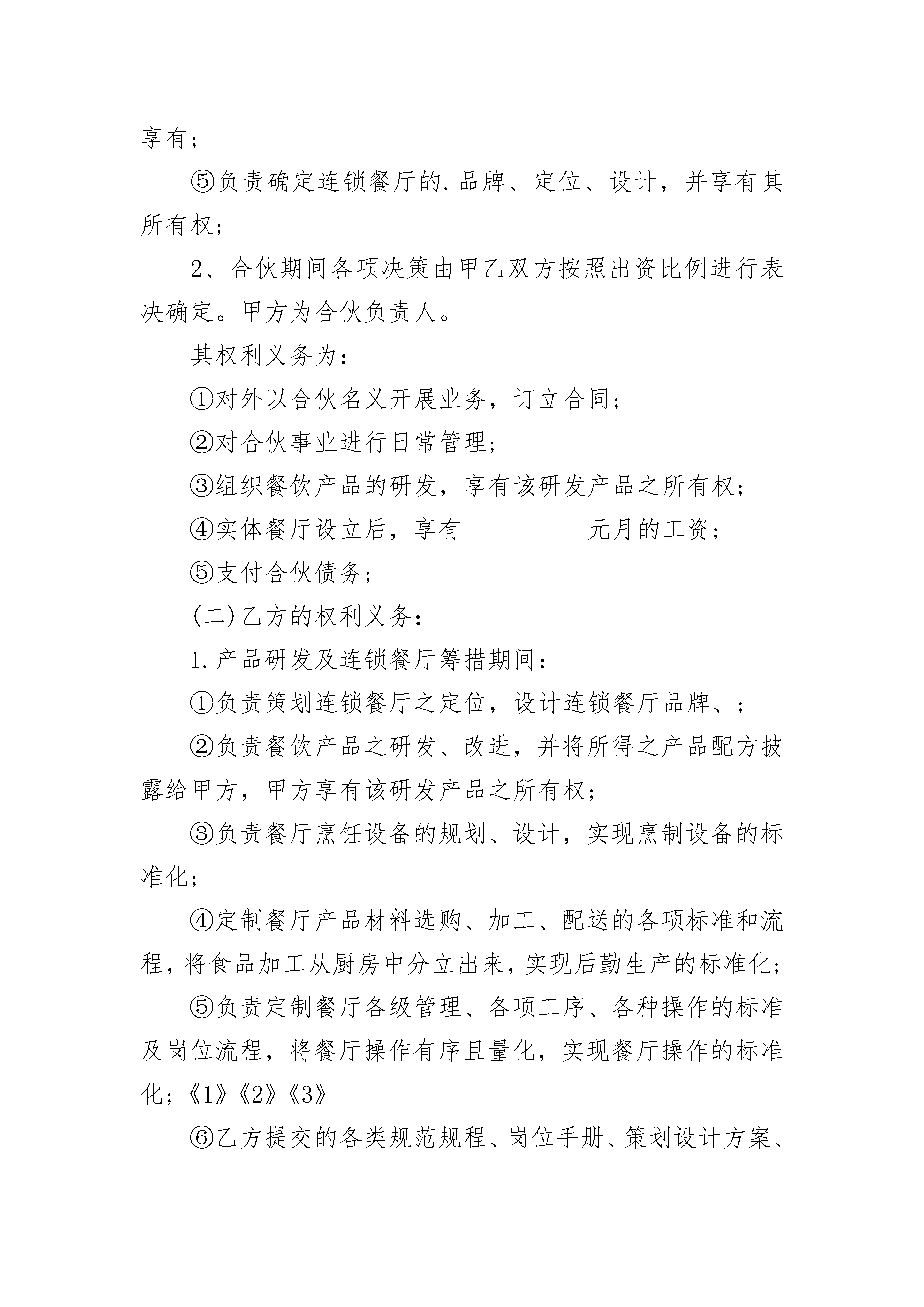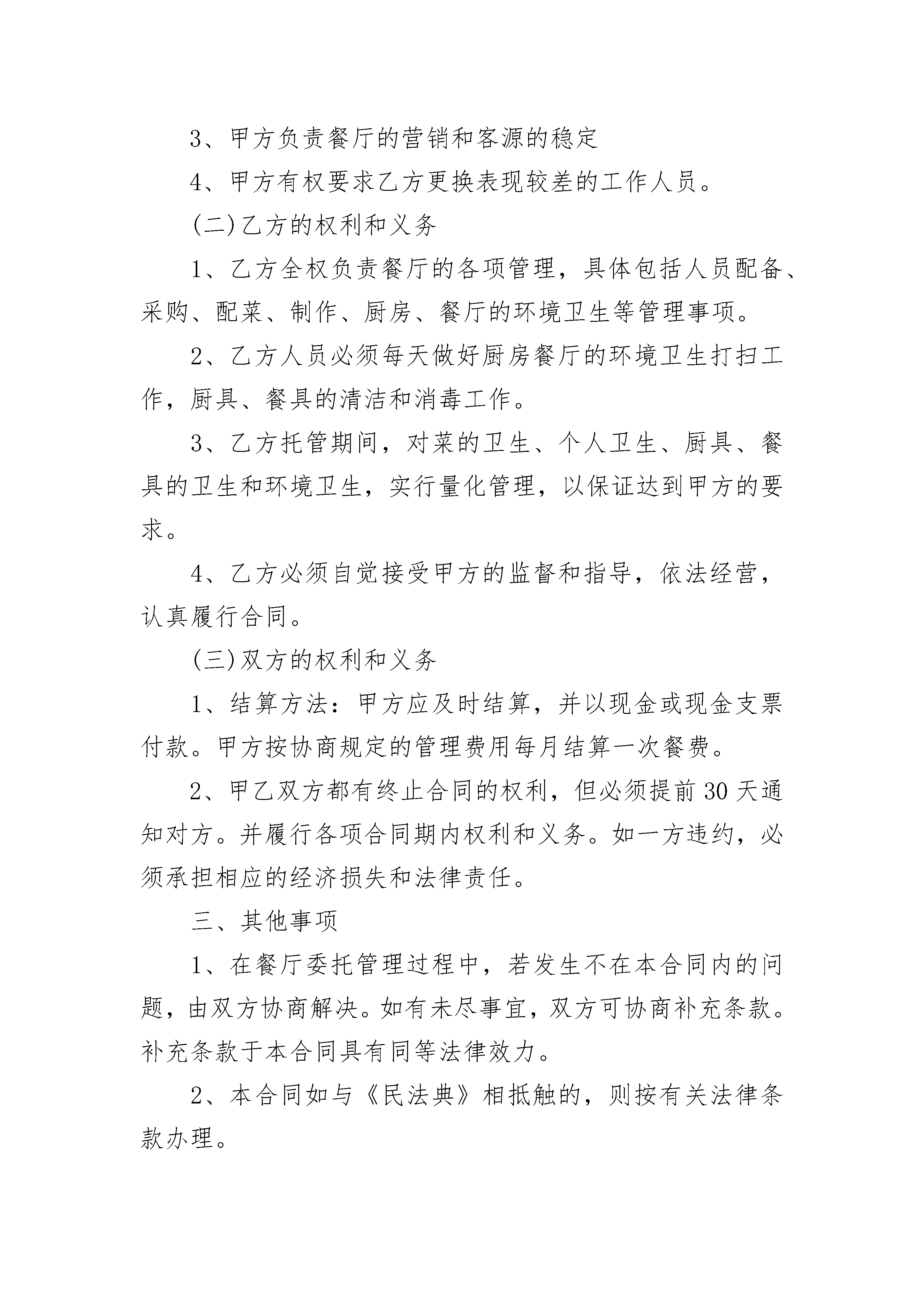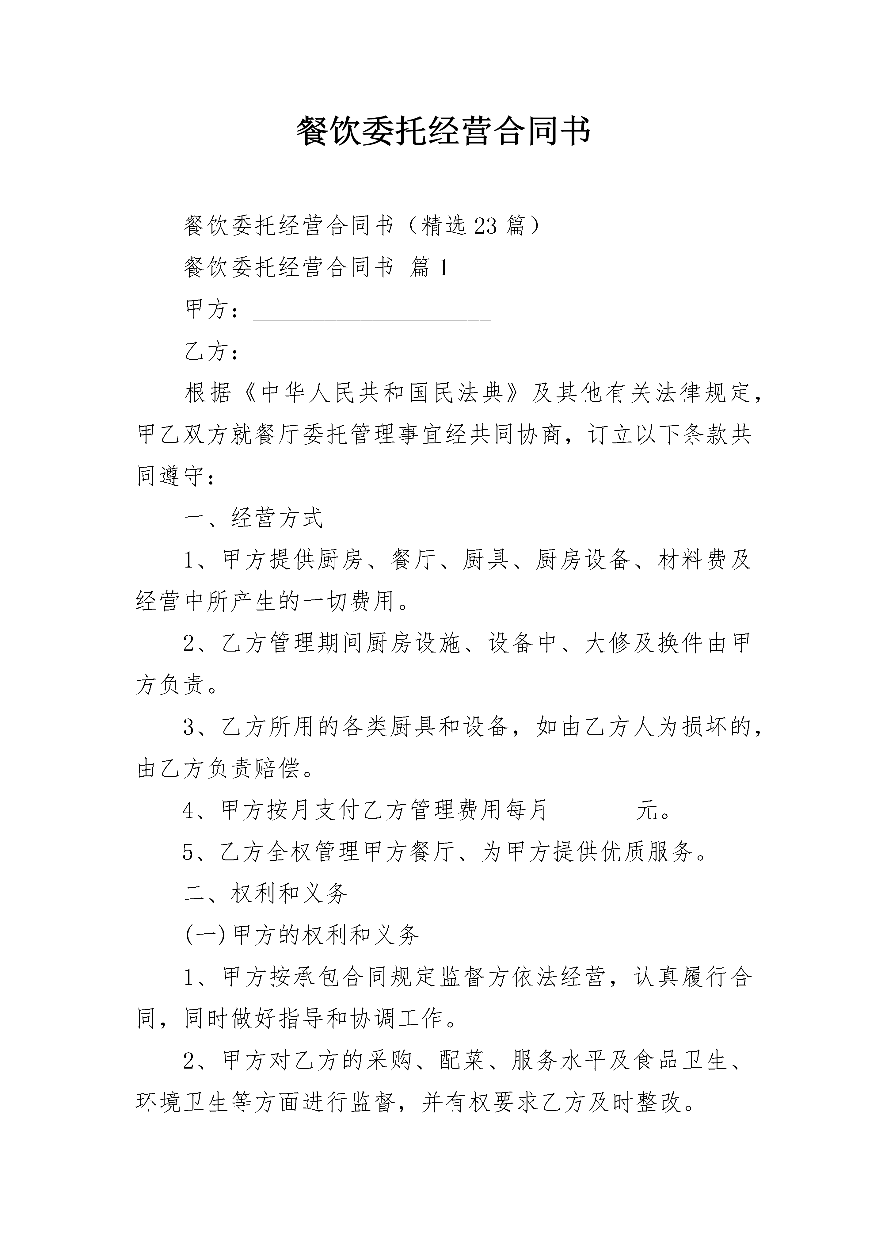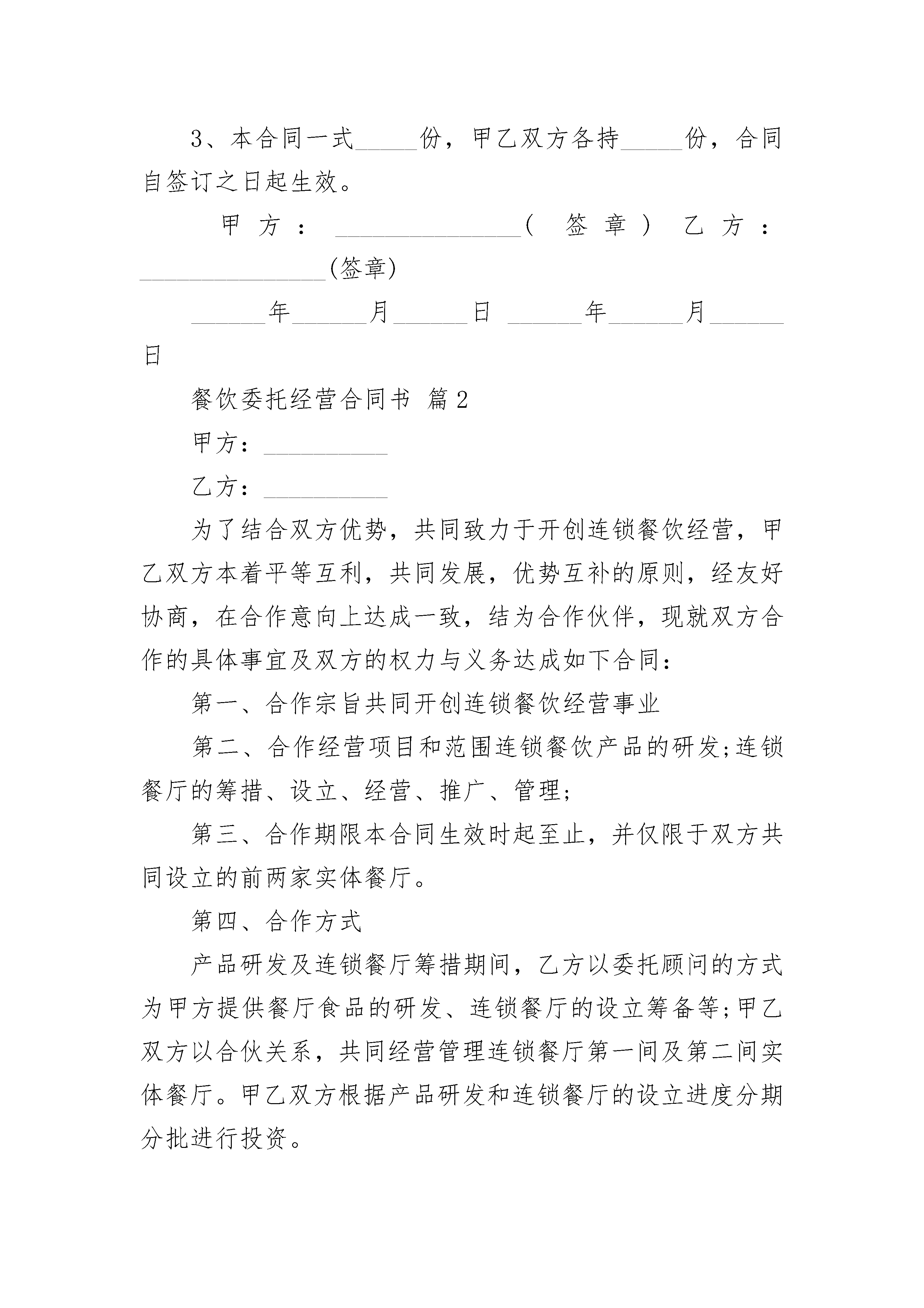 餐饮委托经营合同书餐饮委托经营合同书(精选23篇)餐饮委托经营合同书篇1甲方:____________________乙方:____________________根据《中华人民共和国民法典》及其他有关法律规定,甲乙双方就餐厅委托管理事宜经共同协商,订立以下条款共同遵守:一、经营方式1、甲方提供厨房、餐厅、厨具、厨房设备、材料费及经营中所产生的一切费用。2、乙方管理期间厨房设施、设备中、大修及换件由甲方负责。3、乙方所用的各类厨具和设备,如由乙方人为损坏的,由乙方负责赔偿。4、甲方按月支付乙方管理费用每月_______元。5、乙方全权管理甲方餐厅、为甲方提供优质服务。二、权利和义务(一)甲方的权利和义务1、甲方按承包合同规定监督方依法经营,认真履行合同,同时做好指导和协调工作。2、甲方对乙方的采购、配菜、服务水平及食品卫生、环境卫生等方面进行监督,并有权要求乙方及时整改。3、甲方负责餐厅的营销和客源的稳定4、甲方有权要求乙方更换表现较差的工作人员。(二)乙方的权利和义务1、乙方全权负责餐厅的各项管理,具体包括人员配备、采购、配菜、制作、厨房、餐厅的环境卫生等管理事项。2、乙方人员必须每天做好厨房餐厅的环境卫生打扫工作,厨具、餐具的清洁和消毒工作。3、乙方托管期间,对菜的卫生、个人卫生、厨具、餐具的卫生和环境卫生,实行量化管理,以保证达到甲方的要求。4、乙方必须自觉接受甲方的监督和指导,依法经营,认真履行合同。(三)双方的权利和义务1、结算方法:甲方应及时结算,并以现金或现金支票付款。甲方按协商规定的管理费用每月结算一次餐费。2、甲乙双方都有终止合同的权利,但必须提前30天通知对方。并履行各项合同期内权利和义务。如一方违约,必须承担相应的经济损失和法律责任。三、其他事项1、在餐厅委托管理过程中,若发生不在本合同内的问题,由双方协商解决。如有未尽事宜,双方可协商补充条款。补充条款于本合同具有同等法律效力。2、本合同如与《民法典》相抵触的,则按有关法律条款办理。3、本合同一式_____份,甲乙双方各持_____份,合同自签订之日起生效。甲方:_______________(签章)乙方:_______________(签章)______年______月______日______年______月______日餐饮委托经营合同书篇2甲方:__________乙方:__________为了结合双方优势,共同致力于开创连锁餐饮经营,甲乙双方本着平等互利,共同发展,优势互补的原则,经友好协商,在合作意向上达成一致,结为合作伙伴,现就双方合作的具体事宜及双方的权力与义务达成如下合同:第一、合作宗旨共同开创连锁餐饮经营事业第二、合作经营项目和范围连锁餐饮产品的研发;连锁餐厅的筹措、设立、经营、推广、管理;第三、合作期限本合同生效时起至止,并仅限于双方共同设立的前两家实体餐厅。第四、合作方式产品研发及连锁餐厅筹措期间,乙方以委托顾问的方式为甲方提供餐厅食品的研发、连锁餐厅的设立筹备等;甲乙双方以合伙关系,共同经营管理连锁餐厅第一间及第二间实体餐厅。甲乙双方根据产品研发和连锁餐厅的设立进度分期分批进行投资。具体如下:1.设立第一家实体餐厅时:甲方以现金方式出资,出资额为该实体店铺投资额的90%.乙方以现金方式出资,出资额为该实体店铺投资额的10%.乙方该期出资由甲方无息出借给乙方。待该实体店铺盈利时,从乙方盈利分配所得中直接扣除后返还给甲方。2.设立第二家实体餐厅时:甲方以现金方式出资,出资额为该实体店铺投资额的90%.乙方以现金方式出资,出资额为该实体店铺投资额的10%.各合伙人的出资,于实体店铺设立前日内交齐,乙方若逾期不交或未交齐的,对第二家实体店铺不享有合伙人权利,不能参与该实体店铺之盈利分配。3.合伙期间各合伙人的出资为共有财产,不得随意请求分割,合伙终止后,各合伙人的出资仍为个人所有,至时予以返还。第五、甲乙双方的权利、义务(一)甲方的权利、义务1.产品研发及连锁餐厅筹措期间:①向乙方支付5000元月的研发经费,该经费包含产品研发过程中所产生的所有费用,包括通讯费、车船费、材料费、厨具器具费等;②向第三方购买相关餐饮核心产品之原料、配方,享有该产品配方之所有权,并有权不向乙方披露;③组织餐饮产品研发,享有该研发产品之所有权;④连锁餐厅之经营权、商标权、产品之所有权等为甲方享有;⑤负责确定连锁餐厅的.品牌、定位、设计,并享有其所有权;2、合伙期间各项决策由甲乙双方按照出资比例进行表决确定。甲方为合伙负责人。其权利义务为:①对外以合伙名义开展业务,订立合同;②对合伙事业进行日常管理;③组织餐饮产品的研发,享有该研发产品之所有权;④实体餐厅设立后,享有__________元月的工资;⑤支付合伙债务;(二)乙方的权利义务:1.产品研发及连锁餐厅