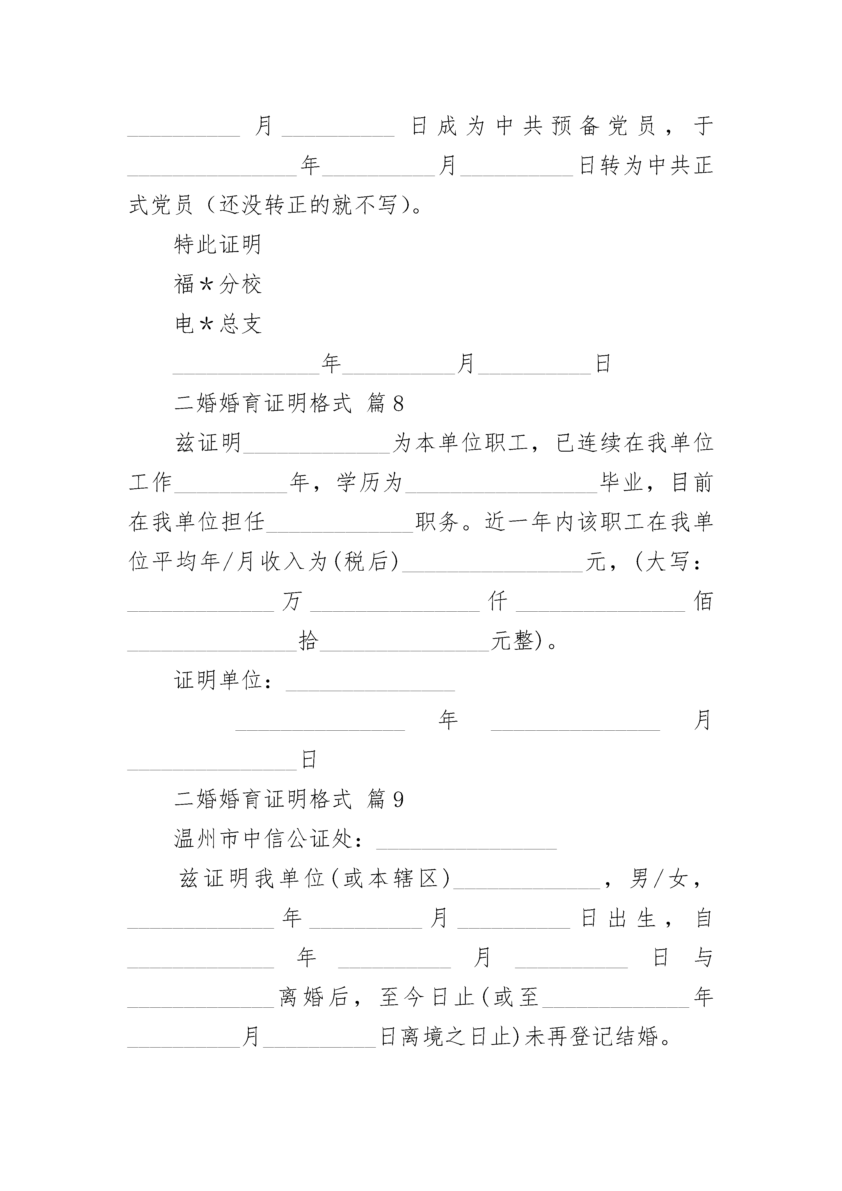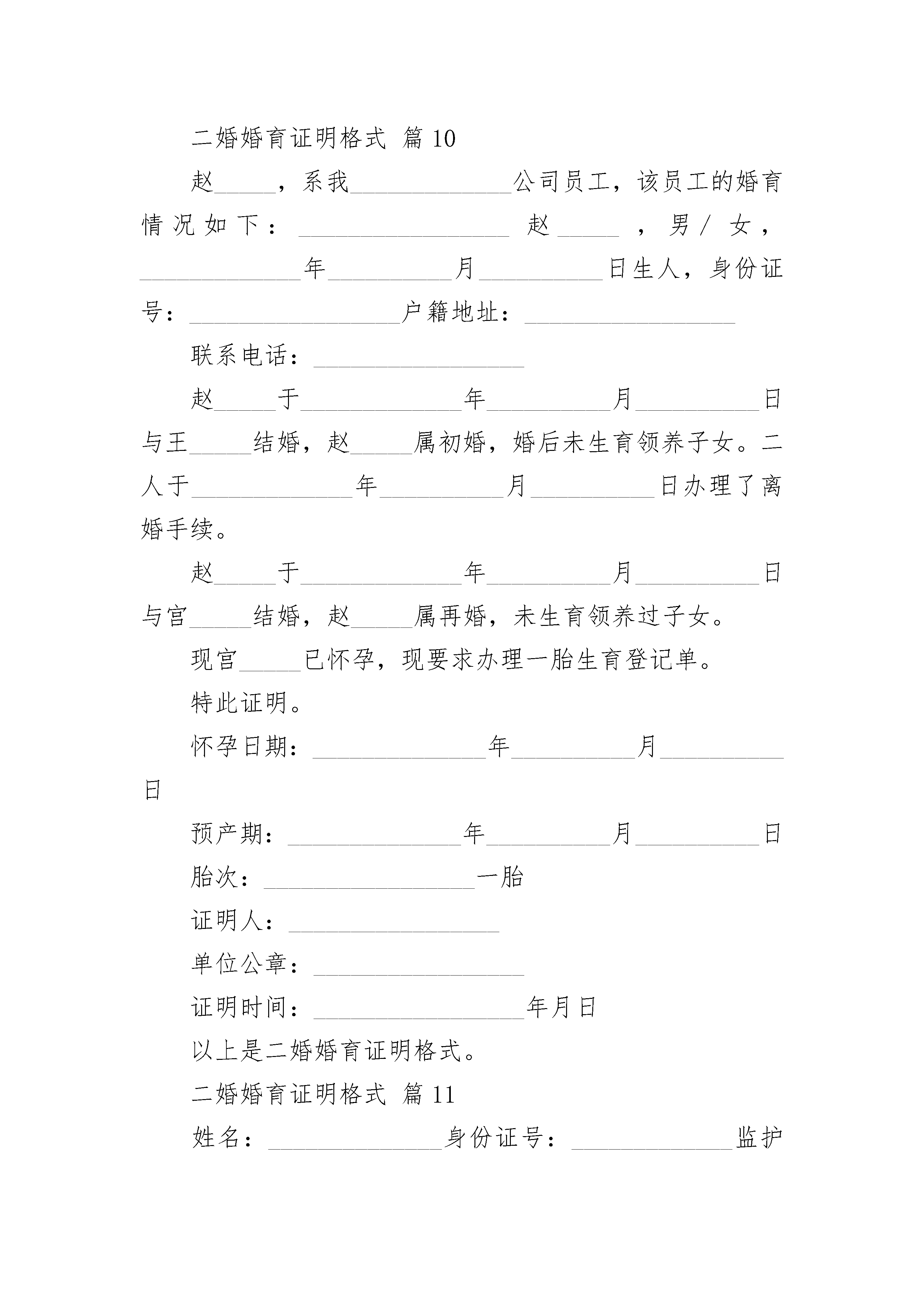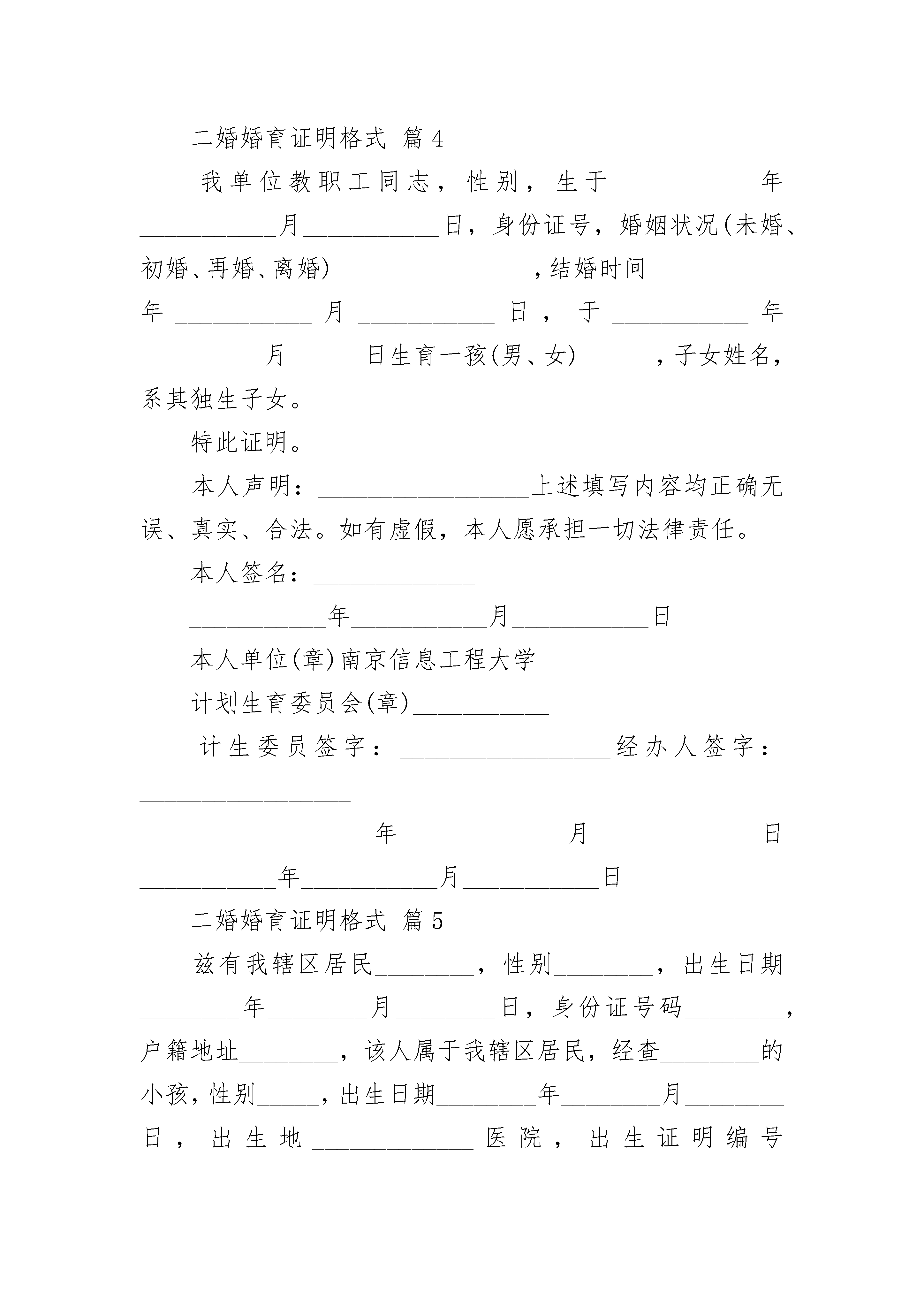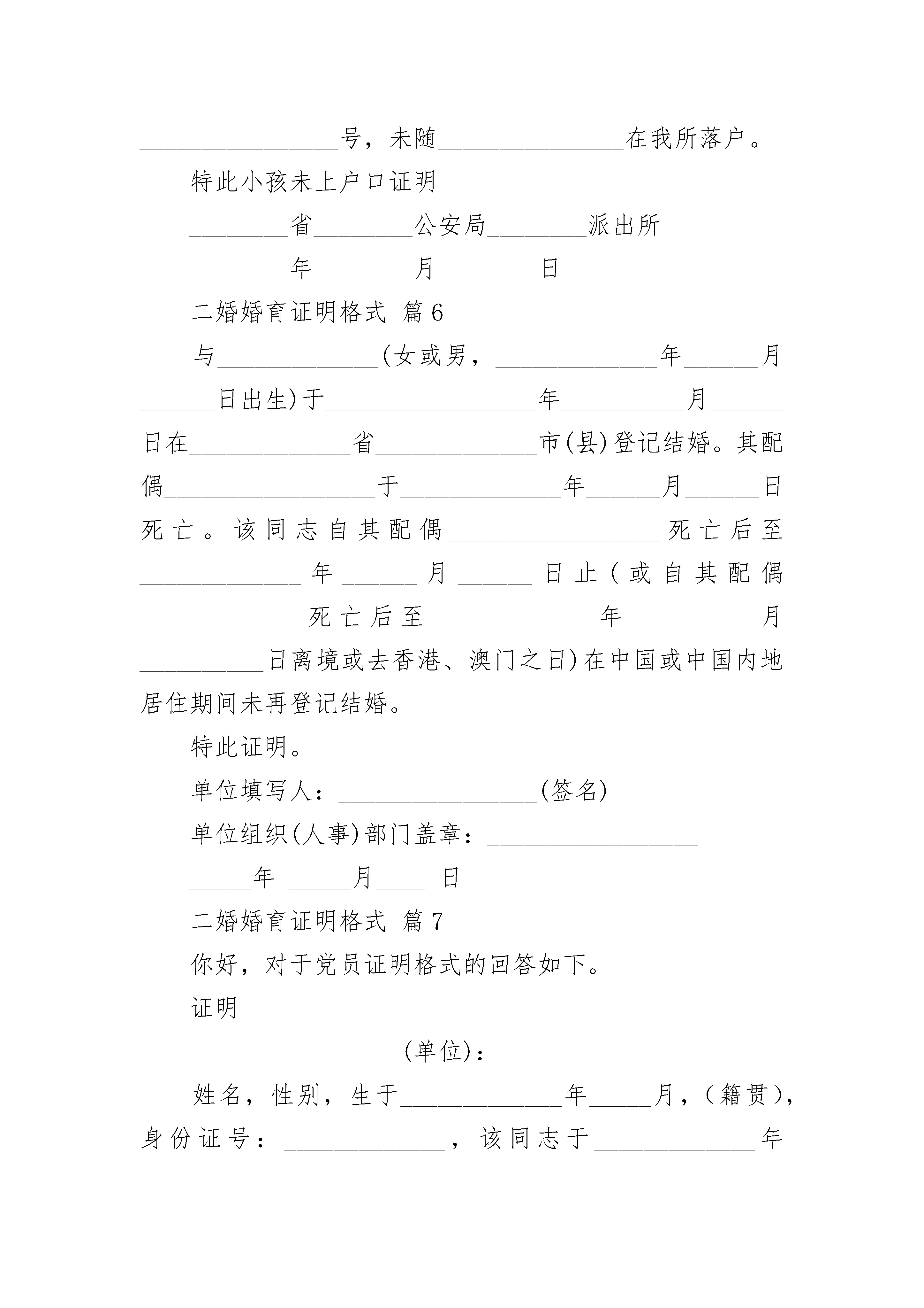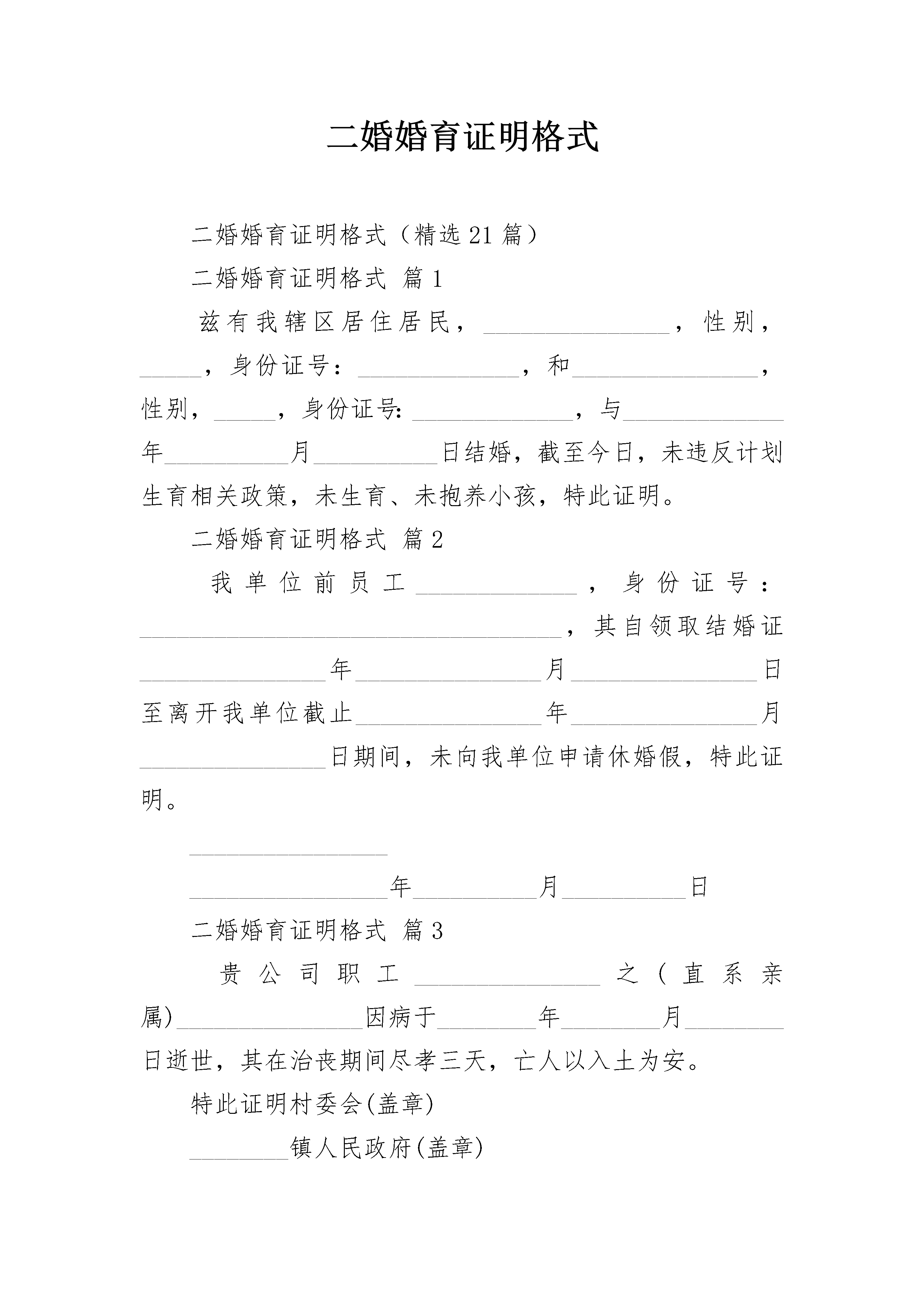 二婚婚育证明格式二婚婚育证明格式(精选21篇)二婚婚育证明格式篇1兹有我辖区居住居民,_______________,性别,_____,身份证号:_____________,和_______________,性别,_____,身份证号:_____________,与_____________年__________月__________日结婚,截至今日,未违反计划生育相关政策,未生育、未抱养小孩,特此证明。二婚婚育证明格式篇2我单位前员工_____________,身份证号:__________________________________,其自领取结婚证_______________年_______________月_______________日至离开我单位截止_______________年_______________月_______________日期间,未向我单位申请休婚假,特此证明。________________________________年__________月__________日二婚婚育证明格式篇3贵公司职工_______________之(直系亲属)_______________因病于________年________月________日逝世,其在治丧期间尽孝三天,亡人以入土为安。特此证明村委会(盖章)________镇人民政府(盖章)二婚婚育证明格式篇4我单位教职工同志,性别,生于___________年___________月___________日,身份证号,婚姻状况(未婚、初婚、再婚、离婚)________________,结婚时间___________年___________月___________日,于___________年__________月______日生育一孩(男、女)______,子女姓名,系其独生子女。特此证明。本人声明:_________________上述填写内容均正确无误、真实、合法。如有虚假,本人愿承担一切法律责任。本人签名:________________________年___________月___________日本人单位(章)南京信息工程大学计划生育委员会(章)___________计生委员签字:_________________经办人签字:____________________________年___________月___________日___________年___________月___________日二婚婚育证明格式篇5兹有我辖区居民________,性别________,出生日期________年________月________日,身份证号码________,户籍地址________,该人属于我辖区居民,经查________的小孩,性别_____,出生日期________年________月________日,出生地_____________医院,出生证明编号________________号,未随_______________在我所落户。特此小孩未上户口证明________省________公安局________派出所________年________月________日二婚婚育证明格式篇6与_____________(女或男,_____________年______月______日出生)于_________________年__________月______日在_____________省_____________市(县)登记结婚。其配偶_________________于_____________年______月______日死亡。该同志自其配偶_________________死亡后至_____________年______月______日止(或自其配偶_____________死亡后至_____________年__________月__________日离境或去香港、澳门之日)在中国或中国内地居住期间未再登记结婚。特此证明。单位填写人:________________(签名)单位组织(人事)部门盖章:______________________年_____月____日二婚婚育证明格式篇7你好,对于党员证明格式的回答如下。证明_________________(单位):_________________姓名,性别,生于_____________年_____月,(籍贯),身份证号:_____________,该同志于_____________年__________月__________日成为中共预备党员,于_______________年__________月__________日转为中共正式党员(还没转正的就不写)。特此证