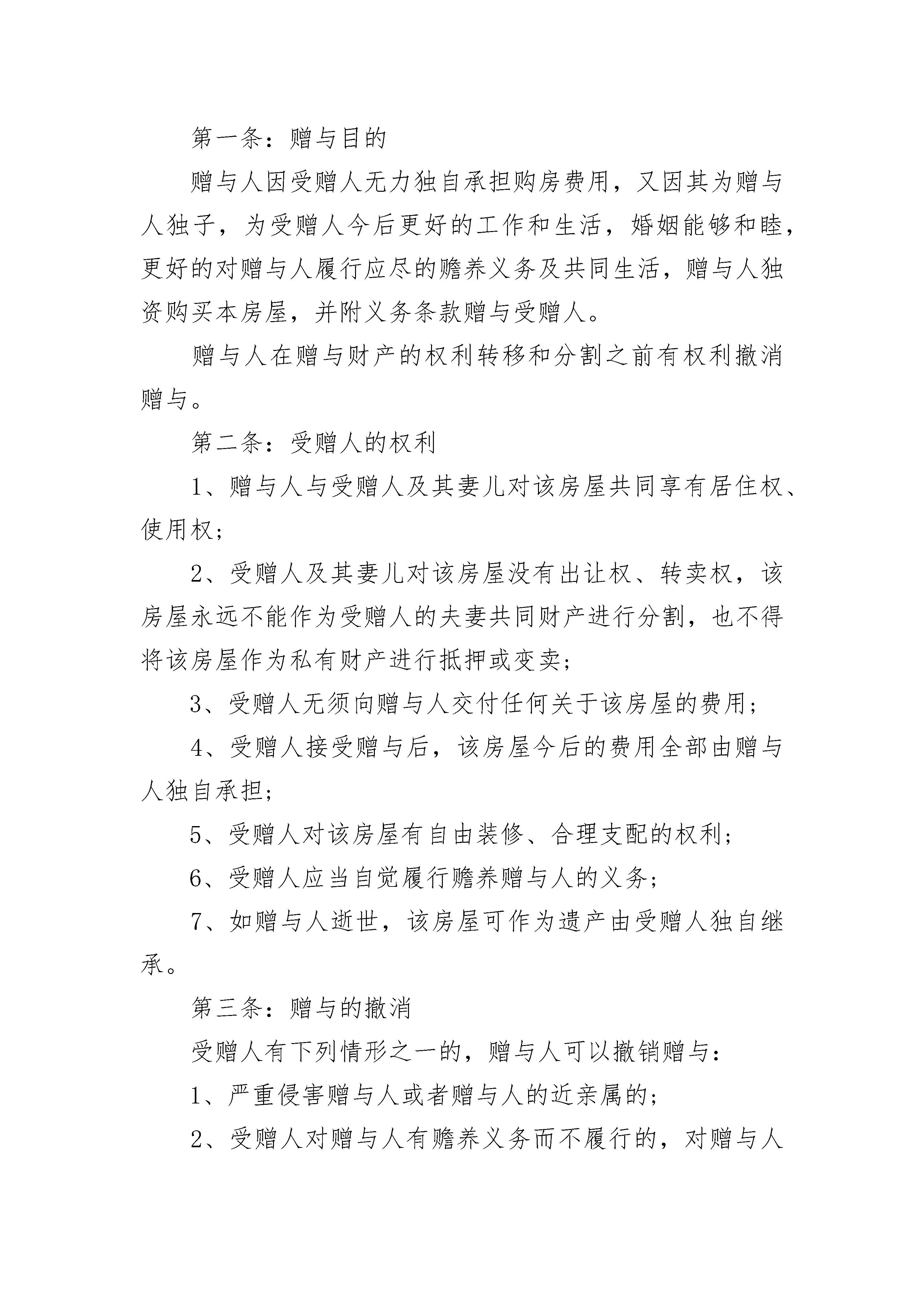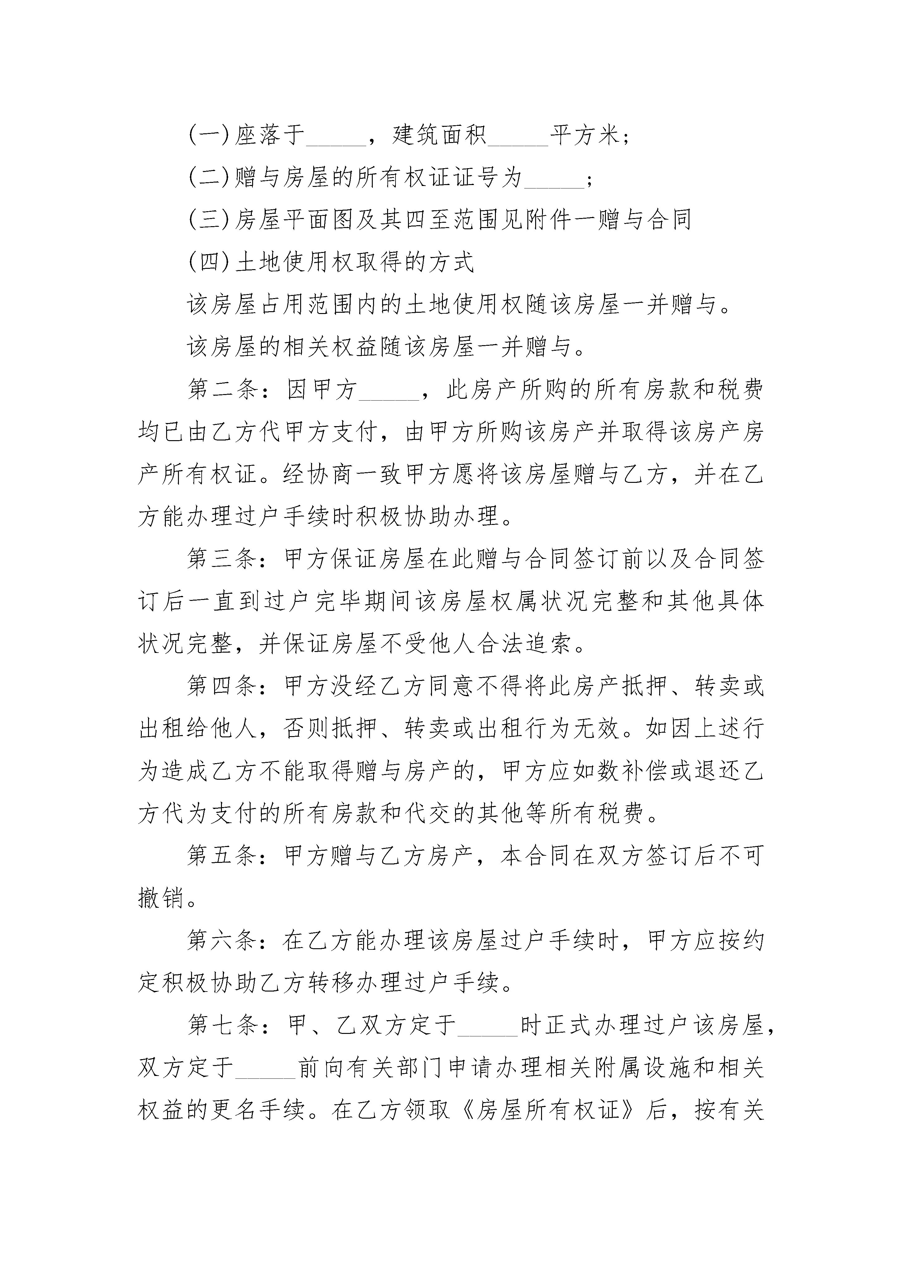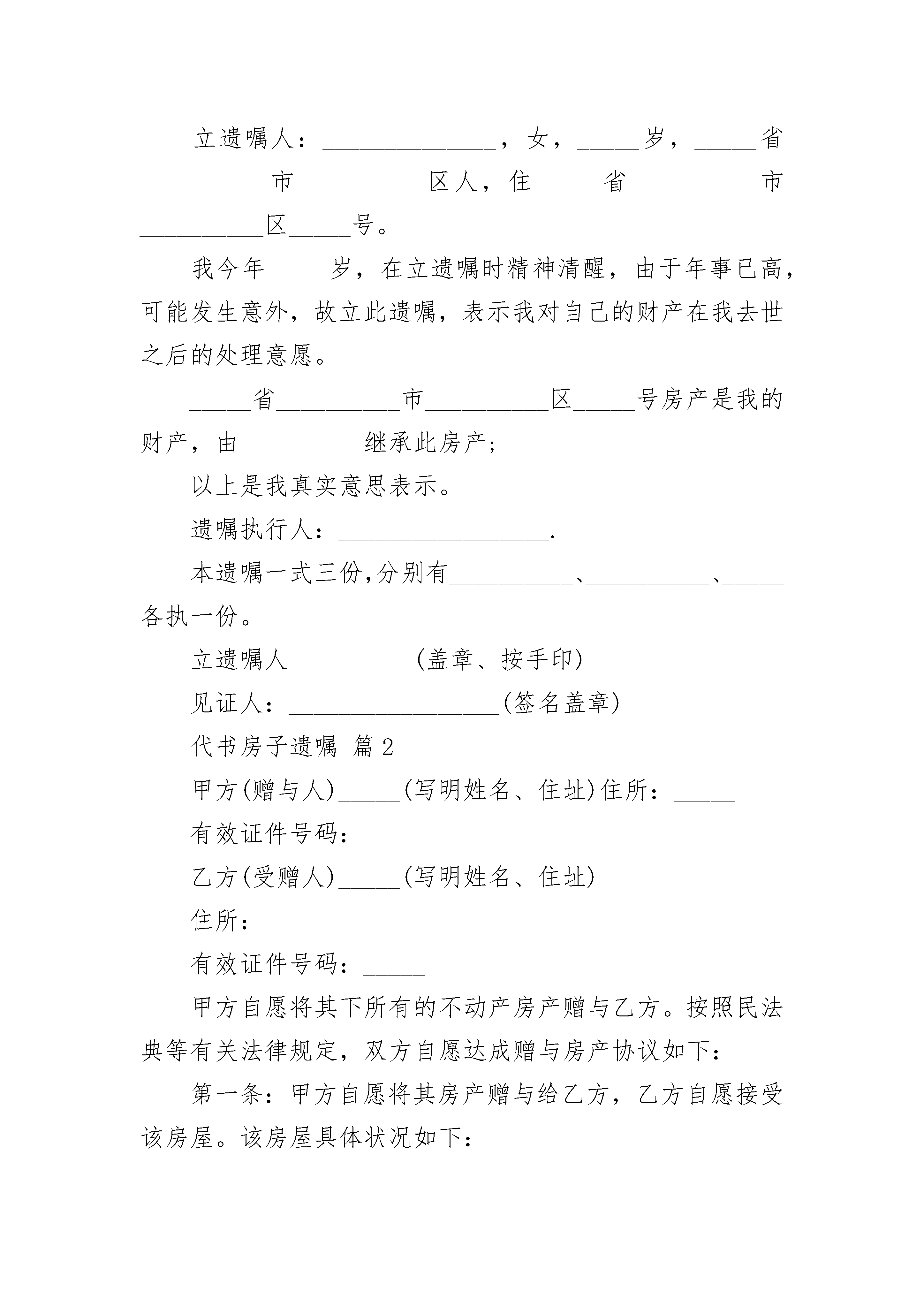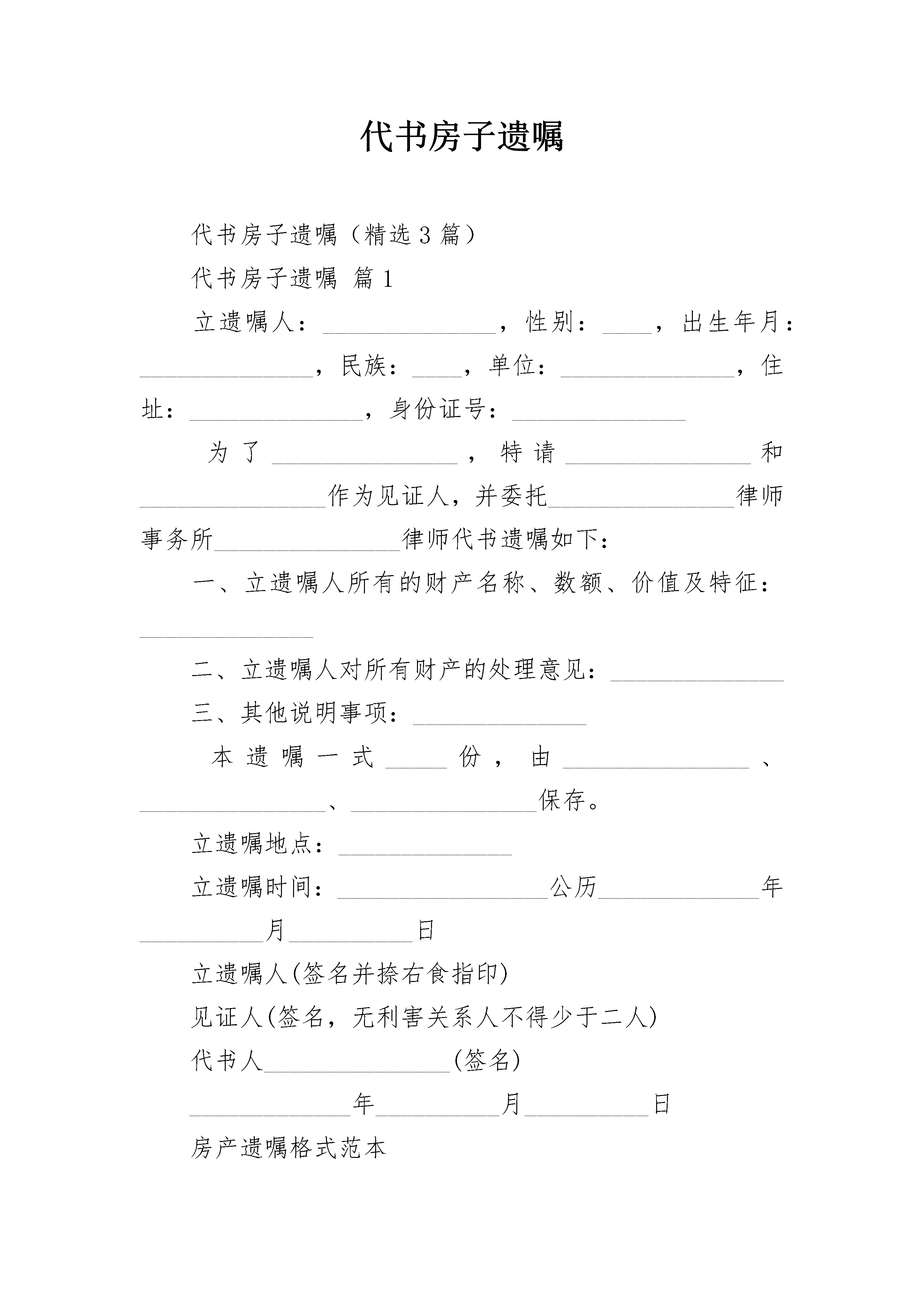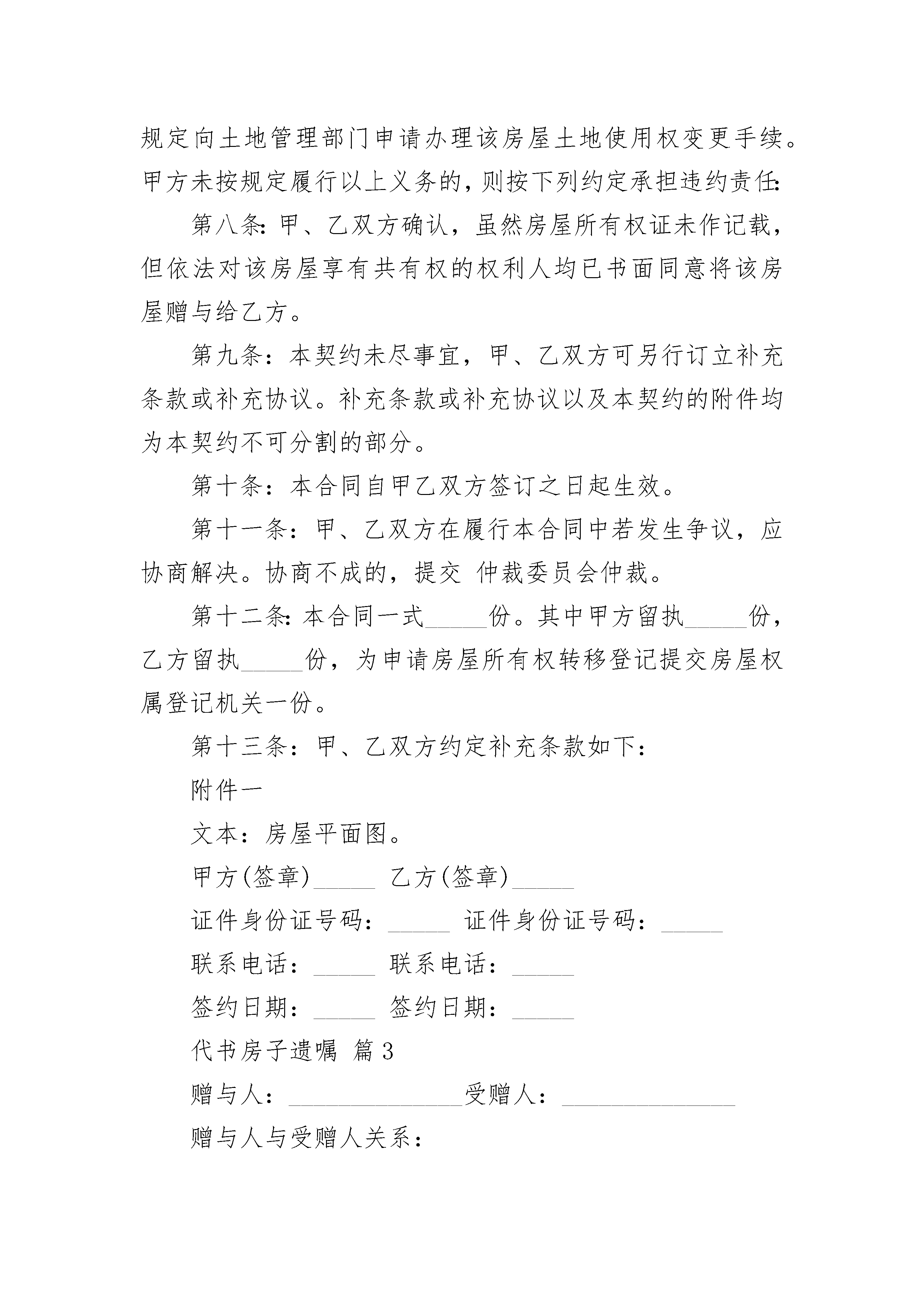 代书房子遗嘱代书房子遗嘱(精选3篇)代书房子遗嘱篇1立遗嘱人:______________,性别:____,出生年月:______________,民族:____,单位:______________,住址:______________,身份证号:______________为了_______________,特请_______________和_______________作为见证人,并委托_______________律师事务所_______________律师代书遗嘱如下:一、立遗嘱人所有的财产名称、数额、价值及特征:______________二、立遗嘱人对所有财产的处理意见:______________三、其他说明事项:______________本遗嘱一式_____份,由_______________、_______________、_______________保存。立遗嘱地点:______________立遗嘱时间:_________________公历_____________年__________月__________日立遗嘱人(签名并捺右食指印)见证人(签名,无利害关系人不得少于二人)代书人_______________(签名)_____________年__________月__________日房产遗嘱格式范本立遗嘱人:______________,女,_____岁,_____省__________市__________区人,住_____省__________市__________区_____号。我今年_____岁,在立遗嘱时精神清醒,由于年事已高,可能发生意外,故立此遗嘱,表示我对自己的财产在我去世之后的处理意愿。_____省__________市__________区_____号房产是我的财产,由__________继承此房产;以上是我真实意思表示。遗嘱执行人:_________________.本遗嘱一式三份,分别有__________、__________、_____各执一份。立遗嘱人__________(盖章、按手印)见证人:_________________(签名盖章)代书房子遗嘱篇2甲方(赠与人)_____(写明姓名、住址)住所:_____有效证件号码:_____乙方(受赠人)_____(写明姓名、住址)住所:_____有效证件号码:_____甲方自愿将其下所有的不动产房产赠与乙方。按照民法典等有关法律规定,双方自愿达成赠与房产协议如下:第一条:甲方自愿将其房产赠与给乙方,乙方自愿接受该房屋。该房屋具体状况如下:(一)座落于_____,建筑面积_____平方米;(二)赠与房屋的所有权证证号为_____;(三)房屋平面图及其四至范围见附件一赠与合同(四)土地使用权取得的方式该房屋占用范围内的土地使用权随该房屋一并赠与。该房屋的相关权益随该房屋一并赠与。第二条:因甲方_____,此房产所购的所有房款和税费均已由乙方代甲方支付,由甲方所购该房产并取得该房产房产所有权证。经协商一致甲方愿将该房屋赠与乙方,并在乙方能办理过户手续时积极协助办理。第三条:甲方保证房屋在此赠与合同签订前以及合同签订后一直到过户完毕期间该房屋权属状况完整和其他具体状况完整,并保证房屋不受他人合法追索。第四条:甲方没经乙方同意不得将此房产抵押、转卖或出租给他人,否则抵押、转卖或出租行为无效。如因上述行为造成乙方不能取得赠与房产的,甲方应如数补偿或退还乙方代为支付的所有房款和代交的其他等所有税费。第五条:甲方赠与乙方房产,本合同在双方签订后不可撤销。第六条:在乙方能办理该房屋过户手续时,甲方应按约定积极协助乙方转移办理过户手续。第七条:甲、乙双方定于_____时正式办理过户该房屋,双方定于_____前向有关部门申请办理相关附属设施和相关权益的更名手续。在乙方领取《房屋所有权证》后,按有关规定向土地管理部门申请办理该房屋土地使用权变更手续。甲方未按规定履行以上义务的,则按下列约定承担违约责任:第八条:甲、乙双方确认,虽然房屋所有权证未作记载,但依法对该房屋享有共有权的权利人均已书面同意将该房屋赠与给乙方。第九条:本契约未尽事宜,甲、乙双方可另行订立补充条款或补充协议。补充条款或补充协议以及本契约的附件均为本契约不可分割的部分。第十条:本合同自甲乙双方签订之日起生效。第十一条:甲、乙双方在履行本合同中若发生争议,应协商解决。协商不成的,提交仲裁委员会仲裁。第十二条:本合同一式_____份。其中甲方留执_____份,乙方留执_____份,为申请房屋所有权转移登记提交房屋权属登记机关一份。第十三条:甲、乙双方约定补充条款如下:附件一文本:房屋平面图。甲方(签章)_____乙方(签章)_____证件身份证号码:_____证件身份证号