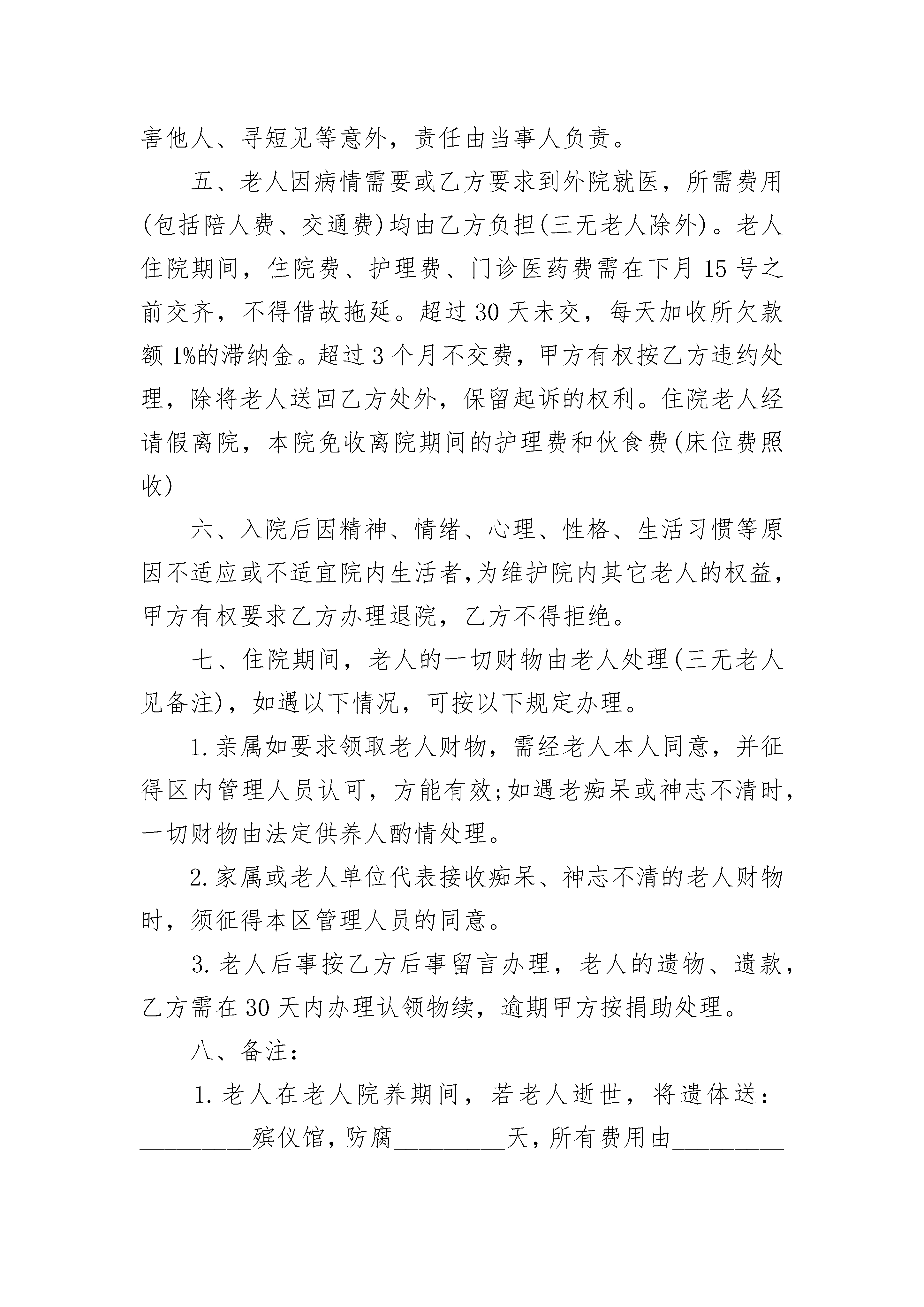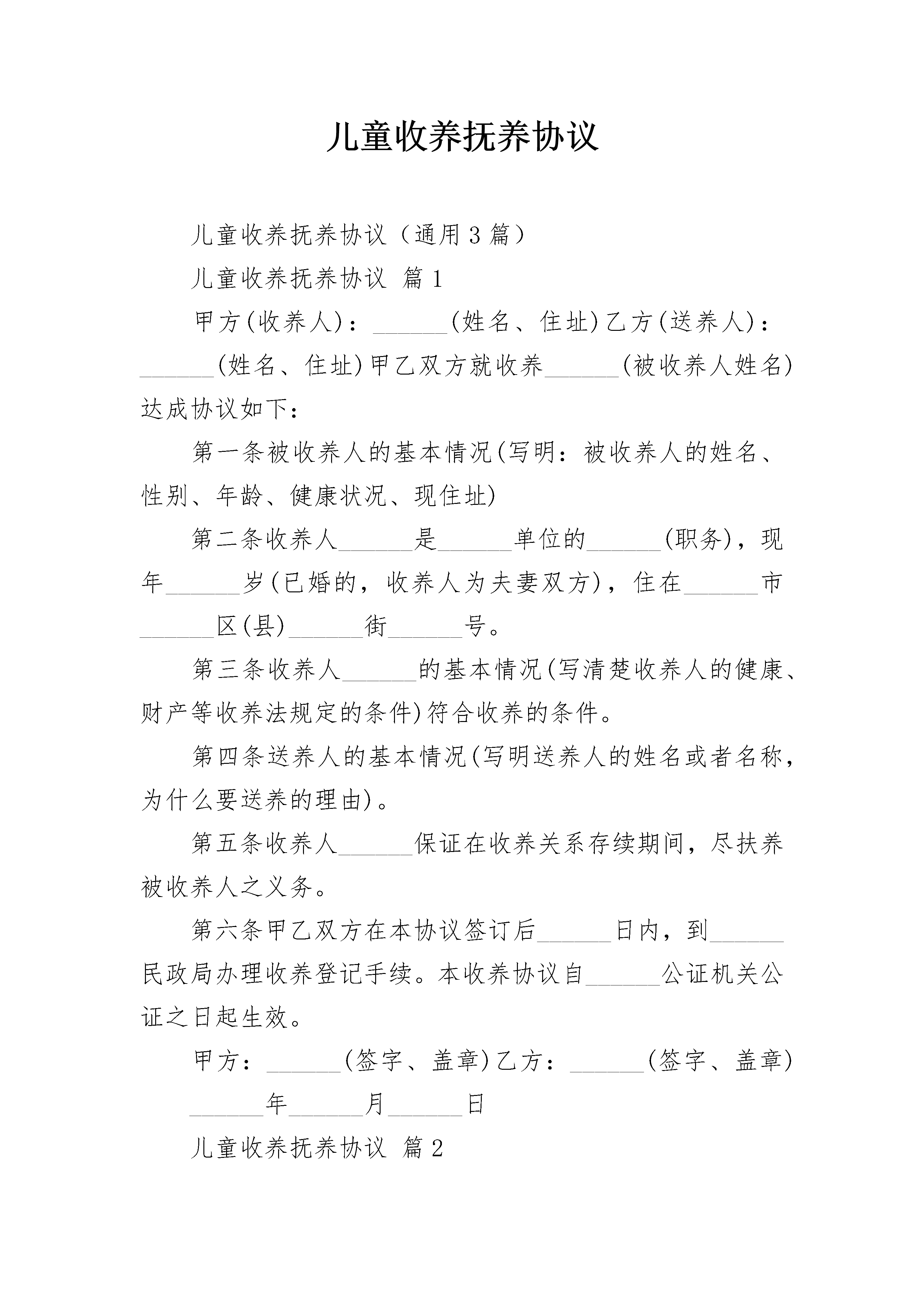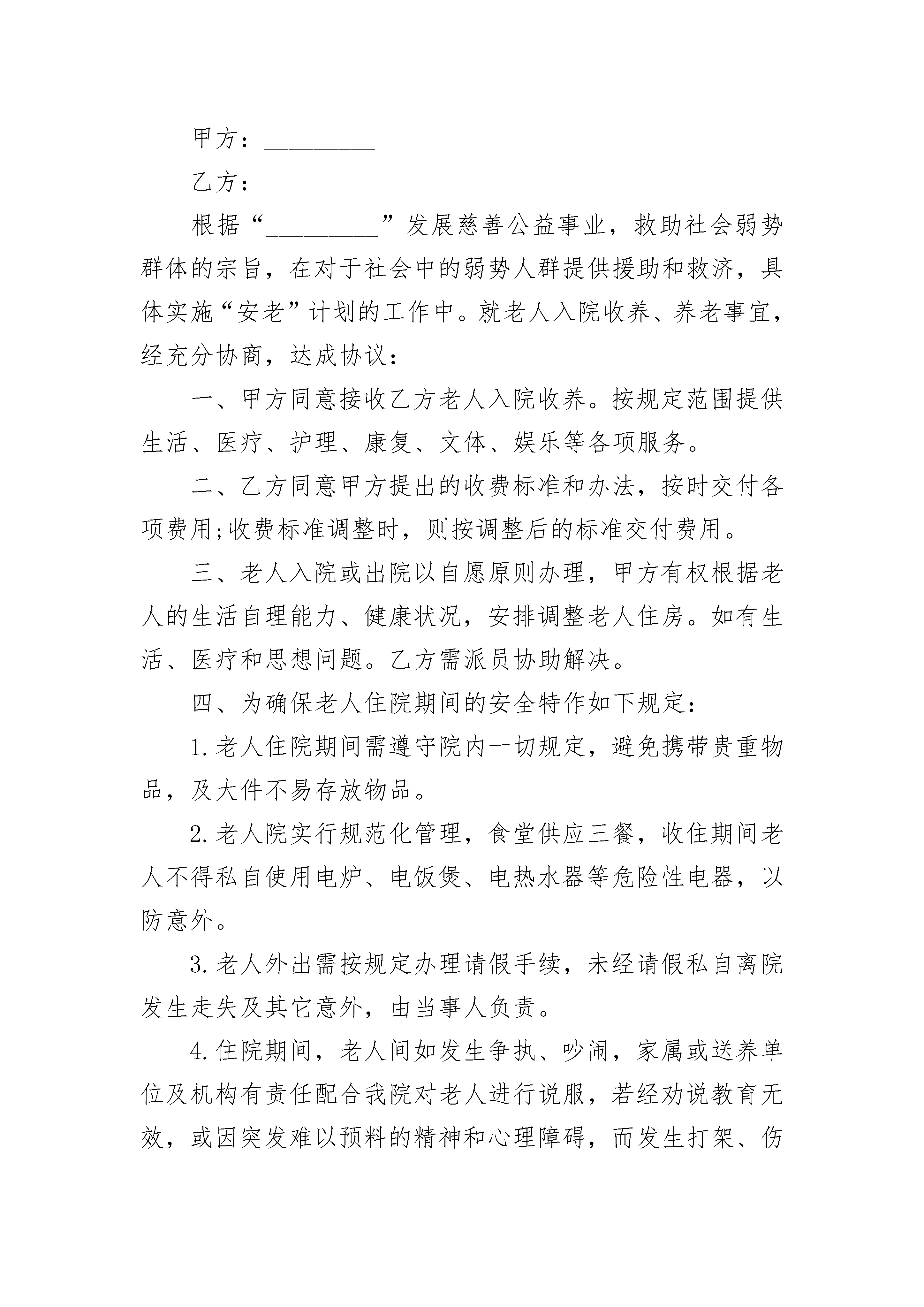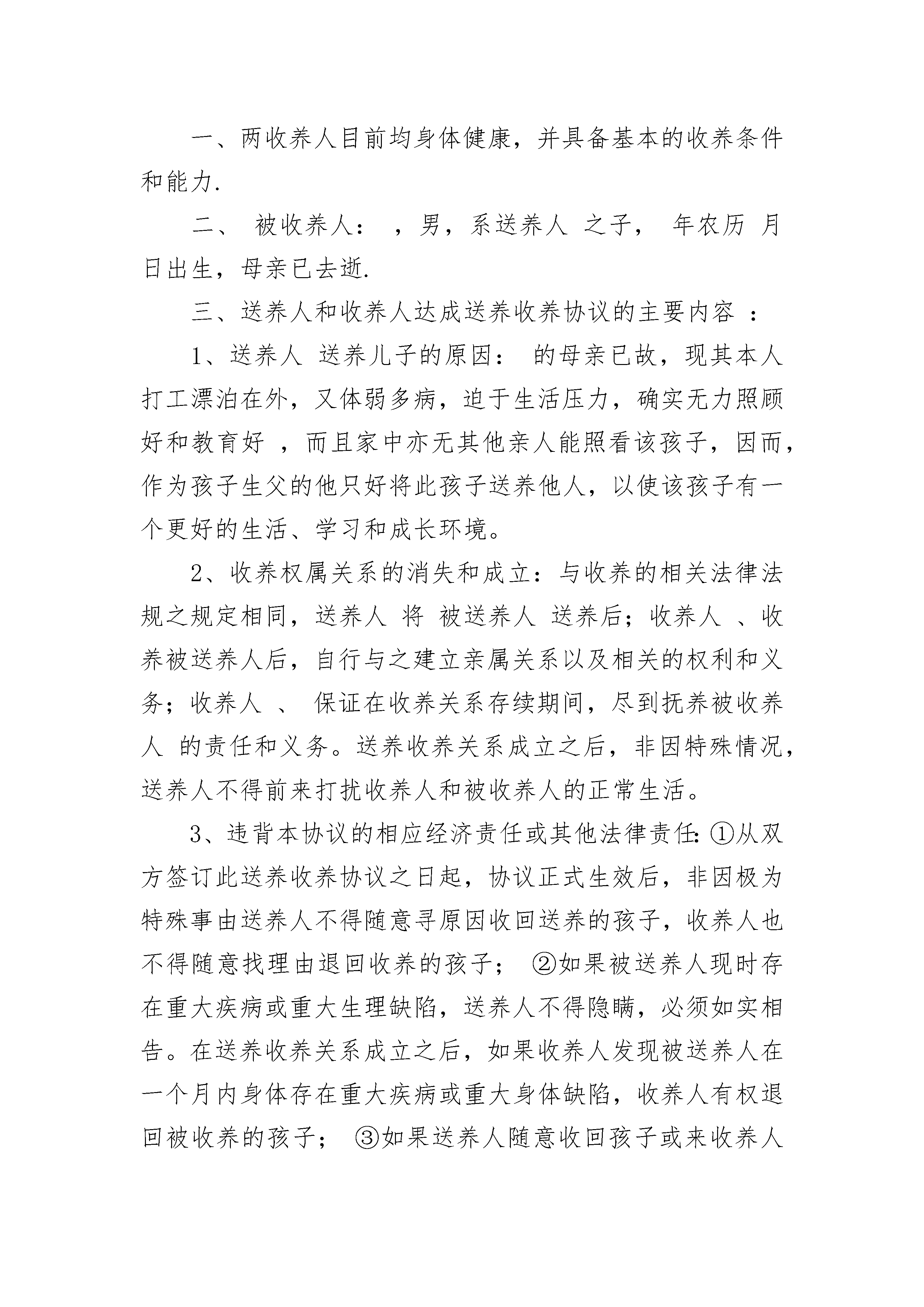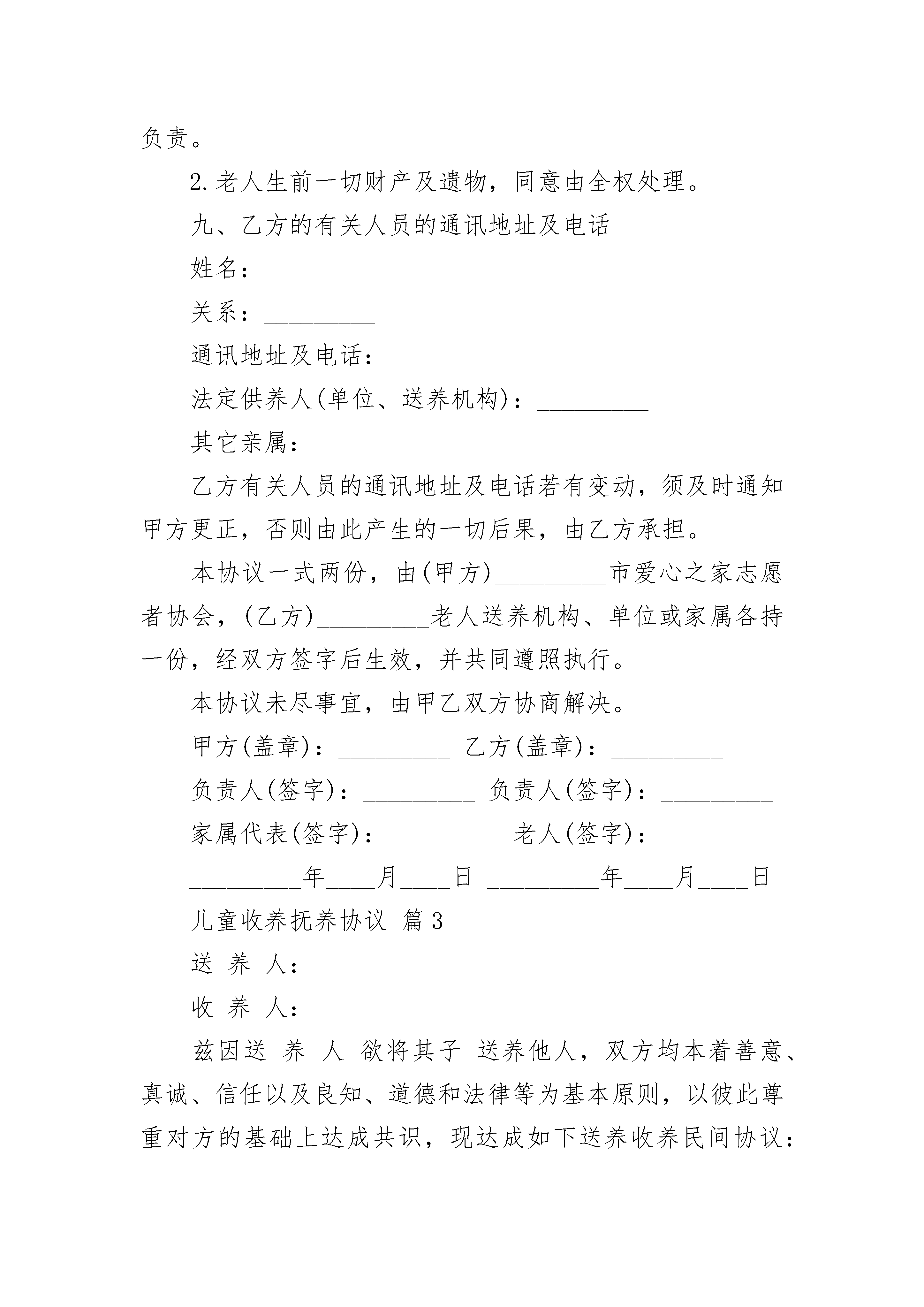 儿童收养抚养协议儿童收养抚养协议(通用3篇)儿童收养抚养协议篇1甲方(收养人):______(姓名、住址)乙方(送养人):______(姓名、住址)甲乙双方就收养______(被收养人姓名)达成协议如下:第一条被收养人的基本情况(写明:被收养人的姓名、性别、年龄、健康状况、现住址)第二条收养人______是______单位的______(职务),现年______岁(已婚的,收养人为夫妻双方),住在______市______区(县)______街______号。第三条收养人______的基本情况(写清楚收养人的健康、财产等收养法规定的条件)符合收养的条件。第四条送养人的基本情况(写明送养人的姓名或者名称,为什么要送养的理由)。第五条收养人______保证在收养关系存续期间,尽扶养被收养人之义务。第六条甲乙双方在本协议签订后______日内,到______民政局办理收养登记手续。本收养协议自______公证机关公证之日起生效。甲方:______(签字、盖章)乙方:______(签字、盖章)______年______月______日儿童收养抚养协议篇2甲方:_________乙方:_________根据“_________”发展慈善公益事业,救助社会弱势群体的宗旨,在对于社会中的弱势人群提供援助和救济,具体实施“安老”计划的工作中。就老人入院收养、养老事宜,经充分协商,达成协议:一、甲方同意接收乙方老人入院收养。按规定范围提供生活、医疗、护理、康复、文体、娱乐等各项服务。二、乙方同意甲方提出的收费标准和办法,按时交付各项费用;收费标准调整时,则按调整后的标准交付费用。三、老人入院或出院以自愿原则办理,甲方有权根据老人的生活自理能力、健康状况,安排调整老人住房。如有生活、医疗和思想问题。乙方需派员协助解决。四、为确保老人住院期间的安全特作如下规定:1.老人住院期间需遵守院内一切规定,避免携带贵重物品,及大件不易存放物品。2.老人院实行规范化管理,食堂供应三餐,收住期间老人不得私自使用电炉、电饭煲、电热水器等危险性电器,以防意外。3.老人外出需按规定办理请假手续,未经请假私自离院发生走失及其它意外,由当事人负责。4.住院期间,老人间如发生争执、吵闹,家属或送养单位及机构有责任配合我院对老人进行说服,若经劝说教育无效,或因突发难以预料的精神和心理障碍,而发生打架、伤害他人、寻短见等意外,责任由当事人负责。五、老人因病情需要或乙方要求到外院就医,所需费用(包括陪人费、交通费)均由乙方负担(三无老人除外)。老人住院期间,住院费、护理费、门诊医药费需在下月15号之前交齐,不得借故拖延。超过30天未交,每天加收所欠款额1%的滞纳金。超过3个月不交费,甲方有权按乙方违约处理,除将老人送回乙方处外,保留起诉的权利。住院老人经请假离院,本院免收离院期间的护理费和伙食费(床位费照收)六、入院后因精神、情绪、心理、性格、生活习惯等原因不适应或不适宜院内生活者,为维护院内其它老人的权益,甲方有权要求乙方办理退院,乙方不得拒绝。七、住院期间,老人的一切财物由老人处理(三无老人见备注),如遇以下情况,可按以下规定办理。1.亲属如要求领取老人财物,需经老人本人同意,并征得区内管理人员认可,方能有效;如遇老痴呆或神志不清时,一切财物由法定供养人酌情处理。2.家属或老人单位代表接收痴呆、神志不清的老人财物时,须征得本区管理人员的同意。3.老人后事按乙方后事留言办理,老人的遗物、遗款,乙方需在30天内办理认领物续,逾期甲方按捐助处理。八、备注:1.老人在老人院养期间,若老人逝世,将遗体送:_________殡仪馆,防腐_________天,所有费用由_________负责。2.老人生前一切财产及遗物,同意由全权处理。九、乙方的有关人员的通讯地址及电话姓名:_________关系:_________通讯地址及电话:_________法定供养人(单位、送养机构):_________其它亲属:_________乙方有关人员的通讯地址及电话若有变动,须及时通知甲方更正,否则由此产生的一切后果,由乙方承担。本协议一式两份,由(甲方)_________市爱心之家志愿者协会,(乙方)_________老人送养机构、单位或家属各持一份,经双方签字后生效,并共同遵照执行。本协议未尽事宜,由甲乙双方协商解决。甲方(盖章):_________乙方(盖章):_________负责人(签字):_________负责人(签字):_________家属代表(签字):_________老人(签字):__________________年____月____日_________年____月____日儿童收养抚养协议篇3送养人:收养人:兹因送养人欲将其子送养他人,双方均本着善意、真诚、信任以及良知、道德