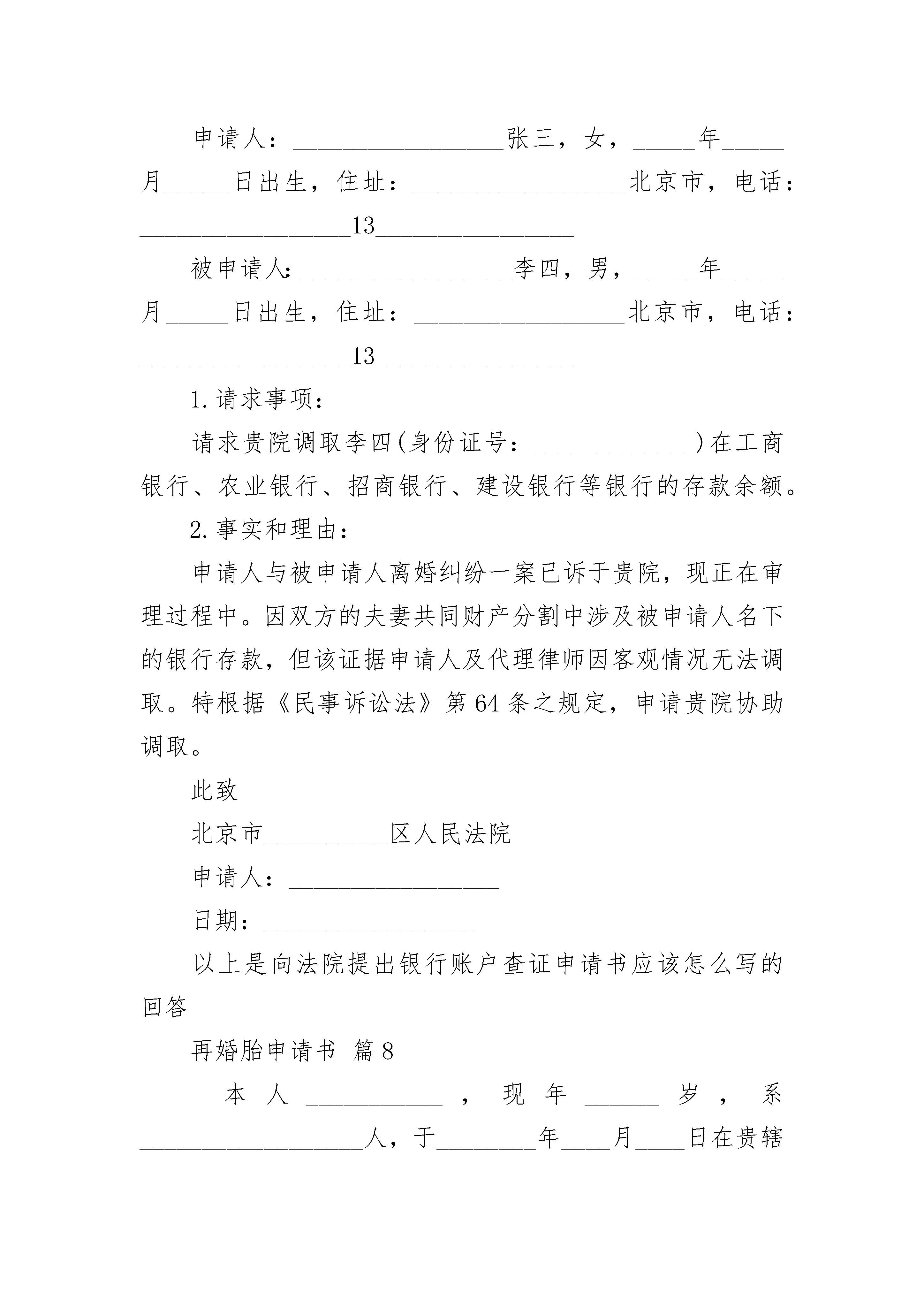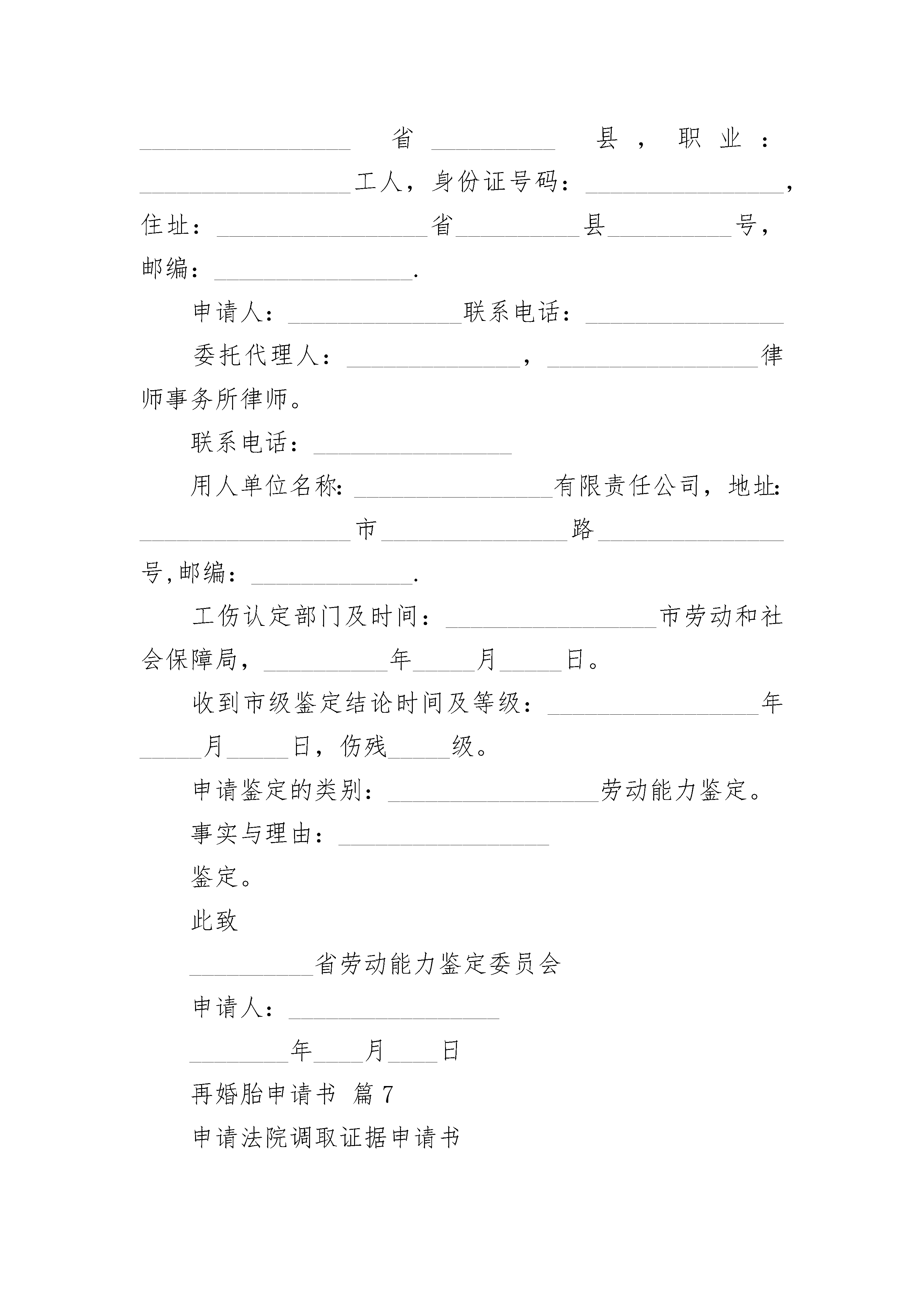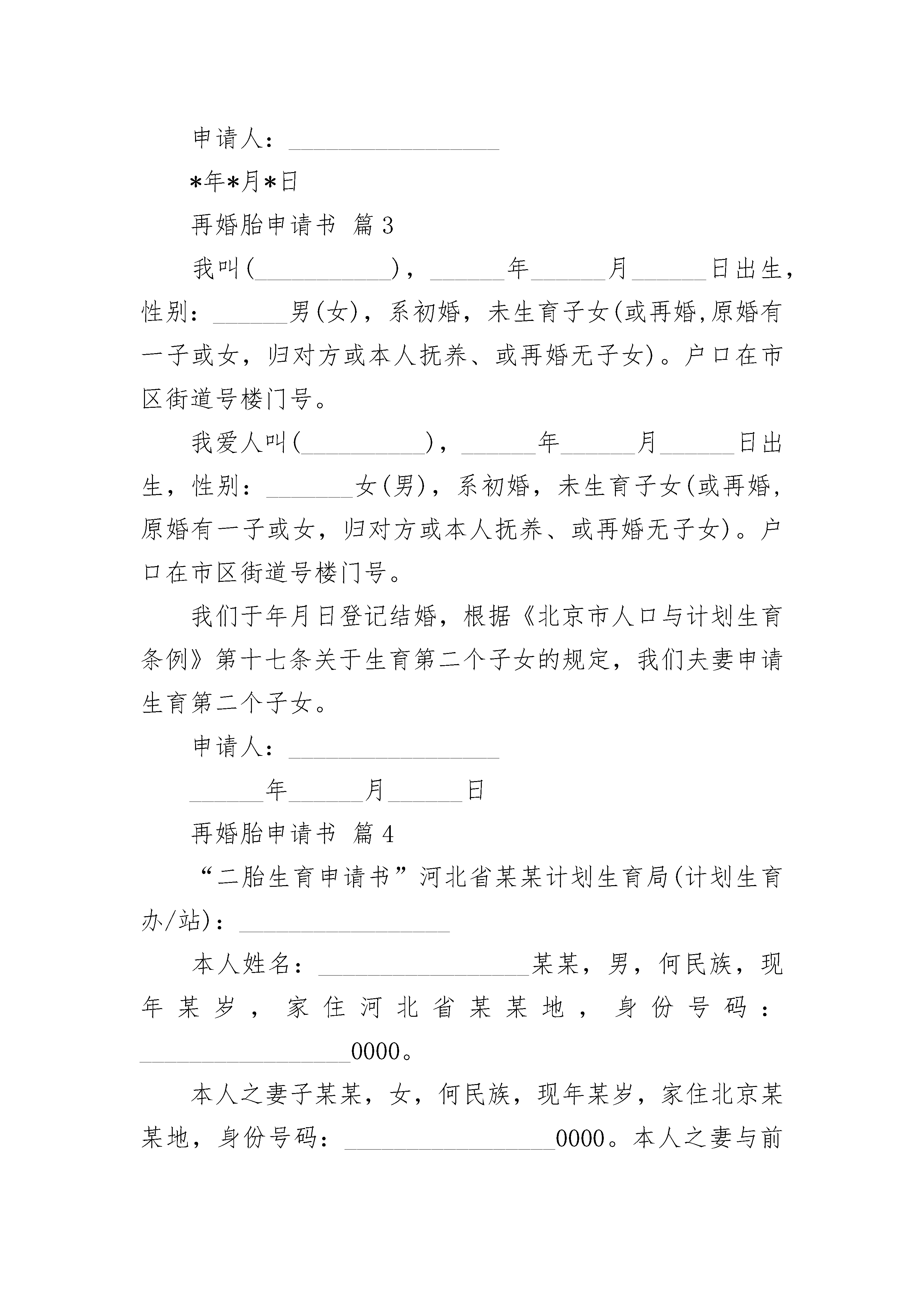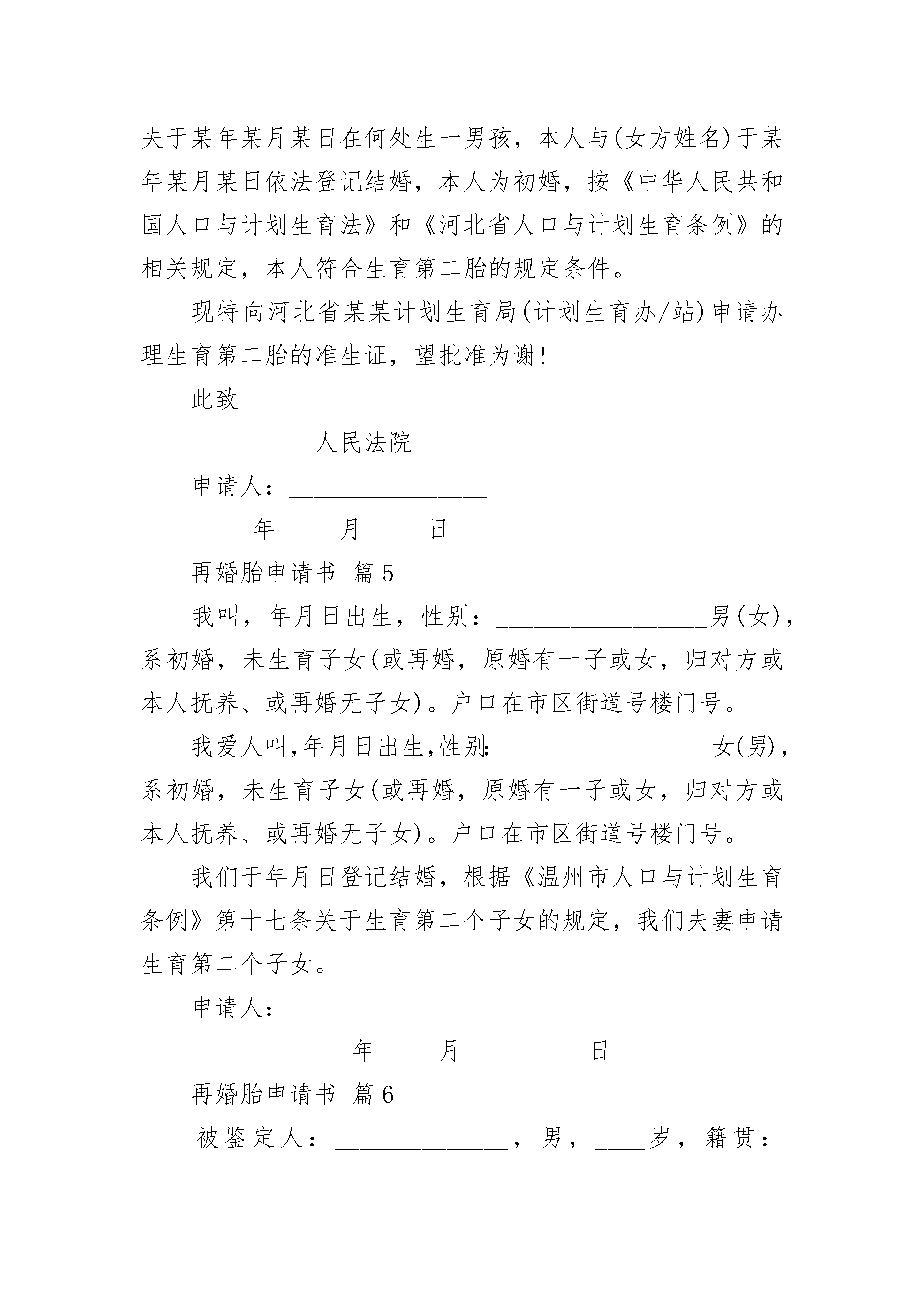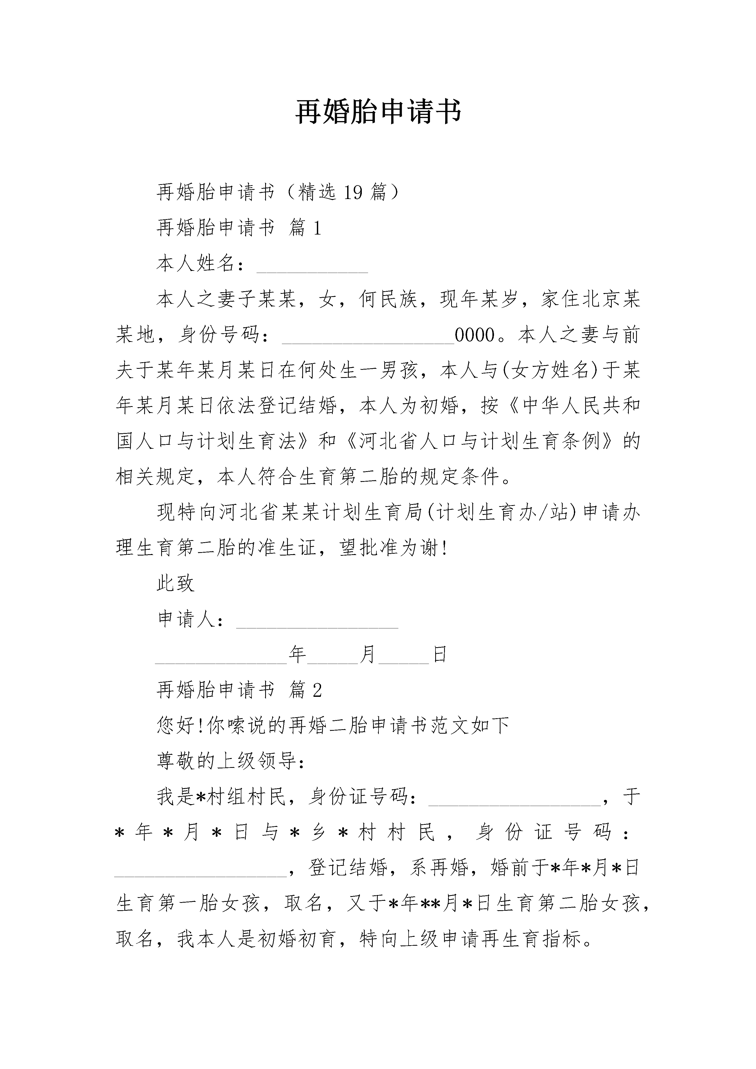 再婚胎申请书再婚胎申请书(精选19篇)再婚胎申请书篇1本人姓名:___________本人之妻子某某,女,何民族,现年某岁,家住北京某某地,身份号码:_________________0000。本人之妻与前夫于某年某月某日在何处生一男孩,本人与(女方姓名)于某年某月某日依法登记结婚,本人为初婚,按《中华人民共和国人口与计划生育法》和《河北省人口与计划生育条例》的相关规定,本人符合生育第二胎的规定条件。现特向河北省某某计划生育局(计划生育办/站)申请办理生育第二胎的准生证,望批准为谢!此致申请人:_____________________________年_____月_____日再婚胎申请书篇2您好!你嗦说的再婚二胎申请书范文如下尊敬的上级领导:我是*村组村民,身份证号码:_________________,于*年*月*日与*乡*村村民,身份证号码:_________________,登记结婚,系再婚,婚前于*年*月*日生育第一胎女孩,取名,又于*年**月*日生育第二胎女孩,取名,我本人是初婚初育,特向上级申请再生育指标。申请人:_________________*年*月*日再婚胎申请书篇3我叫(___________),______年______月______日出生,性别:______男(女),系初婚,未生育子女(或再婚,原婚有一子或女,归对方或本人抚养、或再婚无子女)。户口在市区街道号楼门号。我爱人叫(__________),______年______月______日出生,性别:_______女(男),系初婚,未生育子女(或再婚,原婚有一子或女,归对方或本人抚养、或再婚无子女)。户口在市区街道号楼门号。我们于年月日登记结婚,根据《北京市人口与计划生育条例》第十七条关于生育第二个子女的规定,我们夫妻申请生育第二个子女。申请人:_______________________年______月______日再婚胎申请书篇4“二胎生育申请书”河北省某某计划生育局(计划生育办/站):_________________本人姓名:_________________某某,男,何民族,现年某岁,家住河北省某某地,身份号码:_________________0000。本人之妻子某某,女,何民族,现年某岁,家住北京某某地,身份号码:_________________0000。本人之妻与前夫于某年某月某日在何处生一男孩,本人与(女方姓名)于某年某月某日依法登记结婚,本人为初婚,按《中华人民共和国人口与计划生育法》和《河北省人口与计划生育条例》的相关规定,本人符合生育第二胎的规定条件。现特向河北省某某计划生育局(计划生育办/站)申请办理生育第二胎的准生证,望批准为谢!此致__________人民法院申请人:_____________________年_____月_____日再婚胎申请书篇5我叫,年月日出生,性别:_________________男(女),系初婚,未生育子女(或再婚,原婚有一子或女,归对方或本人抚养、或再婚无子女)。户口在市区街道号楼门号。我爱人叫,年月日出生,性别:_________________女(男),系初婚,未生育子女(或再婚,原婚有一子或女,归对方或本人抚养、或再婚无子女)。户口在市区街道号楼门号。我们于年月日登记结婚,根据《温州市人口与计划生育条例》第十七条关于生育第二个子女的规定,我们夫妻申请生育第二个子女。申请人:___________________________年_____月__________日再婚胎申请书篇6被鉴定人:______________,男,____岁,籍贯:_________________省__________县,职业:_________________工人,身份证号码:________________,住址:_________________省__________县__________号,邮编:________________.申请人:______________联系电话:________________委托代理人:______________,_________________律师事务所律师。联系电话:________________用人单位名称:________________有限责任公司,地址:_________________市_______________路_______________号,邮编:_____________.工伤认定部门及时间:_________________市劳动和社会保障局,__________年_____月_____日。收到市级鉴定结论时间及等级:_________________年_____月_____日,伤残_____级。申请鉴定的类别:_______