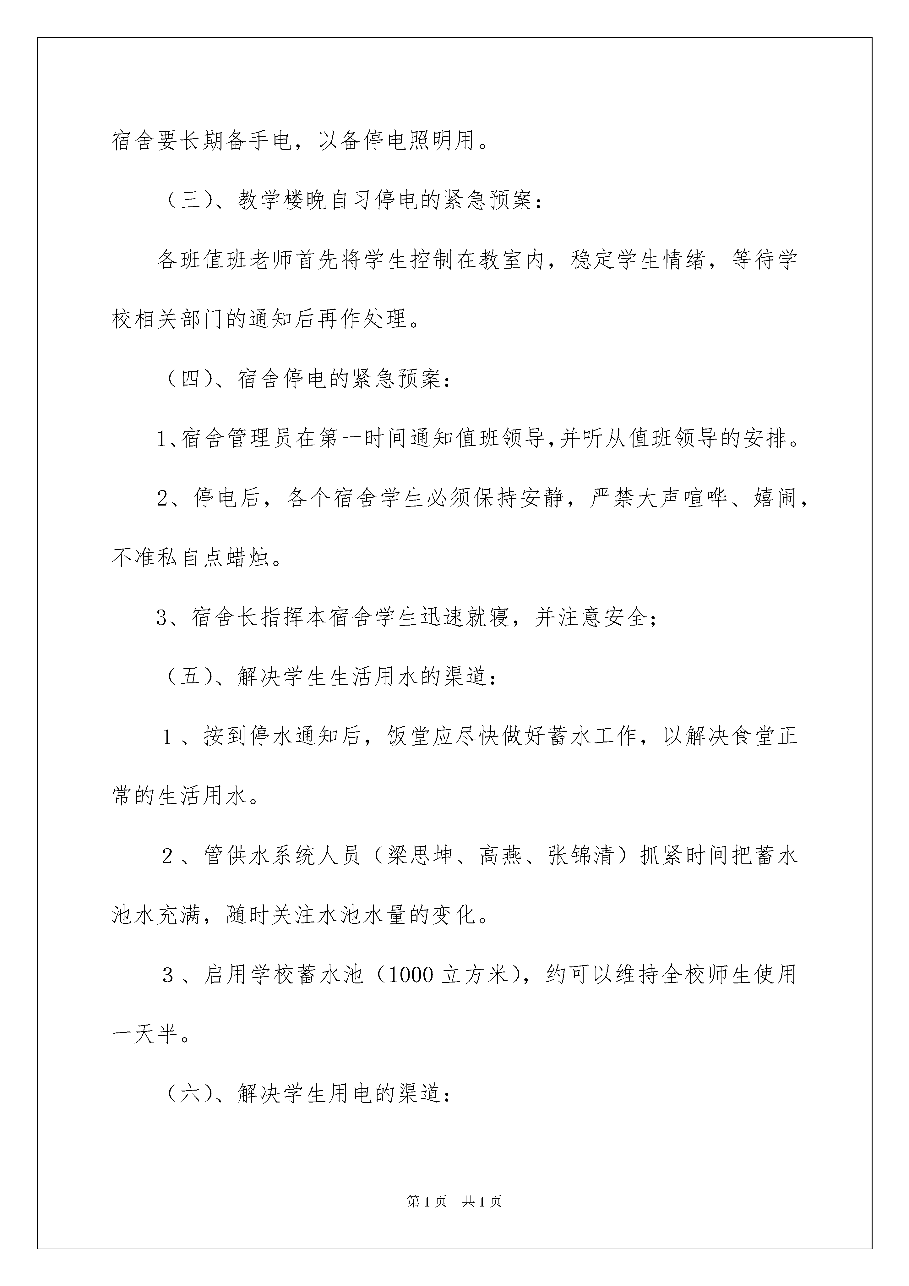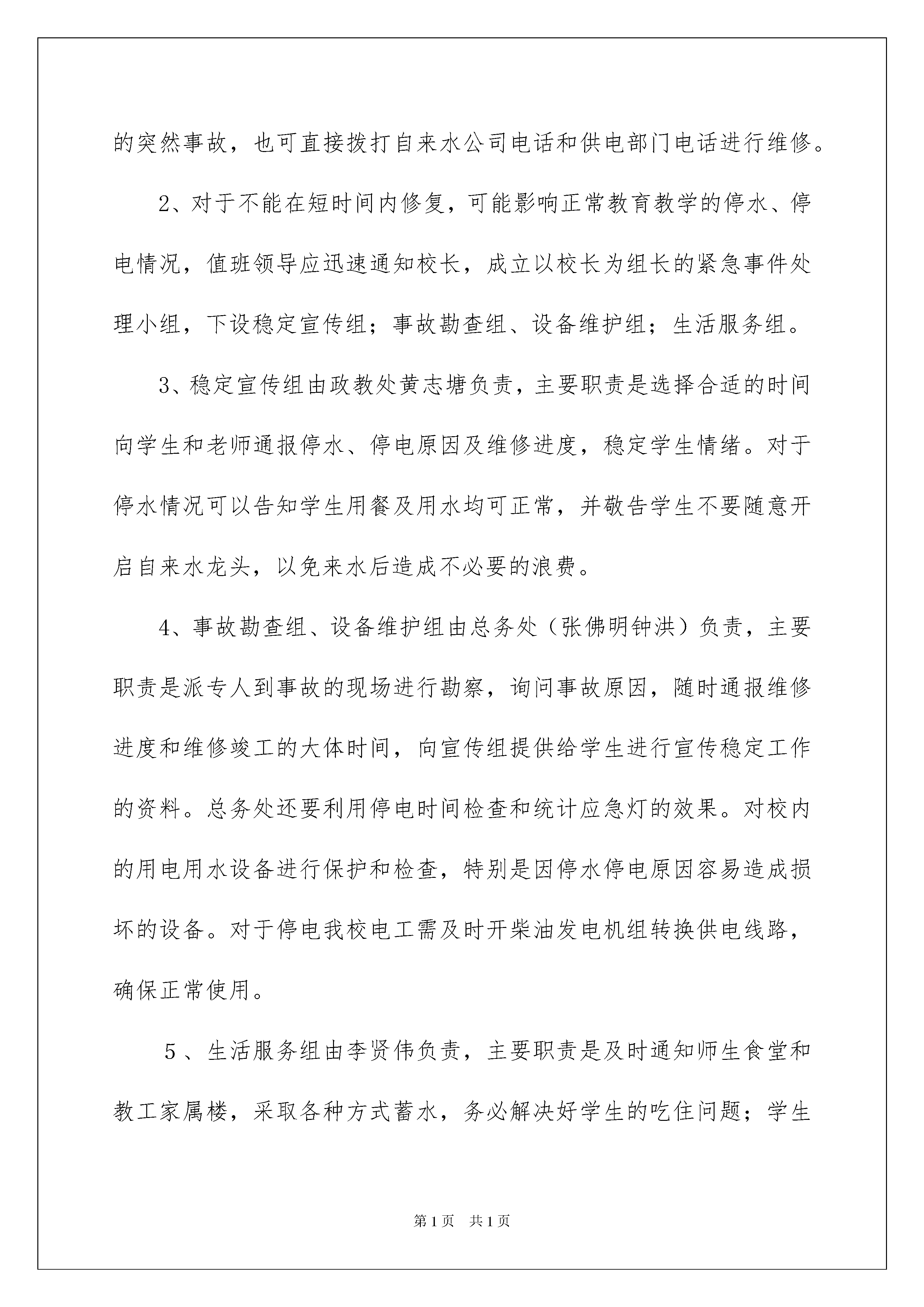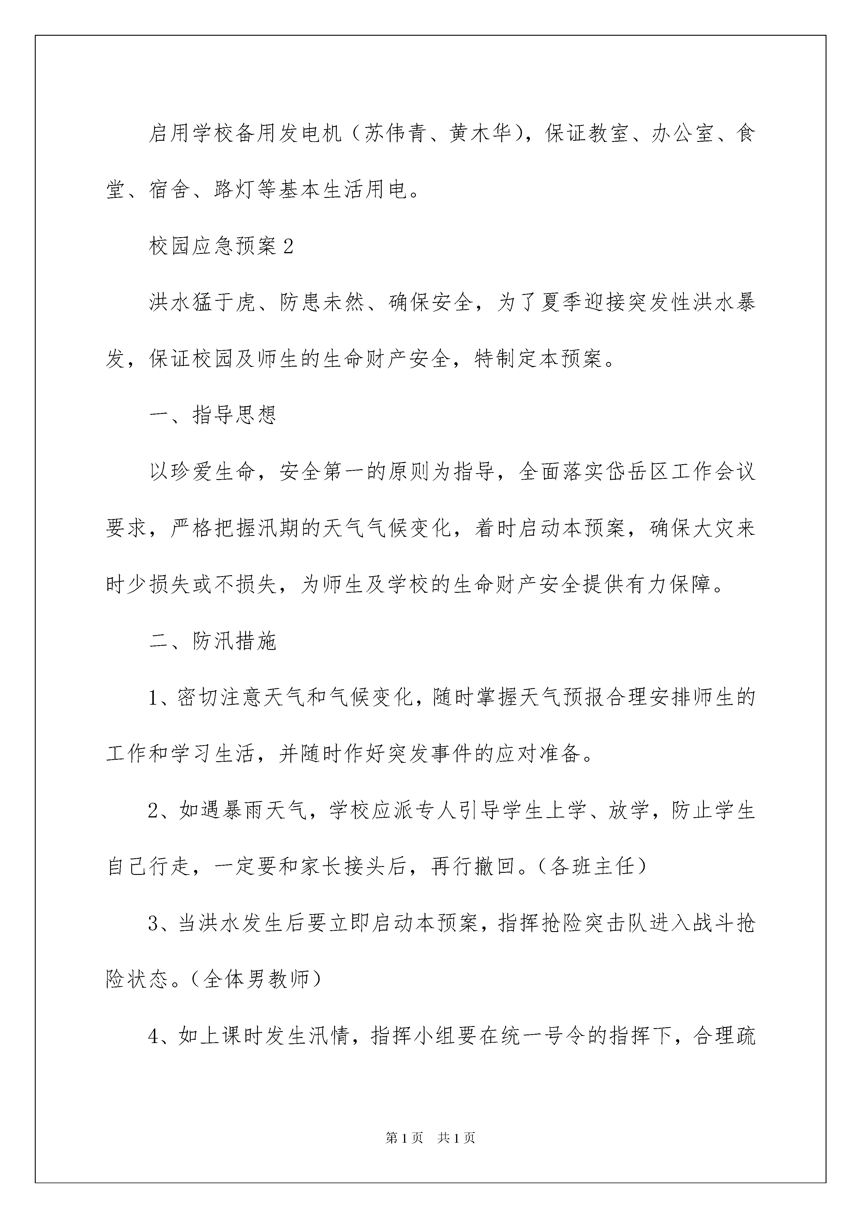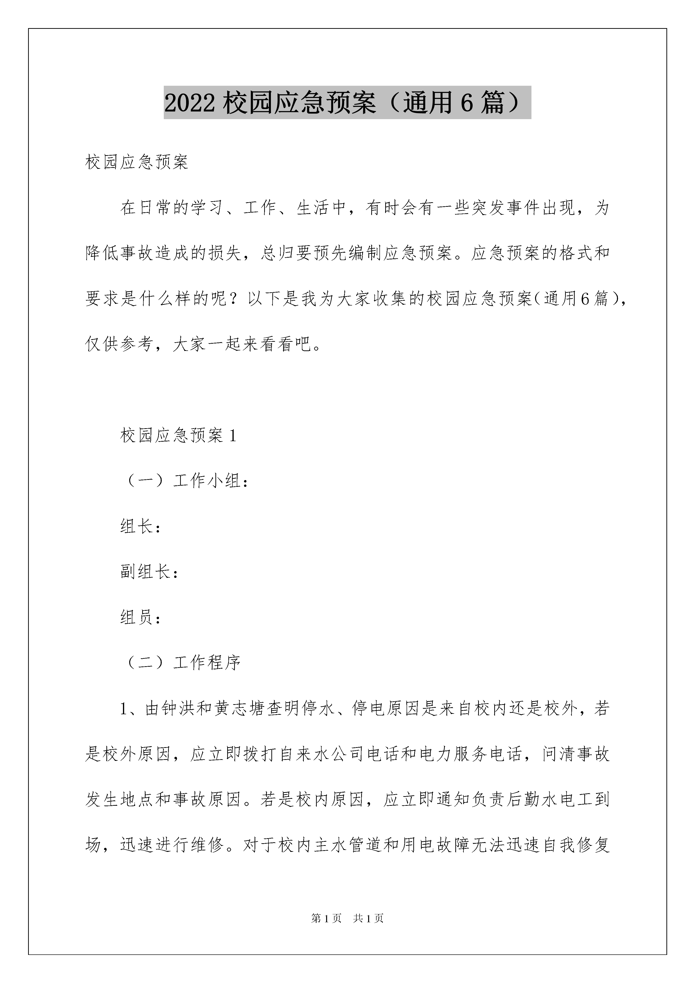 2022校园应急预案(通用6篇)校园应急预案在日常的学习、工作、生活中,有时会有一些突发事件出现,为降低事故造成的损失,总归要预先编制应急预案。应急预案的格式和要求是什么样的呢?以下是我为大家收集的校园应急预案(通用6篇),仅供参考,大家一起来看看吧。校园应急预案1(一)工作小组:组长:副组长:组员:(二)工作程序1、由钟洪和黄志塘查明停水、停电原因是来自校内还是校外,若是校外原因,应立即拨打自来水公司电话和电力服务电话,问清事故发生地点和事故原因。若是校内原因,应立即通知负责后勤水电工到场,迅速进行维修。对于校内主水管道和用电故障无法迅速自我修复的突然事故,也可直接拨打自来水公司电话和供电部门电话进行维修。2、对于不能在短时间内修复,可能影响正常教育教学的停水、停电情况,值班领导应迅速通知校长,成立以校长为组长的紧急事件处理小组,下设稳定宣传组;事故勘查组、设备维护组;生活服务组。3、稳定宣传组由政教处黄志塘负责,主要职责是选择合适的时间向学生和老师通报停水、停电原因及维修进度,稳定学生情绪。对于停水情况可以告知学生用餐及用水均可正常,并敬告学生不要随意开启自来水龙头,以免来水后造成不必要的浪费。4、事故勘查组、设备维护组由总务处(张佛明钟洪)负责,主要职责是派专人到事故的现场进行勘察,询问事故原因,随时通报维修进度和维修竣工的大体时间,向宣传组提供给学生进行宣传稳定工作的资料。总务处还要利用停电时间检查和统计应急灯的效果。对校内的用电用水设备进行保护和检查,特别是因停水停电原因容易造成损坏的设备。对于停电我校电工需及时开柴油发电机组转换供电线路,确保正常使用。5、生活服务组由李贤伟负责,主要职责是及时通知师生食堂和教工家属楼,采取各种方式蓄水,务必解决好学生的吃住问题;学生宿舍要长期备手电,以备停电照明用。(三)、教学楼晚自习停电的紧急预案:各班值班老师首先将学生控制在教室内,稳定学生情绪,等待学校相关部门的通知后再作处理。(四)、宿舍停电的紧急预案:1、宿舍管理员在第一时间通知值班领导,并听从值班领导的安排。2、停电后,各个宿舍学生必须保持安静,严禁大声喧哗、嬉闹,不准私自点蜡烛。3、宿舍长指挥本宿舍学生迅速就寝,并注意安全;(五)、解决学生生活用水的渠道:1、按到停水通知后,饭堂应尽快做好蓄水工作,以解决食堂正常的生活用水。2、管供水系统人员(梁思坤、高燕、张锦清)抓紧时间把蓄水池水充满,随时关注水池水量的变化。3、启用学校蓄水池(1000立方米),约可以维持全校师生使用一天半。(六)、解决学生用电的渠道:启用学校备用发电机(苏伟青、黄木华),保证教室、办公室、食堂、宿舍、路灯等基本生活用电。校园应急预案2洪水猛于虎、防患未然、确保安全,为了夏季迎接突发性洪水暴发,保证校园及师生的生命财产安全,特制定本预案。一、指导思想以珍爱生命,安全第一的原则为指导,全面落实岱岳区工作会议要求,严格把握汛期的天气气候变化,着时启动本预案,确保大灾来时少损失或不损失,为师生及学校的生命财产安全提供有力保障。二、防汛措施1、密切注意天气和气候变化,随时掌握天气预报合理安排师生的工作和学习生活,并随时作好突发事件的应对准备。2、如遇暴雨天气,学校应派专人引导学生上学、放学,防止学生自己行走,一定要和家长接头后,再行撤回。(各班主任)3、当洪水发生后要立即启动本预案,指挥抢险突击队进入战斗抢险状态。(全体男教师)4、如上课时发生汛情,指挥小组要在统一号令的指挥下,合理疏导学生转移到安全地带,并作好合理的防险工作。5、灾情发生后全体教师要以学生安全为主,立即进入情况,保证道路交通、通讯、报警、抢险、维护。三、防洪工作领导小组组长:组员:防汛工作领导小组的职责:负责检查、督促各校防汛工作;根据汛情,研究、制订防汛方案;指挥防汛抗洪抢险队进行抢险;负责向上级汇报汛情及处理情况;协调配合相关部门做好救援工作;做好善后处理工作。领导小组下设办公室,负责处理日常工作。办公室设在总务处办公室。四、各职能小组职责指挥组:石勇职责:在遭遇区域性超标准洪水灾害的情况下,第一时间到达现场,在教育局防汛指挥部的统一安排下,启动防汛抗洪工作预案。通讯组:张珍职责:协调非受灾学校对受灾学校进行救援,组织有关人员维护学校秩序,加强安全保卫,保护师生安全和教育资产不受损失。疏导组:石金军职责:提前做好防汛准备工作,根据汛情,延缓或提前放学时间,组织学生们到安全地方避险(二层至四层教室),必要时可组织教师或家长护送学生到家。抢救组:李红职责:负责伤病患者的抢救及紧急医护、送医院急救等任务。器材保障组:张永军职责:协调医