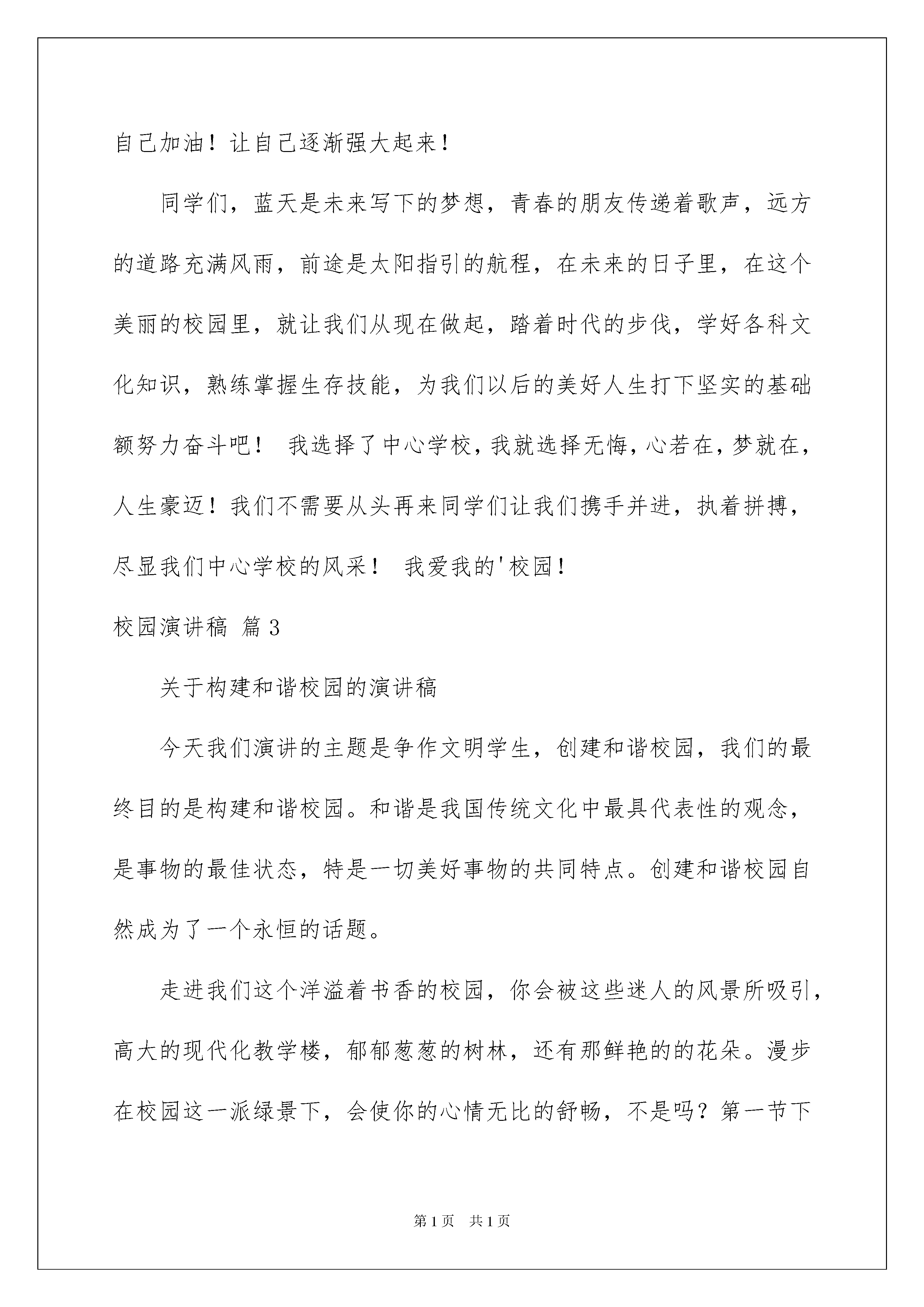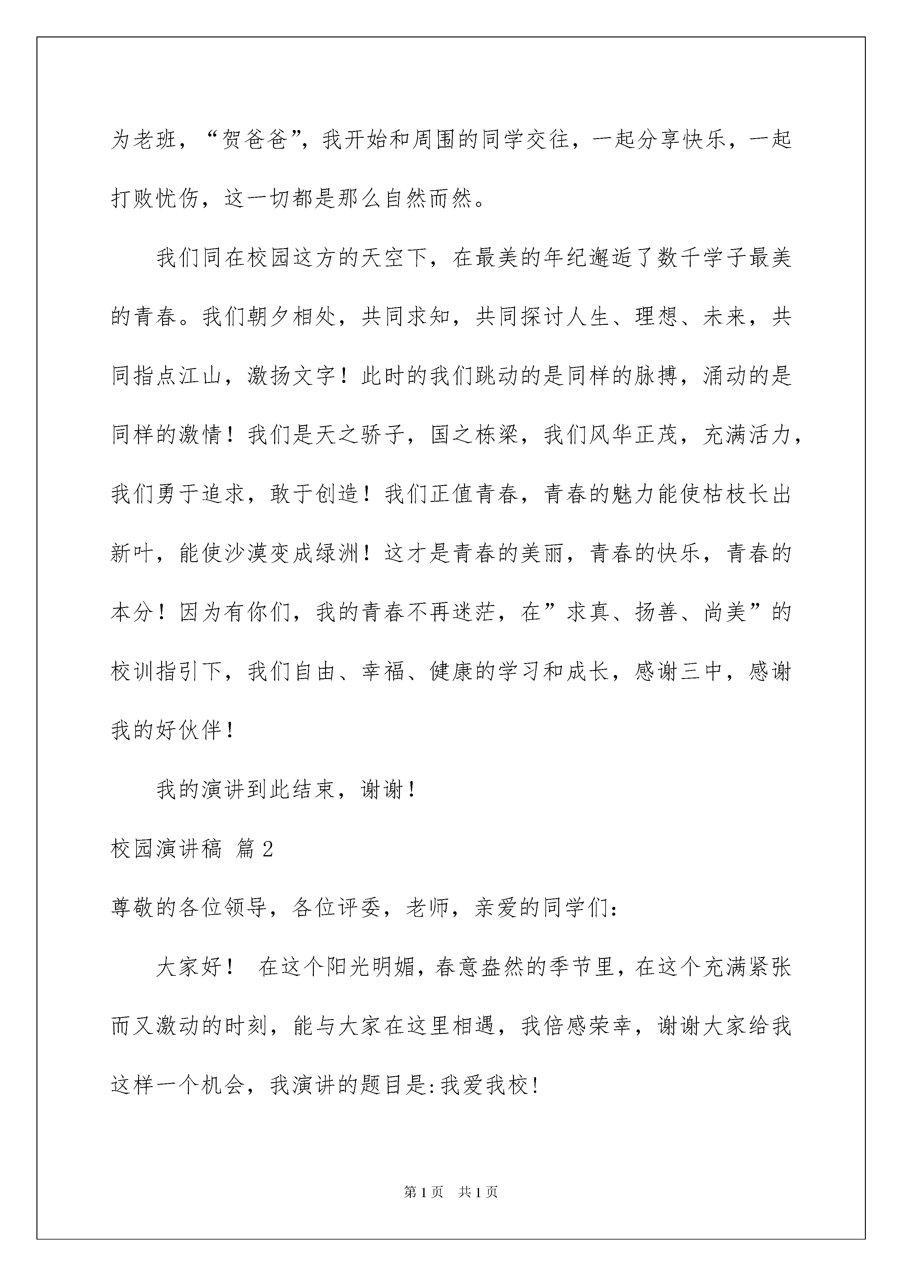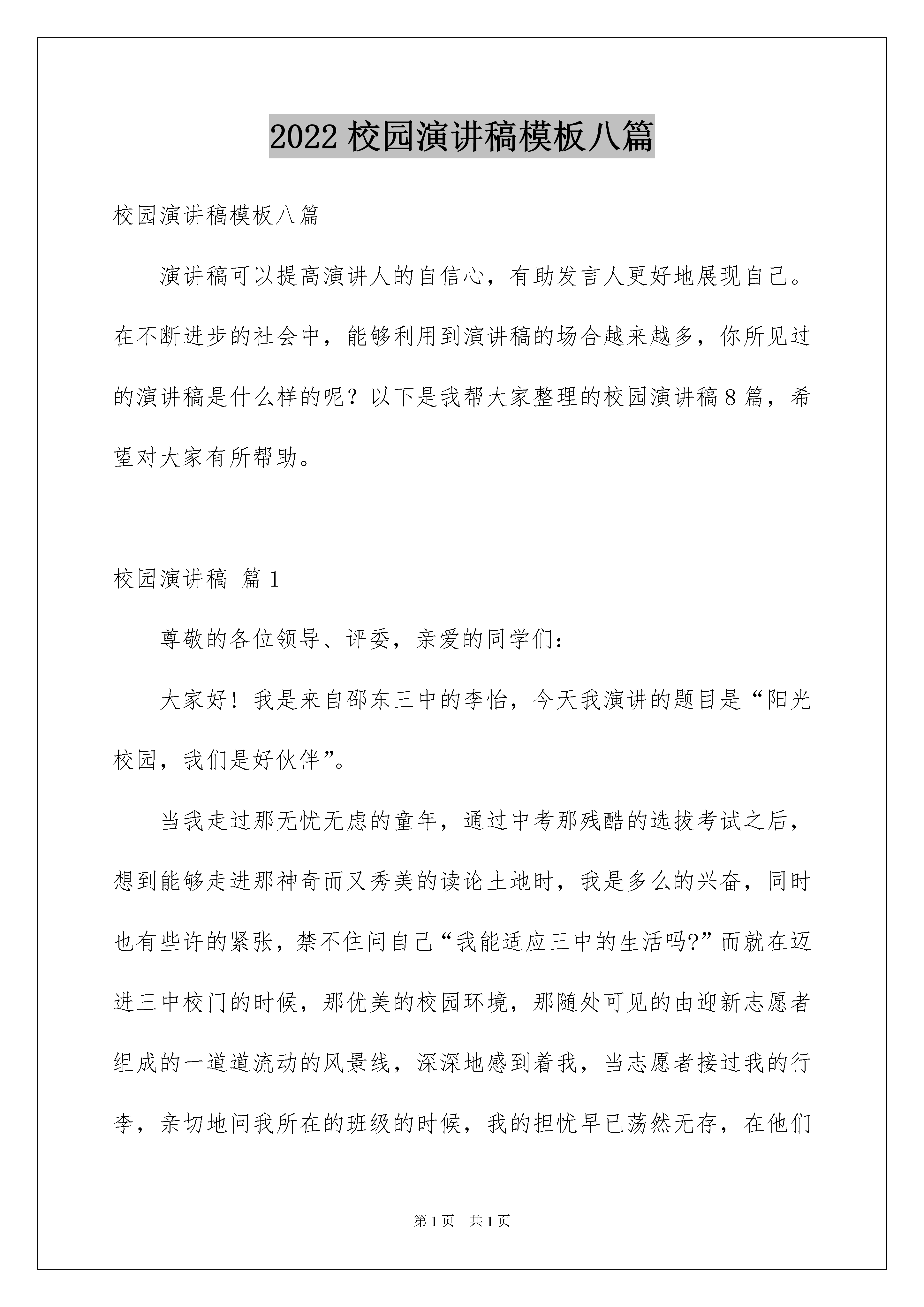 2022校园演讲稿模板八篇校园演讲稿模板八篇演讲稿可以提高演讲人的自信心,有助发言人更好地展现自己。在不断进步的社会中,能够利用到演讲稿的场合越来越多,你所见过的演讲稿是什么样的呢?以下是我帮大家整理的校园演讲稿8篇,希望对大家有所帮助。校园演讲稿篇1尊敬的各位领导、评委,亲爱的同学们:大家好!我是来自邵东三中的李怡,今天我演讲的题目是“阳光校园,我们是好伙伴”。当我走过那无忧无虑的童年,通过中考那残酷的选拔考试之后,想到能够走进那神奇而又秀美的读论土地时,我是多么的兴奋,同时也有些许的紧张,禁不住问自己“我能适应三中的生活吗?”而就在迈进三中校门的时候,那优美的校园环境,那随处可见的由迎新志愿者组成的一道道流动的风景线,深深地感到着我,当志愿者接过我的行李,亲切地问我所在的班级的时候,我的担忧早已荡然无存,在他们的带领下我轻松地办好了一切手续,很快就融入到了三中这个大家庭中。而不知不觉间我就面临高二的文理科的选择,我所在的是理科班,而我擅长的却又是文科,然而我不想离开那个已经相处了整整一年的班集体。记得那天大雨刚停,天空还是灰蒙蒙的,我独自走在校园的林荫小道上,黯然神伤。班主任知道情况后,亲切地对我说,“分科是为了你将来更好的学习和就业,你现在只是换一个教室学习而已,你与本班同学的友谊还在,你还会结识更多的朋友。”我点了点头,抬头一看,天空不知什么时候已经开始晴朗起来。最终我选择了文科,进入了一个全新的集体,一切都是新的,我却总是怀旧,我想念以前的老师,同学,想念那张无论换多少次位置我都要拽着走的课桌,我依旧不愿意承认和接受这已经改变了的一切。然而一丝一丝的暖意悄悄地打开了我的心,是班主任贺老师为了工作熬坏的眼睛,是讲台下响起的阵阵掌声,是校运会上全班同学的加油呐喊声,是一张廉价却足以暖心的创可贴,是班长的那一句开心就要大声笑出来!终于我不再孤傲,我不再抗拒,我开始和其他同学一样称呼老师为老班,“贺爸爸”,我开始和周围的同学交往,一起分享快乐,一起打败忧伤,这一切都是那么自然而然。我们同在校园这方的天空下,在最美的年纪邂逅了数千学子最美的青春。我们朝夕相处,共同求知,共同探讨人生、理想、未来,共同指点江山,激扬文字!此时的我们跳动的是同样的脉搏,涌动的是同样的激情!我们是天之骄子,国之栋梁,我们风华正茂,充满活力,我们勇于追求,敢于创造!我们正值青春,青春的魅力能使枯枝长出新叶,能使沙漠变成绿洲!这才是青春的美丽,青春的快乐,青春的本分!因为有你们,我的青春不再迷茫,在”求真、扬善、尚美”的校训指引下,我们自由、幸福、健康的学习和成长,感谢三中,感谢我的好伙伴!我的演讲到此结束,谢谢!校园演讲稿篇2尊敬的各位领导,各位评委,老师,亲爱的同学们:大家好!在这个阳光明媚,春意盎然的季节里,在这个充满紧张而又激动的时刻,能与大家在这里相遇,我倍感荣幸,谢谢大家给我这样一个机会,我演讲的题目是:我爱我校!风轻轻,天蓝蓝,漫步在这环境优美的校园,我内心是多么的舒畅,多么的自豪啊。巴彦塔拉镇中心学校,在这里我要真诚的说声;谢谢您。谢谢您,培养了我们这一代的精英;谢谢您,给了我们这么好的学习环境;谢谢您,给了我们认识自我、改变自我的机会。还清楚的记得,开学的时候,校长的一番话就更加坚定了我们的信心。自从来到这个学校,教室里有了我朗朗的读书声;操场上有了我朝气蓬勃的身影;朋友间有了我会心的笑容。我像一只活泼、纯真、快乐的小鸟,在这个学校的天空上自由自在的飞翔。我的生活充满阳光,我的内心充满活力,我的身上散发着青春的朝气!时光如梭,在这几个月的学习生活中,虽然在这所学校呆的时间不长,但是,中心学校让我看清了它的温情!它的渊博!是您,让我找回了自信!是您,给我提供了场所!是您,让我体现了价值!您让我感到欣慰;您让我感到踏实;您让我感到骄傲!我庆幸自己没有选错学校,我庆幸我是命运的宠儿,中心学校让我相信:天生我材必有用!我知道我拥有青春,它却不是骄傲的资本!我知道我拥有热情,他也不是我赖以自豪的原因!我知道学如逆水行舟,不进则退的道理!所以,我为自己定了一个目标:努力学习,锻炼自己的能力,不断给自己加油!让自己逐渐强大起来!同学们,蓝天是未来写下的梦想,青春的朋友传递着歌声,远方的道路充满风雨,前途是太阳指引的航程,在未来的日子里,在这个美丽的校园里,就让我们从现在做起,踏着时代的步伐,学好各科文化知识,熟练掌握生存技能,为我们以后的美好人生打下坚实的基础额努力奋斗吧!我选择了中心学校,我就选择无悔,心若在,梦就在,人生豪迈!我们不需要从头再来同学们让我们携手并进,执着拼搏,尽显我们中心学校