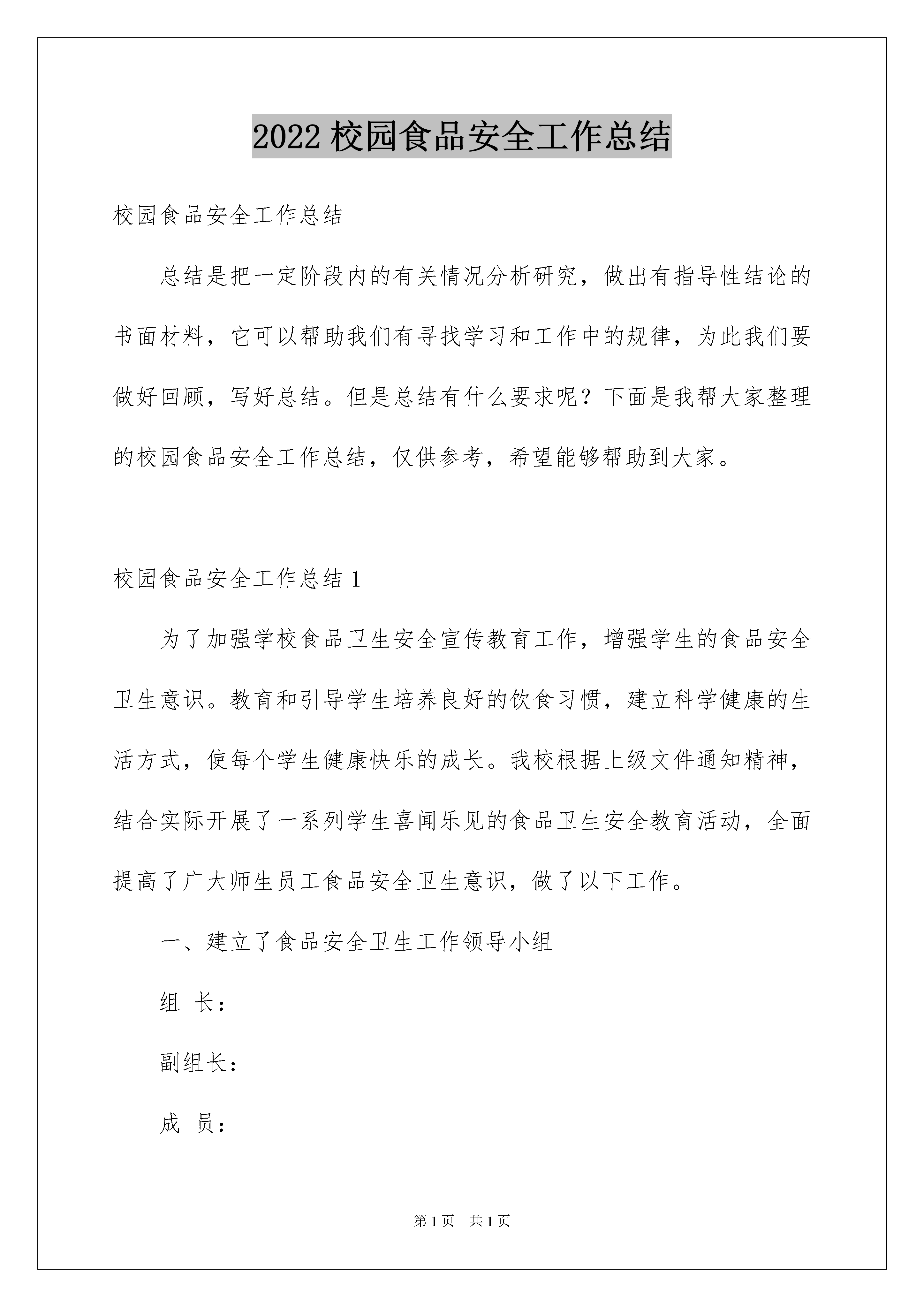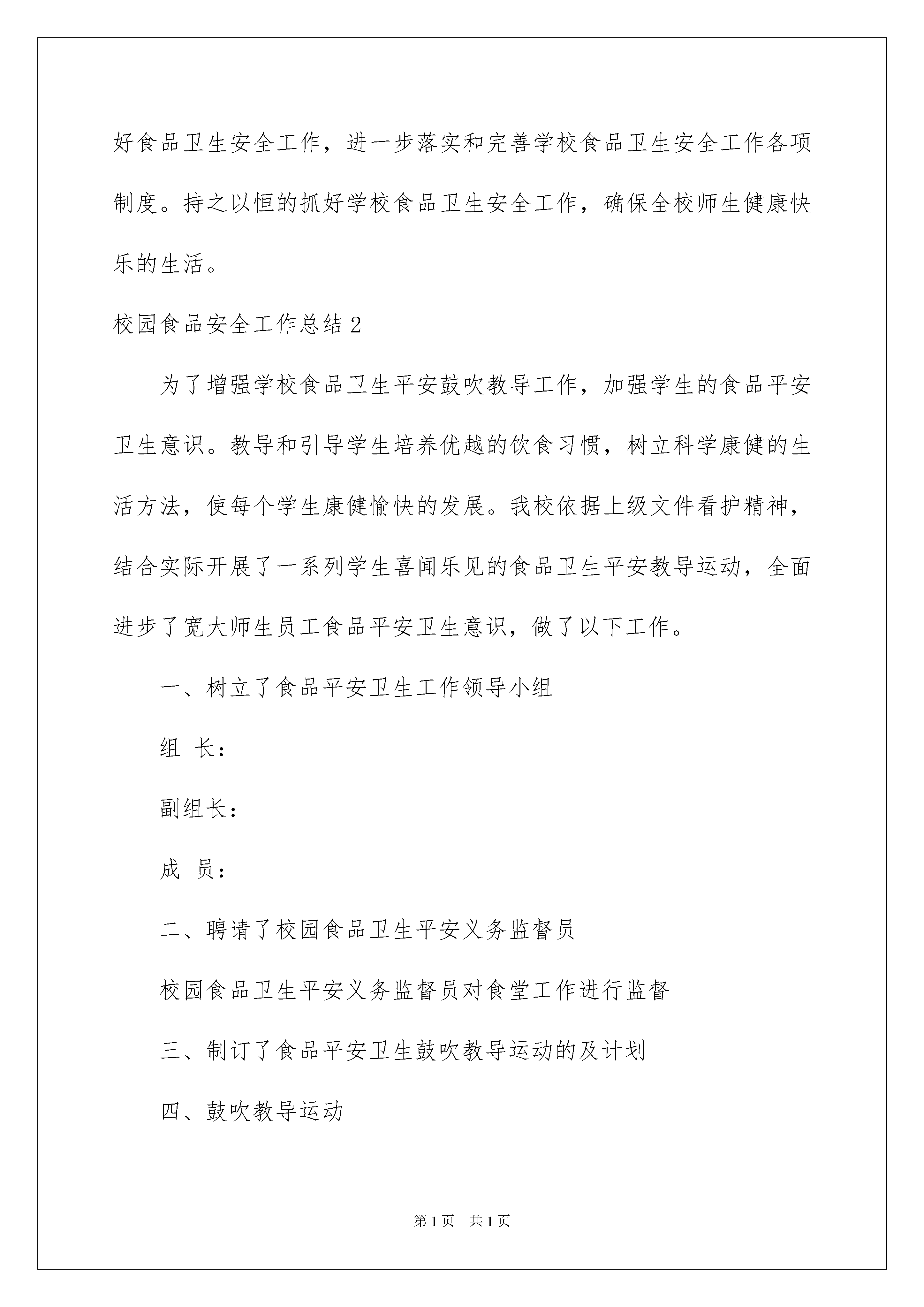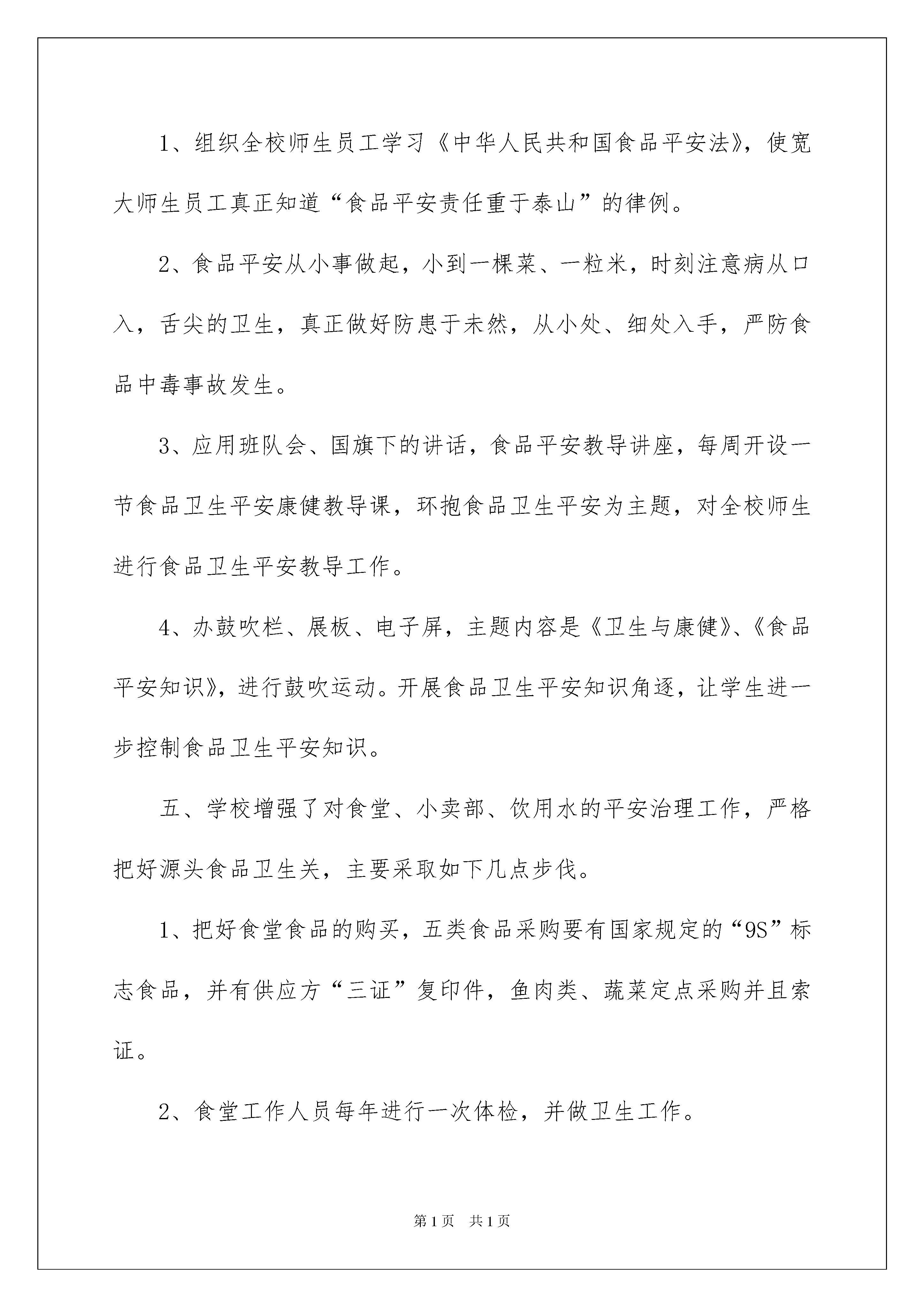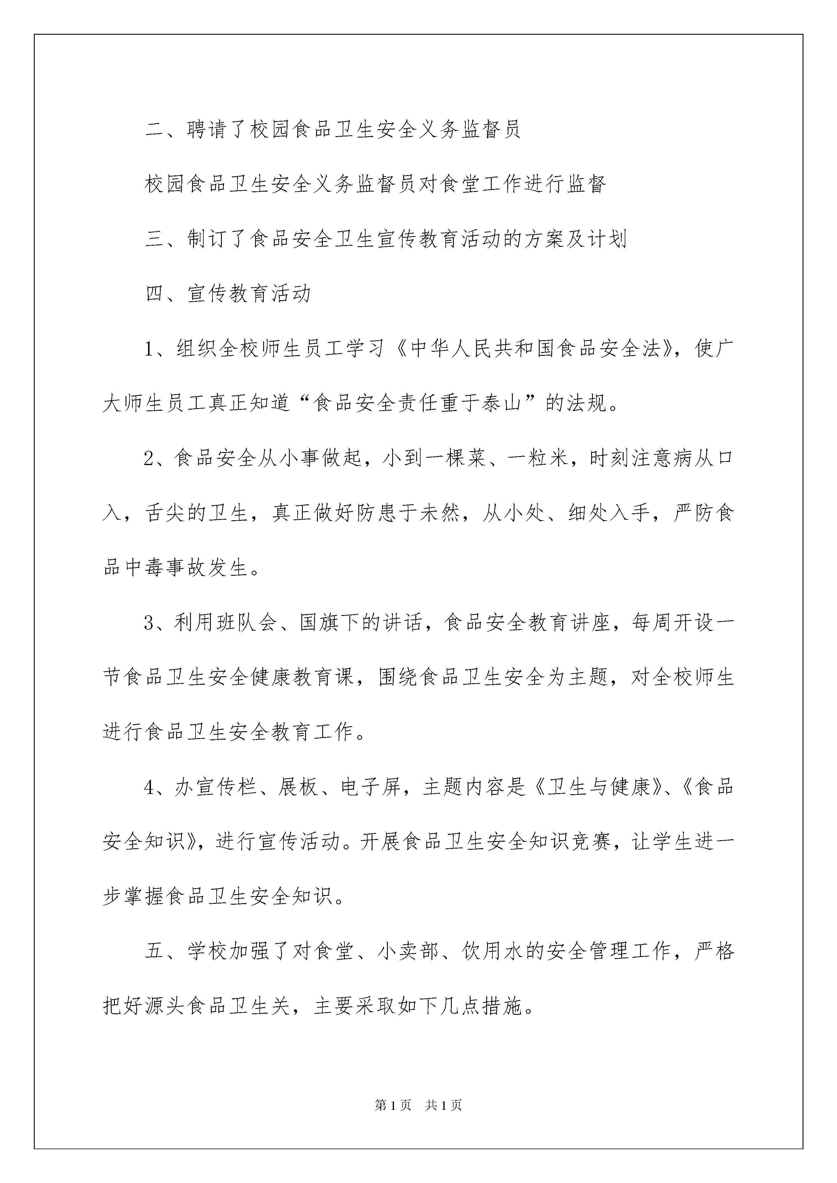 2022校园食品安全工作总结校园食品安全工作总结总结是把一定阶段内的有关情况分析研究,做出有指导性结论的书面材料,它可以帮助我们有寻找学习和工作中的规律,为此我们要做好回顾,写好总结。但是总结有什么要求呢?下面是我帮大家整理的校园食品安全工作总结,仅供参考,希望能够帮助到大家。校园食品安全工作总结1为了加强学校食品卫生安全宣传教育工作,增强学生的食品安全卫生意识。教育和引导学生培养良好的饮食习惯,建立科学健康的生活方式,使每个学生健康快乐的成长。我校根据上级文件通知精神,结合实际开展了一系列学生喜闻乐见的食品卫生安全教育活动,全面提高了广大师生员工食品安全卫生意识,做了以下工作。一、建立了食品安全卫生工作领导小组组长:副组长:成员:二、聘请了校园食品卫生安全义务监督员校园食品卫生安全义务监督员对食堂工作进行监督三、制订了食品安全卫生宣传教育活动的方案及计划四、宣传教育活动1、组织全校师生员工学习《中华人民共和国食品安全法》,使广大师生员工真正知道“食品安全责任重于泰山”的法规。2、食品安全从小事做起,小到一棵菜、一粒米,时刻注意病从口入,舌尖的卫生,真正做好防患于未然,从小处、细处入手,严防食品中毒事故发生。3、利用班队会、国旗下的讲话,食品安全教育讲座,每周开设一节食品卫生安全健康教育课,围绕食品卫生安全为主题,对全校师生进行食品卫生安全教育工作。4、办宣传栏、展板、电子屏,主题内容是《卫生与健康》、《食品安全知识》,进行宣传活动。开展食品卫生安全知识竞赛,让学生进一步掌握食品卫生安全知识。五、学校加强了对食堂、小卖部、饮用水的安全管理工作,严格把好源头食品卫生关,主要采取如下几点措施。1、把好食堂食品的购买,五类食品采购要有国家规定的“9S”标志食品,并有供应方“三证”复印件,鱼肉类、蔬菜定点采购并且索证。2、食堂工作人员每年进行一次体检,并做卫生工作。3、做好了防蝇、防鼠、防投毒等工作。4、食堂专人做食品留样工作和记清台账工作。5、做好了餐具及食堂用品的消毒工作和各种蔬菜、肉类分池清洗工作。6、严禁小卖部进三无食品,出售给学生,家长送给孩子的各种零食,必须通过检查才能交给学生。7、严禁学生乱吃和喝,暴饮暴食。六、加强监管工作。1、食品卫生安全监督员严格履行职责,发现问题及时上报学校,《食品安全工作领导小组》,并及时处理和整改。2、学校《食品卫生安全工作领导小组》每周召开一次会议,对存在的问题进行研究整改,部署下一段的食品卫生工作。总之,学校食品卫生安全工作任重而道远,我们将加倍努力的做好食品卫生安全工作,进一步落实和完善学校食品卫生安全工作各项制度。持之以恒的抓好学校食品卫生安全工作,确保全校师生健康快乐的生活。校园食品安全工作总结2为了增强学校食品卫生平安鼓吹教导工作,加强学生的食品平安卫生意识。教导和引导学生培养优越的饮食习惯,树立科学康健的生活方法,使每个学生康健愉快的发展。我校依据上级文件看护精神,结合实际开展了一系列学生喜闻乐见的食品卫生平安教导运动,全面进步了宽大师生员工食品平安卫生意识,做了以下工作。一、树立了食品平安卫生工作领导小组组长:副组长:成员:二、聘请了校园食品卫生平安义务监督员校园食品卫生平安义务监督员对食堂工作进行监督三、制订了食品平安卫生鼓吹教导运动的及计划四、鼓吹教导运动1、组织全校师生员工学习《中华人民共和国食品平安法》,使宽大师生员工真正知道“食品平安责任重于泰山”的律例。2、食品平安从小事做起,小到一棵菜、一粒米,时刻注意病从口入,舌尖的卫生,真正做好防患于未然,从小处、细处入手,严防食品中毒事故发生。3、应用班队会、国旗下的讲话,食品平安教导讲座,每周开设一节食品卫生平安康健教导课,环抱食品卫生平安为主题,对全校师生进行食品卫生平安教导工作。4、办鼓吹栏、展板、电子屏,主题内容是《卫生与康健》、《食品平安知识》,进行鼓吹运动。开展食品卫生平安知识角逐,让学生进一步控制食品卫生平安知识。五、学校增强了对食堂、小卖部、饮用水的平安治理工作,严格把好源头食品卫生关,主要采取如下几点步伐。1、把好食堂食品的购买,五类食品采购要有国家规定的“9S”标志食品,并有供应方“三证”复印件,鱼肉类、蔬菜定点采购并且索证。2、食堂工作人员每年进行一次体检,并做卫生工作。3、做好了防蝇、防鼠、防投毒等工作。4、食堂专人做食品留样工作和记清台账工作。5、做好了餐具及食堂用品的消毒工作和各类蔬菜、肉类分池清洗工作。6、严禁小卖部进三无食品,出售给学生,家长送给孩子的各类零食,必须通过反省能力交给学生。7、严禁学生乱吃和喝,暴饮暴食。六、增强监督工作。1