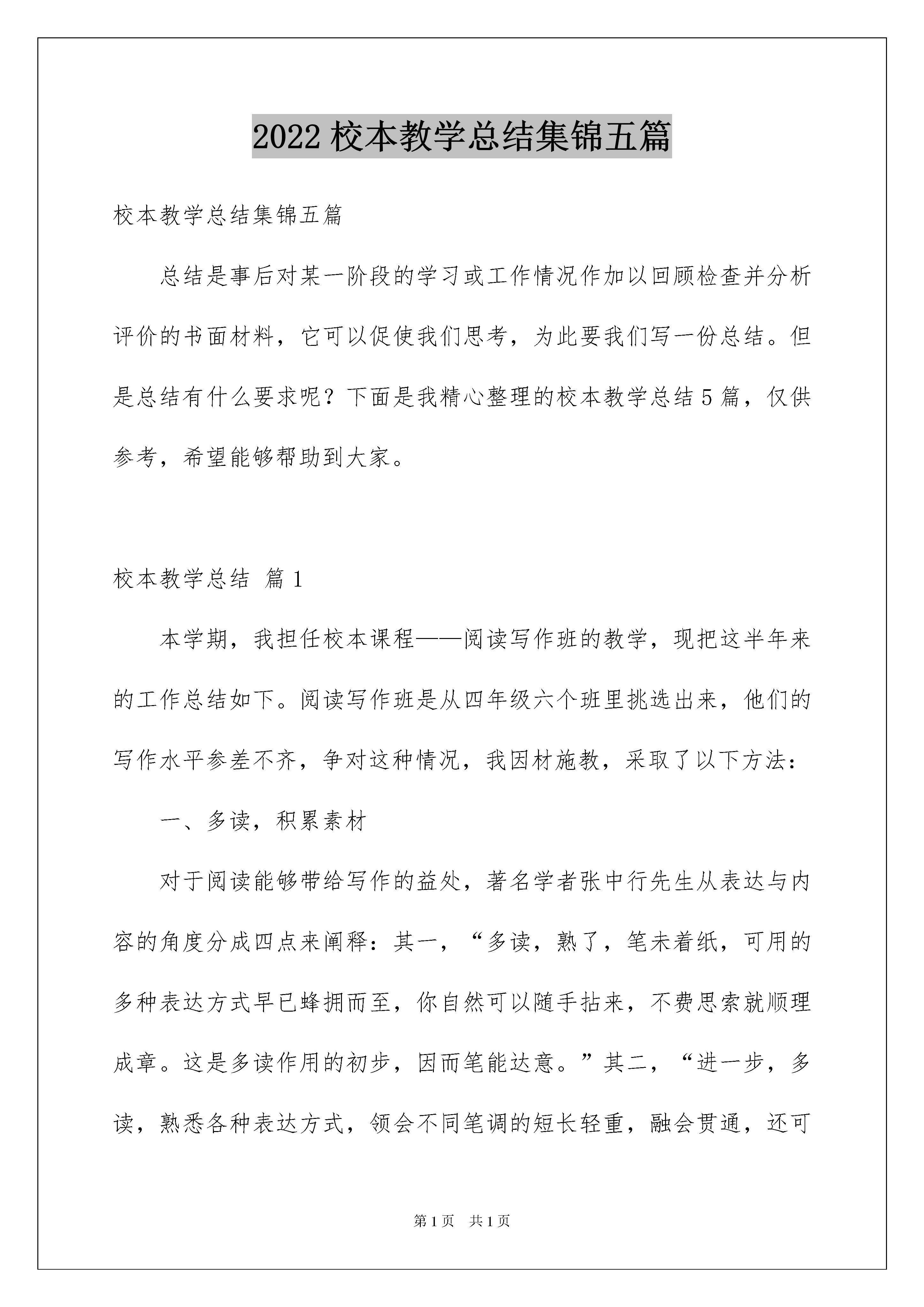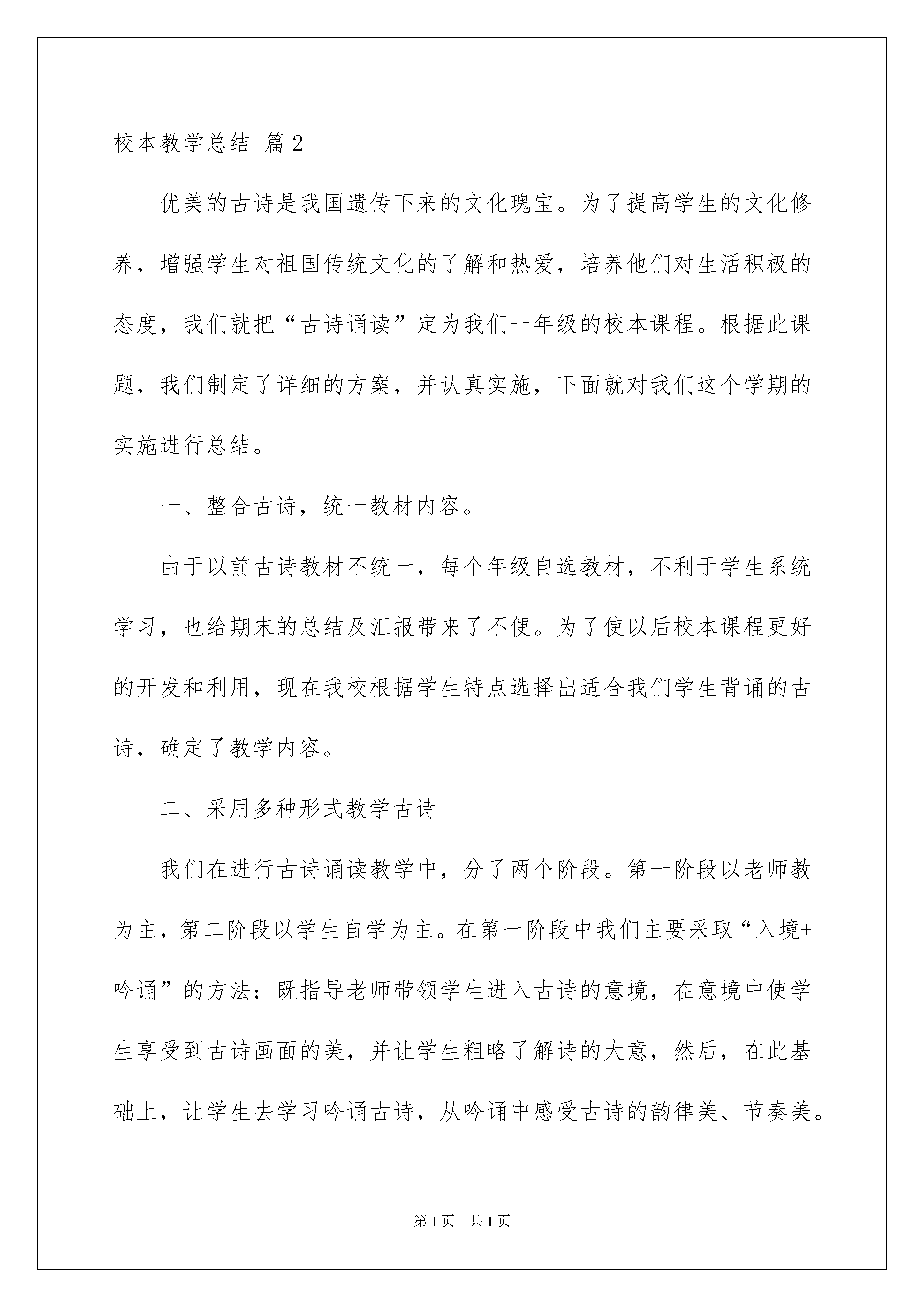 2022校本教学总结集锦五篇校本教学总结集锦五篇总结是事后对某一阶段的学习或工作情况作加以回顾检查并分析评价的书面材料,它可以促使我们思考,为此要我们写一份总结。但是总结有什么要求呢?下面是我精心整理的校本教学总结5篇,仅供参考,希望能够帮助到大家。校本教学总结篇1本学期,我担任校本课程——阅读写作班的教学,现把这半年来的工作总结如下。阅读写作班是从四年级六个班里挑选出来,他们的写作水平参差不齐,争对这种情况,我因材施教,采取了以下方法:一、多读,积累素材对于阅读能够带给写作的益处,著名学者张中行先生从表达与内容的角度分成四点来阐释:其一,“多读,熟了,笔未着纸,可用的多种表达方式早已蜂拥而至,你自然可以随手拈来,不费思索就顺理成章。这是多读作用的初步,因而笔能达意。”其二,“进一步,多读,熟悉各种表达方式,领会不同笔调的短长轻重,融会贯通,还可以推陈出新,把意思表达得更圆通,更生动。”其三,“吸收?思想?(包括各种知识)”。其四,学“思路”,即条理。“多读,熟了,积蓄在两方面增多,既有内容可写,又熟悉如何表达,作文的困难自然就没有了。”对于小学生来说,吸收快,多读了,接触好的文章多了,自然而然地可用的语句就多了,写起来便得心应手;读的更多时,就更加熟悉各种表达方式,还可以锦上添花,把意思表达得更圆满,更生动。这也是古人说的“读书破万卷,下笔如有神”。二、从读学写,在积累上下功夫从习作角度看,习作教学虽然和阅读教学有着明显的不同,但二者关系紧密,阅读是写作的基础,写作是学习运用语言。运用语言,不仅要积累语言,还应了解和掌握一些语言的规律。因此,阅读教学还应该在学生的阅读过程中,以课文为例,教给学生一些有关语言方面的知识以及写作的规律和方法,使学生了解作者是怎样写的,为什么要这样写,从中体会到为了表达一定的内容,作者是怎样准确、生动、鲜明地使用语言的,做到读写结合,从读中学写。而这些,就不是其他课程所必须承担的任务。三、读写结合型的写作训练1、写读后笔记。写读后笔记是学生的练笔过程、思维过程,也是学生生活素材积累、词语积累的一个重要手段。阅读之后,让学生或就着作品蕴含的思想内容联系生活实际写读后感,或摘录好词好句,或体会文章写法。写好后,定时对学生的阅读笔记进行检查,将几篇写得较好的笔记当众读给大家听,让大家有个学习的榜样,也是对写得好的学生的一种鼓励。在教室的学习园地中每周贴几篇好的笔记,让学生看,被选中的学生受到鼓励,其他学生受到启发。这样读写结合,学生逐步养成了写读后笔记的习惯,作文能力也不断提高。2、仿写。分全仿和点仿。全仿既从整体上模仿范文作文,如学完《颐和园》后,可安排学生以《我们的校园》和《我们的教室》等题,要求学习原文,按空间顺序描写和介绍,并展开合情合理的想像。这样,便把读与写有机结合起来了,达到了篇与篇读写迁移的目的。所谓“点仿”就是局部模仿范文作文的方式。一篇文章或一段话,可信这“点”很多,我们可以抓住句式表达、段落构成、开头结尾、过渡照应、抒情联想、描写议论等这几个点进行分项仿写。3、改写。改写可以加深学生对文体的理解和记忆,可以让学生懂得同样的意思可以用不的方式表达出来。因此,选择适当材料,进行改写练习,是很有意义的。如在教学完《黄鹤楼送孟浩然之广陵》后,我让学生把它改成了剧本,然后让学生根据自己写的剧本表演,这样既熟悉了课文,又提高了写作能力,又培养了表演能力。改写还可以改变叙述顺序,改变人称,改变故事结局,改变表达方式等。4、扩写和缩写。对于那些比较简短的文章,扩写既能加深学生对课文内容的理解,又能培养学生的想像能力和思维能力。缩写,在不改变原文的中心思想,主要内容,基本结构,顺序和体裁,对长文章压缩,使之成为短篇短段。5、续写。在课文的基础上让学生写出的结果既符合情节的发展,又融入了自己的想像,给文章添上了一个较圆满的结局。对小学生而言,作文难,怕作文是普遍存在的问题,要化写作文的消极态度,变积极态度,除了要熟悉生活,认真观察,善于积累,还要学会阅读,博览群书,搜集资料,并将阅读成为每个学生的自觉行动,那么当前学生怕作文、厌作文的情境一定会得到改观的,学生的全面发展才不至于成为一句空谈。校本教学总结篇2优美的古诗是我国遗传下来的文化瑰宝。为了提高学生的文化修养,增强学生对祖国传统文化的了解和热爱,培养他们对生活积极的态度,我们就把“古诗诵读”定为我们一年级的校本课程。根据此课题,我们制定了详细的方案,并认真实施,下面就对我们这个学期的实施进行总结。一、整合古诗,统一教材内容。由于以前古诗教材不统一,每个年级自选教材,不利于学生系统学习,也给期
