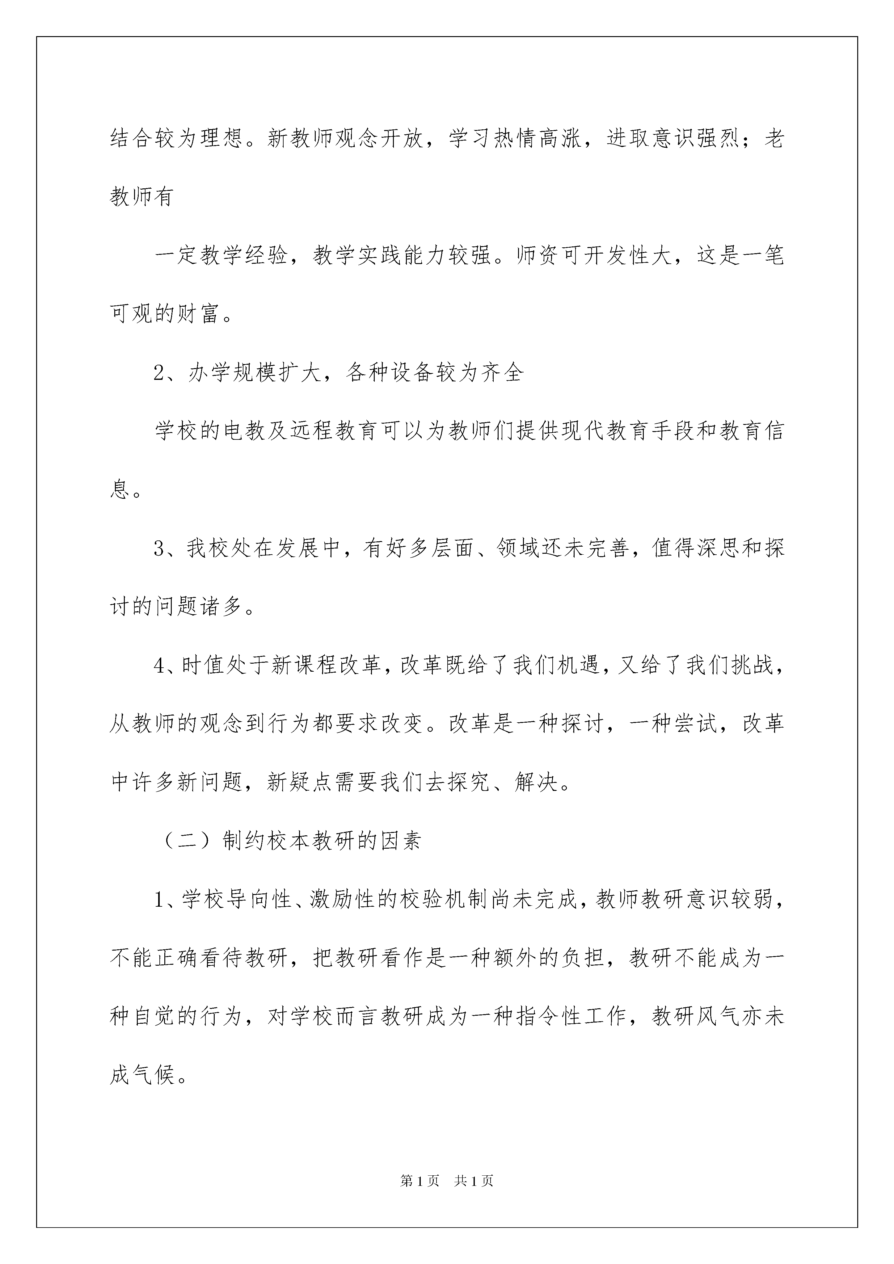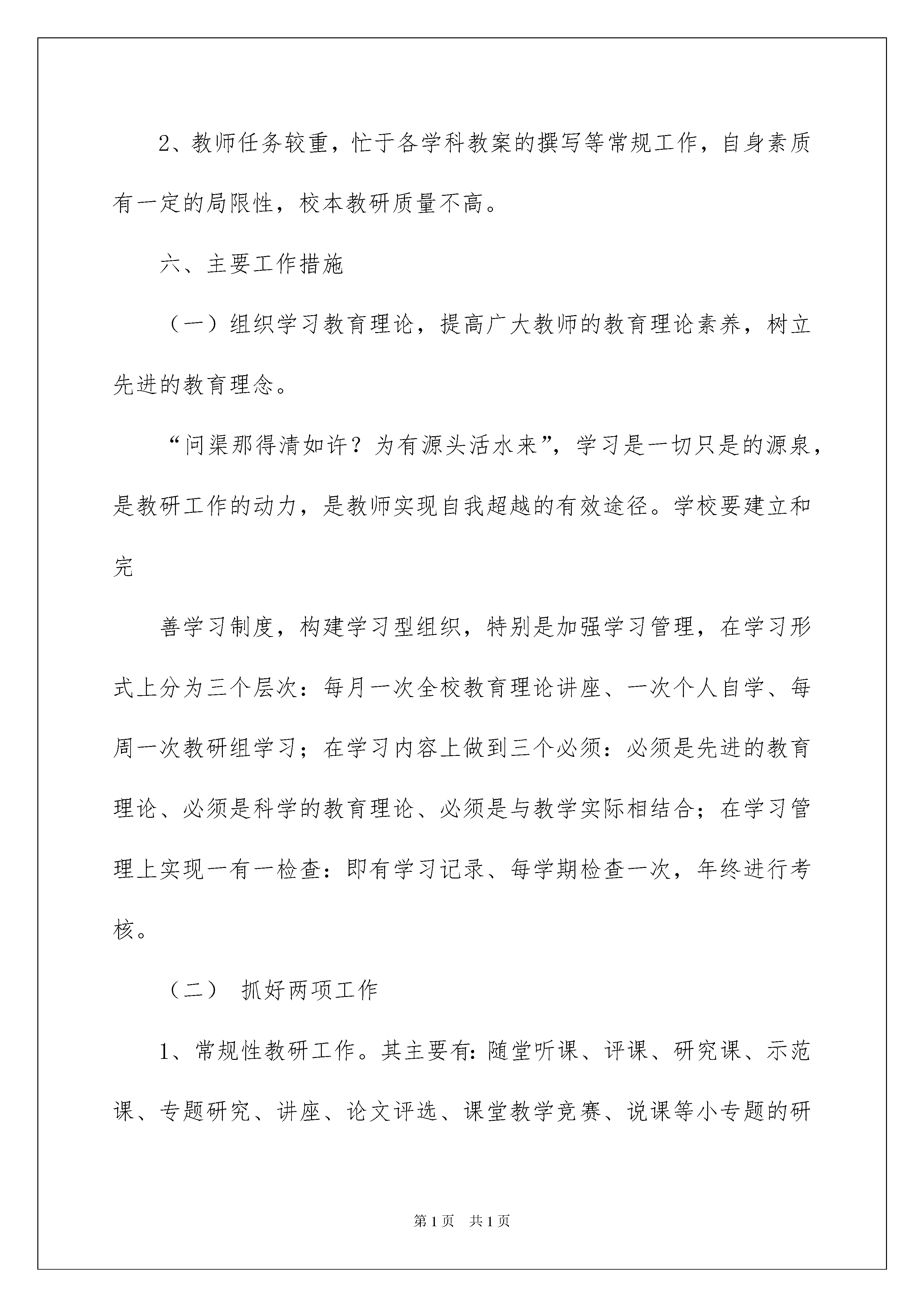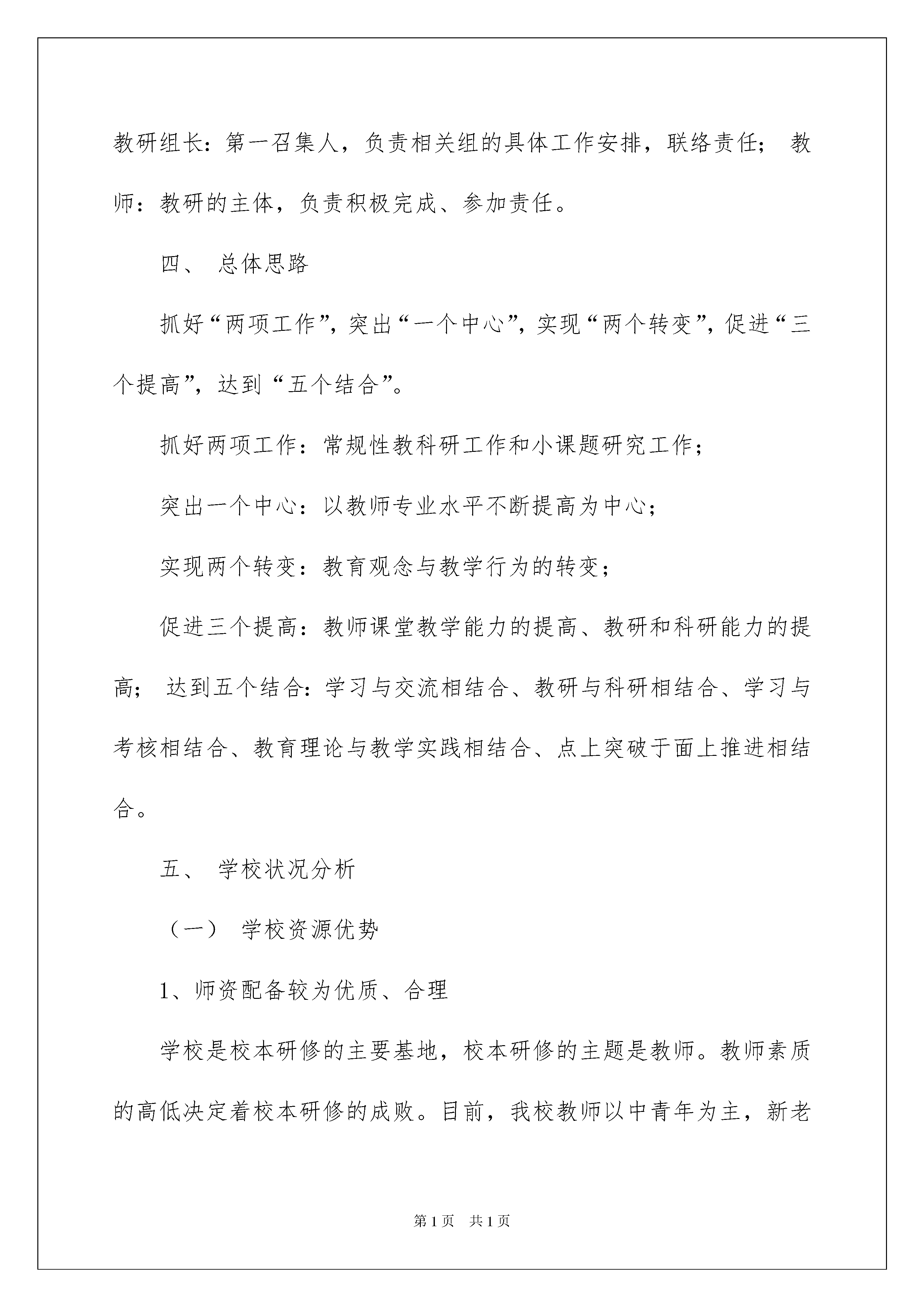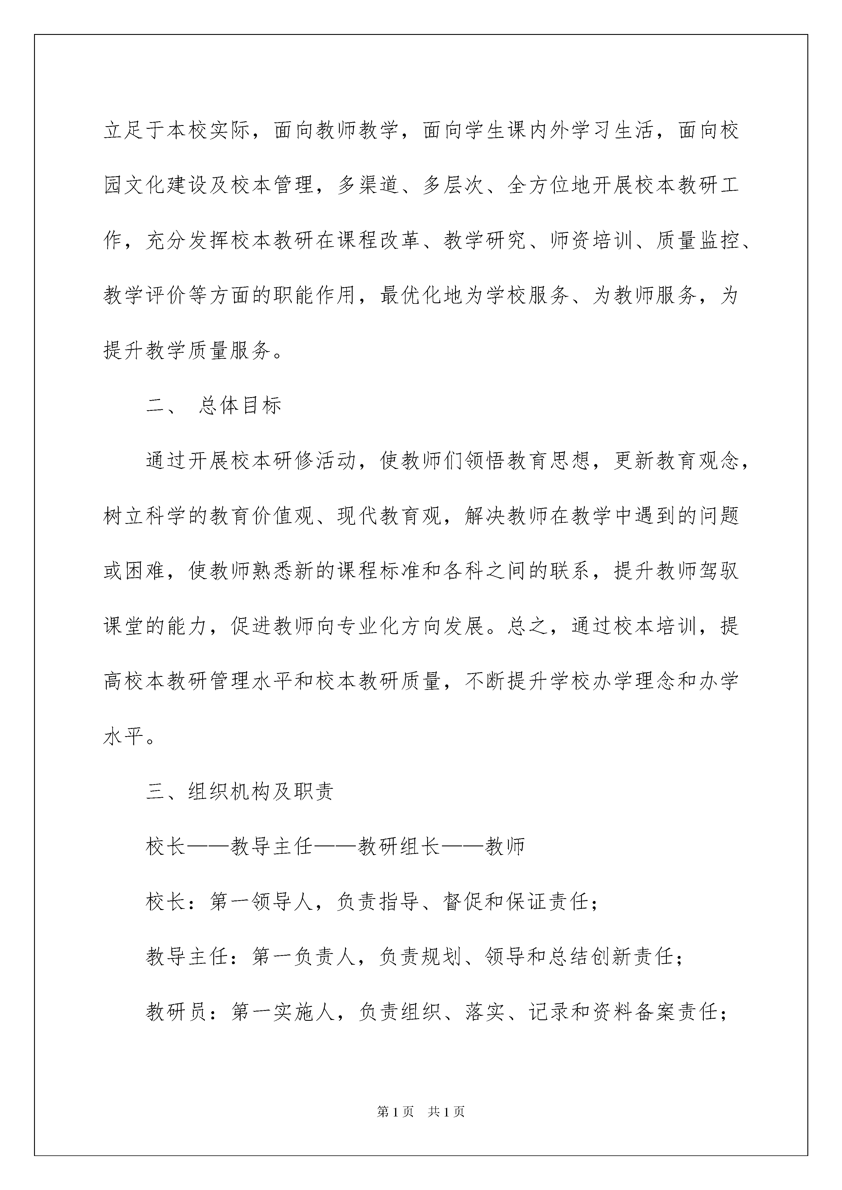 2022校本研修工作计划15篇校本研修工作计划人生天地之间,若白驹过隙,忽然而已,我们又将迎来新的喜悦、新的收获,是时候抽出时间写写计划了。我们该怎么拟定计划呢?以下是我精心整理的校本研修工作计划,欢迎大家分享。校本研修工作计划1新学年伊始,为足时、足量、有效地开展我校教育教学工作,充分发挥校本培训为教师发展服务、为教学质量提升服务的导向功能,从而促进我校的教育教学综合改革和发展,优化教学管理,全面提升教学质量,最终实现教师的成长、学生的进步和学校教学工作的发展。为此,根据县局和县教研室工作的部署,结合我校实际,特制定以下计划:一、指导思想坚持以人为本的教育思想,以推进素质教育为中心,以落实科学发展观为指导,以全面提升教育教学质量为宗旨,以改革为动力,以教学质量目标管理和教科研目标管理为手段,以课程改革为突破口,立足于本校实际,面向教师教学,面向学生课内外学习生活,面向校园文化建设及校本管理,多渠道、多层次、全方位地开展校本教研工作,充分发挥校本教研在课程改革、教学研究、师资培训、质量监控、教学评价等方面的职能作用,最优化地为学校服务、为教师服务,为提升教学质量服务。二、总体目标通过开展校本研修活动,使教师们领悟教育思想,更新教育观念,树立科学的教育价值观、现代教育观,解决教师在教学中遇到的问题或困难,使教师熟悉新的课程标准和各科之间的联系,提升教师驾驭课堂的能力,促进教师向专业化方向发展。总之,通过校本培训,提高校本教研管理水平和校本教研质量,不断提升学校办学理念和办学水平。三、组织机构及职责校长——教导主任——教研组长——教师校长:第一领导人,负责指导、督促和保证责任;教导主任:第一负责人,负责规划、领导和总结创新责任;教研员:第一实施人,负责组织、落实、记录和资料备案责任;教研组长:第一召集人,负责相关组的具体工作安排,联络责任;教师:教研的主体,负责积极完成、参加责任。四、总体思路抓好“两项工作”,突出“一个中心”,实现“两个转变”,促进“三个提高”,达到“五个结合”。抓好两项工作:常规性教科研工作和小课题研究工作;突出一个中心:以教师专业水平不断提高为中心;实现两个转变:教育观念与教学行为的转变;促进三个提高:教师课堂教学能力的提高、教研和科研能力的提高;达到五个结合:学习与交流相结合、教研与科研相结合、学习与考核相结合、教育理论与教学实践相结合、点上突破于面上推进相结合。五、学校状况分析(一)学校资源优势1、师资配备较为优质、合理学校是校本研修的主要基地,校本研修的主题是教师。教师素质的高低决定着校本研修的成败。目前,我校教师以中青年为主,新老结合较为理想。新教师观念开放,学习热情高涨,进取意识强烈;老教师有一定教学经验,教学实践能力较强。师资可开发性大,这是一笔可观的财富。2、办学规模扩大,各种设备较为齐全学校的电教及远程教育可以为教师们提供现代教育手段和教育信息。3、我校处在发展中,有好多层面、领域还未完善,值得深思和探讨的问题诸多。4、时值处于新课程改革,改革既给了我们机遇,又给了我们挑战,从教师的观念到行为都要求改变。改革是一种探讨,一种尝试,改革中许多新问题,新疑点需要我们去探究、解决。(二)制约校本教研的因素1、学校导向性、激励性的校验机制尚未完成,教师教研意识较弱,不能正确看待教研,把教研看作是一种额外的负担,教研不能成为一种自觉的行为,对学校而言教研成为一种指令性工作,教研风气亦未成气候。2、教师任务较重,忙于各学科教案的撰写等常规工作,自身素质有一定的局限性,校本教研质量不高。六、主要工作措施(一)组织学习教育理论,提高广大教师的教育理论素养,树立先进的教育理念。“问渠那得清如许?为有源头活水来”,学习是一切只是的源泉,是教研工作的动力,是教师实现自我超越的有效途径。学校要建立和完善学习制度,构建学习型组织,特别是加强学习管理,在学习形式上分为三个层次:每月一次全校教育理论讲座、一次个人自学、每周一次教研组学习;在学习内容上做到三个必须:必须是先进的教育理论、必须是科学的教育理论、必须是与教学实际相结合;在学习管理上实现一有一检查:即有学习记录、每学期检查一次,年终进行考核。(二)抓好两项工作1、常规性教研工作。其主要有:随堂听课、评课、研究课、示范课、专题研究、讲座、论文评选、课堂教学竞赛、说课等小专题的研究活动。2、课题研究工作课题研究是教科研工作中的一项最实在、最系统、最深入、最能集中体现教科研主体性,也是最能展示教科研成果的重要工作。我校围绕校本实际确定一段时间内的总课题,再由各教研组根据总课题所涉及的主要内容和范围分别确定若干子课题