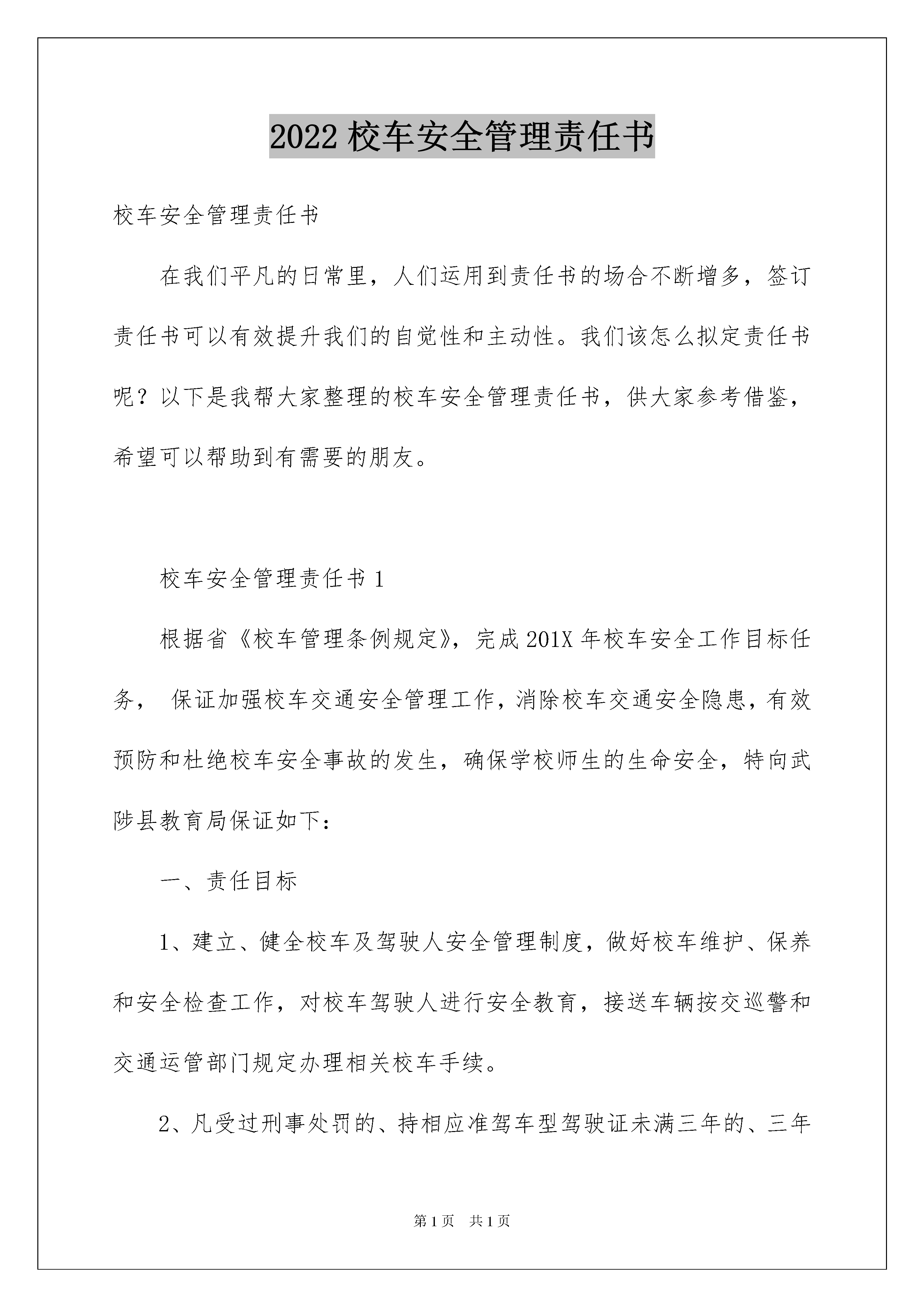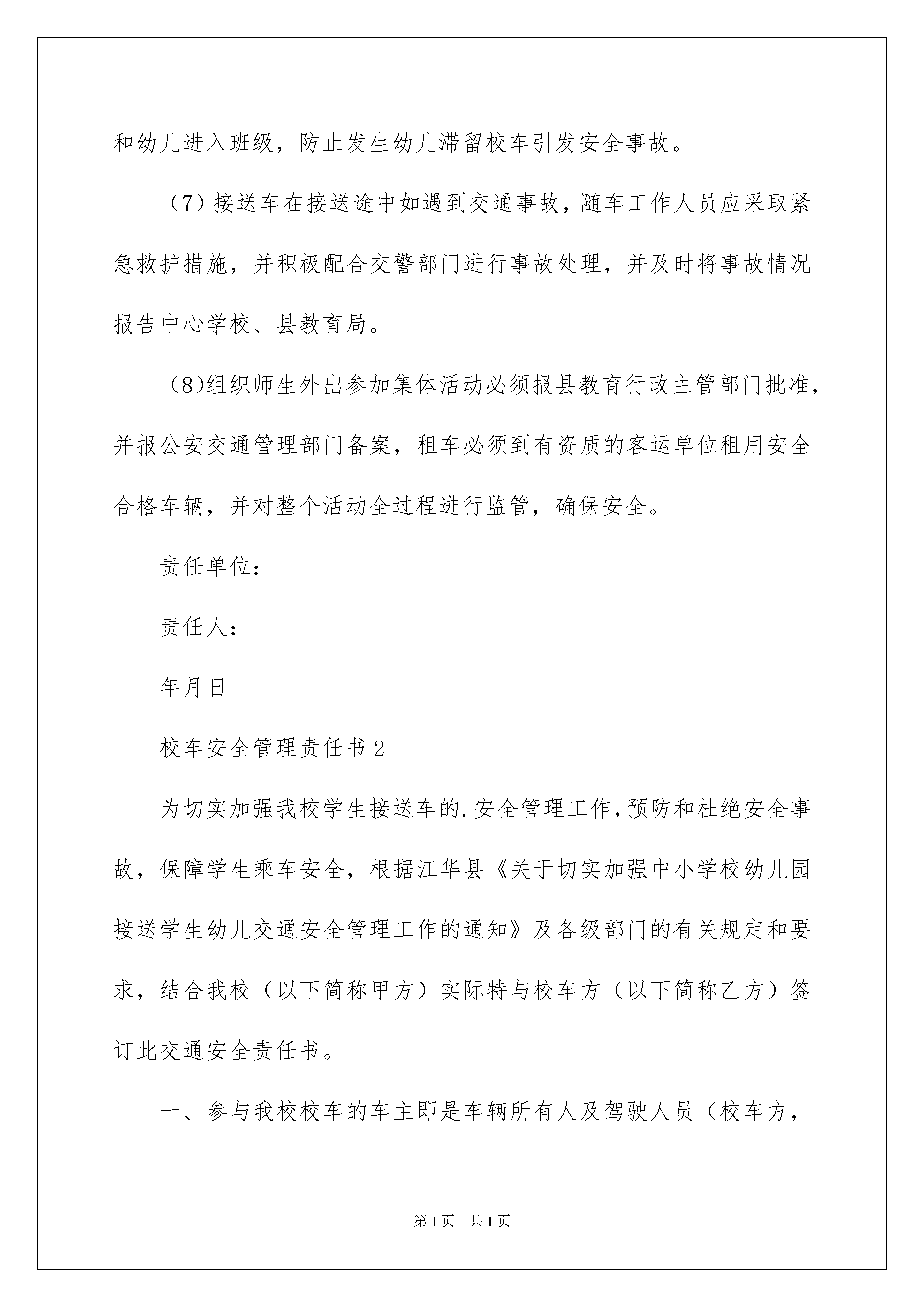 2022校车安全管理责任书校车安全管理责任书在我们平凡的日常里,人们运用到责任书的场合不断增多,签订责任书可以有效提升我们的自觉性和主动性。我们该怎么拟定责任书呢?以下是我帮大家整理的校车安全管理责任书,供大家参考借鉴,希望可以帮助到有需要的朋友。校车安全管理责任书1根据省《校车管理条例规定》,完成201X年校车安全工作目标任务,保证加强校车交通安全管理工作,消除校车交通安全隐患,有效预防和杜绝校车安全事故的发生,确保学校师生的生命安全,特向武陟县教育局保证如下:一、责任目标1、建立、健全校车及驾驶人安全管理制度,做好校车维护、保养和安全检查工作,对校车驾驶人进行安全教育,接送车辆按交巡警和交通运管部门规定办理相关校车手续。2、凡受过刑事处罚的、持相应准驾车型驾驶证未满三年的、三年内发生致人伤亡交通责任事故或三年内任一记分周期内累积记分满12分的驾驶人,一律不得驾驶校车;3、杜绝使用无营运资格的社会车辆和明令禁止的其它车辆接送学生和在园幼儿;4、教育司乘人员做到接送车辆不超员,不超速,不违规;5、落实责任,常抓不懈,预防避免各类交通事故发生。二、工作任务1、充分认识交通安全工作的重要性,坚决克服麻痹和侥幸心理,增强安全意识,定期开展交通法规的学习宣传和教育活动,做到责任到人,措施到位,切实把安全工作落到实处,防止接送车辆交通安全事故发生。2、认真落实车辆接送工作领导责任制。建立健全接送车辆管理工作的组织机构,实行一把手负责制。校长在每学期第一周内,与班主任老师、跟车护送老师、接送车车主、驾驶员、学生、家长等层层签订校车安全管理责任状。3、积极配合当地政府、派出所、交巡警中队、交通运管等部门做好接送车辆安全管理,定期开展接送车辆的排查整治工作。4、建立交通安全督查员制度。每天上放学期间,在学生接送车停车点进行现场督查,及时发现制止接送学生车辆超员、校车驾驶人酒后驾驶等交通违法行为。发现学生乘坐非法接送车辆的,要及时进行劝阻,同时报告学校,校方要及时与家长沟通,提醒家长不要让学生乘坐非法接送车辆,必要时可采用摄像、摄影等措施固定证据,移交公安交巡警或交通运管部门予以处罚。5、深入开展交通安全教育宣传"进校园"活动,定期开展多种形式的交通安全宣传活动,通过交通安全知识和道路交通安全法律、法规的宣传教育,教育学生不乘坐非法营运的车辆,提高学生自我交通安全防护意识。6、及时到县教育局备案,保证认真做好以下工作:(1)建立健全校车安全管理制度,做到一次一档,做到校车安全检查、维护保养、驾驶员及跟车管理人员职责明确,确保学生和在园幼儿乘车过程中每个环节的安全。要制定应急预案,有效处置突发事故。校车要主动接受公安交通管理部门和县教育行政主管部门的监督、检查。(2)校车的安全技术状况符合《机动车运行安全技术条件》规定的国家标准,为校车购买第三者责任险和乘座险。在按规定进行年审外,每学期开学前应当进行一次安全技术检验。年检和技术检验合格,方可投入使用。(3)驾驶员必须持证上岗,具有丰富的驾驶经验,工作认真负责、细心,关爱乘车学生和幼儿。严禁非专职驾驶员开接送车。(4)凡需乘坐接送车的中小学生和在园幼儿,应由其家长提出书面申请,得到所在学校和幼儿园的认可,并与家长签定安全协议书,明确双方责任。(5)校车使用前应当上报教育行政主管部门和公安交通管理部门核准并备案,办理统一的校车标识、标牌,方可上路使用。幼儿园自备、承租用于接送幼儿的车辆,必须是具有合格资质的客运车辆,严禁使用拼装车、报废车、货运车、大小三轮车和个人机动车接送幼儿。未经教育行政主管部门和公安交通管理部门批准许可的车辆,一律不得接送幼儿。(6)应选择安全地点设置接送车停靠站,中途不得随意停车接送。每辆车应配备1—2名随车工作人员,负责做好学生和幼儿上、下车安全及与家长、班主任的交接工作。接送车到达校园后要统一组织学生和幼儿进入班级,防止发生幼儿滞留校车引发安全事故。(7)接送车在接送途中如遇到交通事故,随车工作人员应采取紧急救护措施,并积极配合交警部门进行事故处理,并及时将事故情况报告中心学校、县教育局。(8)组织师生外出参加集体活动必须报县教育行政主管部门批准,并报公安交通管理部门备案,租车必须到有资质的客运单位租用安全合格车辆,并对整个活动全过程进行监管,确保安全。责任单位:责任人:年月日校车安全管理责任书2为切实加强我校学生接送车的.安全管理工作,预防和杜绝安全事故,保障学生乘车安全,根据江华县《关于切实加强中小学校幼儿园接送学生幼儿交通安全管理工作的通知》及各级部门的有关规定和要求,结合我校(以下简称甲方)实际特与校车方(以