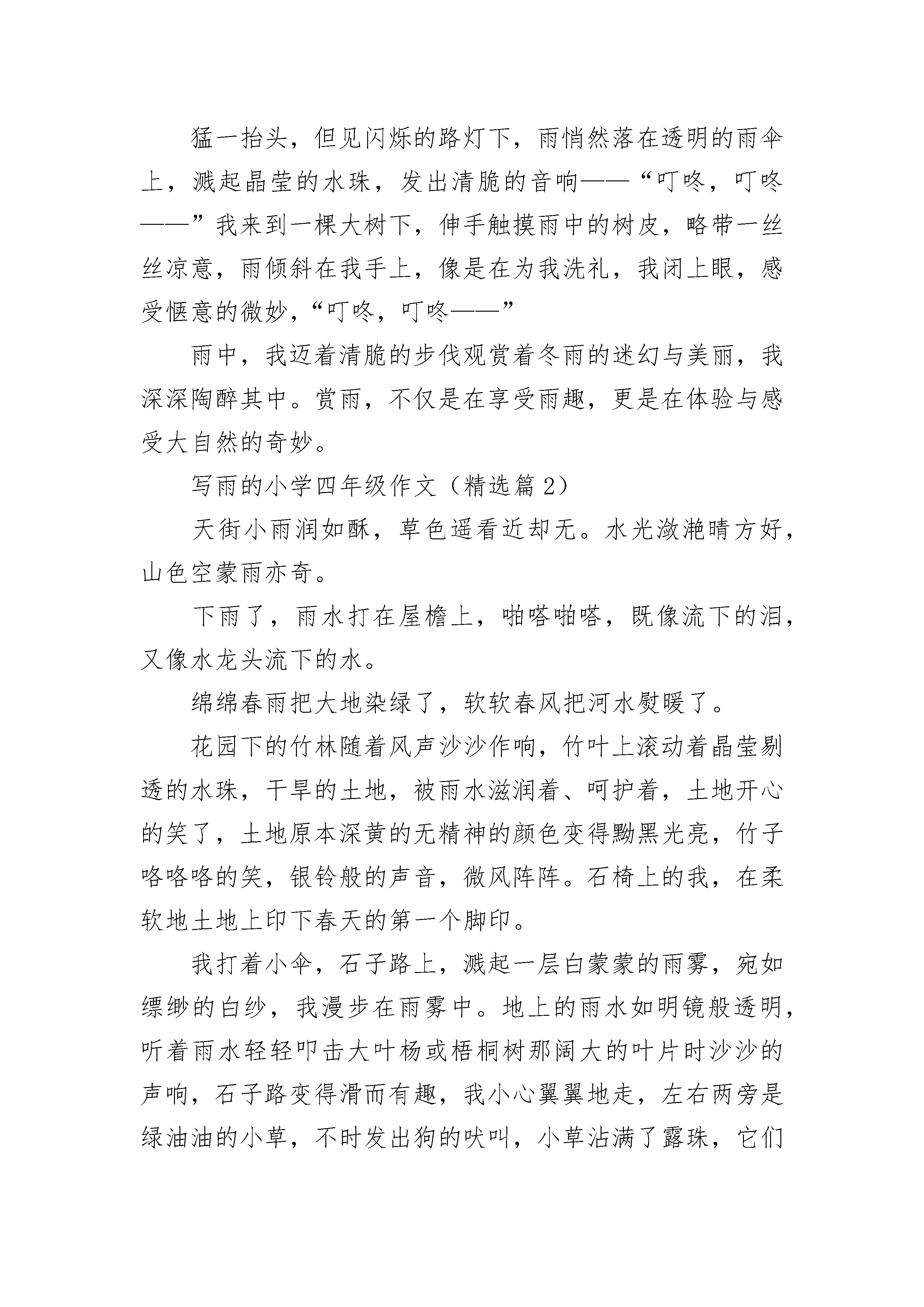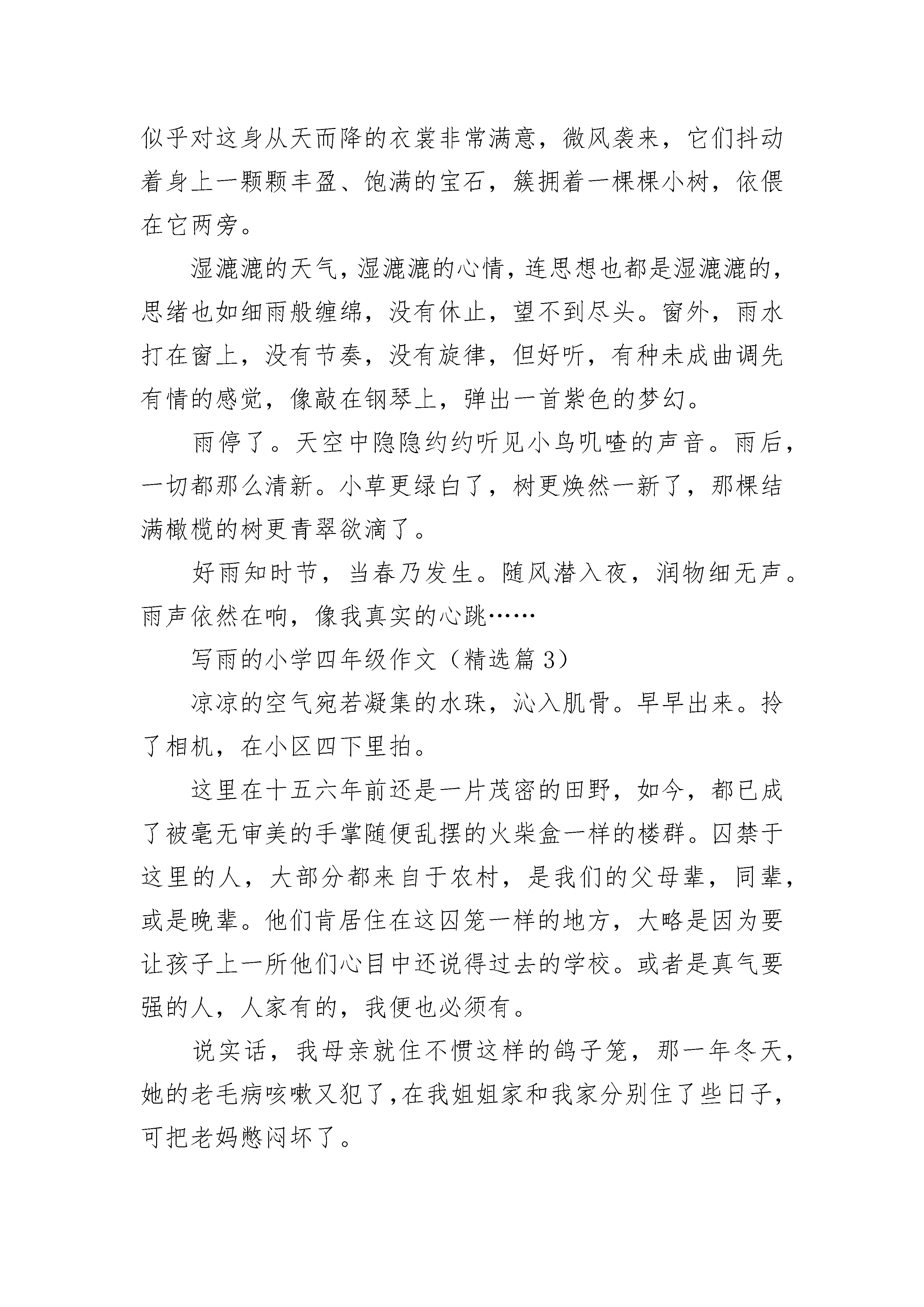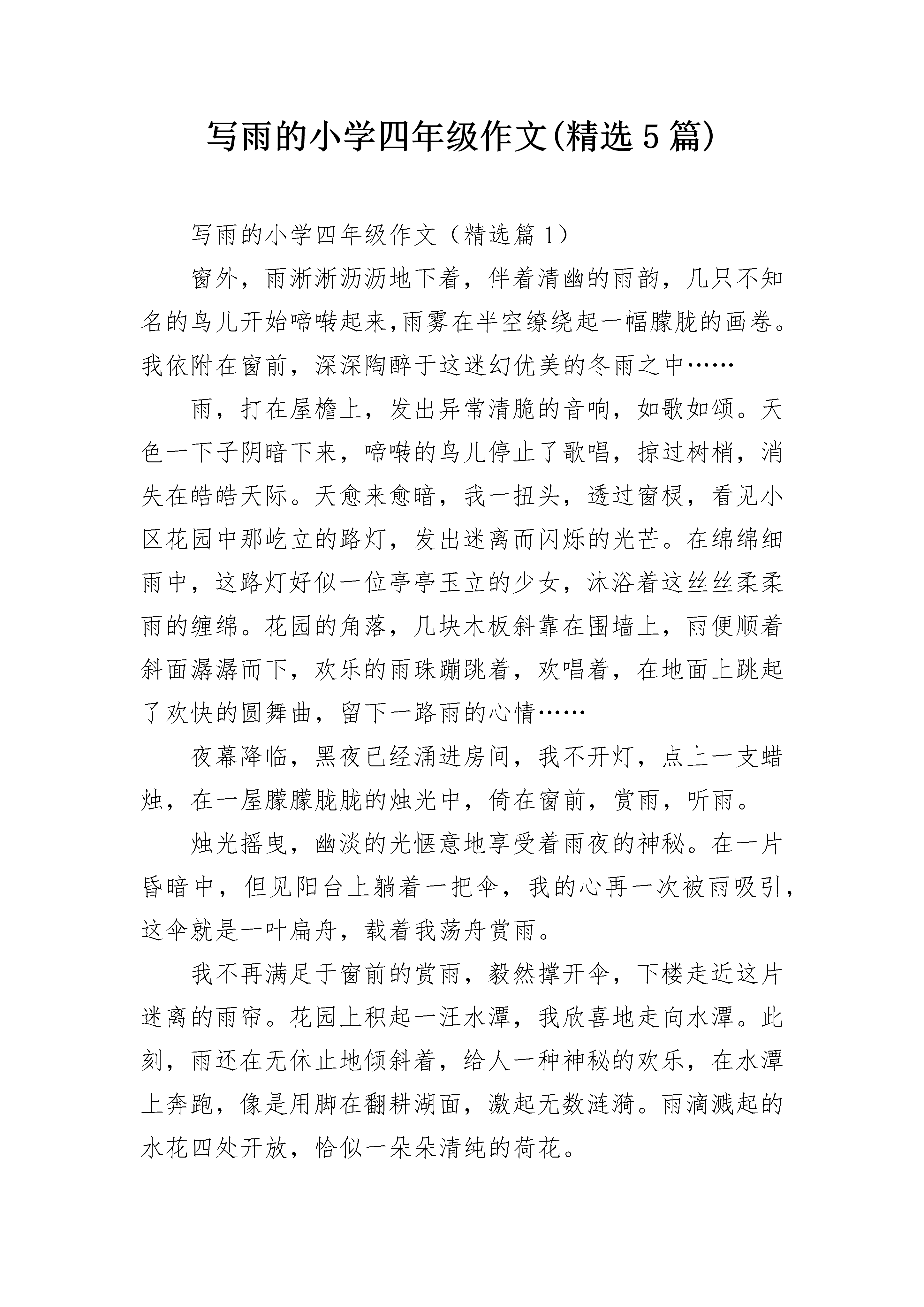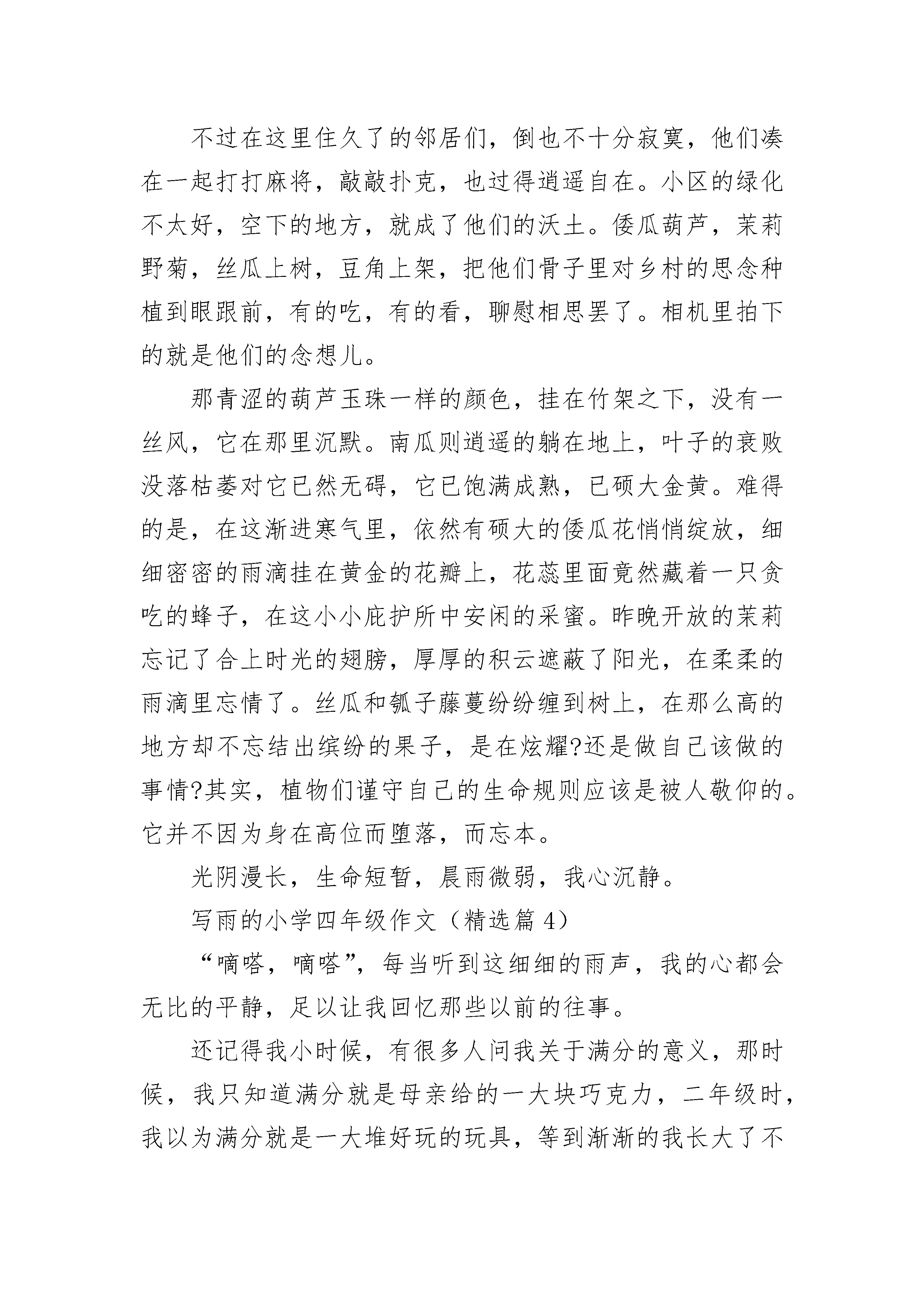 写雨的小学四年级作文(精选5篇)写雨的小学四年级作文(精选篇1)窗外,雨淅淅沥沥地下着,伴着清幽的雨韵,几只不知名的鸟儿开始啼啭起来,雨雾在半空缭绕起一幅朦胧的画卷。我依附在窗前,深深陶醉于这迷幻优美的冬雨之中……雨,打在屋檐上,发出异常清脆的音响,如歌如颂。天色一下子阴暗下来,啼啭的鸟儿停止了歌唱,掠过树梢,消失在皓皓天际。天愈来愈暗,我一扭头,透过窗棂,看见小区花园中那屹立的路灯,发出迷离而闪烁的光芒。在绵绵细雨中,这路灯好似一位亭亭玉立的少女,沐浴着这丝丝柔柔雨的缠绵。花园的角落,几块木板斜靠在围墙上,雨便顺着斜面潺潺而下,欢乐的雨珠蹦跳着,欢唱着,在地面上跳起了欢快的圆舞曲,留下一路雨的心情……夜幕降临,黑夜已经涌进房间,我不开灯,点上一支蜡烛,在一屋朦朦胧胧的烛光中,倚在窗前,赏雨,听雨。烛光摇曳,幽淡的光惬意地享受着雨夜的神秘。在一片昏暗中,但见阳台上躺着一把伞,我的心再一次被雨吸引,这伞就是一叶扁舟,载着我荡舟赏雨。我不再满足于窗前的赏雨,毅然撑开伞,下楼走近这片迷离的雨帘。花园上积起一汪水潭,我欣喜地走向水潭。此刻,雨还在无休止地倾斜着,给人一种神秘的欢乐,在水潭上奔跑,像是用脚在翻耕湖面,激起无数涟漪。雨滴溅起的水花四处开放,恰似一朵朵清纯的荷花。猛一抬头,但见闪烁的路灯下,雨悄然落在透明的雨伞上,溅起晶莹的水珠,发出清脆的音响——“叮咚,叮咚——”我来到一棵大树下,伸手触摸雨中的树皮,略带一丝丝凉意,雨倾斜在我手上,像是在为我洗礼,我闭上眼,感受惬意的微妙,“叮咚,叮咚——”雨中,我迈着清脆的步伐观赏着冬雨的迷幻与美丽,我深深陶醉其中。赏雨,不仅是在享受雨趣,更是在体验与感受大自然的奇妙。写雨的小学四年级作文(精选篇2)天街小雨润如酥,草色遥看近却无。水光潋滟晴方好,山色空蒙雨亦奇。下雨了,雨水打在屋檐上,啪嗒啪嗒,既像流下的泪,又像水龙头流下的水。绵绵春雨把大地染绿了,软软春风把河水熨暖了。花园下的竹林随着风声沙沙作响,竹叶上滚动着晶莹剔透的水珠,干旱的土地,被雨水滋润着、呵护着,土地开心的笑了,土地原本深黄的无精神的颜色变得黝黑光亮,竹子咯咯咯的笑,银铃般的声音,微风阵阵。石椅上的我,在柔软地土地上印下春天的第一个脚印。我打着小伞,石子路上,溅起一层白蒙蒙的雨雾,宛如缥缈的白纱,我漫步在雨雾中。地上的雨水如明镜般透明,听着雨水轻轻叩击大叶杨或梧桐树那阔大的叶片时沙沙的声响,石子路变得滑而有趣,我小心翼翼地走,左右两旁是绿油油的小草,不时发出狗的吠叫,小草沾满了露珠,它们似乎对这身从天而降的衣裳非常满意,微风袭来,它们抖动着身上一颗颗丰盈、饱满的宝石,簇拥着一棵棵小树,依偎在它两旁。湿漉漉的天气,湿漉漉的心情,连思想也都是湿漉漉的,思绪也如细雨般缠绵,没有休止,望不到尽头。窗外,雨水打在窗上,没有节奏,没有旋律,但好听,有种未成曲调先有情的感觉,像敲在钢琴上,弹出一首紫色的梦幻。雨停了。天空中隐隐约约听见小鸟叽喳的声音。雨后,一切都那么清新。小草更绿白了,树更焕然一新了,那棵结满橄榄的树更青翠欲滴了。好雨知时节,当春乃发生。随风潜入夜,润物细无声。雨声依然在响,像我真实的心跳……写雨的小学四年级作文(精选篇3)凉凉的空气宛若凝集的水珠,沁入肌骨。早早出来。拎了相机,在小区四下里拍。这里在十五六年前还是一片茂密的田野,如今,都已成了被毫无审美的手掌随便乱摆的火柴盒一样的楼群。囚禁于这里的人,大部分都来自于农村,是我们的父母辈,同辈,或是晚辈。他们肯居住在这囚笼一样的地方,大略是因为要让孩子上一所他们心目中还说得过去的学校。或者是真气要强的人,人家有的,我便也必须有。说实话,我母亲就住不惯这样的鸽子笼,那一年冬天,她的老毛病咳嗽又犯了,在我姐姐家和我家分别住了些日子,可把老妈憋闷坏了。不过在这里住久了的邻居们,倒也不十分寂寞,他们凑在一起打打麻将,敲敲扑克,也过得逍遥自在。小区的绿化不太好,空下的地方,就成了他们的沃土。倭瓜葫芦,茉莉野菊,丝瓜上树,豆角上架,把他们骨子里对乡村的思念种植到眼跟前,有的吃,有的看,聊慰相思罢了。相机里拍下的就是他们的念想儿。那青涩的葫芦玉珠一样的颜色,挂在竹架之下,没有一丝风,它在那里沉默。南瓜则逍遥的躺在地上,叶子的衰败没落枯萎对它已然无碍,它已饱满成熟,已硕大金黄。难得的是,在这渐进寒气里,依然有硕大的倭瓜花悄悄绽放,细细密密的雨滴挂在黄金的花瓣上,花蕊里面竟然藏着一只贪吃的蜂子,在这小小庇护所中安闲的采蜜。昨晚开放的茉莉忘记了合上时光的翅膀,厚厚的积云遮蔽了阳光,在柔柔的雨滴里忘情了。丝瓜和瓠子藤蔓纷纷缠到树上,在那么高的地方却不忘结出缤纷的果子,是在炫耀?还是做自己该做的事情?其实,植物们谨守自己的生命规则应该是被人敬仰的。它并不因为身在高位而堕落,而忘本。光阴漫长