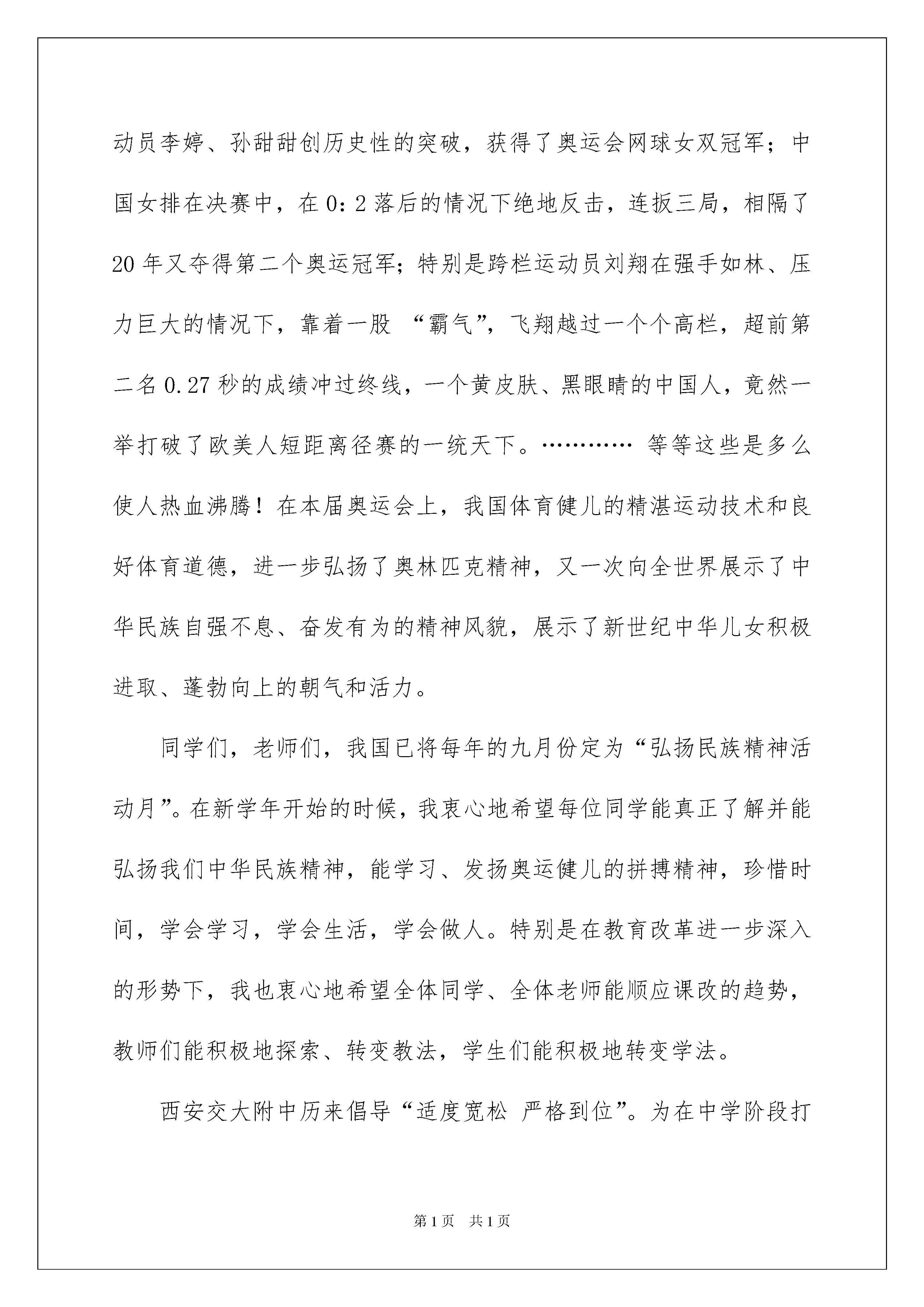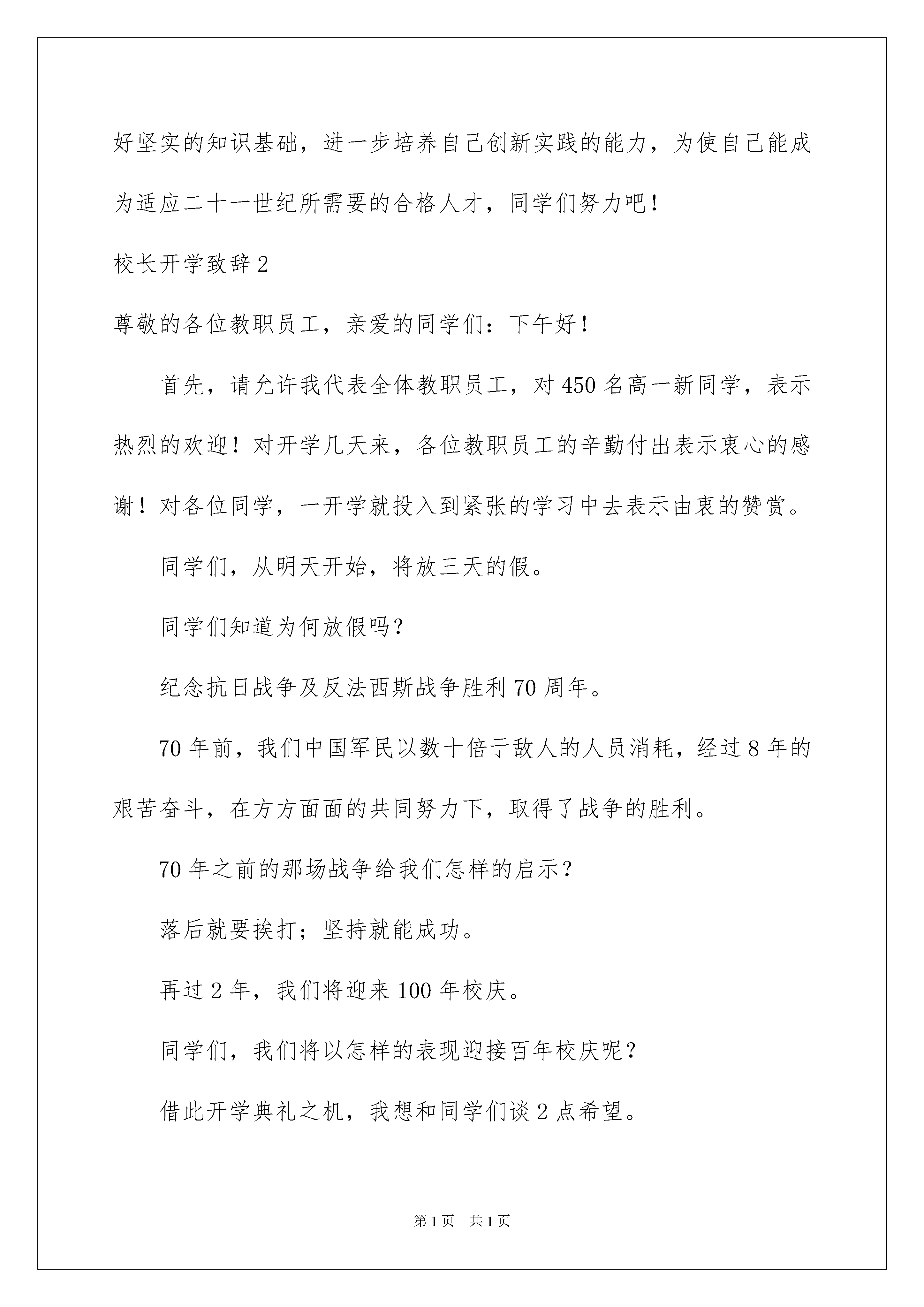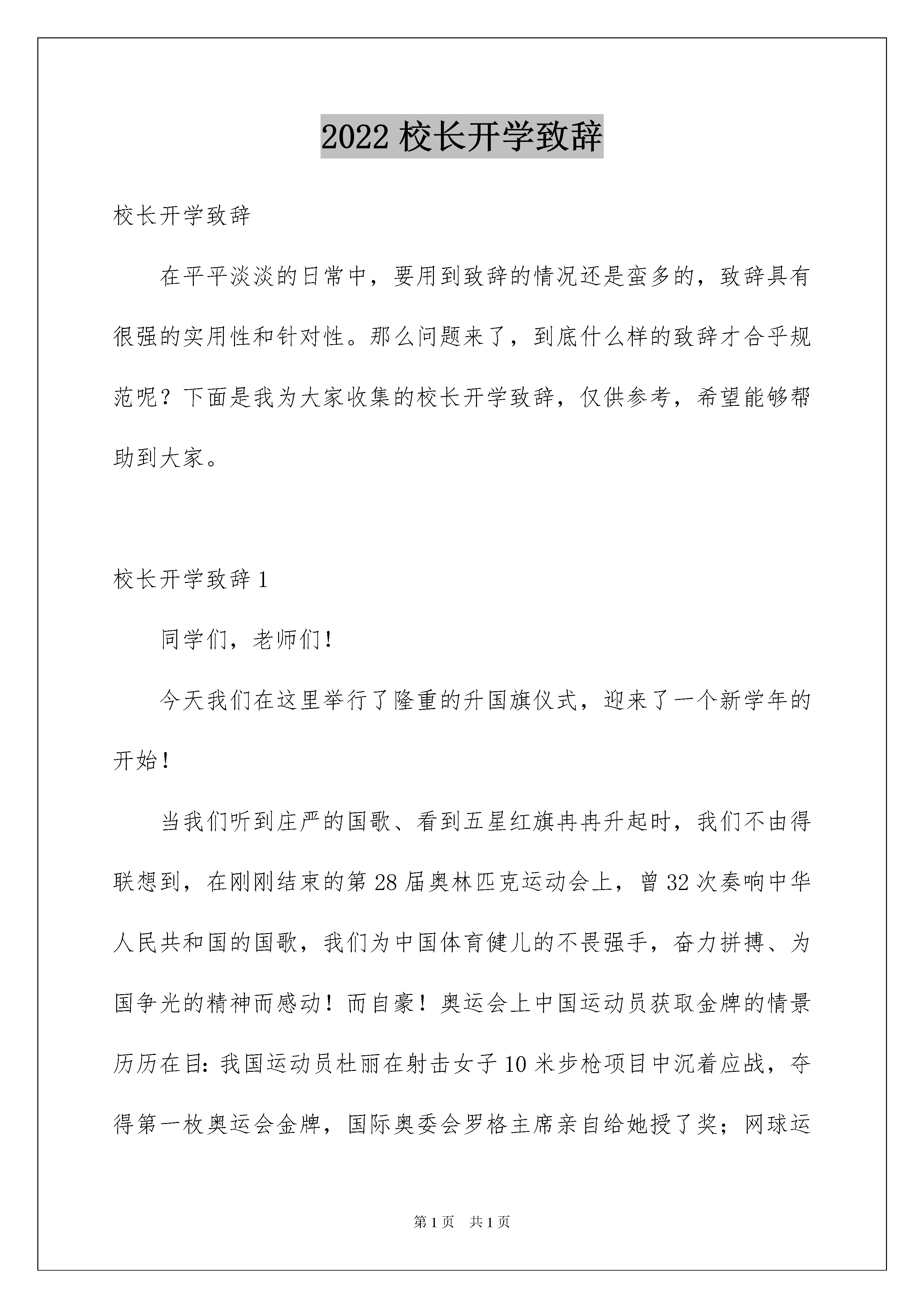 2022校长开学致辞校长开学致辞在平平淡淡的日常中,要用到致辞的情况还是蛮多的,致辞具有很强的实用性和针对性。那么问题来了,到底什么样的致辞才合乎规范呢?下面是我为大家收集的校长开学致辞,仅供参考,希望能够帮助到大家。校长开学致辞1同学们,老师们!今天我们在这里举行了隆重的升国旗仪式,迎来了一个新学年的开始!当我们听到庄严的国歌、看到五星红旗冉冉升起时,我们不由得联想到,在刚刚结束的第28届奥林匹克运动会上,曾32次奏响中华人民共和国的国歌,我们为中国体育健儿的不畏强手,奋力拼搏、为国争光的精神而感动!而自豪!奥运会上中国运动员获取金牌的情景历历在目:我国运动员杜丽在射击女子10米步枪项目中沉着应战,夺得第一枚奥运会金牌,国际奥委会罗格主席亲自给她授了奖;网球运动员李婷、孙甜甜创历史性的突破,获得了奥运会网球女双冠军;中国女排在决赛中,在0:2落后的情况下绝地反击,连扳三局,相隔了20年又夺得第二个奥运冠军;特别是跨栏运动员刘翔在强手如林、压力巨大的情况下,靠着一股“霸气”,飞翔越过一个个高栏,超前第二名0.27秒的成绩冲过终线,一个黄皮肤、黑眼睛的中国人,竟然一举打破了欧美人短距离径赛的一统天下。…………等等这些是多么使人热血沸腾!在本届奥运会上,我国体育健儿的精湛运动技术和良好体育道德,进一步弘扬了奥林匹克精神,又一次向全世界展示了中华民族自强不息、奋发有为的精神风貌,展示了新世纪中华儿女积极进取、蓬勃向上的朝气和活力。同学们,老师们,我国已将每年的九月份定为“弘扬民族精神活动月”。在新学年开始的时候,我衷心地希望每位同学能真正了解并能弘扬我们中华民族精神,能学习、发扬奥运健儿的拼搏精神,珍惜时间,学会学习,学会生活,学会做人。特别是在教育改革进一步深入的形势下,我也衷心地希望全体同学、全体老师能顺应课改的趋势,教师们能积极地探索、转变教法,学生们能积极地转变学法。西安交大附中历来倡导“适度宽松严格到位”。为在中学阶段打好坚实的知识基础,进一步培养自己创新实践的能力,为使自己能成为适应二十一世纪所需要的合格人才,同学们努力吧!校长开学致辞2尊敬的各位教职员工,亲爱的同学们:下午好!首先,请允许我代表全体教职员工,对450名高一新同学,表示热烈的欢迎!对开学几天来,各位教职员工的辛勤付出表示衷心的感谢!对各位同学,一开学就投入到紧张的学习中去表示由衷的赞赏。同学们,从明天开始,将放三天的假。同学们知道为何放假吗?纪念抗日战争及反法西斯战争胜利70周年。70年前,我们中国军民以数十倍于敌人的人员消耗,经过8年的艰苦奋斗,在方方面面的共同努力下,取得了战争的胜利。70年之前的那场战争给我们怎样的启示?落后就要挨打;坚持就能成功。再过2年,我们将迎来100年校庆。同学们,我们将以怎样的表现迎接百年校庆呢?借此开学典礼之机,我想和同学们谈2点希望。一是:树立远大理想,坚定必胜信心。毋庸讳言,我们各个年级的同学,按高一进班时的分数排位,在南京市所有普高学生中只能排在中等,甚至还偏下一点。但是,一届一届的学哥、学姐们为我们树立了榜样,做出了示范。20xx年毕业的,高三(4)班范以程同学,中考成绩列南京市6000多名,在20xx年高考中,以超出一本分数线几十分的优异成绩被南京大学录取。20xx年,我们十二中的高考更是辉煌:文化二本硬达线207人,突破200大关。朱昊川同学以高分录取在南京大学,钱鑫同学以高分录取在东南大学。更为难能可贵的是,有139位按中考排名,在二本位次以外的同学,经过自己的艰苦努力,老师的悉心教育,家长的积极配合,硬生生地挤进了本科的行列,乃至一本的行列。各位老师,各位同学,这些成功的例子,给了我们什么启示呢?那就是,十二中是创造奇迹的地方,我们是创造奇迹的主人。一切皆有可能。没有做不到,只有不想做。事在人为,人为事成。20xx年高三毕业生王欢说得好:不逼自己一把,怎知自己有多优秀!同学们,你们觉得呢?我和同学们谈的第二个希望是:讲究科学方法,提高学习效率。什么是科学的学习方法?合乎规律的,适合自己的,行之有效的学习方法,就是科学的学习方法。什么是合乎规律的学习方法?十二中的办学理念做出了很好的回答。十二中的办学理念是什么?尊道益智。道,道德、道理,方法、规律;智,智慧见识,聪明才智。它启迪我们尊重师道,遵守生道,恪守道德规范,把握正确方向,学习科学道理,探寻学教规律。我们的校训是?日有所进。日有所进,通俗易懂。它告诫我们,要想成就任何事情,不可能一蹴而就,只有通过日有所学、日有所思、日有所省、日有所悟,积小流而成江海,积跬步而至千里,才能从量变到质变。各位同学: