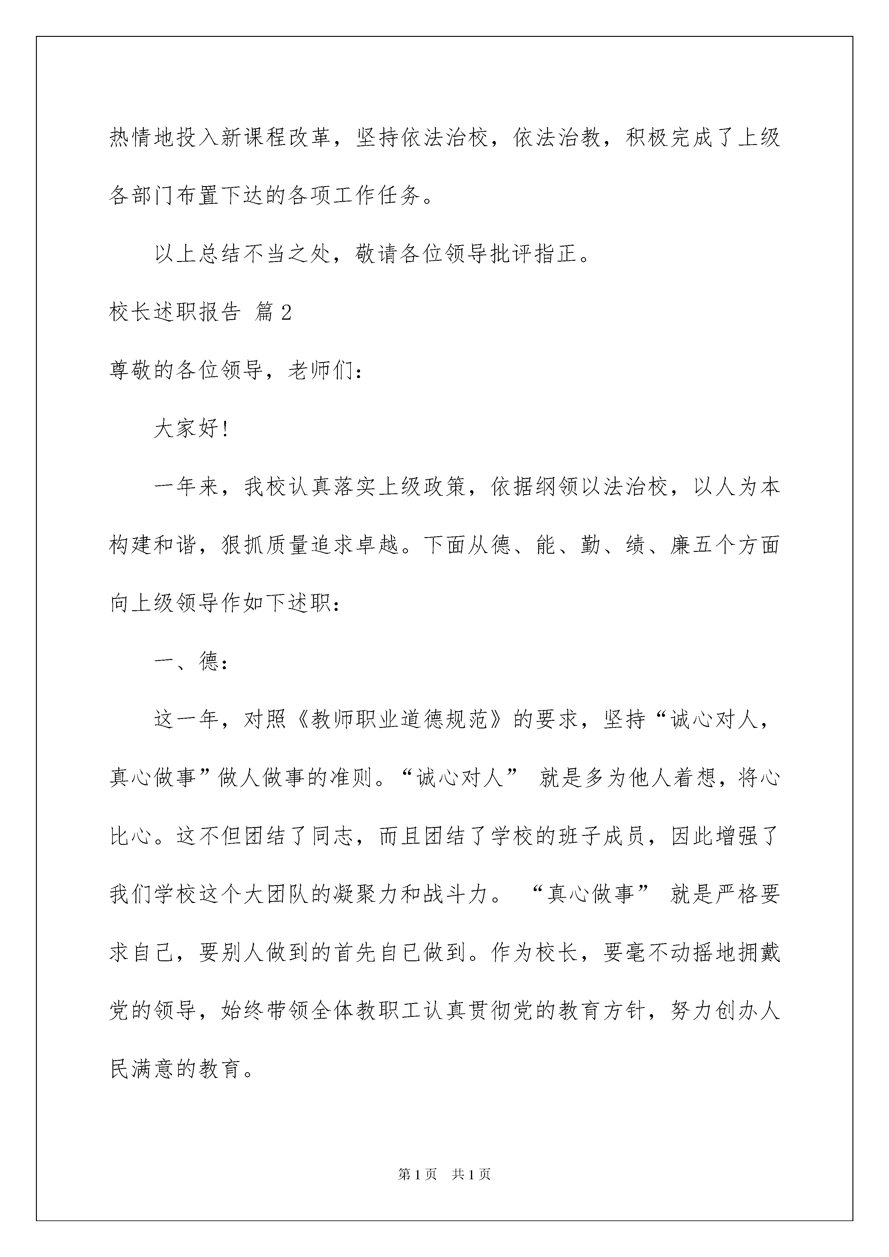 2022校长述职报告范文合集5篇校长述职报告范文合集5篇在经济飞速发展的今天,接触并使用报告的人越来越多,写报告的时候要注意内容的完整。那么你真正懂得怎么写好报告吗?以下是我为大家整理的校长述职报告5篇,欢迎阅读与收藏。校长述职报告篇1首先,诚挚地欢迎各位领导对我一年来的工作进行考核。20xx年度,我分管教师的年度考核、职称评聘、教育教学管理等具体工作。在上级教育部门的正确领导下,我始终能够脚踏实地,认真履行工作职责,较出色的完成了各项工作任务。下面将自己的思想和工作情况总结如下:一、认真学习,与时俱进,在思想上与党组织保持一致。我一直坚持政治思想建设不放松,自觉维护学校领导班子的权威。坚持学习各级文件和业务知识。关心时事,坚持读书看报看新闻,执行党的决议。在工作中,习惯了加班加点,无论节假日还是寒暑假,和班子其他同志坚持一起加班。坚持从严要求,自觉遵守国家的法律、法规、党风廉政建设的各项规定,严于律已,洁身自好。没有出现借出差旅游假公济私的现象。把学习、工作、思考和写作结合起来,及时总结经验,用理论指导工作创新。一年来起草了各类计划、总结、方案、报告、汇报、讲话稿等材料100多份。带领全校教师,坚持贯彻“质量立校,安全稳校,和谐兴校”的指导思想,在工作中不断总结管理经验,改进和创新管理方法,努力构建和谐校园。充分发挥支部和工会的监督作用,建立了公平、公正、透明的教师考核、晋级、评优方案,充分调动了全体教师的积极性。二、严以律己,勤奋刻苦,在工作中争创佳绩。我以责任感严以律己,身体力行严守一切规章制度,为学生表率,做教师榜样。一年来我一直勤政廉洁,作风正派,光明磊落,做事公平、公开、公正,赢得了班子成员及全校教师的支持、信任、爱戴。我带头代课,上一年度,我带六年级品德与社会课,坚持听课、评课,一年来我听课节数达到150节以上。我坚持指导学校的舞蹈队、合唱队,积极培养学生特长。我充分利用现有的教学设施和设备,强化了舞蹈、英语、书法、绘画、体育、电脑等兴趣活动小组。值得一提的是我校阳光体育大课间活动,每天活动时间,整个校园内激情涌动、艺彩飞扬!受到上级领导和兄弟同仁的好评。在各级组织的文艺演出、体育比赛中,学校均以独具匠心的创意,精湛娴熟的表演,扎实过硬的基本功赢得各届的好评。三、教研先导,质量立校。作为一名校长我深知质量是学校的生命。于是我把提高教师专业化水平作为提高质量的突破口,在全校各教研组开展了以教导主任、教研组长牵头的教研活动。经过不断的实践探索,我校的教研活动已形成了自己的特色。以实、新、活的特点赢得了与会领导的高度评价。一年来,我校承担的11个教研课题顺利通过上级验收,2个省级课题正在申请验收阶段。在今年七月份的全县小学生六年级毕业检测中我校继续名列前茅。总之,一年来,我和学校老师们干在一起,苦在一起,乐在一起。20xx年度我校被省教厅、省科协评为青少年科普知识竞赛先进单位,先后获得汉中市“平安校园”、xx市教研工作先进单位、20xx年国家教育统一考试优秀考点、20xx年洋县中小学田径运动会团体总分第一名。回顾20xx年度的工作,我能注重加强学习,端正教育思想,更新教育理念,全面贯彻党的教育方针,坚定不移地实施素质教育,满腔热情地投入新课程改革,坚持依法治校,依法治教,积极完成了上级各部门布置下达的各项工作任务。以上总结不当之处,敬请各位领导批评指正。校长述职报告篇2尊敬的各位领导,老师们:大家好!一年来,我校认真落实上级政策,依据纲领以法治校,以人为本构建和谐,狠抓质量追求卓越。下面从德、能、勤、绩、廉五个方面向上级领导作如下述职:一、德:这一年,对照《教师职业道德规范》的要求,坚持“诚心对人,真心做事”做人做事的准则。“诚心对人”就是多为他人着想,将心比心。这不但团结了同志,而且团结了学校的班子成员,因此增强了我们学校这个大团队的凝聚力和战斗力。“真心做事”就是严格要求自己,要别人做到的首先自已做到。作为校长,要毫不动摇地拥戴党的领导,始终带领全体教职工认真贯彻党的教育方针,努力创办人民满意的教育。二、能:这一年,学校工作总体上稳中有进,领导班子和全体教师分工清楚,职责明确,在抓常规管理的基础上,着力突出以下的工作:一是进一步明确了学校的成长思路,那就是“立足自身,抢抓机遇,充实内涵,提升品位”逐步丰富学校文化內涵,努力创建四地校园;二是加强对学生行为规范养成的系列教育,依据《**小学生在校-日常规要求》,开展了德育序列化教育,努力使学生养成良好的生活习惯,来达到“树德启智养习惯,以人为本育全人”的办学目标。三是继续加强队伍建设。首先创设良好的工作环境,提供