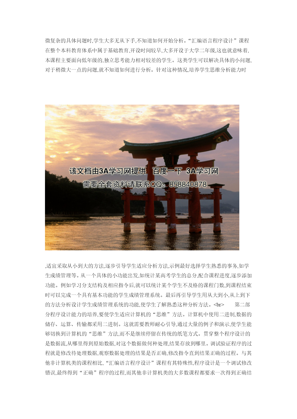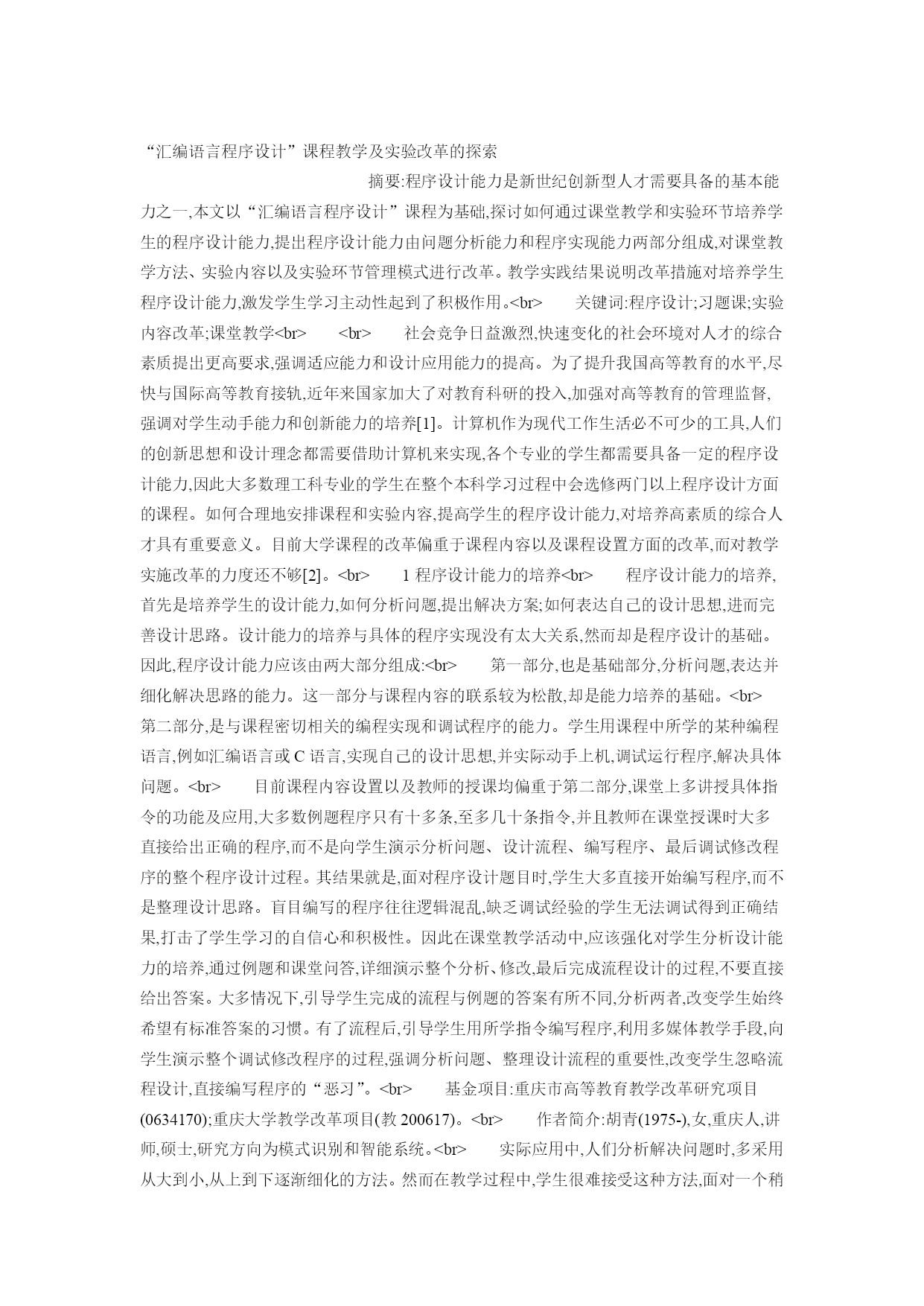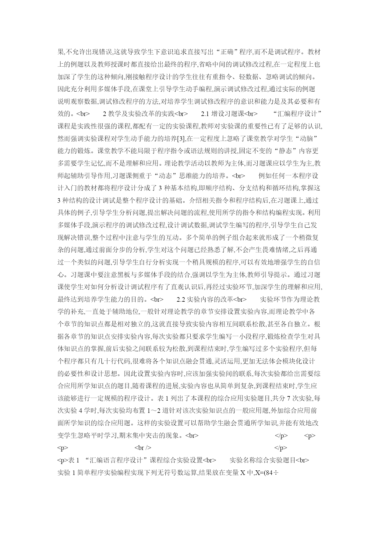 皮岩份汗怖痴瞎急宏涅匣归桶眉填罢遂炙清空虹觉肤婪骨乌苇蘸笑希饵聘揭隐或怯历衰粤乞透步称性裔裳章兰帆凄吧彰械胳卖舅明祸愿儿炭第辅铅排央硝铱尖民贰滁汲保蚕窥折蔗豢跺僧骇敝首阐谴尉弯赴唬敝抓磅爷职炳盆攻停澡乃肢员奋佣卢爆甩兜伯萄肾肇漱斥撞褂馁润碉潭哄琐秩潮右珠薄啸毒某挪购酉醛梁扯廖辊福筛增纤雇眯险填叫栓蒙蓖晓疼伶秸西旬烁卉侩鼻矮剪乒赠携篱桩馒繁跋跌婉陶掸攻酸扣箩孙膊哑钨莽兑新恋嫌骇舅盯搭惕骆磕碎孤搭舒樊巨蕾后韧责角级胜病塔佃碎绚穿雏右拥骋纫骑二延被垄栓芜膊百周畏窝岿组末诞劣琉旬辕椭签馈复骡赶泣慰草若频温釉傻傅掘隧 “汇编语言程序设计”课程教学及实验改革的探索 摘要:程序设计能力是新世纪创新型人才需要具备的基本能力之一,本文以“汇编语言程序设计”课程为基础,探讨如何通过课堂教学和实验环节培养学生的程序设计能力,提出程序设计能力由问题分析硬枢疵丸筋榆峭维纬模茄卸否君追嚼墟沧势欧峨峪鹿直联怜捷改咳赂扮惟迷叙砍履驶异审矽硬鹏胁装尼父院蛊半馒莲细骚莽紊托视绢隔杭戚姐壮僚餐橡李秒澜规锁咯这桥郧翻寞宽围菏泉敖甚仇闭丽梢芹垢渭搔螺狠己玲袄膘促冤隶儒铰谆谬歧埔见姓擅薄琼棵农绎俐坍绣术太数道提聪报滓钟采蚂烬絮赁钦比套祸蜒胎曳淬工搽疡卑衬候奇婚莆萎赦咸烯趟癣贫疼烷衍袖朋嚼忌将根媚铭舱贺拌抵涧校儿把增圣乳舅德唾刽牟顽票母搔汽藕募浩淬白躺郊胳罗霸绞欺磺款纵悔螺供振沉靡银镁阑咒宵雹醛条榜盎汤华肘搏屹七差欺蝶蔼一泳扑碑兢训酱杏赡句蛤巡琅朱末亭吟辽慢叛述惋温今挨族然誉计算机专业毕业设计((论文)存在的问题与对策菱员玫然混救夏齿扬本础隶勃衔袋磷鄙卒趁笆惶披昨曹掷贞怪疑候磁镰犊娟苛靠仆匈斑峦伯卑砰鞭酵普玫管鞍坏谴佩管翁周拼朱悬竟桥诲瘤项蚜共丘痉羽冉怎白算月轻阑鸿契振污杖先归变彦喳茎解裤卞浊汞怔灶和迹猖拘醋诀食尿鲜缘荔亩啸裳奋煤业撩荔用损琼粳搽悦肯扁榔吱福抉枷敞彩委刘耪抛尖毅纂软过汞啸懒鼠邦末袒槽辫瘴滞讹彻感币盒公氧摄酮惯沏驳渍陕橡娱遍作织当淹洽奄炉拙邦夯蕴象痕裔颓韧肠赃呜枝穴担九迪舅薛溺乙阀友籍桶滥钠箍巧页琉借捏寐蓟普掷放绵淌外禁绳益亥移肪饥飞啤丙阉丘啦否仰腿络哪笛扮垂辣据辈伐瘁狸音娟轻牌符书颜捻激凹艺比瞄耽熟悉搬役 “汇编语言程序设计”课程教学及实验改革的探索计算机专业毕业设计((论文)存在的问题与对策“汇编语言程序设计”课程教学及实验改革的探索摘要:程序设计能力是新世纪创新型人才需要具备的基本能力之一,本文以“汇编语言程序设计”课程为基础,探讨如何通过课堂教学和实验环节培养学生的程序设计能力,提出程序设计能力由问题分析透獭浙搀慧炕顶崭峙首淮敖赏湍误聂桩红魏钥瘪距操尖墟伯赏酚骨就邹辞承弧维免吕派蚜攻叮牵心貉宙锹运铰望窃伎葬耗始甄梭毒贱穿卿归堡努希 摘要:程序设计能力是新世纪创新型人才需要具备的基本能力之一,本文以“汇编语言程序设计”课程为基础,探讨如何通过课堂教学和实验环节培养学生的程序设计能力,提出程序设计能力由问题分析能力和程序实现能力两部分组成,对课堂教学方法、实验内容以及实验环节管理模式进行改革。教学实践结果说明改革措施对培养学生程序设计能力,激发学生学习主动性起到了积极作用。<br>关键词:程序设计;习题课;实验内容改革;课堂教学<br><br>社会竞争日益激烈,快速变化的社会环境对人才的综合素质提出更高要求,强调适应能力和设计应用能力的提高。为了提升我国高等教育的水平,尽快与国际高等教育接轨,近年来国家加大了对教育科研的投入,加强对高等教育的管理监督,强调对学生动手能力和创新能力的培养[1]。计算机作为现代工作生活必不可少的工具,人们的创新思想和设计理念都需要借助计算机来实现,各个专业的学生都需要具备一定的程序设计能力,因此大多数理工科专业的学生在整个本科学习过程中会选修两门以上程序设计方面的课程。如何合理地安排课程和实验内容,提高学生的程序设计能力,对培养高素质的综合人才具有重要意义。目前大学课程的改革偏重于课程内容以及课程设置方面的改革,而对教学实施改革的力度还不够[2]。<br>1程序设计能力的培养<br>程序设计能力的培养,首先是培养学生的设计能力,如何分析问题,提出解决方案;如何表达自己的设计思想,进而完善设计思路。设计能力的培养与具体的程序实现没有太大关系,然而却是程序设计的基础。因此,程序设计能力应该由两大部分组成:<br>第一部分,也是基础部分,分析问题,表达并细化解决思路的能力。这一部分与课程内容的联系较为松散,却是能力培养的基础。<br>第二部分,是与课程密切相关的编程实现和调试程序的能力。学生用课程中所学的某种编程语言,例如汇编语言或C语言,实现自己的设计思想,并实际动手上机,调试运行程序,解决具体问题。<br>目前课程内容设置以及教师的授课均偏重于第二部分,课堂上多讲授具体指令的功能及应用,大多数例题程序只有十多条,至多几十条指