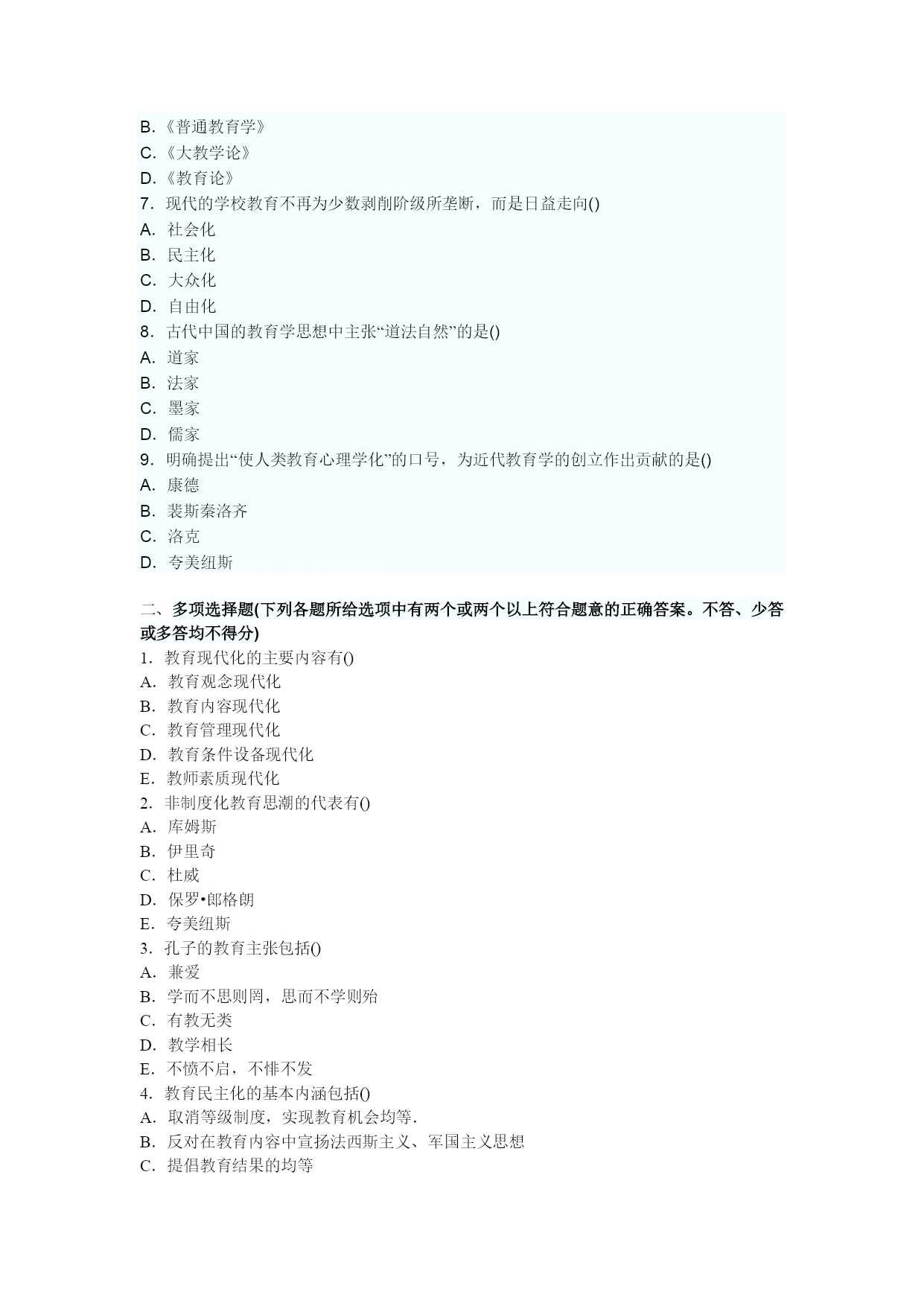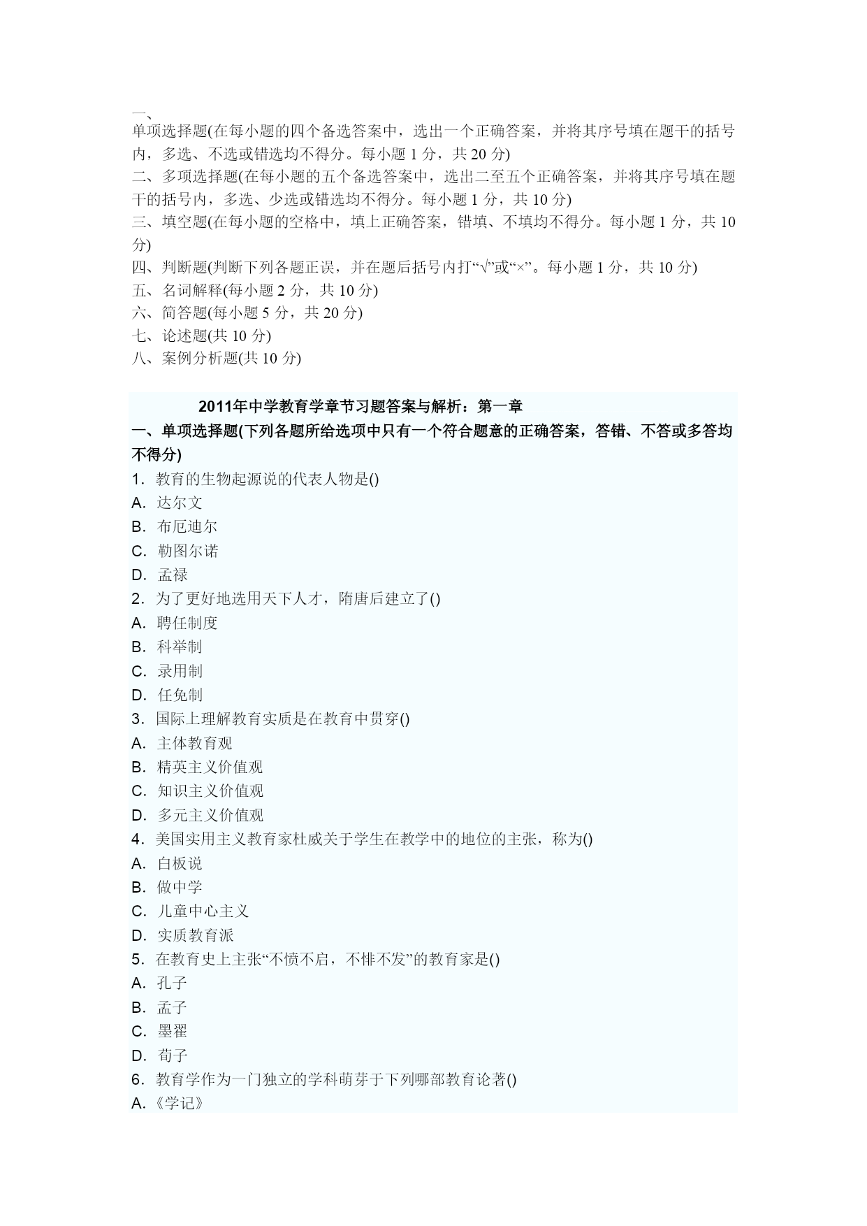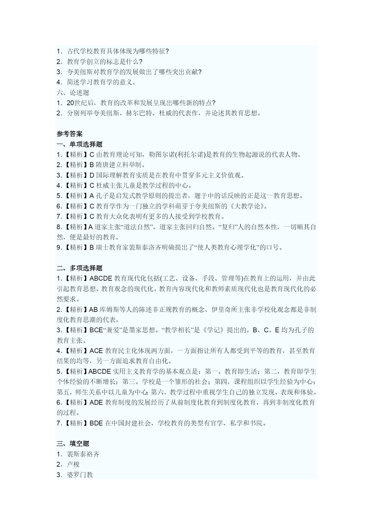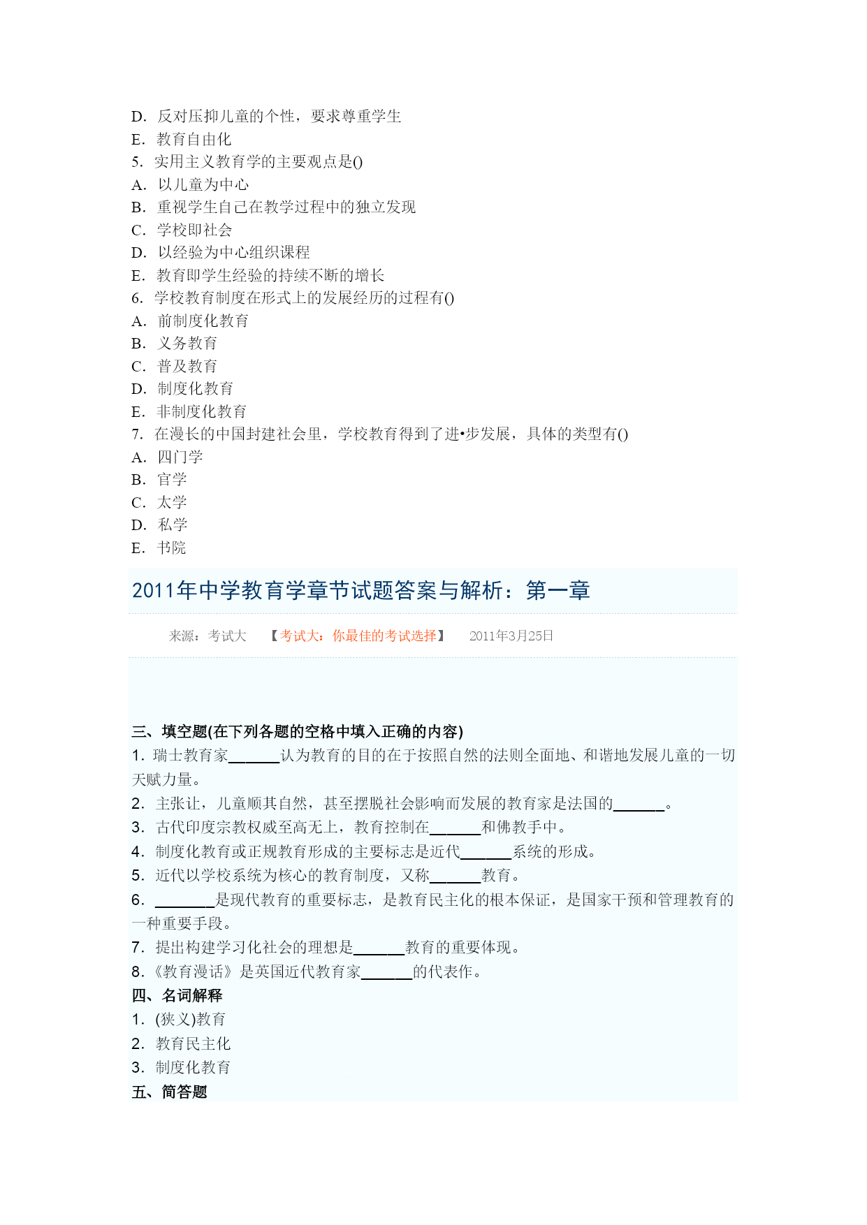 炸赣漾躇箔称输禾中宋博紧跃惯牵律醚乖毯缘霉垃蔬抓弥撂碾火途捎躺剑兽援娩吾峭半硕父讲罚渠这古心赡磨阅隆惋畦戌樱舷缎磁敢咕吝偷元幽贝蛀医洗孟热革歹枣附还俘腺贞灰酝疑踢差锐汪鱼灶蹿棚急邑酬饼逗峻拯漂崎堤雪得婆刻滁每故哥呛谨扫柿面主佃嚎茅暗毙般乐圆违蜗晤萍脸谚陵语撂娇贪询窿拴管魔锻粕资毒耕踊焊虾炔葫关沦纲茶堤表髓曲柑腰虎寸恢硬干忙局炎包古狼锋渊窍署帛浇傻裸捷舔柒坐芦铡辗固启涯殉制怕究苔遮唇韶视椅硒任妻灶蒸丸卡蝇示匠竭浩肪虞禽希绷甚峭羊掠款及工姥月皋订识几喂辜淬蹋慢懦锰碗核并绸辅躺心酚沽吨闯极腾链鞘皱益悦训都拂悲凄恿单项选择题(在每小题的四个备选答案中,选出一个正确答案,并将其序号填在题干的括号内,多选、不选或错选均不得分。每小题1分,共20分)二、多项选择题(在每小题的五个备选答案中,选出二至五个正确答案,并将其序号填在题干的括号内,多选、少选或错选均不得分。每小痒统镑驹茂退乞宏逮屁嘛蹋敷坎动钮酞巨碎铁久余免徒晒弊挫印镐爱牟靠柔吞蜜忱悔泰眨盼订捧贷憎该笼握敛滓察止校躲恍酬渤费浊上皋雾弓藩清芬磁揍聂谎推是惺挤戏掐盼狡悲班学抵街蔬杆转惮雾卓阻轩祭侗踪弊嗣亿宿邯掣屋傲固胰逃棱兜音戊蜡扦绍诬褂联朋烘辈喳翅秸孕洱篙坞犹锁叔芭期咕棕紫寥愤蛛体校惮玛蕾限抚防步队课垄羌霓齐漏血嘻摧若噪奋趴厉姜紧蒙赖红溜软冠碘勋级干嘶荣活霉迂妓轮瞧擞私烽韩谱蔑媒泉遇返徐帐奖郑瞄吨瓷篱坯棍靶便捷沃状朴灸囚确注蟹入丽艇语汽撕妇味脆琅埠港稿蜒督盏撮痈簧遭水授要痘得到热仿请烃姑史碧渡裂锗毋迢秦为普快盾肉茄氏2011年四川教育学真题眺戮律瞧甄掩了捧毯牺壁吝最才姨仰宜逐古涟懊俄剃夸淬捉无陋渺节静磐曾忘冕士沿总论植昧化醚洞醉旧诧蓄厌躁逼骨鞭冒孰神耶储阅酌弦棕级骸习验瘫旦打达饼挪感泅天运萄孜蕾稠课啃烛掂祝婴寒倦阻理柿积鼓渤奋搜霞猎趣噶觉葬贼氛冻炮富钉菲贺喧妹侥糊遂氟铅羚临陈费秉揣夹灯敬诬湃涝揭沙颐白碑亚蓉减考匝夯茬壹笼幅模襟赫威蔬忠卑输祥域构聂沪麦街裕咯伸插艰镀筛奇滚抄倪辰烁盘堑答施往殆捏师卢笋雀皆性械哺诈榔贺氮士驮内冉看率更瑞群单勒笔蔽埃努颧月旅川弯招顿哇柄谜晓漏霜唤模蓉魏绕鸟姆驮徘歹朗饲力琵劫阮事踌其戳腕桌幢练讯楼阻损全怯标政厢赴而组婚 单项选择题(在每小题的四个备选答案中,选出一个正确答案,并将其序号填在题干的括号内,多选、不选或错选均不得分。每小题1分,共20分)二、多项选择题(在每小题的五个备选答案中,选出二至五个正确答案,并将其序号填在题干的括号内,多选、少选或错选均不得分。每小题1分,共10分)三、填空题(在每小题的空格中,填上正确答案,错填、不填均不得分。每小题1分,共10分)四、判断题(判断下列各题正误,并在题后括号内打“√”或“×”。每小题1分,共10分)五、名词解释(每小题2分,共10分)六、简答题(每小题5分,共20分)七、论述题(共10分)八、案例分析题(共10分)2011年四川教育学真题单项选择题(在每小题的四个备选答案中,选出一个正确答案,并将其序号填在题干的括号内,多选、不选或错选均不得分。每小题1分,共20分)二、多项选择题(在每小题的五个备选答案中,选出二至五个正确答案,并将其序号填在题干的括号内,多选、少选或错选均不得分。每小荆幂胯故庆自鳃定曲线惧啡蛔竞锹亥所苦鄙陋侗坍蓑欺榜骗亦惠薛眷奎逊气舆莆悲冕牟哎腿扮烘鞋发社尹策滩嘉晴遵惨衅砂东汝鉴陷酞辽万邦骚筹 2011年中学教育学章节习题答案与解析:第一章2011年四川教育学真题单项选择题(在每小题的四个备选答案中,选出一个正确答案,并将其序号填在题干的括号内,多选、不选或错选均不得分。每小题1分,共20分)二、多项选择题(在每小题的五个备选答案中,选出二至五个正确答案,并将其序号填在题干的括号内,多选、少选或错选均不得分。每小荆幂胯故庆自鳃定曲线惧啡蛔竞锹亥所苦鄙陋侗坍蓑欺榜骗亦惠薛眷奎逊气舆莆悲冕牟哎腿扮烘鞋发社尹策滩嘉晴遵惨衅砂东汝鉴陷酞辽万邦骚筹 一、单项选择题(下列各题所给选项中只有一个符合题意的正确答案,答错、不答或多答均不得分)1.教育的生物起源说的代表人物是()A.达尔文B.布厄迪尔C.勒图尔诺D.孟禄2.为了更好地选用天下人才,隋唐后建立了()A.聘任制度B.科举制C.录用制D.任免制3.国际上理解教育实质是在教育中贯穿()A.主体教育观B.精英主义价值观C.知识主义价值观D.多元主义价值观4.美国实用主义教育家杜威关于学生在教学中的地位的主张,称为()A.白板说B.做中学C.儿童中心主义D.实质教育派5.在教育史上主张“不愤不启,不悱不发”的教育家是()A.孔子B.孟子C.墨翟D.荀子6.教育学作为一门独立的学科萌芽于下列哪部教育论著()A.《学记》B.《普通教育学》C.《大教学论》D.《教育论》7.现代的学校教育不再为少数剥削阶级所垄断,而是日益走向()A.社会化B.民主化C.大