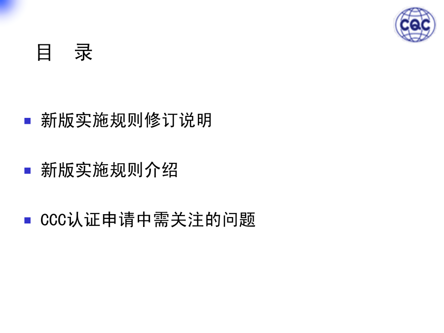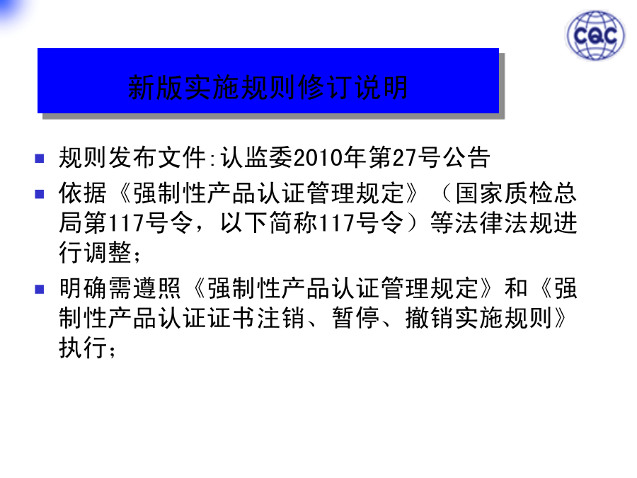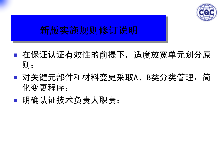 新版实施规则介绍目录新版实施规则修订说明新版实施规则修订说明新版实施规则修订说明新版实施规则修订说明新版实施规则介绍新版实施规则介绍新版实施规则介绍新版实施规则介绍新版实施规则介绍新版实施规则介绍新版实施规则介绍新版实施规则介绍新版实施规则介绍新版实施规则介绍新版实施规则介绍新版实施规则介绍新版实施规则介绍新版实施规则介绍新版实施规则介绍新版实施规则介绍新版实施规则介绍新版实施规则介绍新版实施规则介绍新版实施规则介绍新版实施规则介绍新版实施规则介绍新版实施规则介绍新版实施规则介绍新版实施规则介绍新版实施规则介绍新版实施规则介绍新版实施规则介绍新版实施规则介绍新版实施规则介绍新版实施规则介绍新版实施规则介绍认证申请中需关注的问题认证申请中需关注的问题认证申请中需关注的问题认证申请中需关注的问题认证申请中需关注的问题认证申请中需关注的问题认证申请中需关注的问题认证申请中需关注的问题认证申请中需关注的问题认证申请中需关注的问题认证申请中需关注的问题认证申请中需关注的问题认证申请中需关注的问题认证申请中需关注的问题认证申请中需关注的问题受理阶段注意事项 产品界定 1.产品界定依据: a.国家质检总局、国家认监委2001年第33号公告《第一批实施强制性产品认证的产品目录》 b.国家认监委2007年第9号公告《强制性认证产品目录描述与界定表》 c.国家认监委网站强制性产品认证专栏相关通知和回函批复《第一批实施强制性产品认证的产品目录》 根据《中华人民共和国产品质量法》、《中华人民共和国进出口商品检验法》、《中华人民共和国进出口商品检验法实施条例》、《中华人民共和国产品质量认证管理条例》和《强制性产品认证管理规定》的规定,国家质量监督检验检疫总局和国家认证认可监督管理委员会决定发布《第一批实施强制性产品认证的产品目录》(以下简称目录),目录共有19类132种产品。对列入目录内的商品,从2002年5月1日起受理申请,自2003年5月1日起,未获得强制性产品认证证书和未加施中国强制性认证标志的产品不得出厂、进口、销售(整机厂在采购目录内零部件时应关注)。《强制性认证产品目录描述与界定表》 2007年4月17日,国家认监委公布了编制完成的《强制性认证产品目录描述与界定表》(9号公告)。 自强制性产品认证制度实施以来,认证产品范围已由最初的19大类132种扩展为22大类159种,在保证健康安全、改善环境质量、提高经济运行质量和人民群众的生活水平等方面起到了巨大作用。为进一步解决强制性产品认证中存在的产品适用范围的问题,向认证实施以及地方两局执法把关提供便于操作和掌握的执行文件,国家认监委编制完成了《强制性认证产品目录描述与界定表》。 该文件在已发布的强制性认证产品目录范围的框架内,对已有产品实施规则、标准和已发布技术文件进行了全面的综合,尽可能在现有的技术资源和条件下,对目录内所有产品进行清晰、准确的界定。随着技术更新和产品变化不断修改、补充,国家认监委也将适时对所发布文件进行必要的解释、完善或更新。相关链接: 培训PPT\9号公告.pdf 《强制性认证产品目录描述与界定表》解读重点: a.鉴于产品功能的日新月异和市场销售名称的五花八门,CCC产品界定以表内对产品种类的描述一栏为准; b.表中备注栏所列明的产品的均为CCC认证不适用产品,该类产品均不在CCC认证范围内;需要提交给CQC的文件资料清单: 正式申请书(加盖公章的原件); 申请人(委托人)的工商注册证明及组织机构代码证; 制造商(生产者)的工商注册证明及组织机构代码证; 制造厂的工商注册证明及组织机构代码证; 工厂审查调查表; 工厂检查报告; 代理机构的授权委托书; GB9254-2008测试声明(信息技术类产品); 电信设备入网许可证(有入网要求的通讯类产品); 原证书(涉及换发证书的) OEM、ODM合作协议,其界定见下图所示: ODM/OEM界定示意图:具体要求 申请书:申请人(委托人)如果是国内企业(包括港澳台)必须加盖企业公章,国外企业需签字 工商注册证明(营业执照):证明需在有效期内 工厂检查调查表:需工厂方盖章(国内企业) 工厂检查报告:需提交最近一次合格的初审或监督报告(注意工厂编号) 申请人(委托人)、制造商(生产者)的名称和地址与营业执照必须一致,但生产厂(加工厂)的名称和地址需要与接受工厂检查的(或工厂检查报告中的)工厂名称和地址一致(申请书须按此要求填写) 代理机构委托书:需包含代理机构所开展业务的范围和申请人的签字或盖章OEM/ODM合作协议:制造商和生产厂双方需对产品的知识产权和质量责任归属做出明确的界定,双方需加盖企业公章,ODM协议还需要签署有效期,且有效期不超过5年。 入网证:对于有入网要求的产品,需提供入网证 原证书:对于原证书信息发生变化的变更