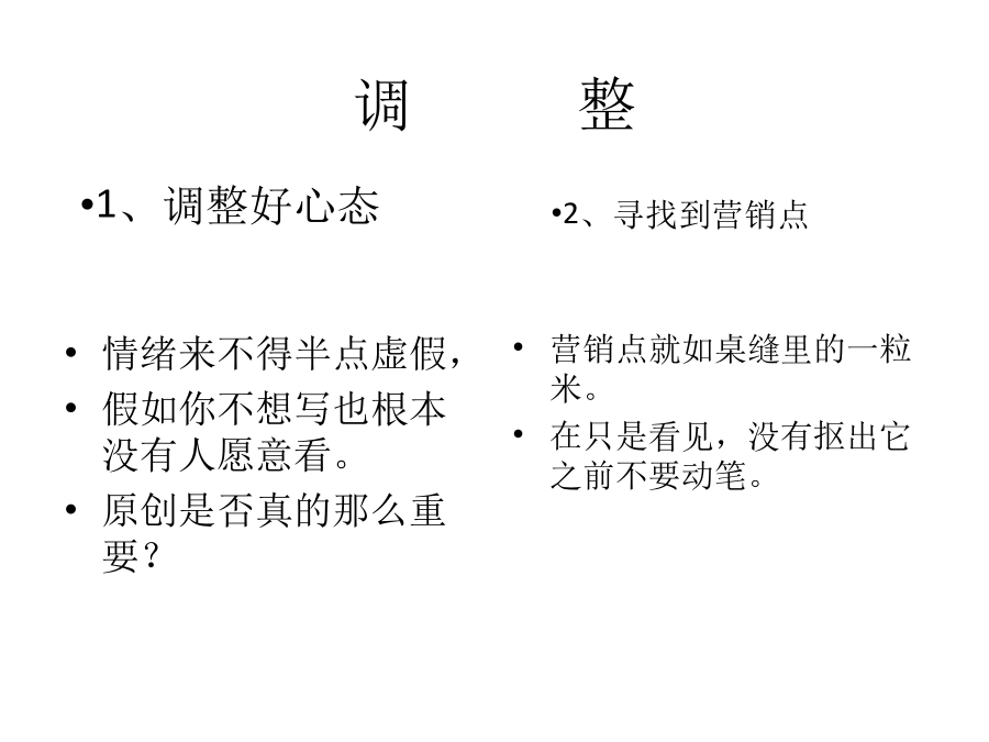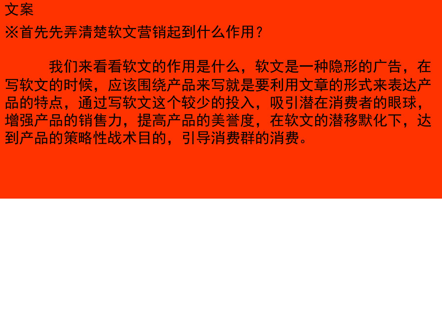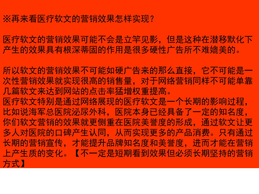 文案 怎么写 医疗文案 ※首先先弄清楚软文营销起到什么作用? 我们来看看软文的作用是什么,软文是一种隐形的广告,在写软文的时候,应该围绕产品来写就是要利用文章的形式来表达产品的特点,通过写软文这个较少的投入,吸引潜在消费者的眼球,增强产品的销售力,提高产品的美誉度,在软文的潜移默化下,达到产品的策略性战术目的,引导消费群的消费。 ※再来看医疗软文的营销效果怎样实现? 医疗软文的营销效果可能不会是立竿见影,但是这种在潜移默化下产生的效果具有根深蒂固的作用是很多硬性广告所不难媲美的。 所以软文的营销效果不可能如硬广告来的那么直接,它不可能是一次性营销效果就实现很高的销售量,对于网络营销同样不可能单靠几篇软文来达到网站的点击率猛增权重提高。 医疗软文特别是通过网络展现的医疗软文是一个长期的影响过程,比如说海军总医院泌尿外科,医院本身已经具备了一定的知名度,你们软文营销的效果就更侧重在医院美誉度的形成,通过软文让更多人对医院的口碑产生认同,从而实现更多的产品消费。只有通过长期的营销宣传,才能提升品牌知名度和美誉度,进而才能在营销上产生质的变化。【不一定是短期看到效果但必须长期坚持的营销方式】没有想好之前先不要动笔!心态的调整是一个自我的认识过程, 浮躁,是年轻人的病,每天起床都要告戒自己,三思而后行。 首先你必须是愿意去写文案的,你要乐意写别人才有可能愿意看。 只有你自己愿意去用文字与患者交流,通过软文把商品传达给客户,客户才有可能在文字中产生共鸣,最终产生消费。 心态调整! 原创重要吗?我很想避免使用“创作”这个词,而把这个人称为 “美工人员”“文案人员”而不称之为“创作人员”首先,要对自己的产品特点、功能、目标消费群体,以及给消费者的承诺是什么? 医疗软文营销的切入点,可以细化为对医院这个产品的特点、功能、目标消费群体,等信息的了解和产品资料的收集、消化、分析筛选准确定位的一个过程,例如对于一个医院的软文营销切入点可以细化为:目标就诊人群心态分析、医疗市场潜力分析、医院形象分析、诊疗设备分析、诊疗技术分析、服务硬件及软件分析、医疗收费标准分析 解决了以上问题,你可以动笔了医疗软文写作之中 如何增强文案的爆发力? 当我们想好了要写什么时,我们可能有面临一个难题,那就是怎样才能写出有爆发力的软文。 首先,软文要有新闻性。 其次,软文要有实用性 第三,软文表现手法要多样性 第四,软文要全 如何增强文案的爆发力如何增强文案的爆发力如何增强文案的爆发力如何增强文案的爆发力医疗软文写作的细节 标题开头 结构内容 谈了很多医疗文案写作的整体布局和思路,下面我们在详细说一下具体写作过程中的细节。在写作过程中我比较重视标题和开头的写作,加上有实用的信息、清晰的结构和平实的话语其实软文一定不会差到哪去。 医疗软文写作的细节标题怎么写1标题可以有新意,但是一定是要题文相符 当1.4亿男人被“包”之后 医院设奖项请患者给医院“看病” 妻子用离婚逼他治阳痿 标题可以适当贴紧当前的时事和热门话题】 查尿道炎元凶夫妻上演家庭谍战憋尿18小时春运回家招来急性尿潴留! 红房子妇产医院打造“低碳医院” 3标题中用数字更直观 1个办公室8个前列腺炎 一次绿激光手术看好三种病 疑问、反问式标题上万元为何总治不好前列腺?三八节男科检查为何也扎堆? 标题中以第三方证言更据说服力 李炎唐教授谈河南省军区医院泌尿外科 关于我院施行预约诊疗服务的公告 名医大讲堂专访:我院专家透视男性性功能障碍原因医疗软文写作的细节开头怎么写医疗软文写作的细节开头怎么写医疗软文写作的细节开头怎么写医疗软文写作的细节结构足够清晰 医疗软文写作的细节内容更生活 提醒: 文案工作中不可缺少策划的思维 写软文,是一种营销形态,也须要策划,这里简单举一个节日营销的例子。 以男科为例,比如男性健康日,我们可以写一些关注男性健康、男科疾病的软文, 父亲节等节前夕,我们可以写一篇中老年父亲们关注前列腺疾病的,在一年的年底我们可以写一些有关男科体检的文章。 春节过后我们又可以写一些节后疾病及时治疗的文章。 即使我们只是文案,我们可能没有专职的策划需要有创意构思,但我们不可缺少策划的思维,知道在恰当的时候确保软文有一定的实效性。 提醒: 配合医院的活动做配套的软文营销 每个医院都会有一些不同形式的活动,在我们的网站中都会配合专题的形式来展示,当然这些活动有些可以给医院品牌和口碑的树立加分,也有一些活动会直接带来患者,那我们就需要在活动的专题上线后,最好可以有配套的软文。 比如说优惠诊疗的活动,活动之前我们可以有一个预告,活动期间,我们可以选几个适当的角度写一些比如说活动现场就诊量火爆、活动期间专家的包装、活动期间典型的病例来突出医院的技术、活动即将