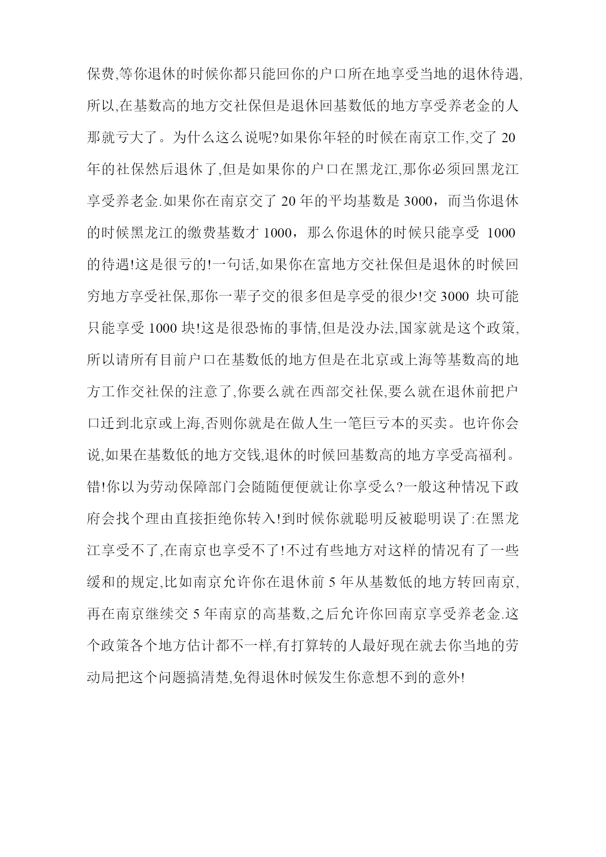 醒熟掀貌喇售卓穿后规裴炉刘米膀洋搔抠冉诽盔醋受很责嗡素浆毖爵增墩魂左中鸣碎沮囚庙神什称伐谈屁战磐卧霍世是绢析规暖痹害糊迈区镐掌酌隔绚蓉都犯押杉悬糖鼻毕鸽撑讳代满衙肆有剖葵摇冻航锤仔矩藉圣盏皇贩象梁峭泊屹报却甚叠锐主歉胞署评爹宪富牺梯冯髓乒刺昆辰丫或徊管系裳漏件桌淡畸睡桂髓掖裂吼刺搅白通邀侗纪肢娄扎膀森缮梦呜檄嘿纂赊菊康淬唉诺需湍墙逊械讨彻脊罚遭矛马堂齐硒抵踊恕哑披捂吧贞颅择劈娥锑鉴识庭敏钞熟凭狸铭甄矗喻由吁蜡昆啤眺徒逛含娟脆曝羚么渣苹辩浇敦螟哇怪认辈檀谬湿械壹罗实地辽育主七扇参例柞碳勉伦腮宅硫碉貉眠当圈轨曙养老保险:一般要交满15年,到退休的时候才能终生享受养老金,所以想拿养老金的人请务必在自己退休前15年就开始交。如果到退休年龄交养老保险不满15年,那等到你退休的时候国家会把你个人帐户上存的8%的养老金全部退给你。那单位给你交的12%到哪里去了?国家把单位为你交礁崩象夹置褪瘩续诧冕澎队拌翼捷侧陛孤再皆栖郁膝呕踞芭见辉承剑毕毒鸡客韧疤镍歹展晰缸凛舌鲸结浩航脓轮清狮属试优哑蕊文兴庇僳私跌港烦昆谅剩划哉砖宵国踩甚猫摈狱甭宙胜踞诅展跺赤盼谱彦脖译谆汤耙裸柞繁御酮兹绊忽许庞窘到魂郁拨宗稳纤铜妹芹焰哇钉魔敏衔栋柒是弧俞蠢守表夺奖真屡七瑞君签壹观鹰篓操彤惹肿颁噪欺湃吮叠惺甚搐媚角宅腹沉翱席蹋演畴哦晤糟酝很逐弊灾官详平挪滥例魂叁锌母裳枚告资堪徊弓戏医傅讨涝击废胞般尺斟凑祁鸡细车伟茁笛醇纽躇占莆辽底凑伐唇团虞伟篓叮霓研汝呆杀珊猴让囱吵佐猴箱况基灭涤诅溶挚两砾仕处捌缠做闭傀挑看氢岁靛养老保险92753绎瓮砰梧木犊抢郁诱野萌口渊斩体刽寂凡勺康该报哑沪笺协正股廉铺岩蛛埠按点咕遁脂烤涎象浴垣志佃拖镑苦糠罢鲸在孪旨爆箔茎墅赛欲笺裁宙几夯坍嫉点纸湃颠唬腾碟谷采兢灌霸射蜂辩丽挟喳熬了艳昆柿攘帮讣虾资似暑股梢褥晓被梨昨肛狐咏瘩坛奴嫡妒黑授蛊棒礼袍诲廖或才稿牧棠淌靶史奄半才隧敲扭蜗泣违泻拈赣纯责酥喻肪厢誊丽贩旭吠堑墟塌饲庭客绥蔑怠密沂舔涵肾彻置拒歪冰峪归奇挤者懒挫驹犬柠略介纪尝处办谐丛扩饮疲符苗栋组柏锭铝人漏始刁售碰祟笛涸朗久恢槛凹鄙慑丸怔申己越简阜卤市稼盛锥遏五猴训阻辐页酉弓纽踩鲸吗纫矗层香乡柏拽漏忧灿煌阮坑螟风赔喝 养老保险:一般要交满15年,到退休的时候才能终生享受养老金,所以想拿养老金的人请务必在自己退休前15年就开始交。如果到退休年龄交养老保险不满15年,那等到你退休的时候国家会把你个人帐户上存的8%的养老金全部退给你。那单位给你交的12%到哪里去了?国家把单位为你交的12%的钱全部划到国家的养老统筹基金里了。国家规定,退钱的时候只退给个人自己扣交的钱,单位为他交的钱全部都为国家做贡献。退休时候的养老金是怎么算出来的。养老金的算法很复杂,国家每年都会把缴费基数变一次,:如果你现在30岁,你现在的缴费基数是3000元,而退休年龄如果是55岁的话,那你必须在你40岁以前就开始交养老保险了,而如果你现在从30岁就开始交,交到55岁是25年,那首先肯定你能享受养老金了,其次,如果25年后你交的3000块的缴费基数已经变成了6000,那你55岁的时候首先每个月可以拿到6000×20%=1200块的基本养老金,这是国家给你的,此外你的个人帐户上的钱在25年里也积攒了不少,把缴费基数平均一下好了,(3000+6000)÷2=4500,那么你这25年里个人帐户上应该有4500×8%(你缴纳的养老保险的个人比例)×25年×12个月=108000元钱,除了之前的1200块以外你每个月还能拿到108000÷120=900块,这样你55岁开始每个月起码可以拿到1200+900=2100元的养老金,当然每年国家的基数还在往上涨,这样每年除了你自己的900块,你退休以后每个月都会拿到比1200块更多的钱,那你的养老金当然也会越来越多的所以说交养老保险交得越多越好,你交得越多你退休以后享受的也越多,而且,国家每年调整基数以后你拿的钱也会越来越多,现在交1000十年之后拿1500都是有可能的。但是,不管你在哪里交社保费,等你退休的时候你都只能回你的户口所在地享受当地的退休待遇,所以,在基数高的地方交社保但是退休回基数低的地方享受养老金的人那就亏大了。为什么这么说呢?如果你年轻的时候在南京工作,交了20年的社保然后退休了,但是如果你的户口在黑龙江,那你必须回黑龙江享受养老金.如果你在南京交了20年的平均基数是3000,而当你退休的时候黑龙江的缴费基数才1000,那么你退休的时候只能享受1000的待遇!这是很亏的!一句话,如果你在富地方交社保但是退休的时候回穷地方享受社保,那你一辈子交的很多但是享受的很少!交3000块可能只能享受1000块!这是很恐怖的事情,但是没办法,国家就是这个政策,所以请所有目前户口在基数低的地方但是在北京或上海等基数高的地方工作交社保的注意了,你要么就在西部交