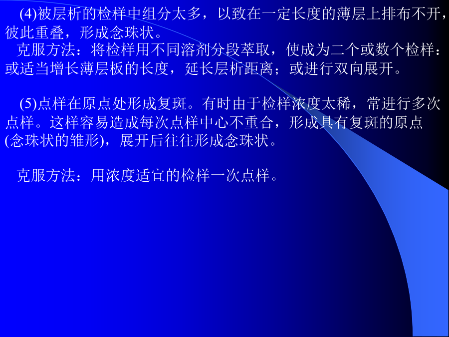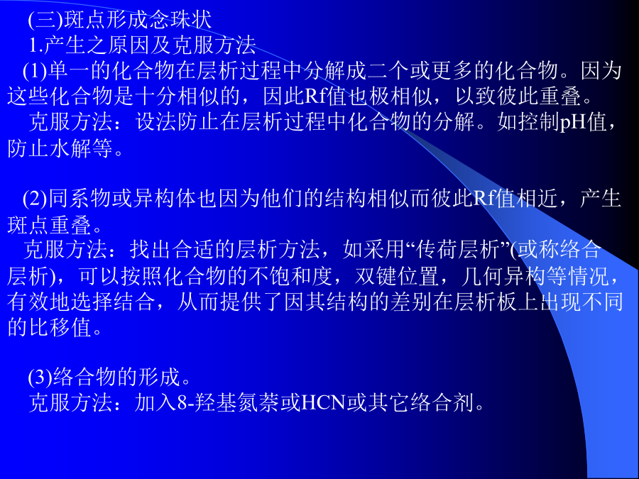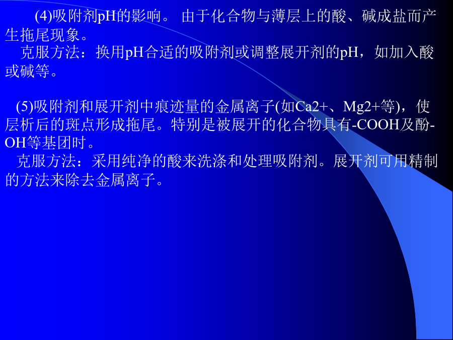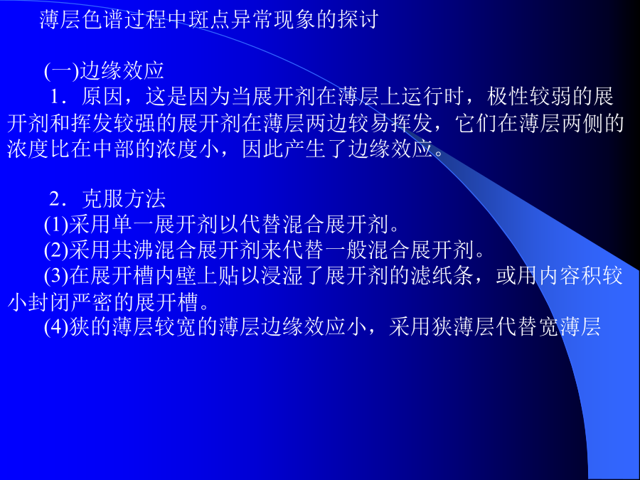 薄层色谱过程中斑点异常现象的探讨 (一)边缘效应 1.原因,这是因为当展开剂在薄层上运行时,极性较弱的展开剂和挥发较强的展开剂在薄层两边较易挥发,它们在薄层两侧的浓度比在中部的浓度小,因此产生了边缘效应。 2.克服方法 (1)采用单一展开剂以代替混合展开剂。 (2)采用共沸混合展开剂来代替一般混合展开剂。 (3)在展开槽内壁上贴以浸湿了展开剂的滤纸条,或用内容积较小封闭严密的展开槽。 (4)狭的薄层较宽的薄层边缘效应小,采用狭薄层代替宽薄层(二)拖尾现象 1.产生之原因及克服方法 (1)点样量太多,展开剂不能全部负载。 克服方法:寻出合适之点样量后,再进行层析. (2)展开剂pH值偏高。如以中性展开剂层析酸性物质时,常形成斑点拖尾。 克服方法;在展开剂中加入酸,使解离受到抑制,即可防止斑点拖尾。 (3)展开剂的pH值偏低。如以中性展开剂层析生物碱和其它弱碱时,常观察到斑点拖尾。 克服方法:在层析K值在10-3~10-8的碱性化合物时,展开剂应调至碱性(如加入吡啶、二乙胺等)。 (4)吸附剂pH的影响。由于化合物与薄层上的酸、碱成盐而产生拖尾现象。 克服方法:换用pH合适的吸附剂或调整展开剂的pH,如加入酸或碱等。 (5)吸附剂和展开剂中痕迹量的金属离子(如Ca2+、Mg2+等),使层析后的斑点形成拖尾。特别是被展开的化合物具有-COOH及酚-OH等基团时。 克服方法:采用纯净的酸来洗涤和处理吸附剂。展开剂可用精制的方法来除去金属离子。(三)斑点形成念珠状 1.产生之原因及克服方法 (1)单一的化合物在层析过程中分解成二个或更多的化合物。因为这些化合物是十分相似的,因此Rf值也极相似,以致彼此重叠。 克服方法:设法防止在层析过程中化合物的分解。如控制pH值,防止水解等。 (2)同系物或异构体也因为他们的结构相似而彼此Rf值相近,产生斑点重叠。 克服方法:找出合适的层析方法,如采用“传荷层析”(或称络合层析),可以按照化合物的不饱和度,双键位置,几何异构等情况,有效地选择结合,从而提供了因其结构的差别在层析板上出现不同的比移值。 (3)络合物的形成。 克服方法:加入8-羟基氮萘或HCN或其它络合剂。(4)被层析的检样中组分太多,以致在一定长度的薄层上排布不开,彼此重叠,形成念珠状。 克服方法:将检样用不同溶剂分段萃取,使成为二个或数个检样:或适当增长薄层板的长度,延长层析距离;或进行双向展开。 (5)点样在原点处形成复斑。有时由于检样浓度太稀,常进行多次点样。这样容易造成每次点样中心不重合,形成具有复斑的原点(念珠状的雏形),展开后往往形成念珠状。 克服方法:用浓度适宜的检样一次点样。(四)在同一块薄层上出现比移值大小悬殊的斑点 1.产生原因由于检样中含有极性大小相差悬殊的组份。 2.克服方法 (1)将检样用不同极性的溶剂萃取,使分为两个检样分别进行层析。 (2)可将薄层划成前景与后景两个部份分别处理。即先选用极性大的展开剂将前景展至前沿,使后景均匀展开。然后再用极性小的展开剂,使后景留在原点,使前景均匀展开。 (五)比移值不稳定 1.产生原因及克服方法 (1)展层时温度不恒定。温度影响Rf值。温度直接影响分配系数,而且影响展开剂中各溶剂的组成比例。温度还影响被层析物质的溶解度。 克服方法:层析时控制恒定温度,以0.5℃左右为宜。(2)层析时间不恒定。 克服方法:在同一块薄板上,同一层析槽内,展至恒定的时间,立即取出。 (3)吸附剂规格不统一。 克服方法:使用同产地的吸附剂,并最好使用同一批号之产品,必要时,将各瓶均匀混合后再使用。 (4)展开剂的规格批号不一致。 克服方法:如出现斑点比移值不稳定的情况,并怀疑与展开剂有关时,必需亲自考查处理,如进行试剂中的水份含量测定等。 (5)所用之展开剂往往为多组分的混合展开剂、如配制后立即使用,常因相平衡的时间较短;或某些化学反应(如醇化等)尚未彻底进行,以致混合展开剂之组成尚未稳定,而导致斑点比移值不稳定。 克服方法:展开剂在配制后,应在层析温度下放置三天后方可使用。(6)展开槽之规格不一致。 克服方法:应使用同一规格的展开槽。 (7)展开剂过多次数的重复使用,也会影响斑点比移值的稳定。 克服方法;新鲜配制的展开剂,最好只使用一次。 (8)其它如展开槽未刷净,未能彻底干燥即加入展开剂,以及展开剂保存不当等原因所引起,均应加以注意。 (六)斑点异形 1.产生的原因及克服方法 产生斑点异形的原因很复杂,主要由于吸附剂的细度、活度不均,薄层板铺陈的厚薄不均等原因,有时在层析进行过程中,挪动展开槽或薄层板。 克服方法:注意上述情况,可以克服斑点异形。一般情况下,硅胶、氧化铝的粒度在200目左右为宜,活度一般在1~Ⅱ级。使用前吸附剂应充分混合。 第三节高效液相色