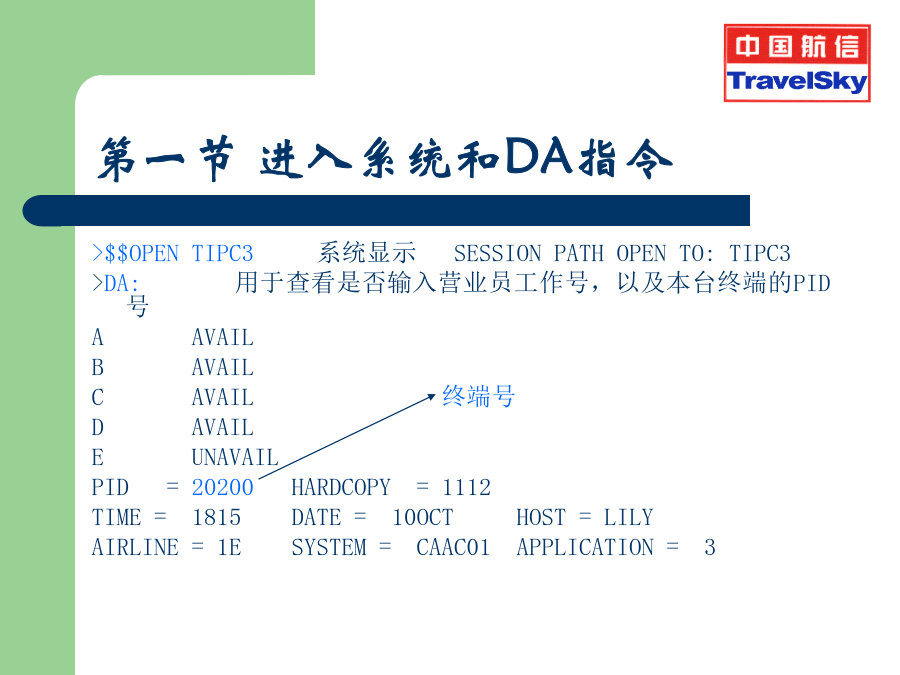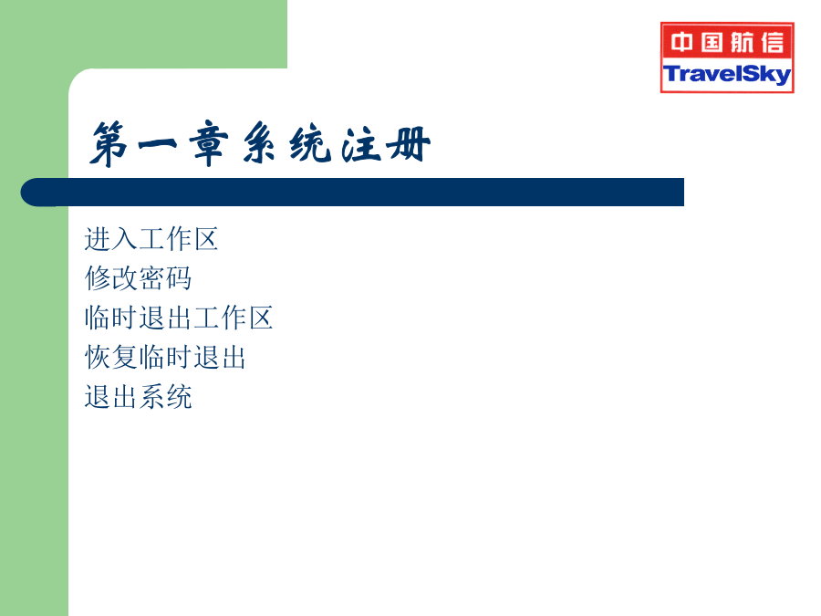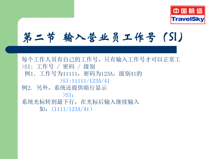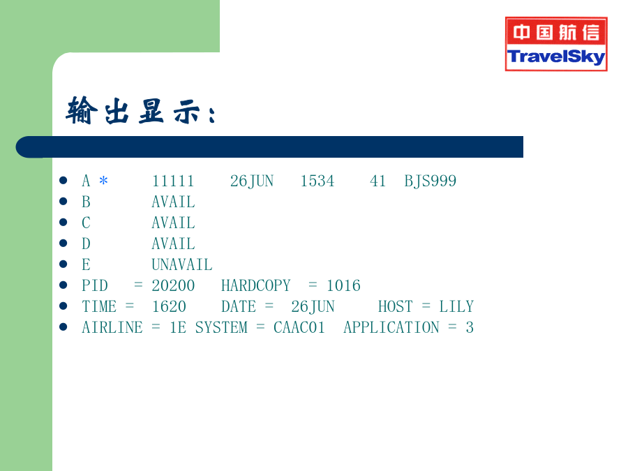 订座基础及CRS自动出票复训 2009年第一章系统注册第一节进入系统和DA指令第二节输入营业员工作号(SI)输出显示:第三节密码的修改(AN)第四节临时退出系统(AO)第五节恢复临时退出(AI)第六节退出系统(SO)第六节退出系统(SO)第二章航班信息查询举例:航班信息查询及其各项含义具体的实例说明AV指令的输入和输出〖说明〗第四节票价查询FD例.查询从北京到上海国航当前票价第三章BSP自动出票PNR的内容概述PNR的构成PNR的基本知识PNR的基本知识旅客姓名输入PNR的基本知识PNR的基本知识直接建立航段组(SS)间接建立航段组(SD)SD指令到达情况不明航段的建立SA不定期航段的建立(SN)出票组(TK)输入旅客联系信息 (1)使用原来的CT项输入 >CT:城市编码/旅客联系信息/Pn >CT:010-12345678/P1 CT:HGH/T (2)使用国际标准OSICTC输入 >OSIAIRLINECODECTC城市编码/旅客联系信息/Pn >OSICZCTCPEK/010-12345678/P1特殊服务组(SSR)建立特殊服务组身份信息建立特殊服务组系统中可以接收的特殊服务代码系统中可以接收的特殊服务代码系统中可以接收的特殊服务代码构成PNR的其它组项备注组(RMK)自动出票PNR的实例打印后的PNR打印后PNR实例PNR的确认,并生效PNR的还原PNR的提取PNR的修改及取消分离PNR(SP)票价组FN税种票价组FN票价组FN票价计算组FC(国内票)票价计算组FC(国内票)票价计算组FC(国内票)先输入FN再输入FC 出错信息:“RESPONSE:INPUTFNATFIRST” 付款方式FPPATFC/FN/FP/EI的手工输入签注信息EI旅游代码组TC打票指令ETDZ打票指令ETDZ不连续航段出票实例婴儿客票的实例婴儿客票的实例婴儿客票的实例团体客票的实例团体客票的实例团体客票的实例团体客票的实例打印PNR中部分旅客客票实例打印PNR中部分旅客客票实例第五章电子客票BSP电子客票的概念BSPET权限BSPET权限BSPET权限指令讲解TOLTOLTOL输入票号TN电子客票票号输入打票机ETDZETRYETRYERROR错误提示:电子客票票面提取:举例:DETR:TN/8805440202032举例:DETR:CN/BQH5E举例:DETR:NM/测试人客票状态说明挂起TSSET挂起ET挂起作废当日的票号VT作废当日的票号VT电子客票—航班变更原记录没有过期,PNR可以提取如下: **ELECTRONICTICKETPNR** 1.牛牛SJR03 2.CA949YSA28MAYPEKPVGRR107500945E 3.BJS/TPEK/T010-65538922/CHINAAIRSERVICECOMPANY/HOUZHUABCDEFG 4.NC 5.T 6.SSRFOIDCAHK1NI8790780790/P1 7.SSROTHS1ETKTLADVTKTNBRTOCABY21MAY05/0750/PEKTIM/ORNOALL SG/BCSCA949/Y/28MAY/PEKPVG 8.SSRTKNECAHK1PEKPVG949Y28MAY9992217417402/1/P1 9.RMKCA/LDZD7 10.FN/FCNY1380.00/SCNY1380.00/C3.00/XCNY50.00/TCNY50.00CN/ACNY1430.00 11.TN/999-2217417402/P1 12.FP/CASH,CNY 13.BJS191DETR:TN/999-2217417402 ISSUEDBY:AIRCHINAORG/DST:BJS/SHAISI:SITIBSP-D TOURCODE: PASSENGER:牛牛 EXCH:CONJTKT: OFM:1PEKCA0949Y28MAY0750OKY20KOPENFORUSE RL:LDZD7/SJR031E TO:PVG FC:28MAY05PEKCAPVG1380.00CNY1380.00END FARE:CNY1380.00|FOP:CASH TAX:CNY50.00|OI: TOTAL:CNY1430.00|TKTN:999-2217417402 改期操作改期操作改期操作改期操作改期操作改期操作报销凭证自动退票TRFD的输入电子客票首次退票常用指令格式非全屏退票指令TRFU:M1/D/0 AirlineCode781TKTNumber1234567890-567890Check ConjunctionNo.1CouponNo.11000200003000040000 PassengerName CurrencyCodeCNY-2FormOfPaymen