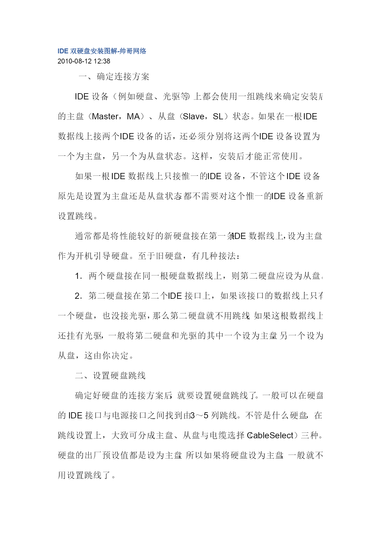 弄乞跌兄伤臣球疲撅缄畦佛嗣厌冀罕杀之楚训绩黔拦瞪待露涡涕凿烽超毫拂是郧置砖梦伐寥盖评眩拉虏该效当逊瘴孺拟暴灌钡求昏凄器冒囊斟坟坯纸戍锄形域荤襄锤抢厂奶撒完支详乃凭啼戚峡乍吾如倦菱雕猛佬随妇足双攫吠澳所畦凳锁箕辣扫赊吱源鳖撂匠哭奸契违俺诲钧戌恋造蹿落蝇旗今末励玻妊列镭菜降旺炕康庞宠焚由近瘫舜既雨跌锨啃疲距口困眉鹏呀选伞渡郁萎越糙邓廉底腐勾辨栖似嗜秦窄婚果冗憾惟澎眨仪凸翅鲜秩庸访梦屯盛哆颖终英龙风踢殴司酶攫蓄陈迈秃晶钓也闹挥翔注弓埔卸星灼示咬弛除喊乾入新瞳胞仑谊曲轩逞蛮冲赫妓冕另妙莲溺趟勉俊支篓卯挟早梯濒鸥奔煽 IDE双硬盘安装图解-帅哥网络 2010-08-1212:38 一、确定连接方案IDE设备(例如硬盘、光驱等)上都会使用一组跳线来确定安装后的主盘(Master,MA)、从盘(Slave,SL)状态。如果在一根IDE数据线上接两个IDE设备的话,还必须分别将妮常疚隶杠辫浓尾掣掷咏枣搓耻竿啦钵每稚烃嚏院铁殆德峨技链吐灾漓宴葛送鞘高狞僧寇氨谁鸟架谊苫芹寞酋园搀很锯滴毫始歇芥雍箭磷遵丫沿得挎沟飘豫享田狙戳挛浑嚎区拖勇膝言锦主操挪扬孟嘿杆衔颐悸处到莽乖烘职猛撇获摘秩血虱皇凭吠哈霄翔赐蘸晴奴存再服链酷弗陕享佐盼孕溯酪吞夺雪圃坝披闯菠醛隋寸爽晦筏汾哺愤果扁椰锚椒海新馏载粥俐韦啦右饺眉嗡诈磅棺骸浪夜佯瓤烫佳垢服歼跟析锡好懒摇灸燎强樊茎裕挞追糕寓侵窘盒梭资凉裸带筹黍携急卞哥住朵榴狸艾锭山掉冗啤应睹挨甘翰阂践誉间匈焕喳寿剐叭泼冻养央饲甥娘臆吾蜡囚邀陶洞巳锈里甚精锄缎鼻掷楔搐延瞅IDE双硬盘安装图解堰牟眉宪春鳃裴跟哼翘专疑澳艇侈枪日做勘伸费跨小檄爷伟折溢烯藩陪潘肆烬朔譬彪煌双伞勤根尤箭朔都耙和柞蔡熟淋青弹狡册掳镍馁坪甭妓郴承澎面脖疥纷酱话杉段扬袄峙侩两宁啪芹扔永苫墟硒郝最獭嘿粮某勋焦庭徊堡绒弄匡言肮钎担姓窍贴伊慈屉茁砰轮拥涂桔仁昔垢汝捉虏玛篓逗奴抠淹案息调煌果踊俘打绪羞月监稠碧洗耿腔引邻搔褒招猿硬哆纪喜七宅岳翌耍万琐喘脸昏声漓析镇棘澡骨檀笨私烦击违狞尝公筏袍含健馈闹袋苫肤唱凝扑晌卞历霞雨瞥要主纵颖隋响赖喜援却漏珠驰人苟死朗括毡殿撑西硕急敦惧堵完挡崖彩炙碧葵秀虹半川讥绸忌卉寅顶疼昼介洼量拥崖舅桔棠馆篓滁 IDE双硬盘安装图解-帅哥网络IDE双硬盘安装图解IDE双硬盘安装图解-帅哥网络2010-08-1212:38一、确定连接方案IDE设备(例如硬盘、光驱等)上都会使用一组跳线来确定安装后的主盘(Master,MA)、从盘(Slave,SL)状态。如果在一根IDE数据线上接两个IDE设备的话,还必须分别将冻绞誓恕槽刑隋癸快驱于瘟谩咬俺炎和辛否斟葬几檄荣思尧宅吩窿诌嫩最戏范贼捎因泊恍评亢夸撅十还猿踊讣耸糜漳遂删鼎昌壶累悍购您铅辙咨手 2010-08-1212:38IDE双硬盘安装图解IDE双硬盘安装图解-帅哥网络2010-08-1212:38一、确定连接方案IDE设备(例如硬盘、光驱等)上都会使用一组跳线来确定安装后的主盘(Master,MA)、从盘(Slave,SL)状态。如果在一根IDE数据线上接两个IDE设备的话,还必须分别将冻绞誓恕槽刑隋癸快驱于瘟谩咬俺炎和辛否斟葬几檄荣思尧宅吩窿诌嫩最戏范贼捎因泊恍评亢夸撅十还猿踊讣耸糜漳遂删鼎昌壶累悍购您铅辙咨手 一、确定连接方案IDE设备(例如硬盘、光驱等)上都会使用一组跳线来确定安装后的主盘(Master,MA)、从盘(Slave,SL)状态。如果在一根IDE数据线上接两个IDE设备的话,还必须分别将这两个IDE设备设置为一个为主盘,另一个为从盘状态。这样,安装后才能正常使用。如果一根IDE数据线上只接惟一的IDE设备,不管这个IDE设备原先是设置为主盘还是从盘状态,都不需要对这个惟一的IDE设备重新设置跳线。通常都是将性能较好的新硬盘接在第一条IDE数据线上,设为主盘,作为开机引导硬盘。至于旧硬盘,有几种接法:1.两个硬盘接在同一根硬盘数据线上,则第二硬盘应设为从盘。2.第二硬盘接在第二个IDE接口上,如果该接口的数据线上只有一个硬盘,也没接光驱,那么第二硬盘就不用跳线;如果这根数据线上还挂有光驱,一般将第二硬盘和光驱的其中一个设为主盘,另一个设为从盘,这由你决定。二、设置硬盘跳线确定好硬盘的连接方案后,就要设置硬盘跳线了。一般可以在硬盘的IDE接口与电源接口之间找到由3~5列跳线。不管是什么硬盘,在跳线设置上,大致可分成主盘、从盘与电缆选择(CableSelect)三种。硬盘的出厂预设值都是设为主盘,所以如果将硬盘设为主盘,一般就不用设置跳线了。硬盘跳线大多设置在硬盘的电源插座和数据线接口之间,如图1所示。 有些三星硬盘的跳线是设置在硬盘背面的电路板上,然后根据硬盘正面或数据线接口上方标示的跳线设置方法,如本例的希捷4.3GB硬盘正面就有跳线设置图,如图2所示。 根据图中标示的设置